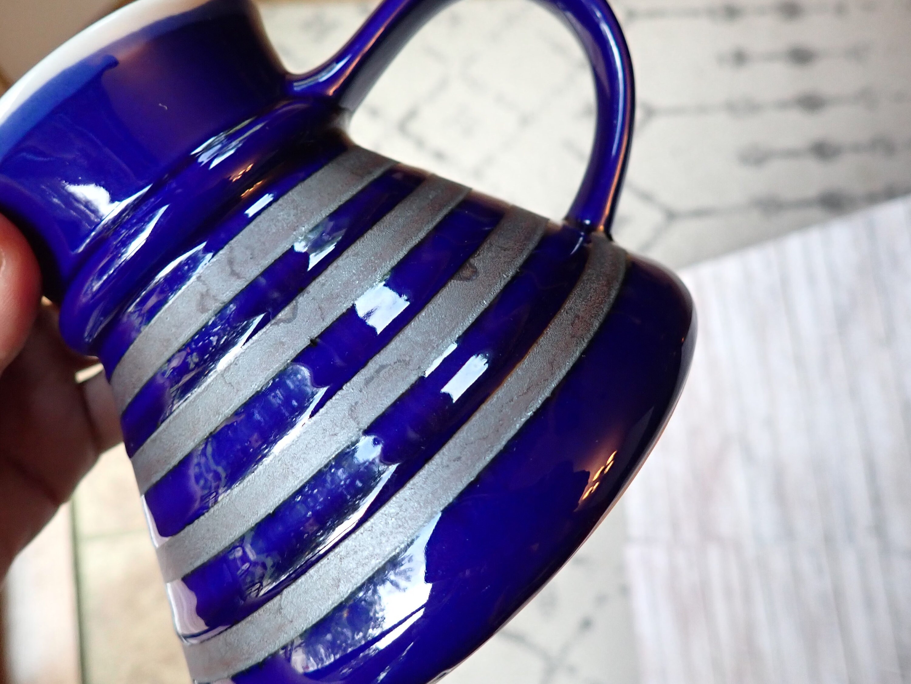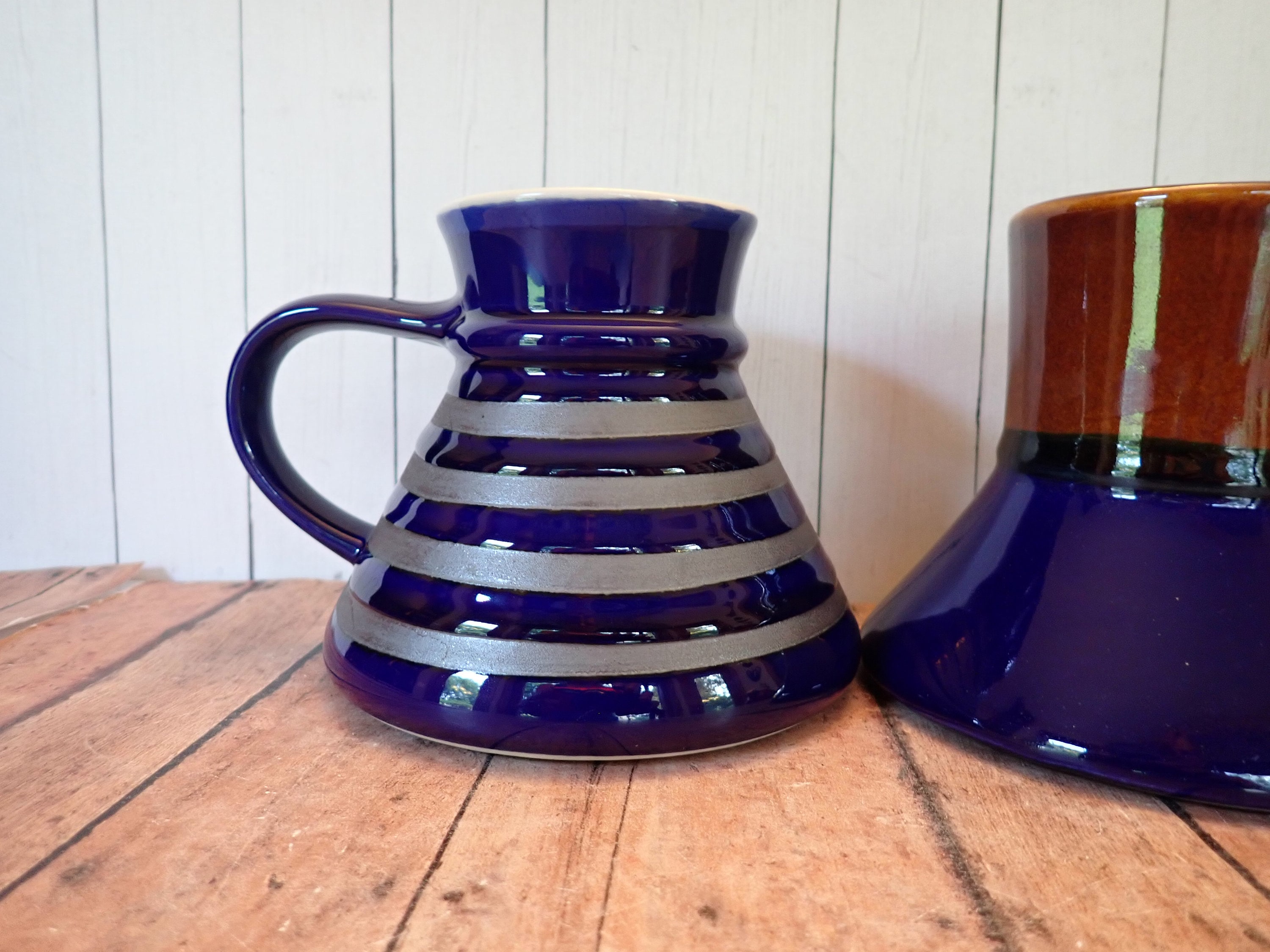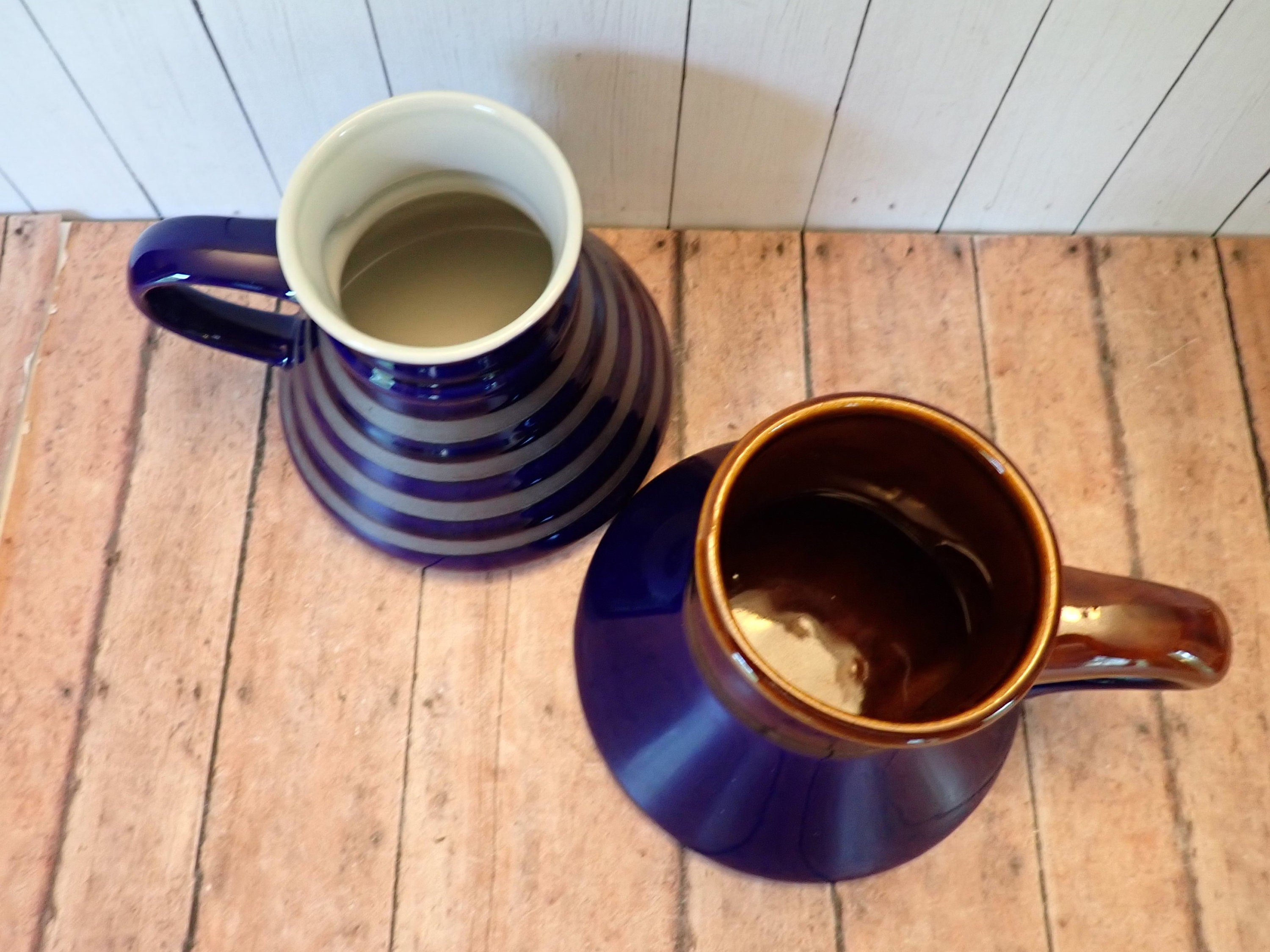 Both mugs are in very good condition with no chips or cracks. There are some imperfections on the surface of the mugs, and the finish on the blue portion of the mug is a little worn/splotchy. Great pair of coordinating wide bottom mugs!