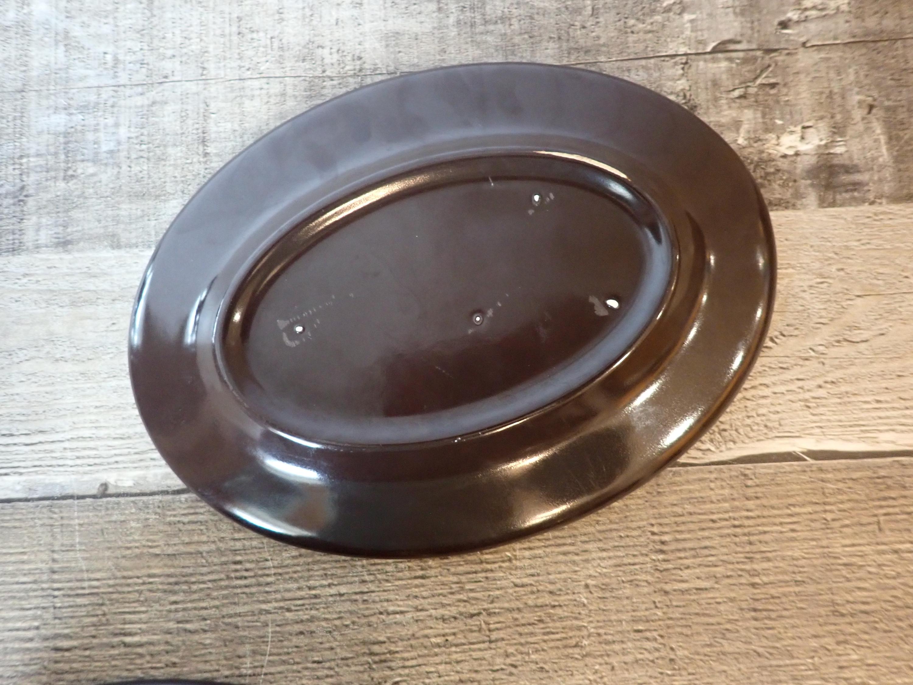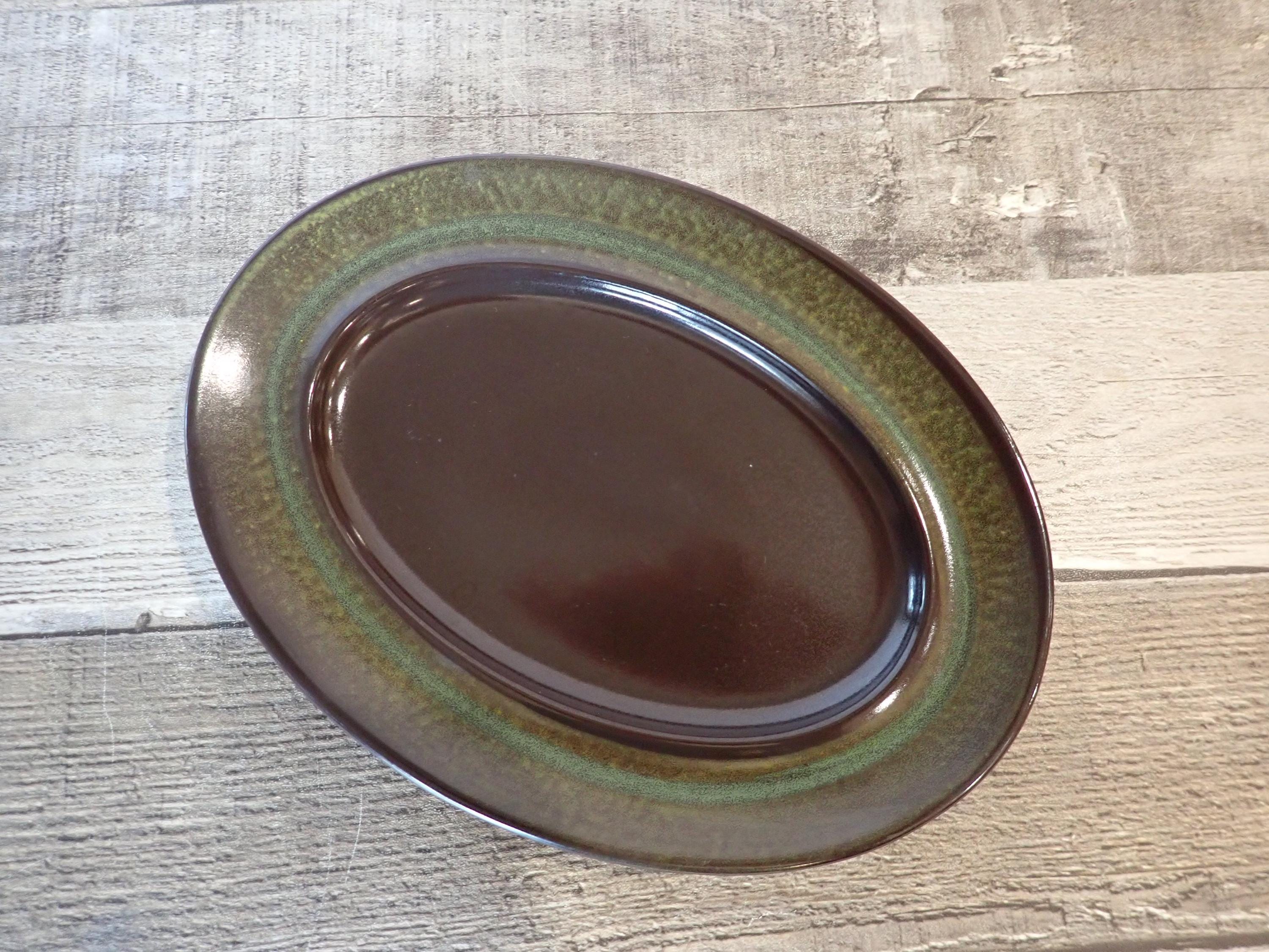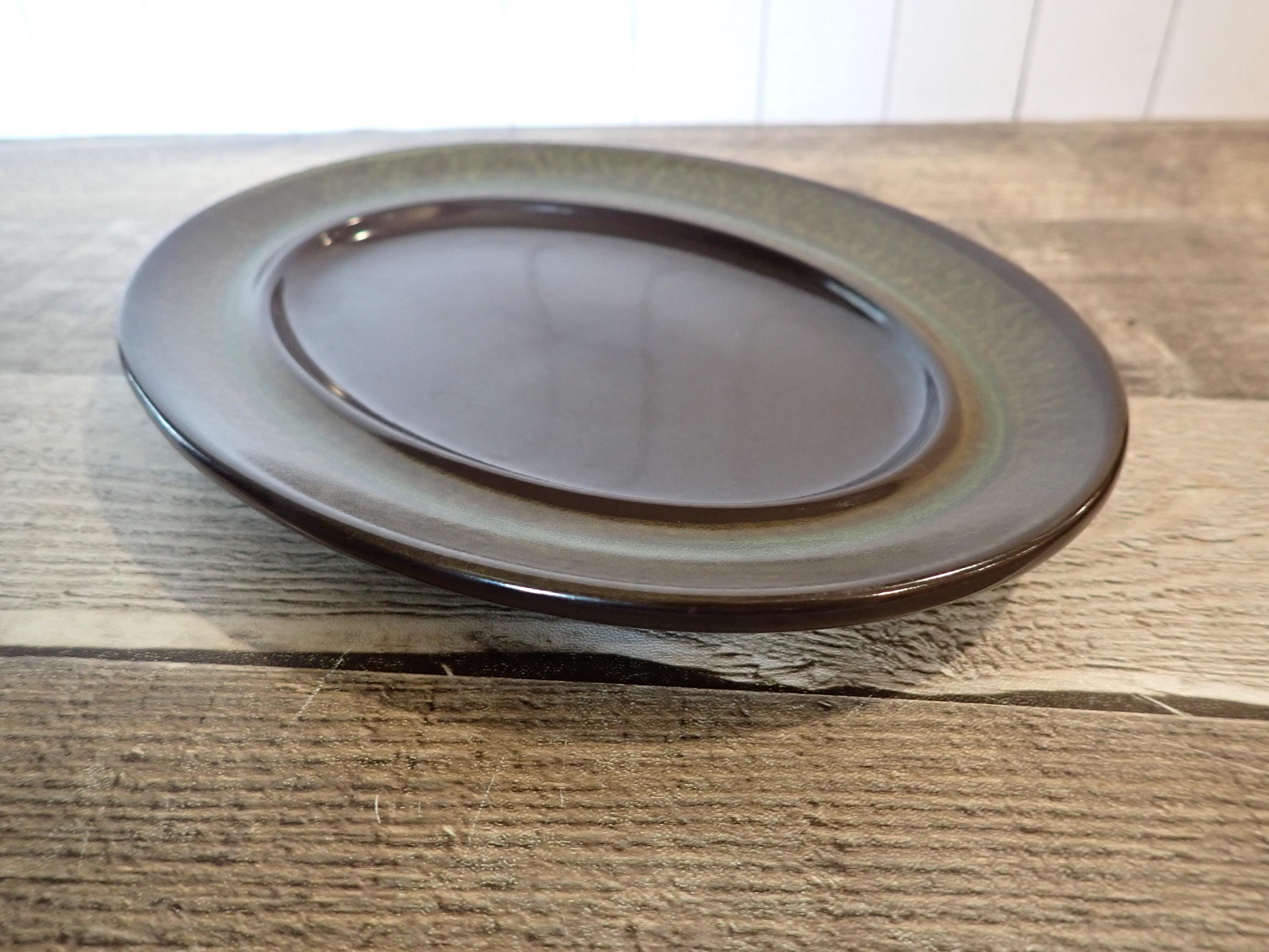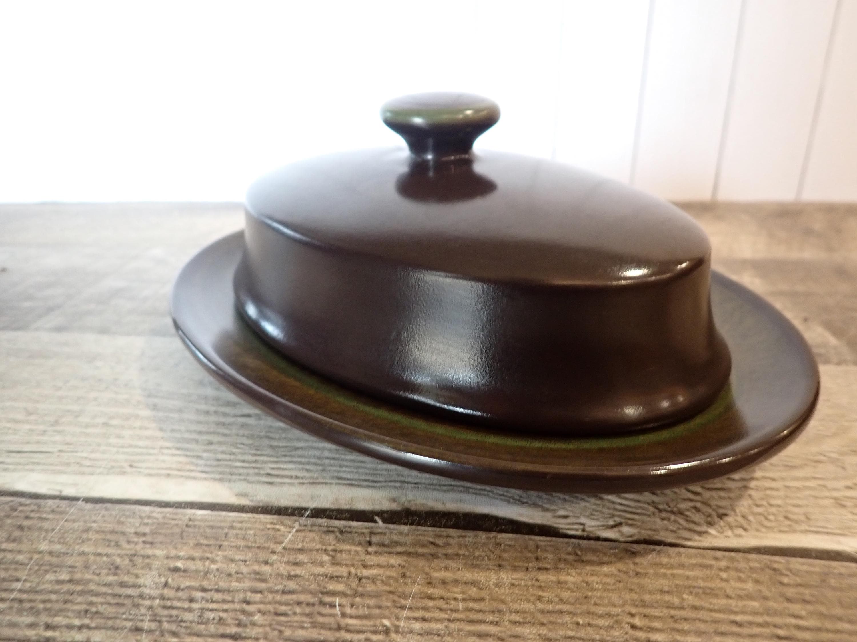 This butter dish by Franciscan is in the Madeira pattern and is a dark brown stoneware, accented with a green band. The butter dish includes the oval plate and lid - the plate is 7.75" long by 5.75" wide, and the lid is 6.5" long and 4.25" wide. Both pieces are in very good condition with no chips or cracks.