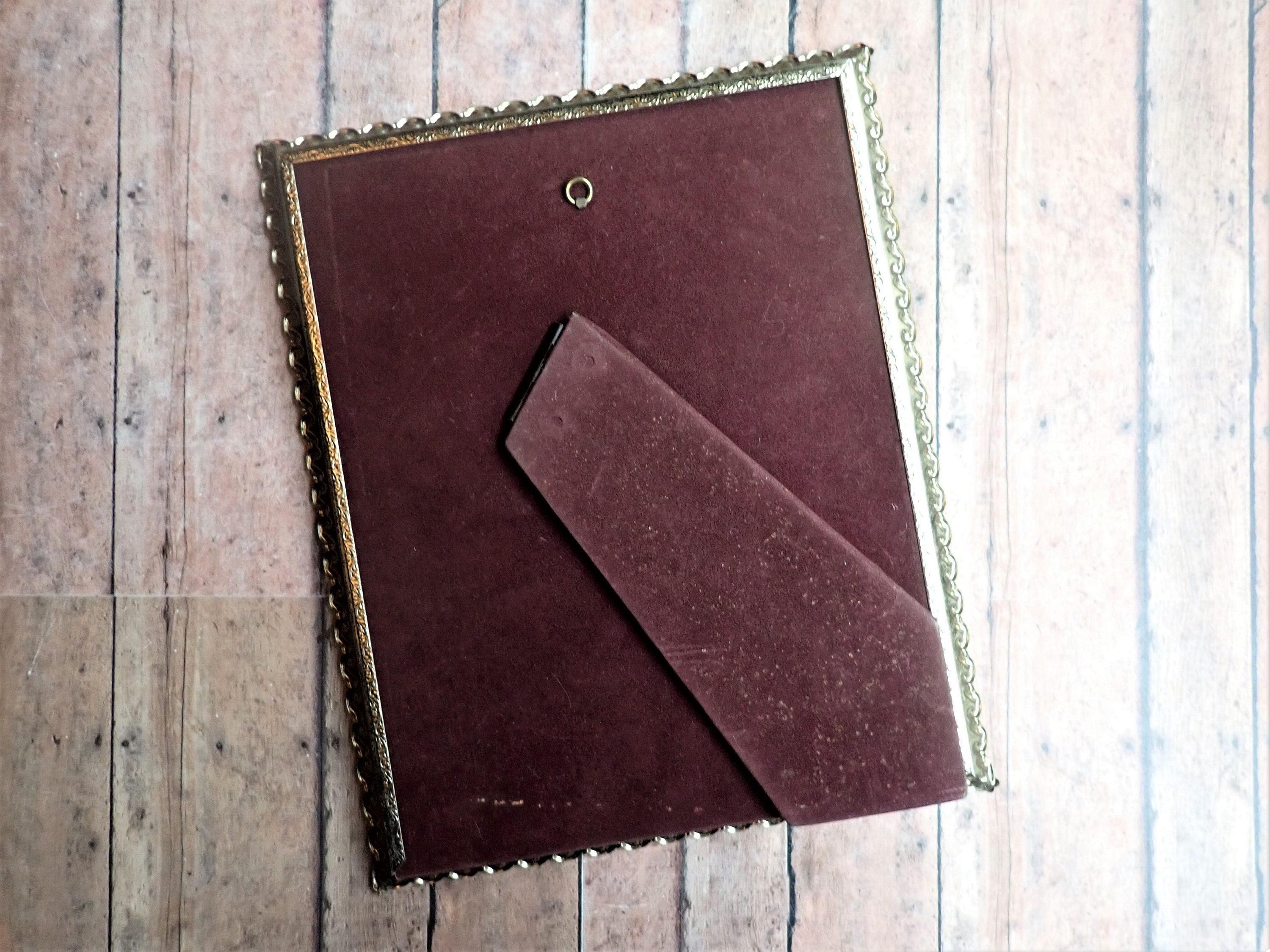 This brass metal frame is an 8x10 frame and is accented with a white enamel whitewash over the frame. The frame is an 8x10 size, and have a piece of clear glass over the photo opening and a cardboard backing piece with a photo stand. Each frame is nicely detailed with textured scroll or looping design around the edge of the frame, and the metal has been coated with a white enamel to create a whitewash style finish, with the raised metal details showing through.