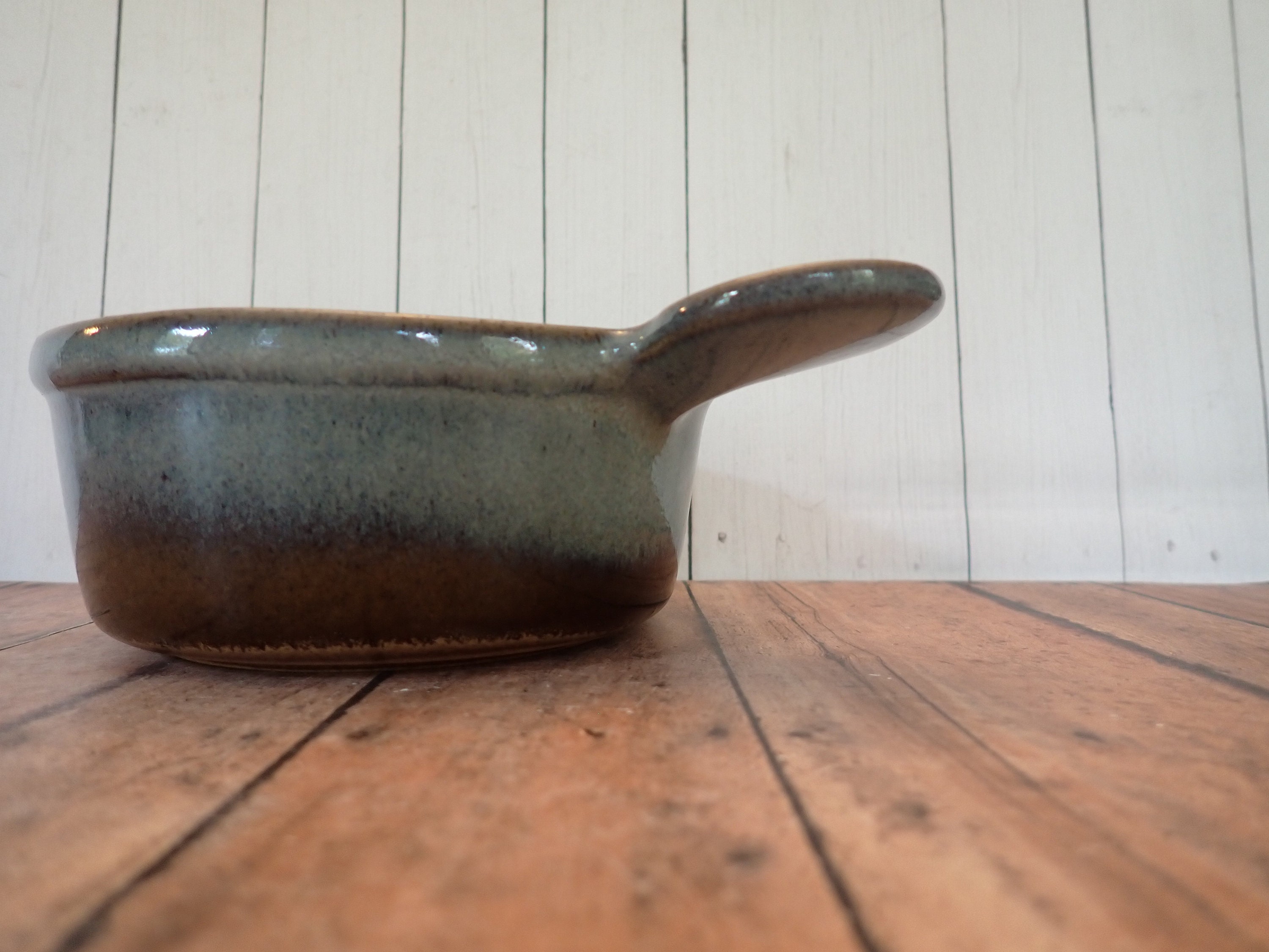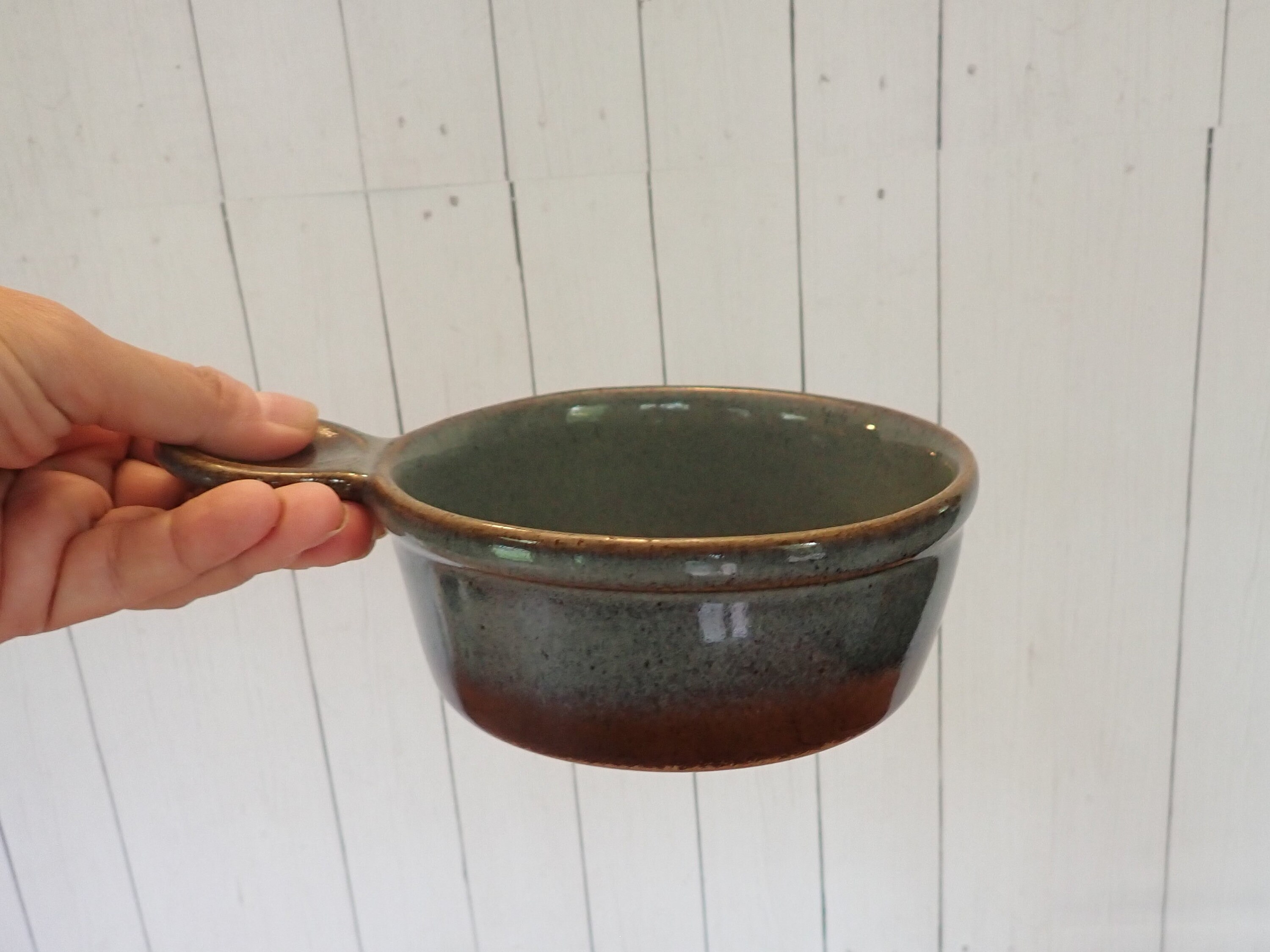 This small soup bowl by Pottery Craft USA is 2.25' tall and 5" in diameter. It is a round bowl with a small circular handle on one side. The bowl is glazed in blue, with brown around the base of the bowl The bottom is marked: POTTERY CRAFT / MADE IN USA. The bowl can hold 13 oz. filled to the rim.