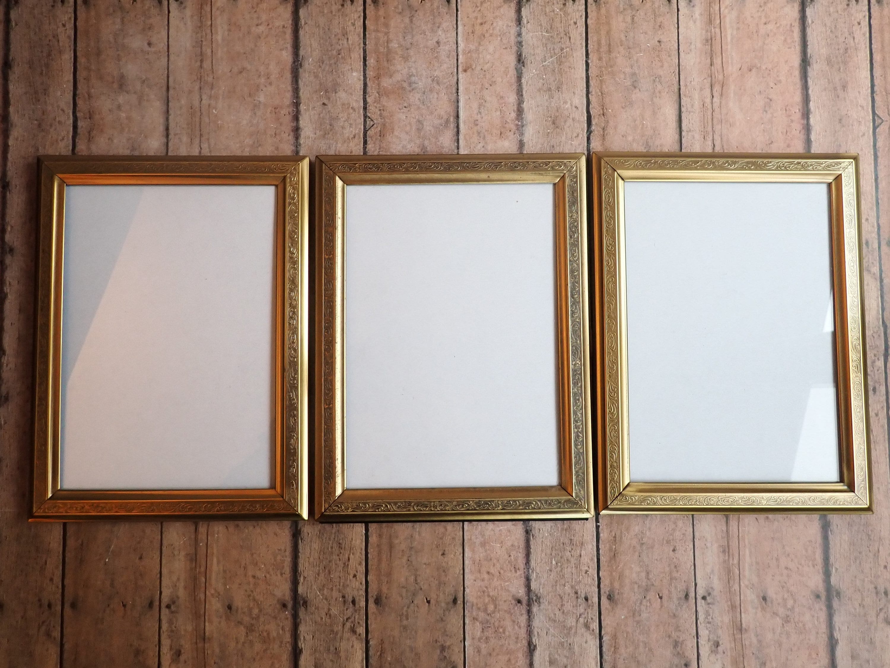 This set of frames includes 3 matching brass/bronze colored 5x7 frames. The frames are 5" x 7" size, and have a piece of clear glass over the photo opening and a cardboard backing piece with a photo stand. The frames are 6" wide by 8" tall overall, and can hold a 4x6 photo. The frames have a nicely etched scroll and leaf design around the frames. One frame is slightly darker than the other two. The photos can stand either vertically or horizontally.