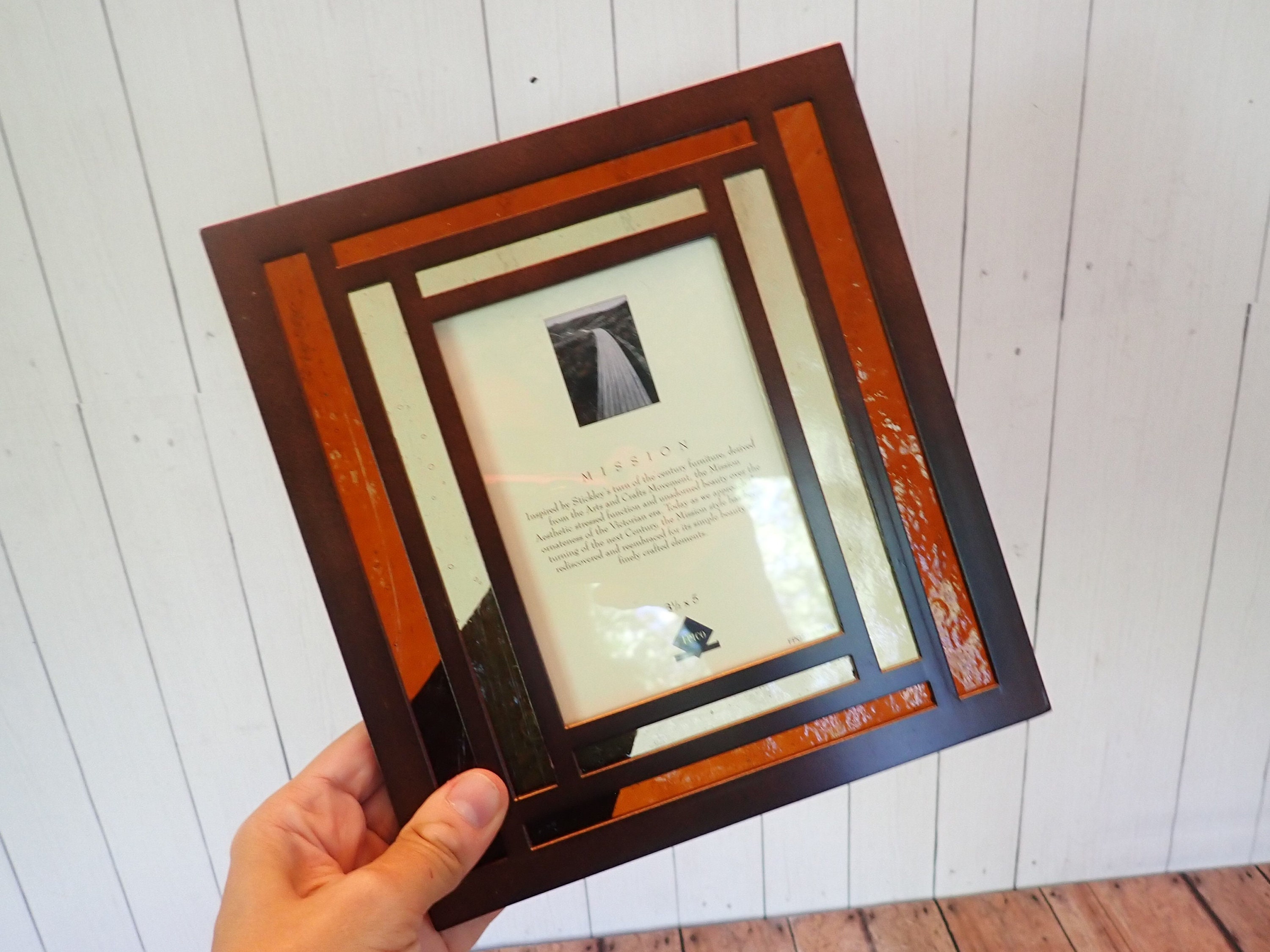 This metal and glass picture frame is 8.25" tall and 7.5" wide, and can hold one 3 1/2 x 5 photo vertically or horizontally. The frame is a brown metal, with orange and yellow glass inset panels. The glass and metal arrangement creates a class Mission Style design. There is a piece of 3 1/2 x 5 clear glass over the photo opening, and a cardboard backing piece with photo stand.
