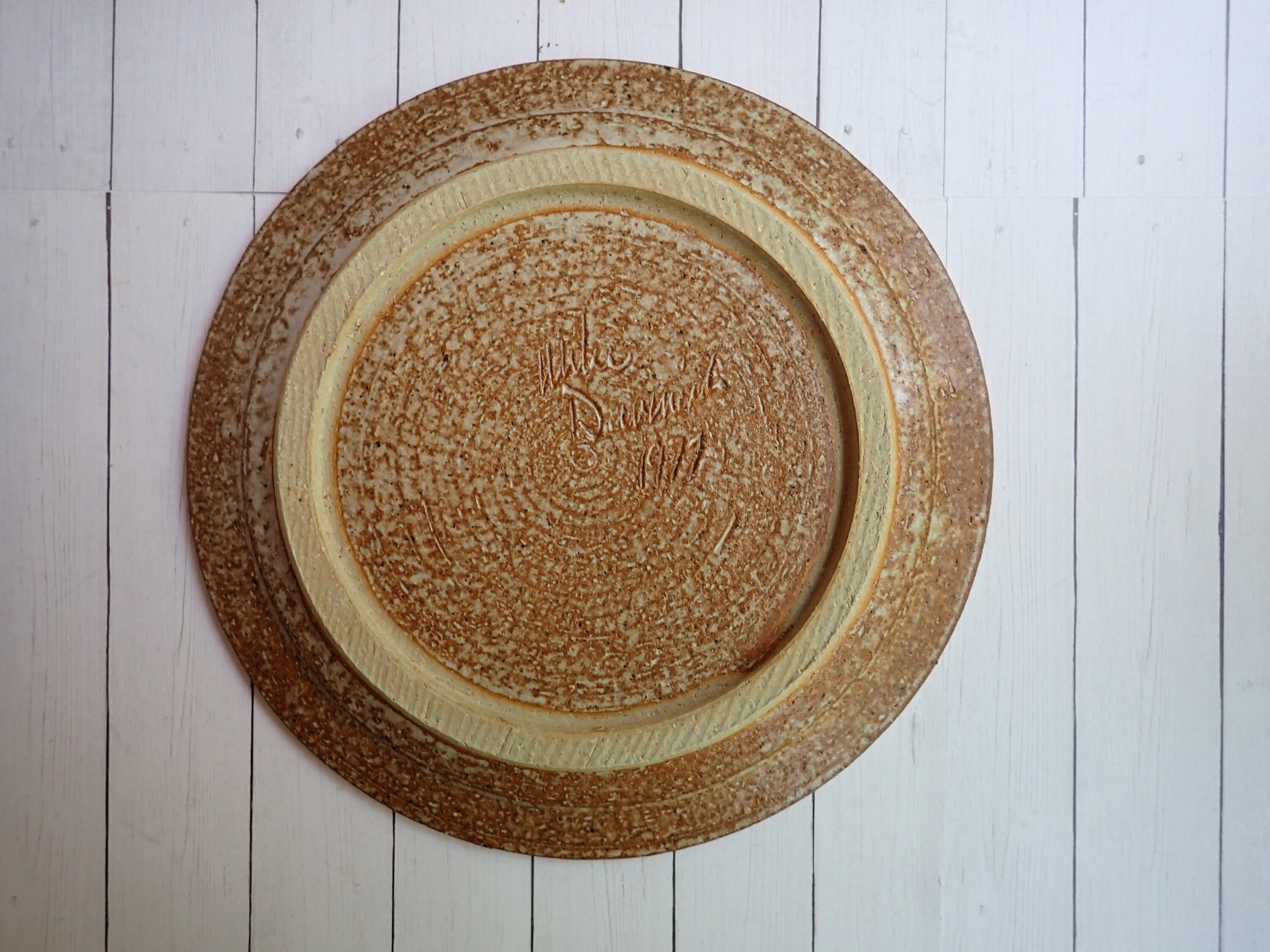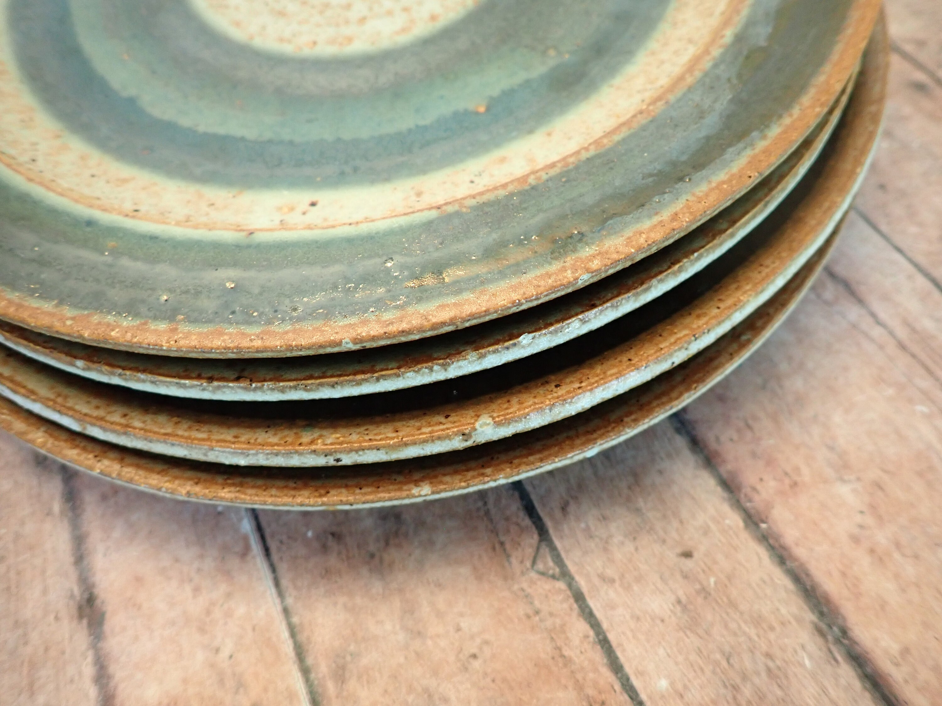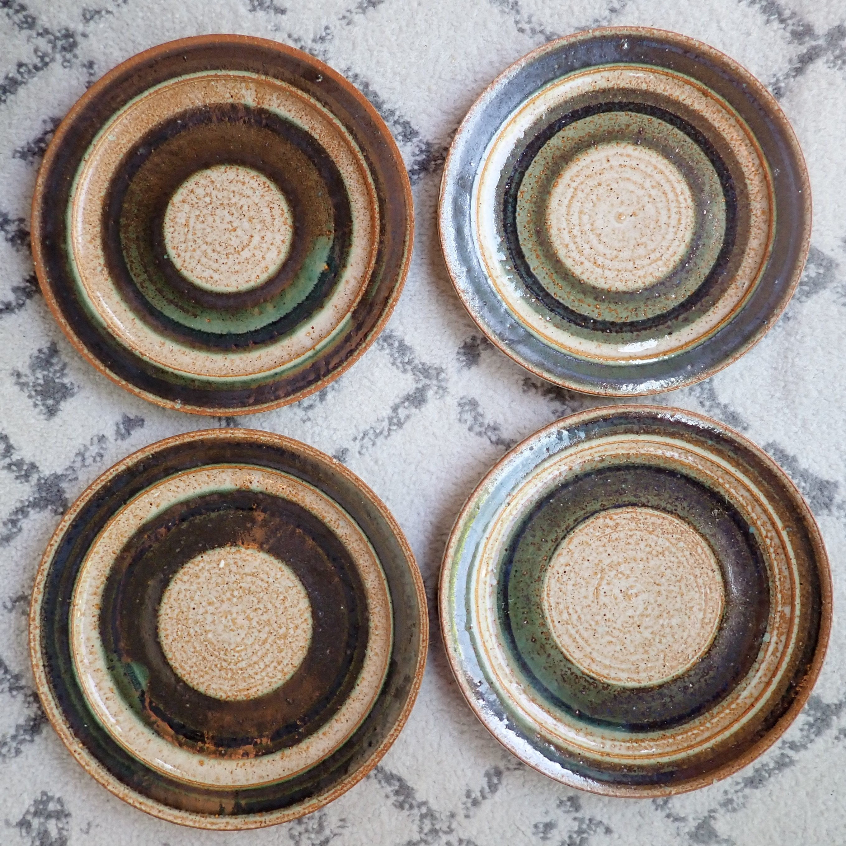 This set of 4 pottery plates were made in 1977 and are a brown and pottery with a concentric circle design. The plates are 9.75" in diameter and 1" high at the rim. The plates have a rustic style with a concentric circle design in white, green, and dark green (almost black.) The bottoms of the bowls are signed by the artist - I've been unable to make out the last name but the first name is Mike and the last name looks like Durnick.