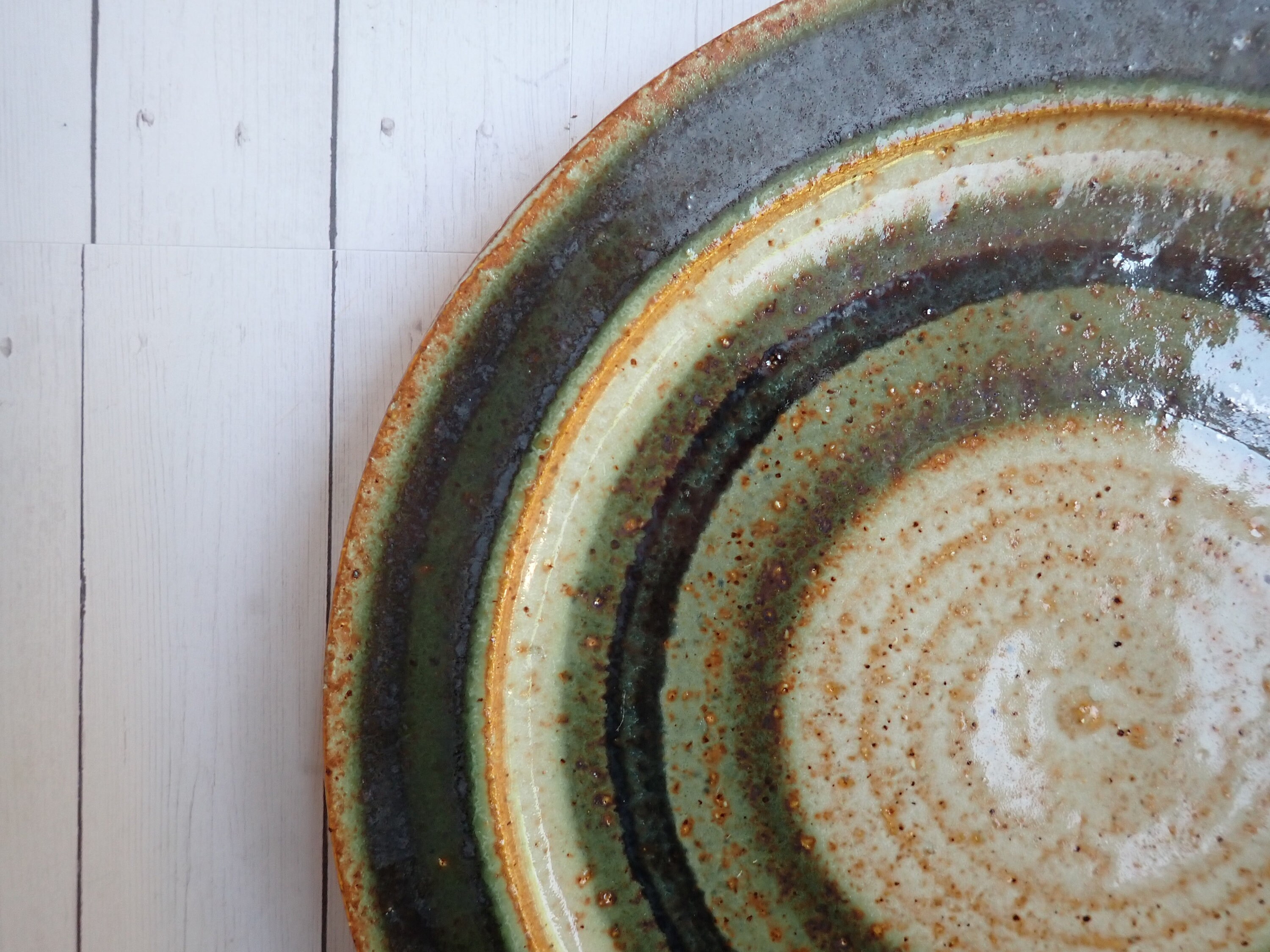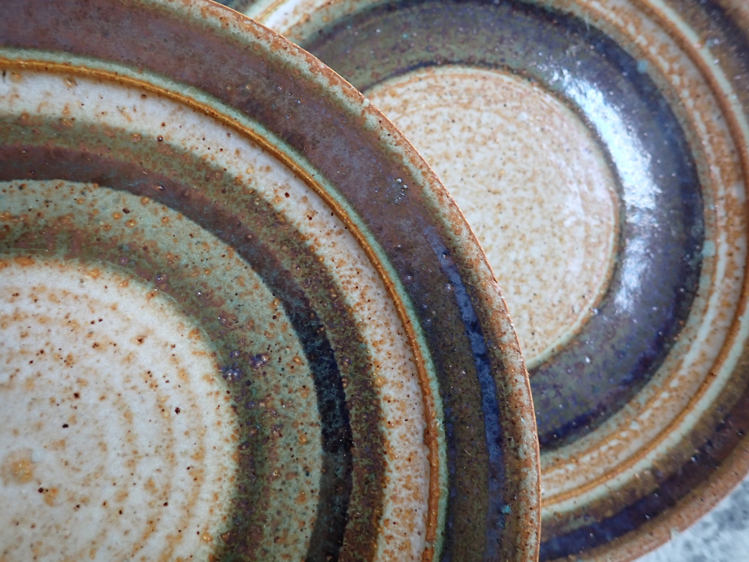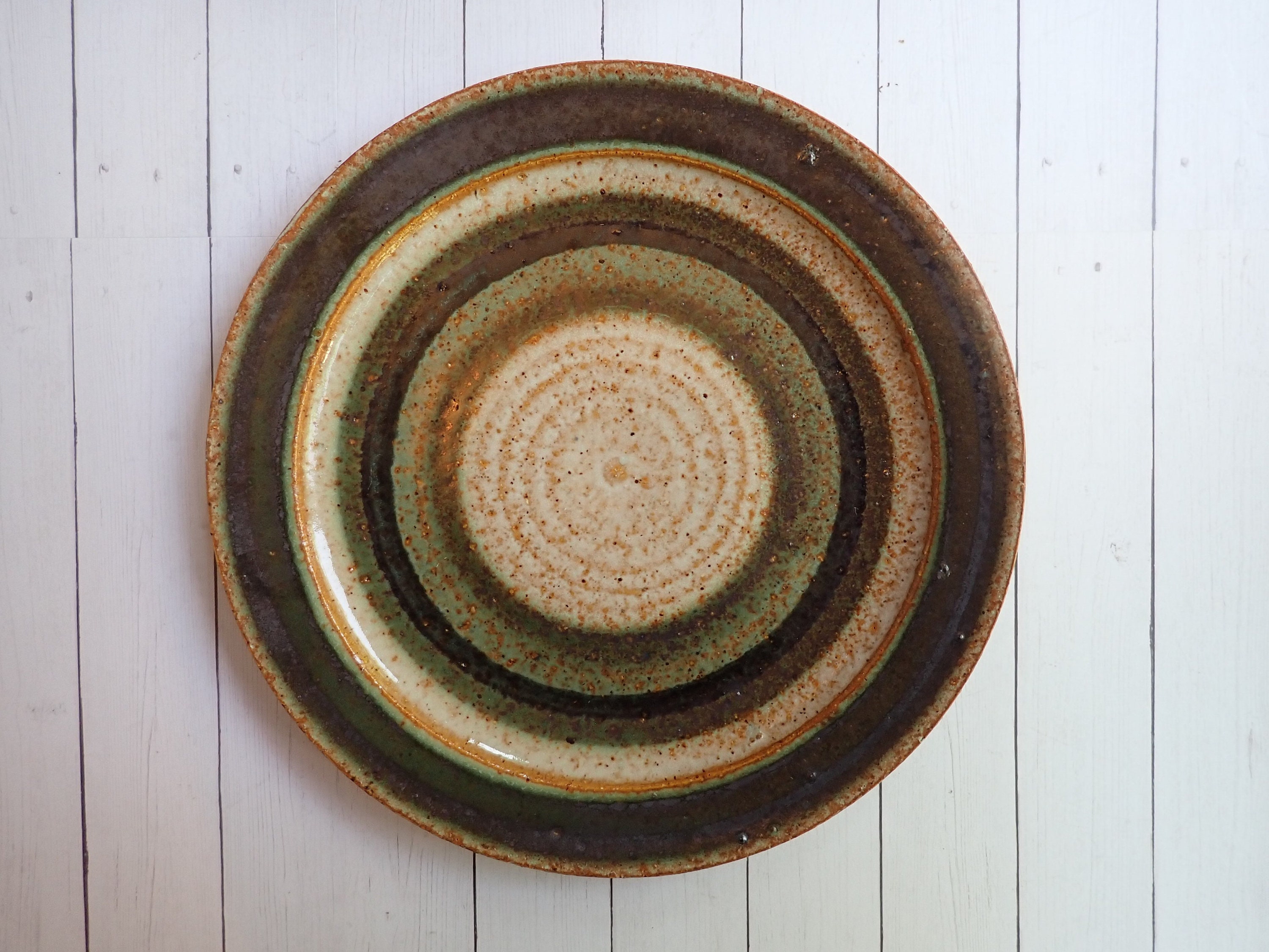 This set of 4 pottery plates were made in 1977 and are a brown and pottery with a concentric circle design. The plates are 9.75" in diameter and 1" high at the rim. The plates have a rustic style with a concentric circle design in white, green, and dark green (almost black.) The bottoms of the bowls are signed by the artist - I've been unable to make out the last name but the first name is Mike and the last name looks like Durnick.
