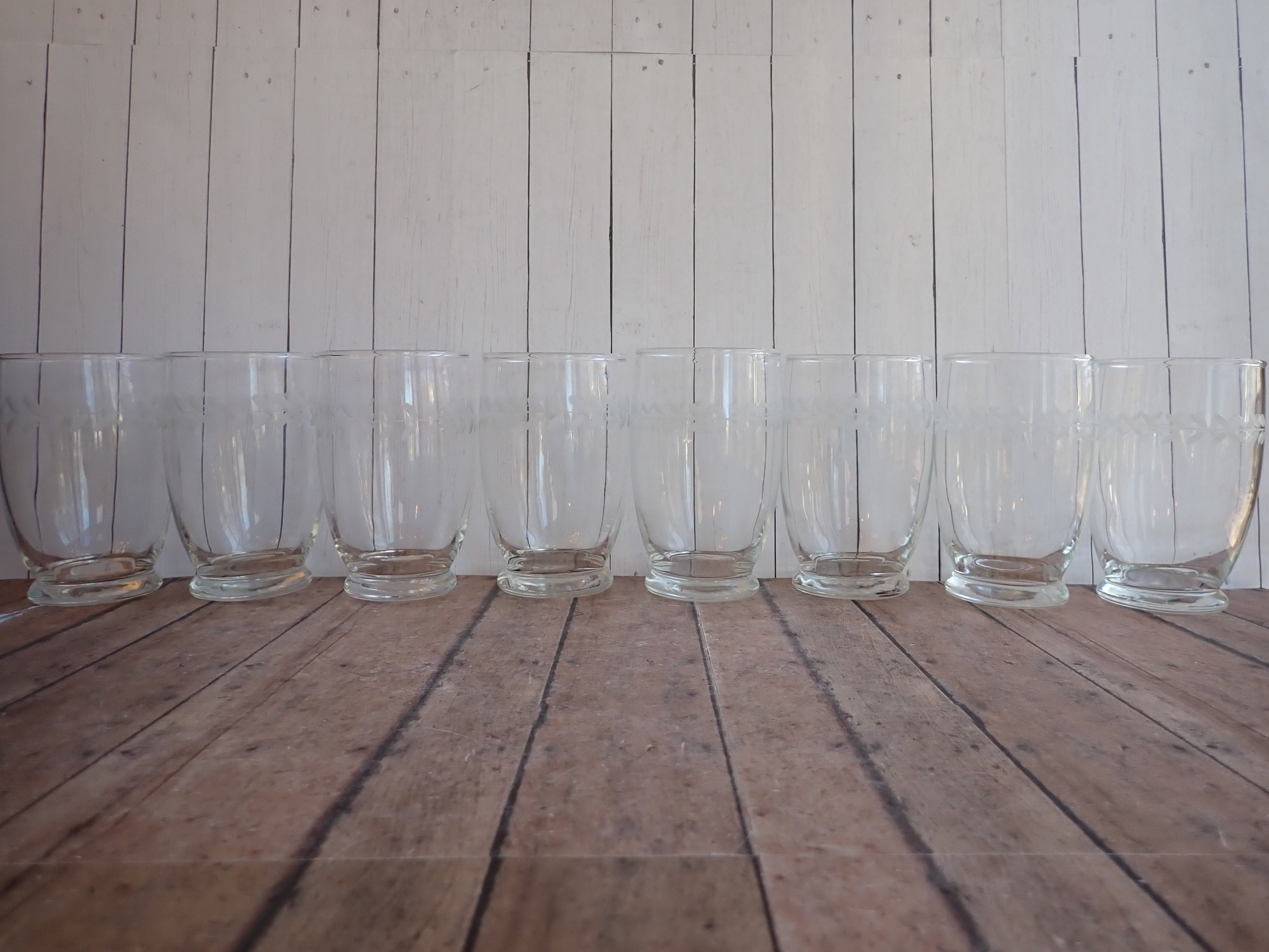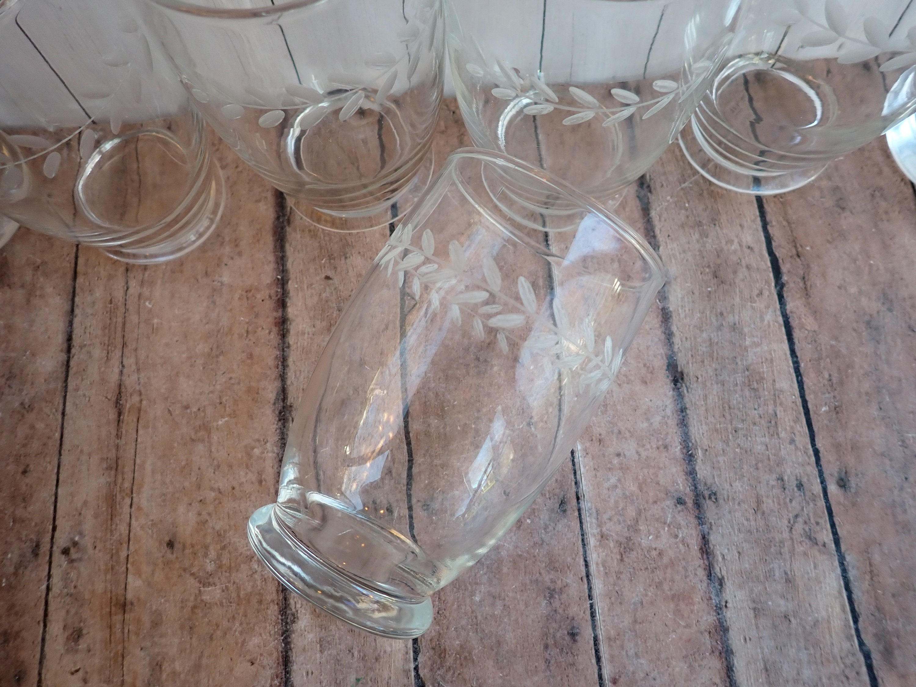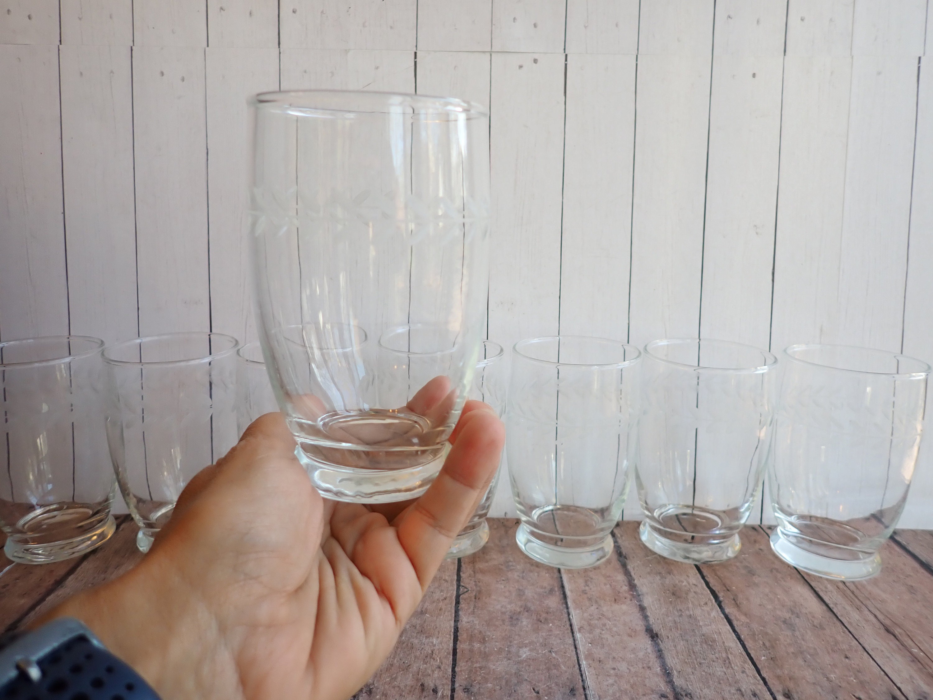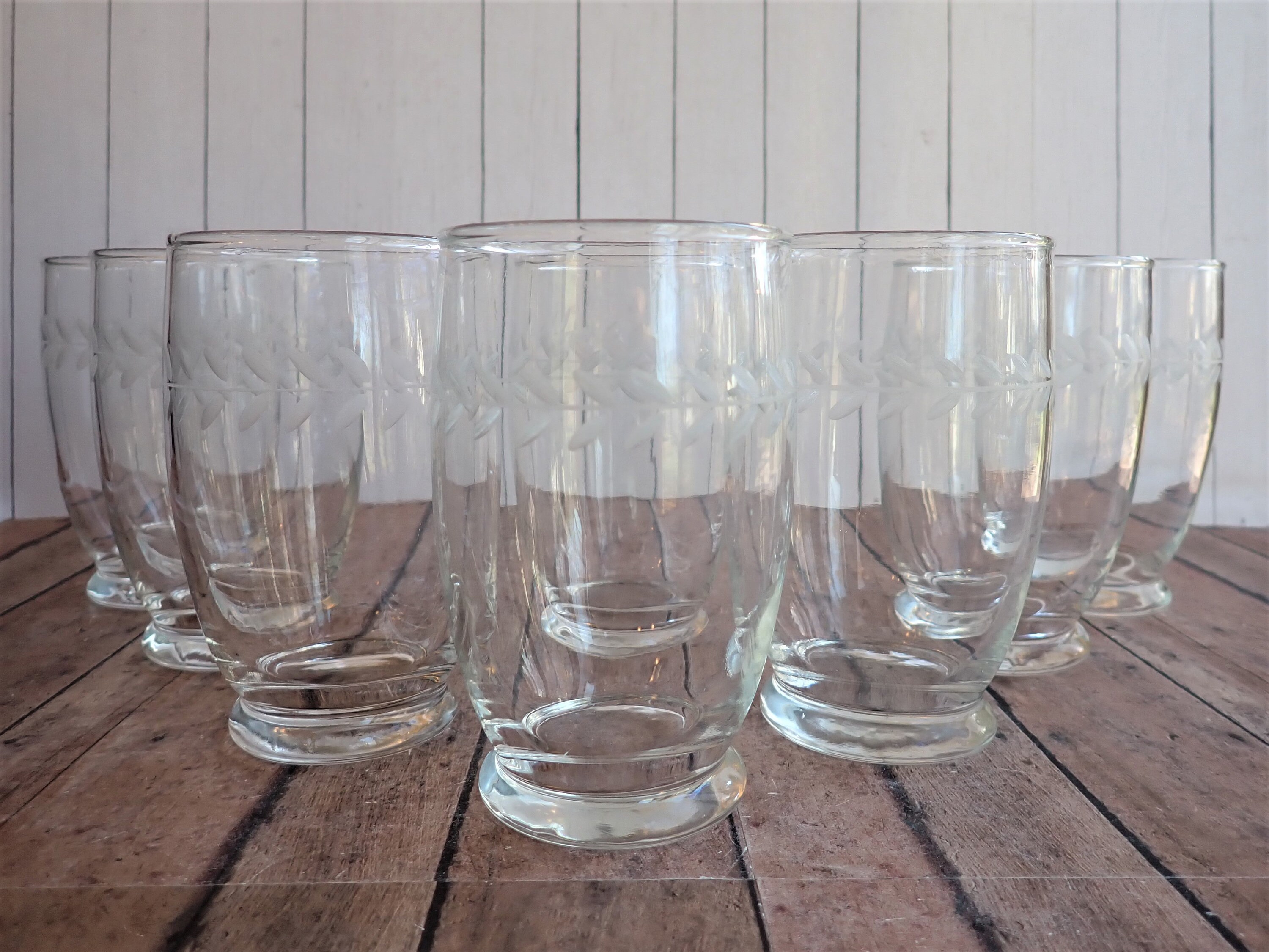 This set of 8 clear glass tumblers by Anchor Hocking are in the Laurel Gray pattern and are the 12 oz. tumblers. They are 4.75" tall and 2.75" in diameter. They are a clear glass and have a sleek and simple design with a horizontal band of etched leaves around the glass. They have a small, round footed base. They are the Gray Cut style, not the Polished Cut, which gives the leaves a light matte gray color.