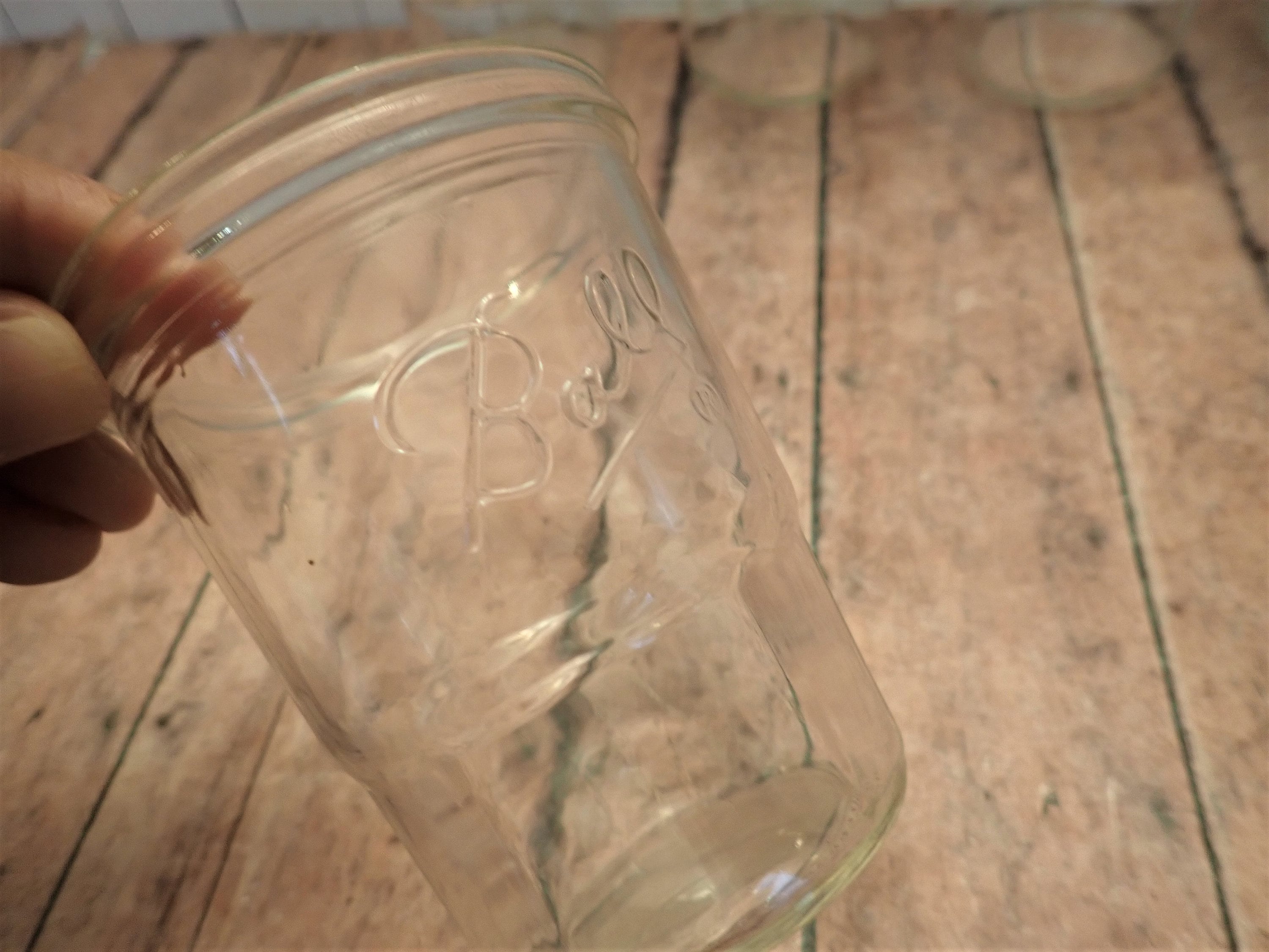 This great set of 6 clear glass juice glasses have a simple jelly jar style with a banded rim around the top. They are round glasses with a tapered bottom that has a flat paneled design. They each measure 3.75" tall and 3" in diameter at the top. They can hold 8 oz. filled to the rim. They are marked BALL on the sides. These glasses can hold 8 oz. filled to the rim.