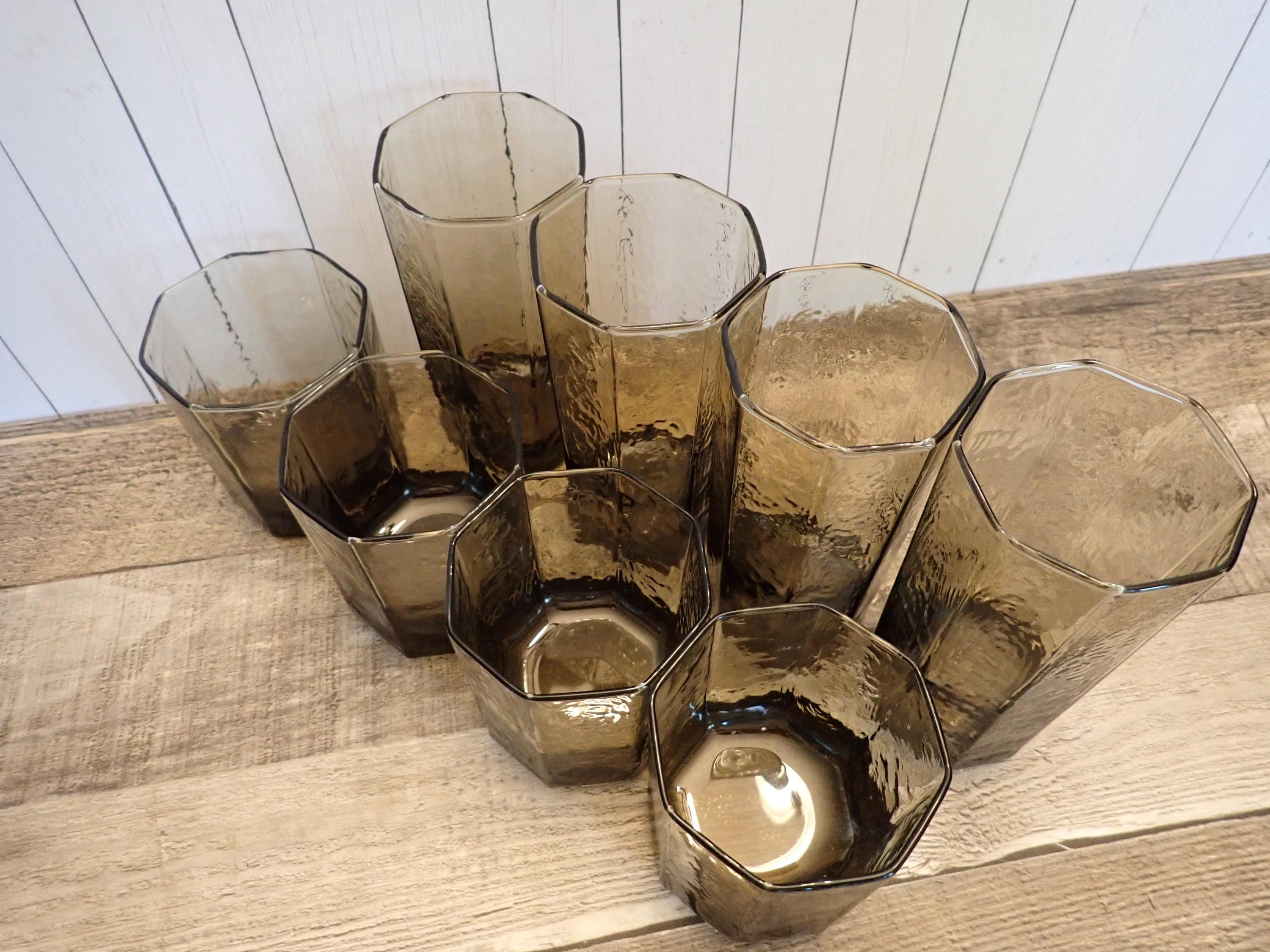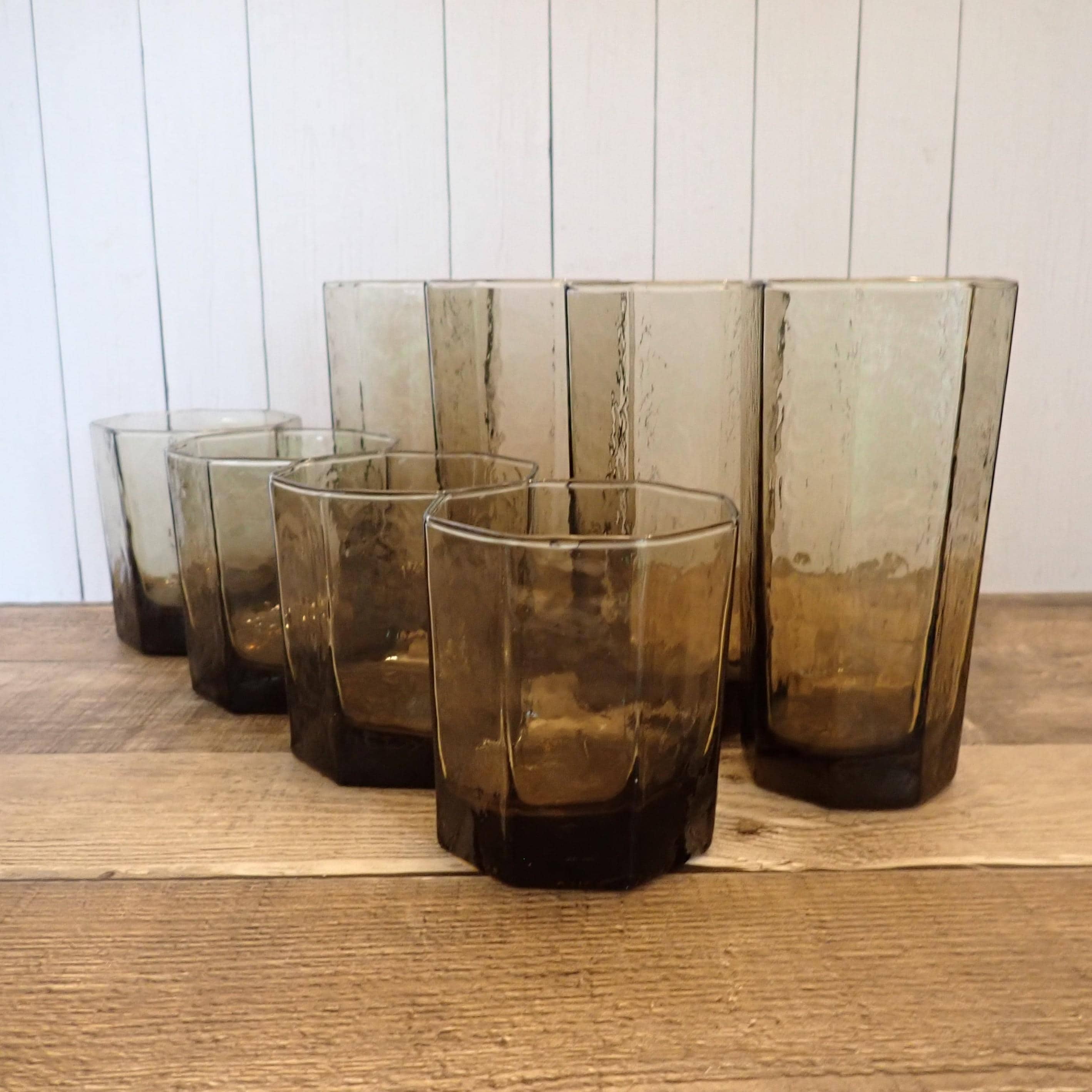 This set of 8 Libbey glasses includes 4 tumblers and 4 old fashioned glasses. They are the tawny brown color in the Facets pattern. The tublers are 5.5" tall and 2.5" in diameter, and have an octagon shaped body. The old fashioned glasses are 3.5" tall. The glass has a lightly mottled texture. These are the smaller size tumbler in this pattern, and they hold 12 oz. All 8 glasses are in very good condition with no chips or cracks. Great set of Libbey facets tumblers!