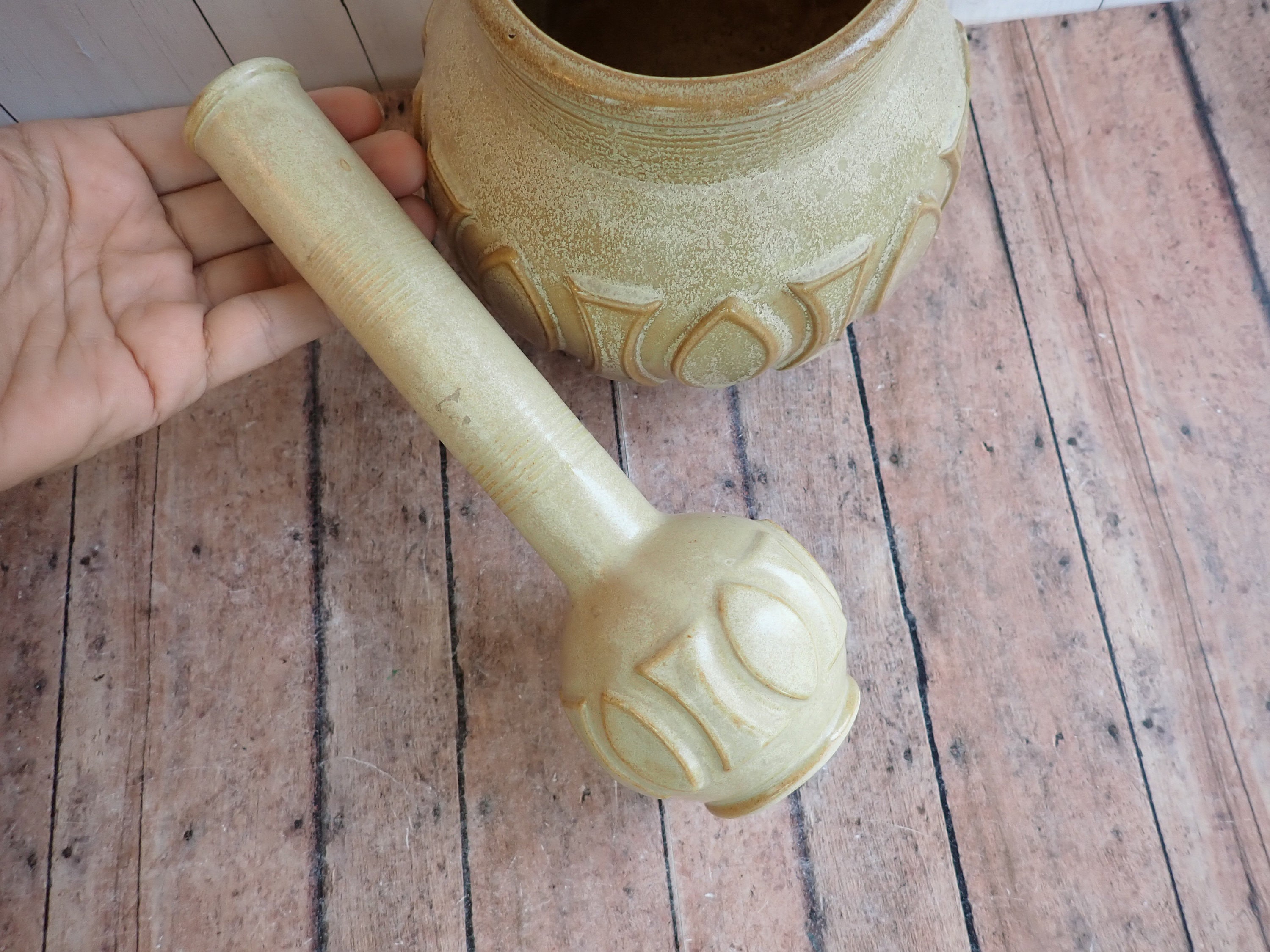 This set of vases includes 2 coordinating pottery vases in the same pattern in different shapes and sized. There is a shorter, round vase, and a tall narrow vase. The shorter vase is 5" tall and 6" in diameter, and the tall vase is 8.25" tall and 3" in diameter. They are both a light tan ceramic with a raised geometric design around the middle of each piece. The shorter vase has an original label on the bottom that reads: CAFI DICKMAL CREATIONS JAPAN.