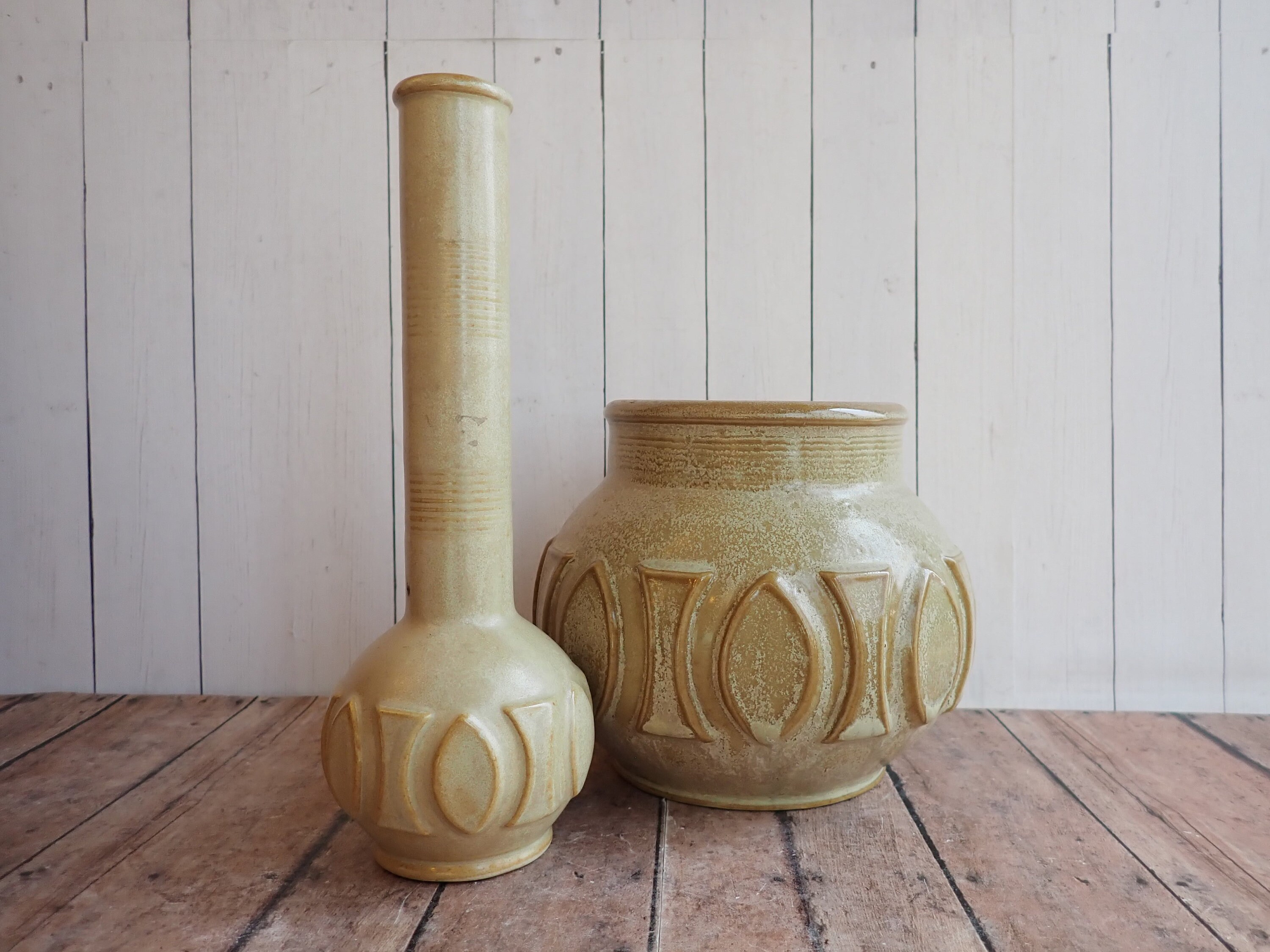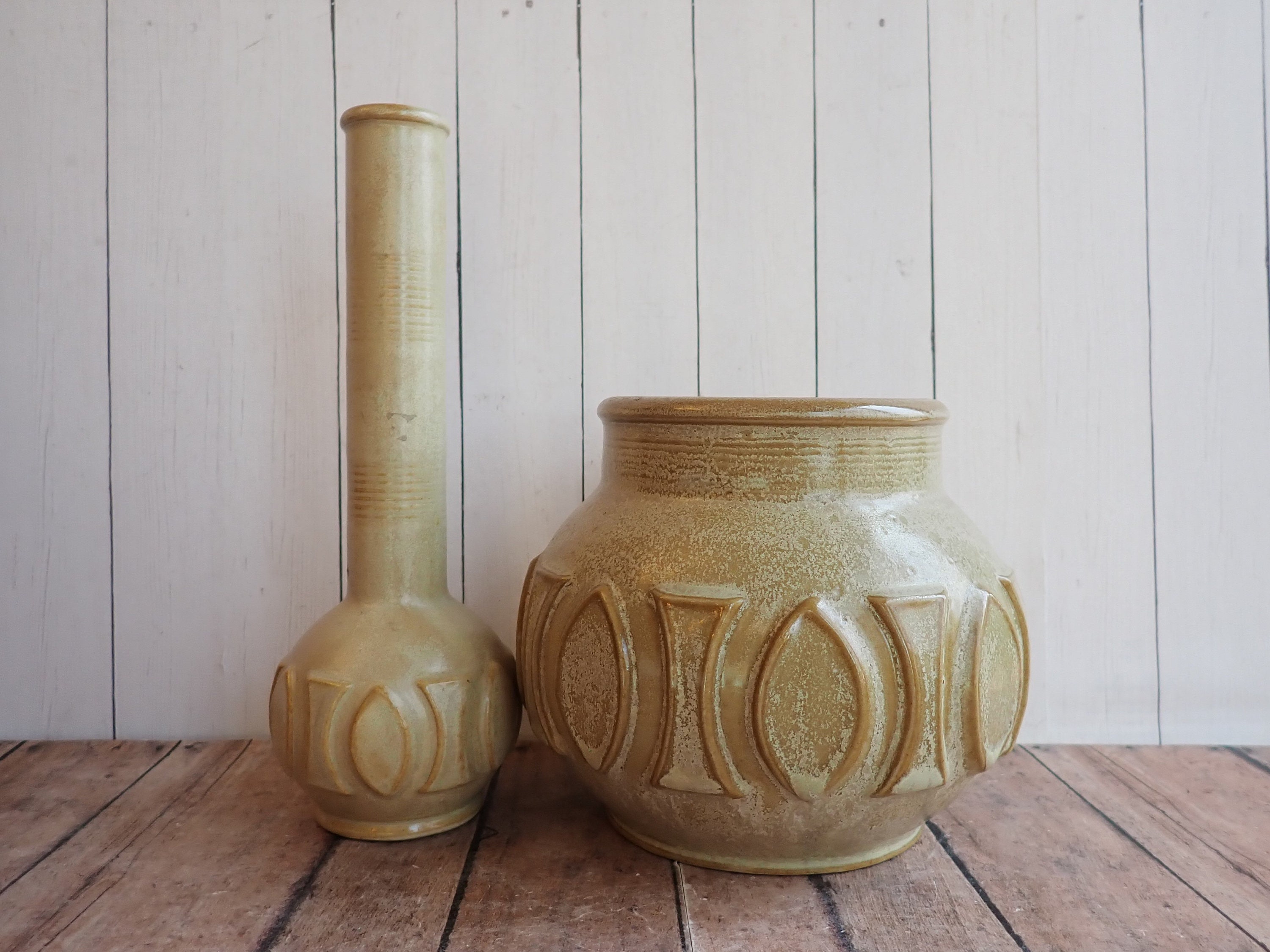 Both vases are in very good condition with no chips or cracks. The tall vase is a lighter color than the short vase. Great set of coordinating pottery vases!