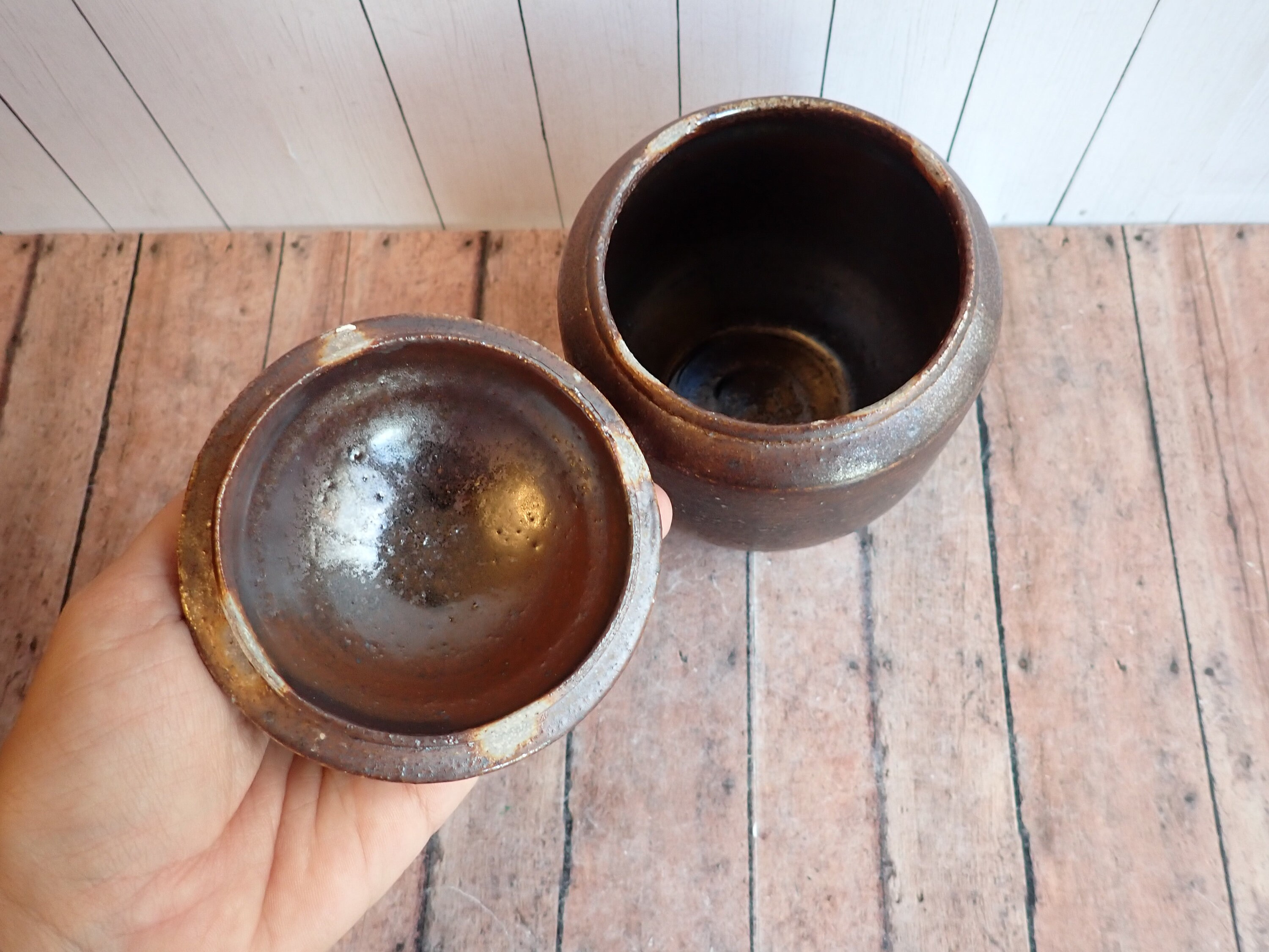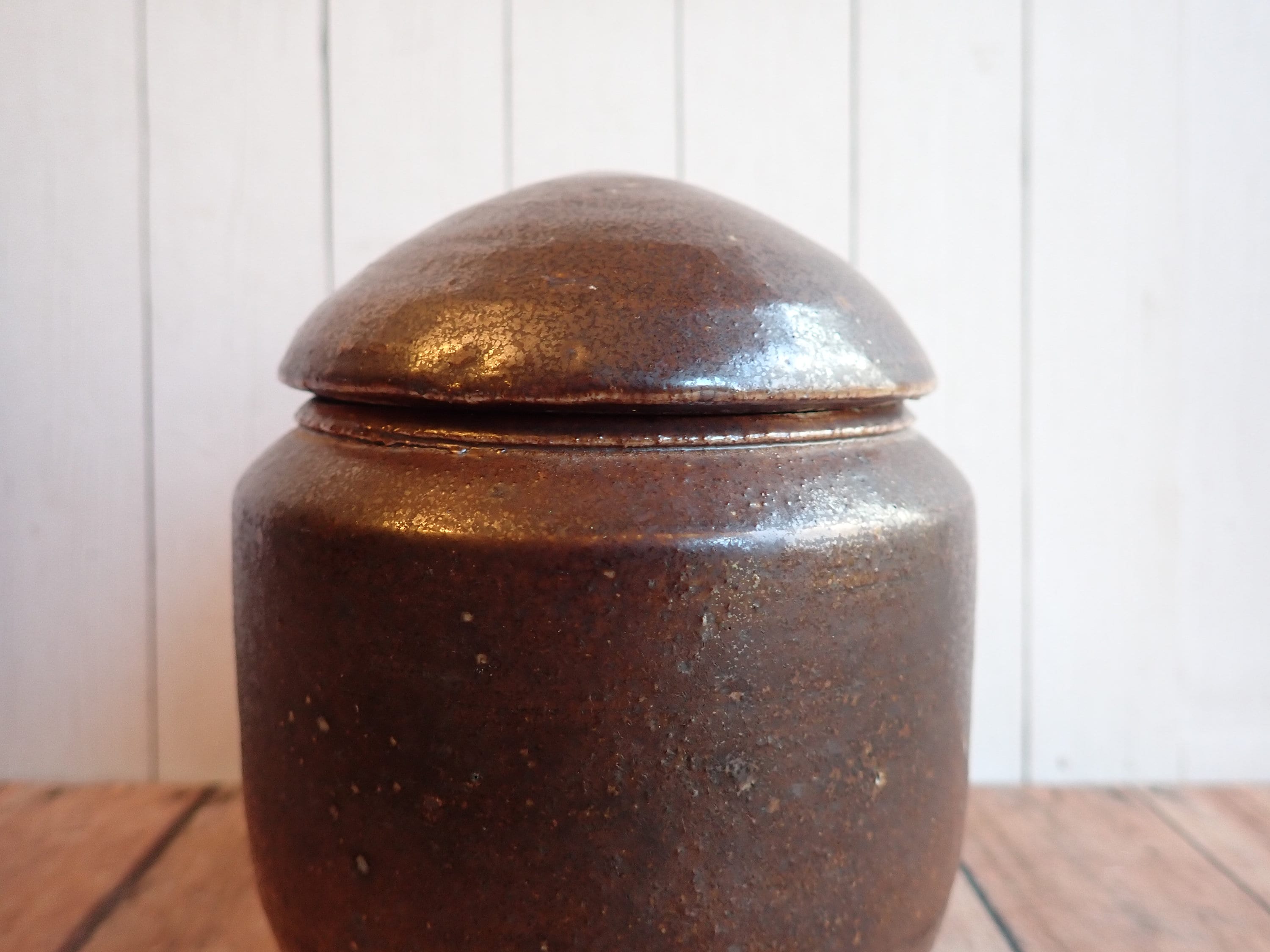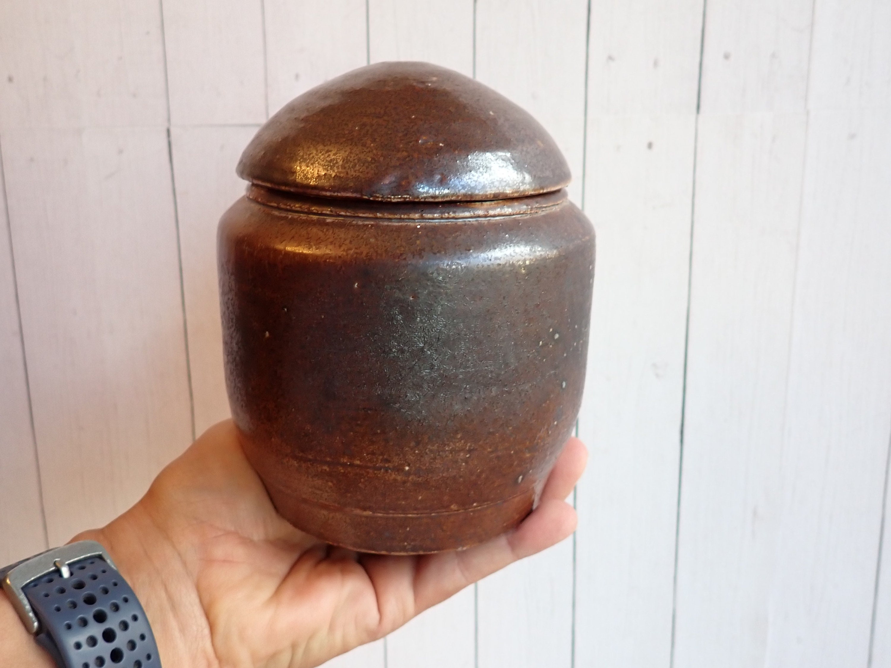 This great stoneware jar is 5.5" tall and 4" in diameter. It is a brown stoneware piece and has a smooth rounded surface. The jar has a rounded lid that rests on the lip of the jar. The bottom is signed with a makers signature - it looks Olen Steiner.