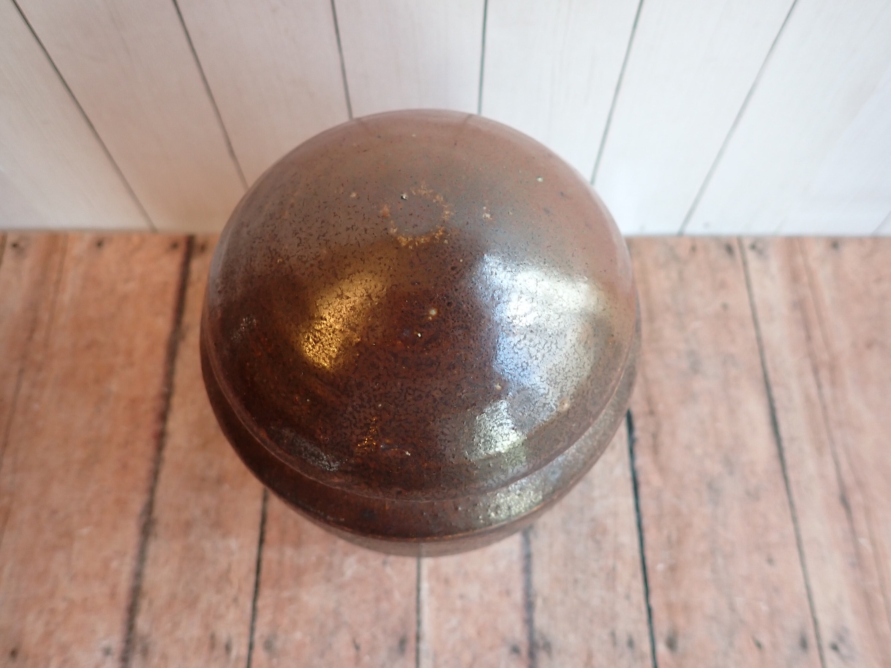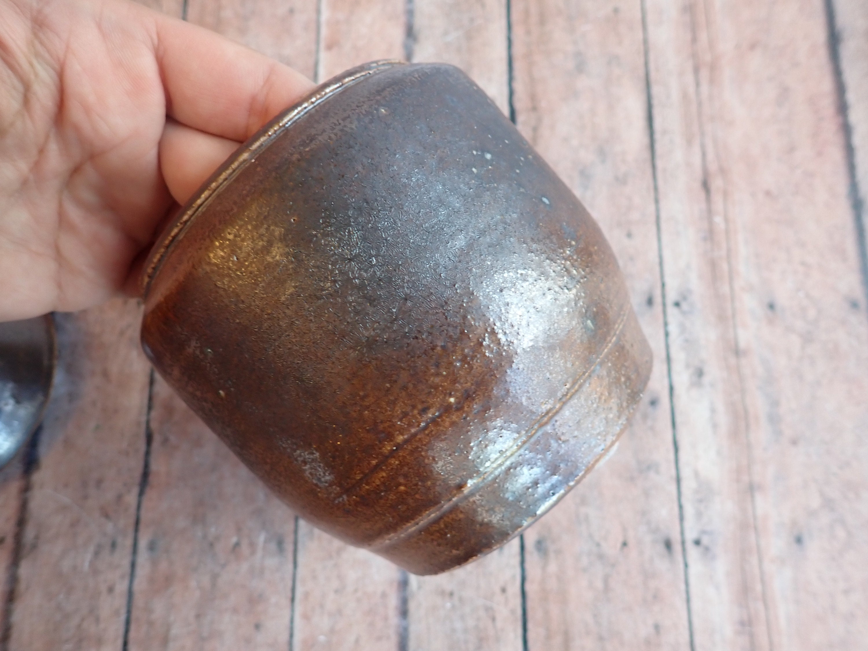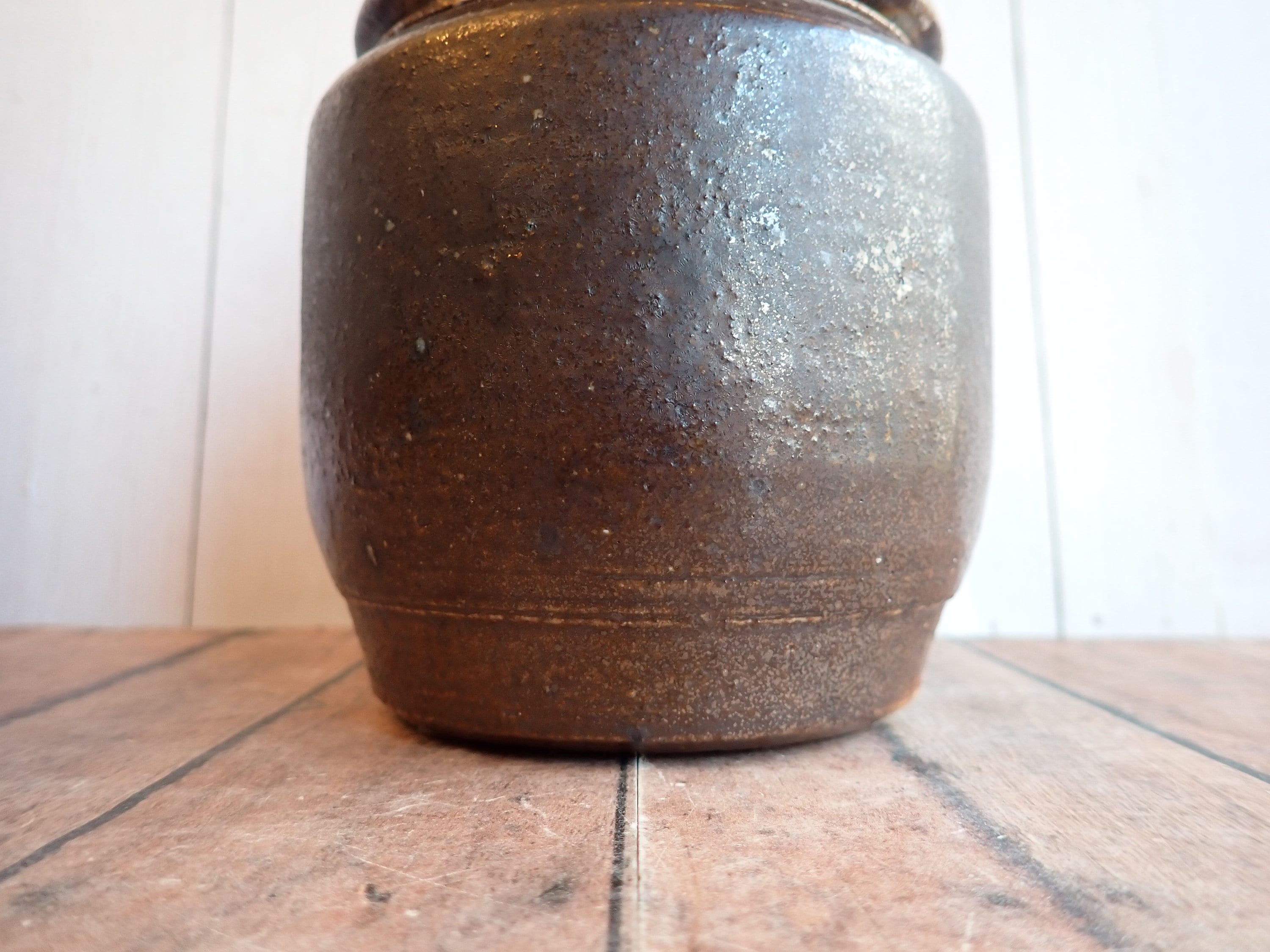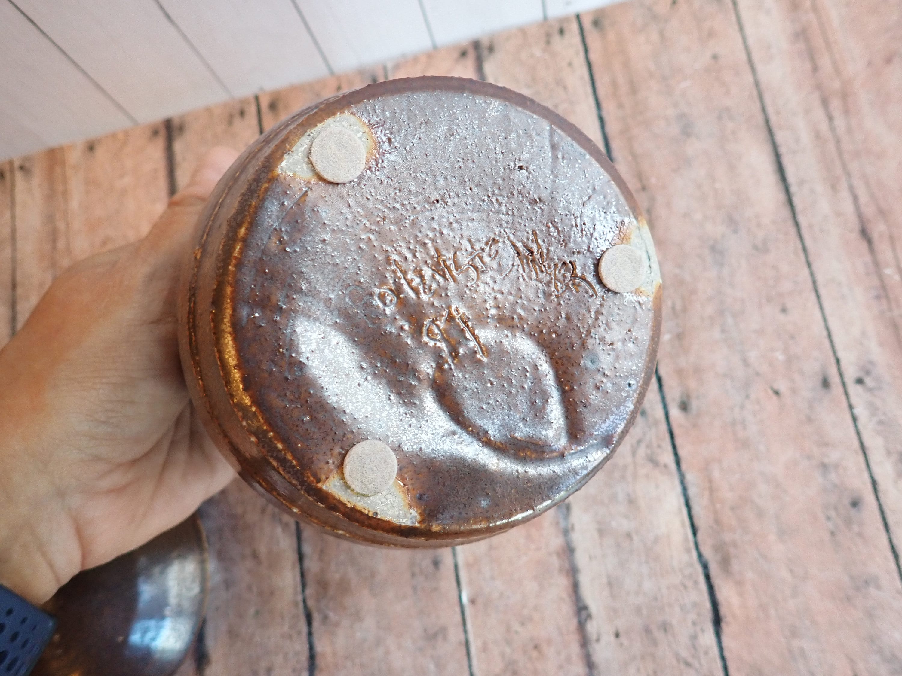 This great stoneware jar is 5.5" tall and 4" in diameter. It is a brown stoneware piece and has a smooth rounded surface. The jar has a rounded lid that rests on the lip of the jar. The bottom is signed with a makers signature - it looks Olen Steiner.