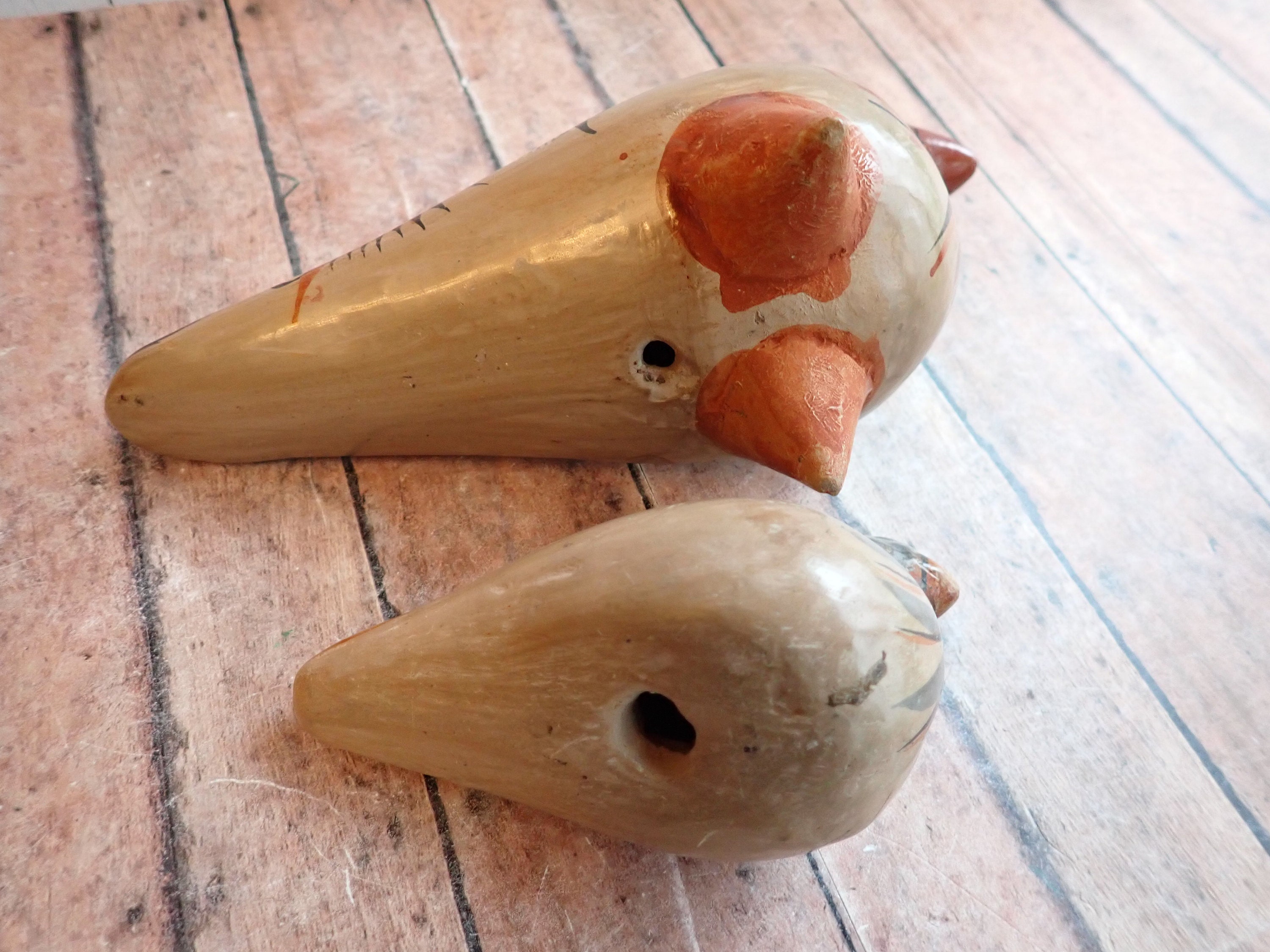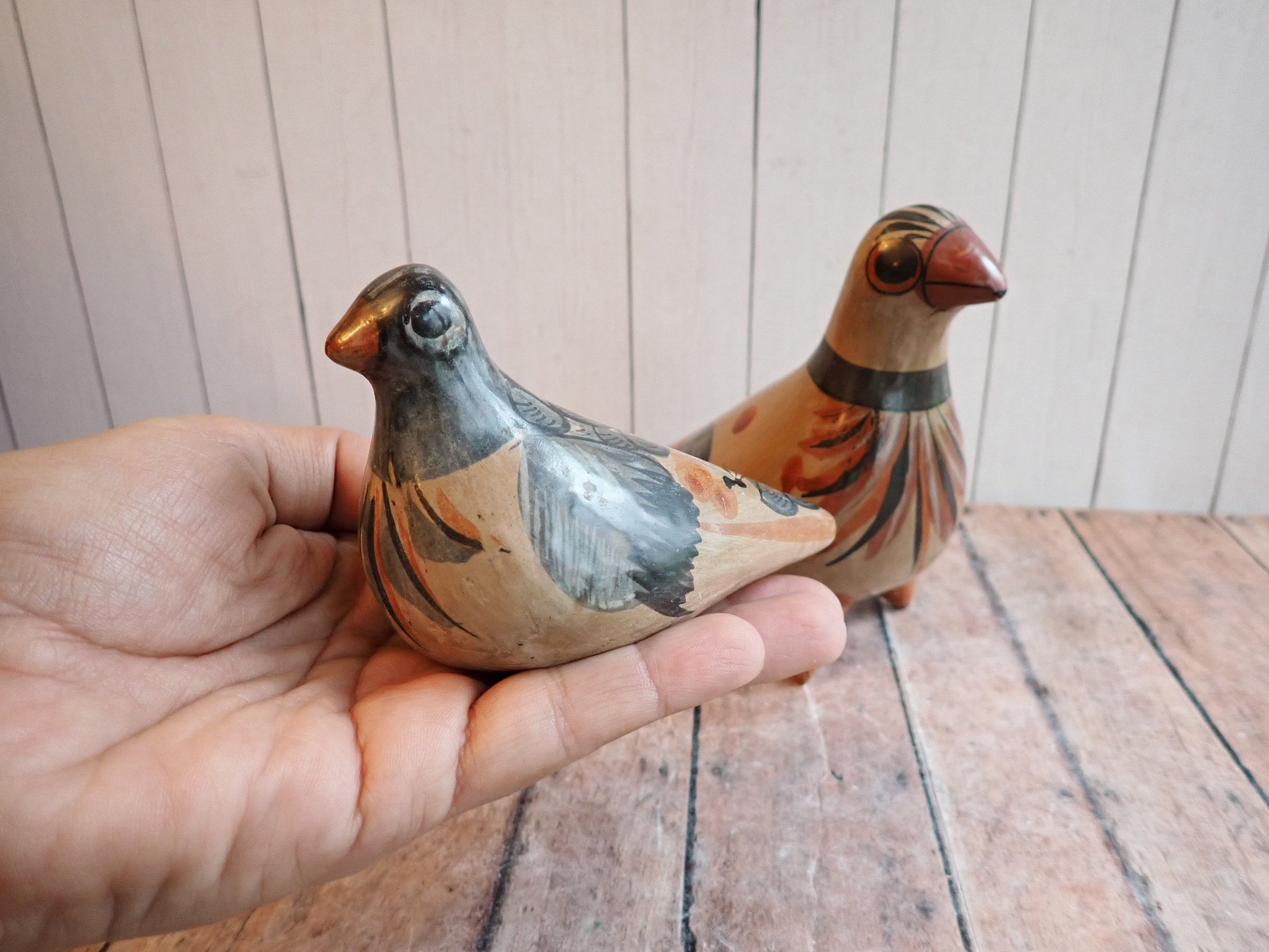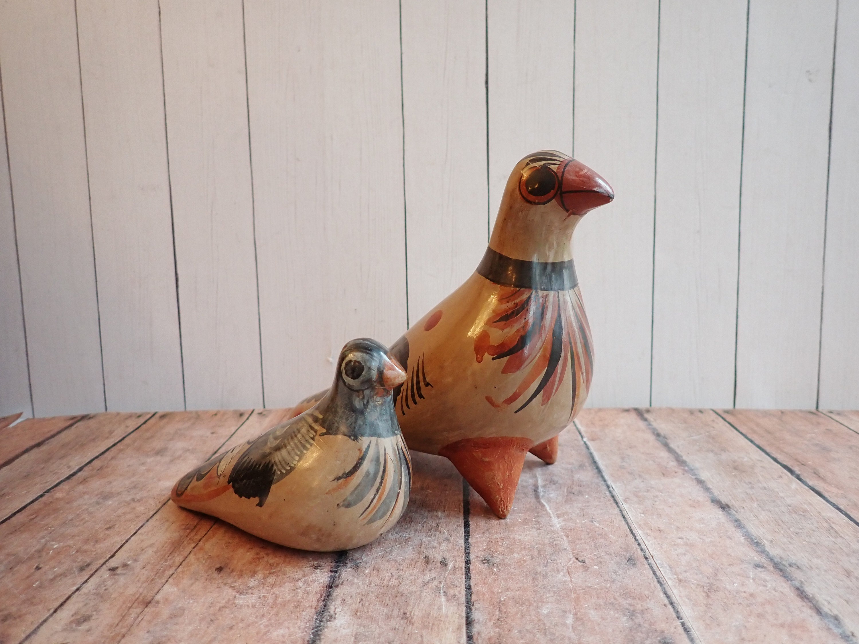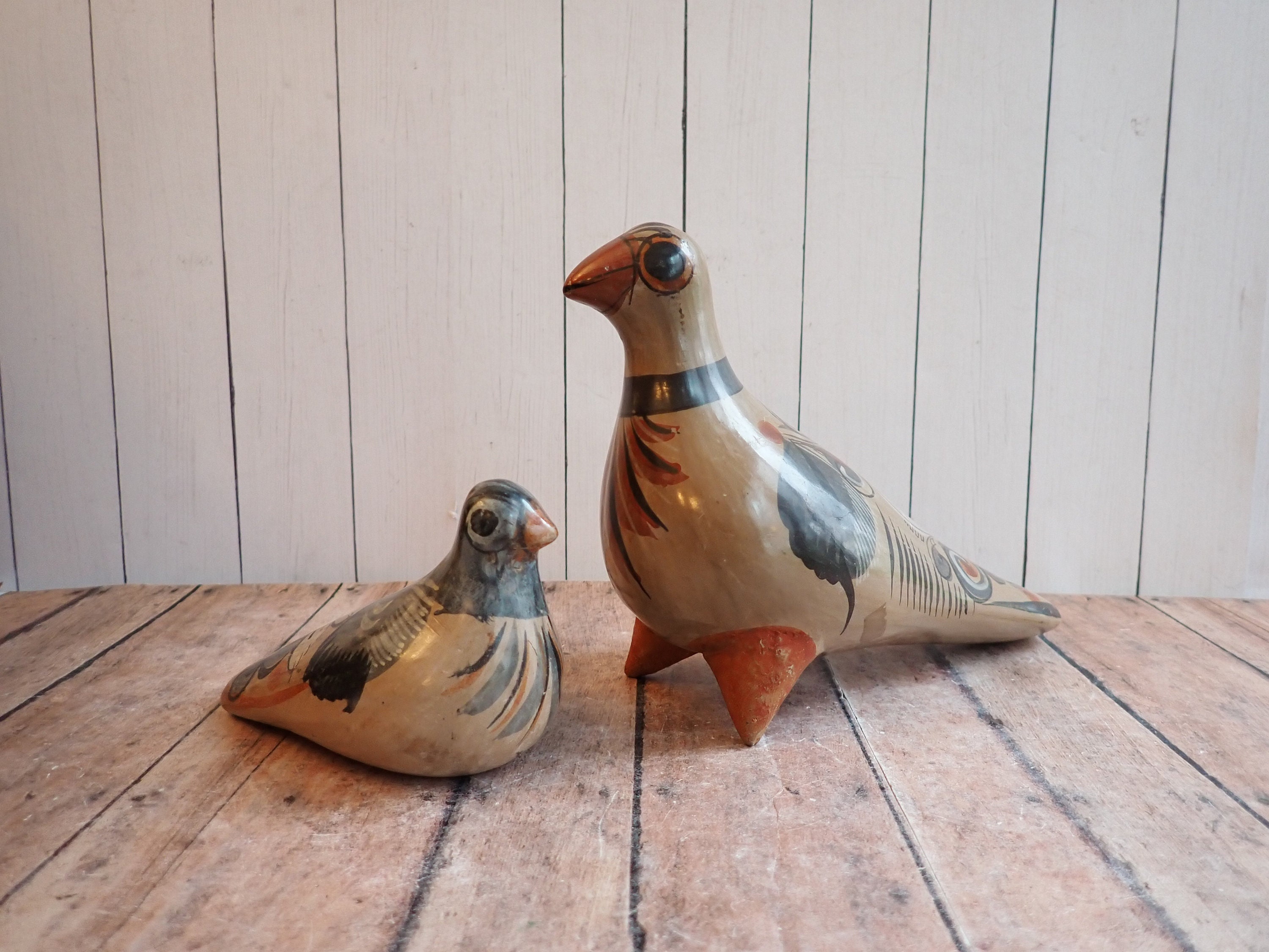 This set of 2 Tonala bird figurines includes a larger and smaller bird in coordinating patterns. The larger bird is 7" long, 3" wide, and 5.25" tall, and the smaller bird is 4.5" long, 2" wide and 2.5" tall. They are both tan clay pieces with hand painted designs in gray, red, white, and black. The birds is decorated with leaves and flowers, as well as feather details on the neck and head. There are no makers marks on the piece.