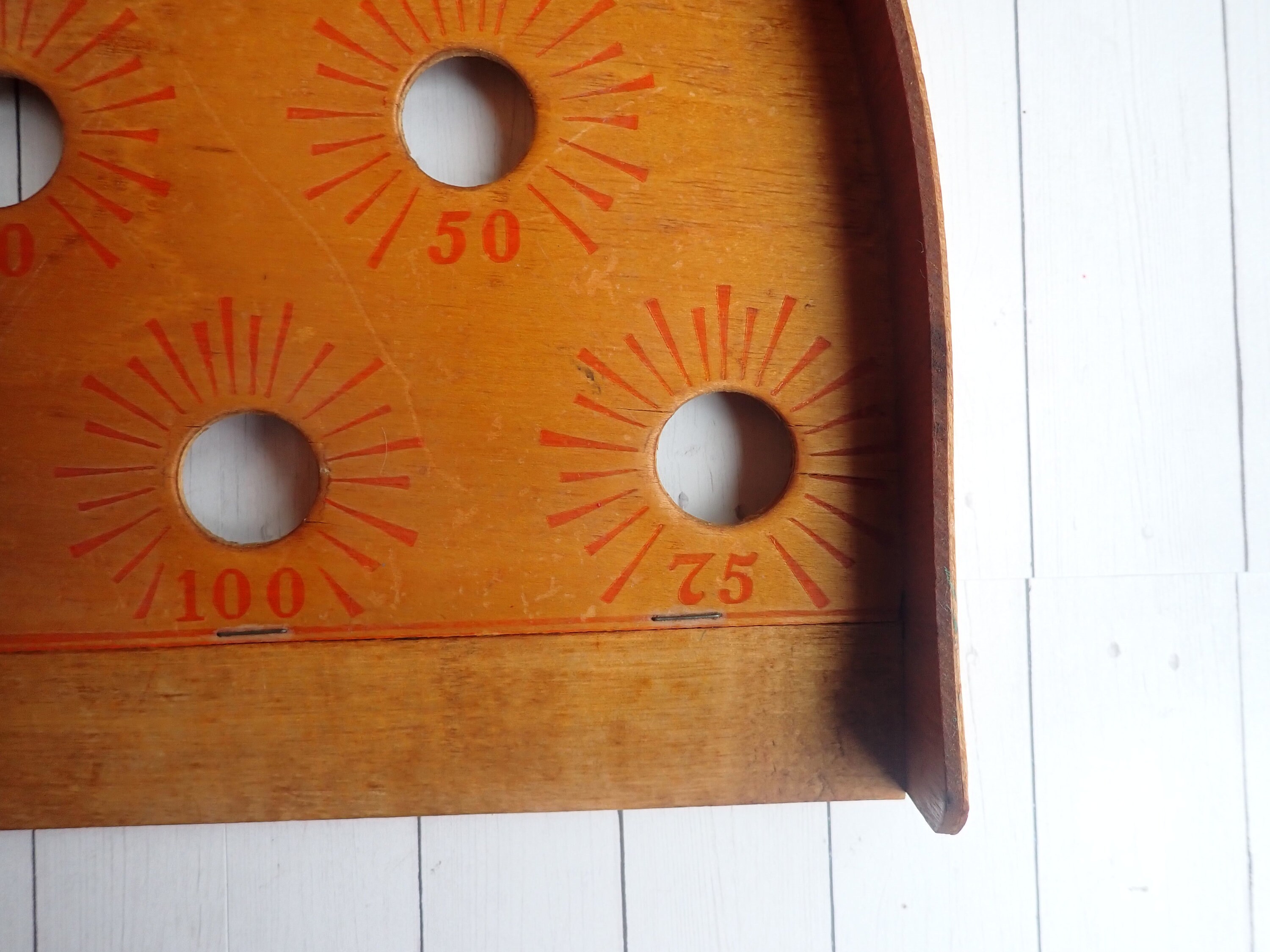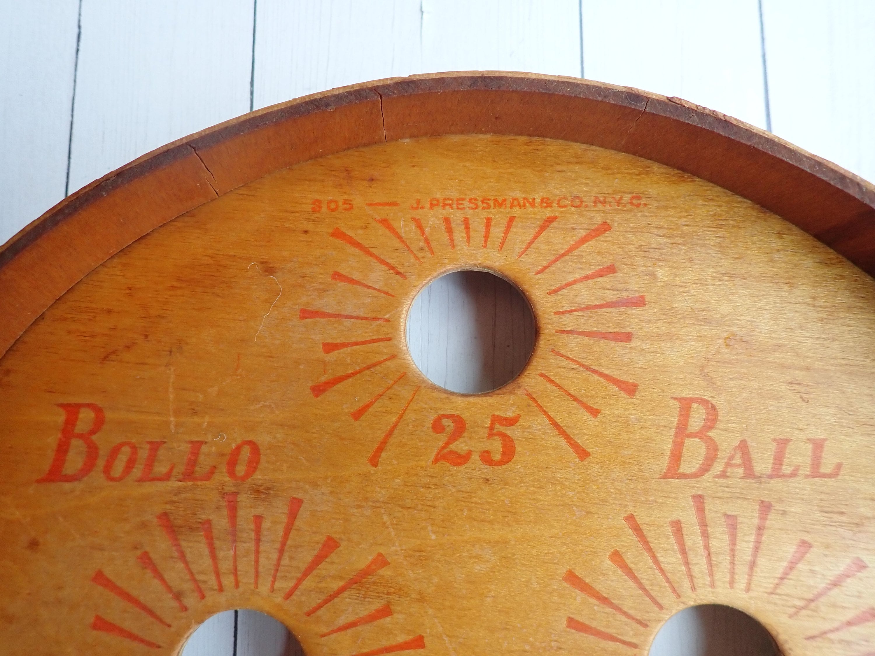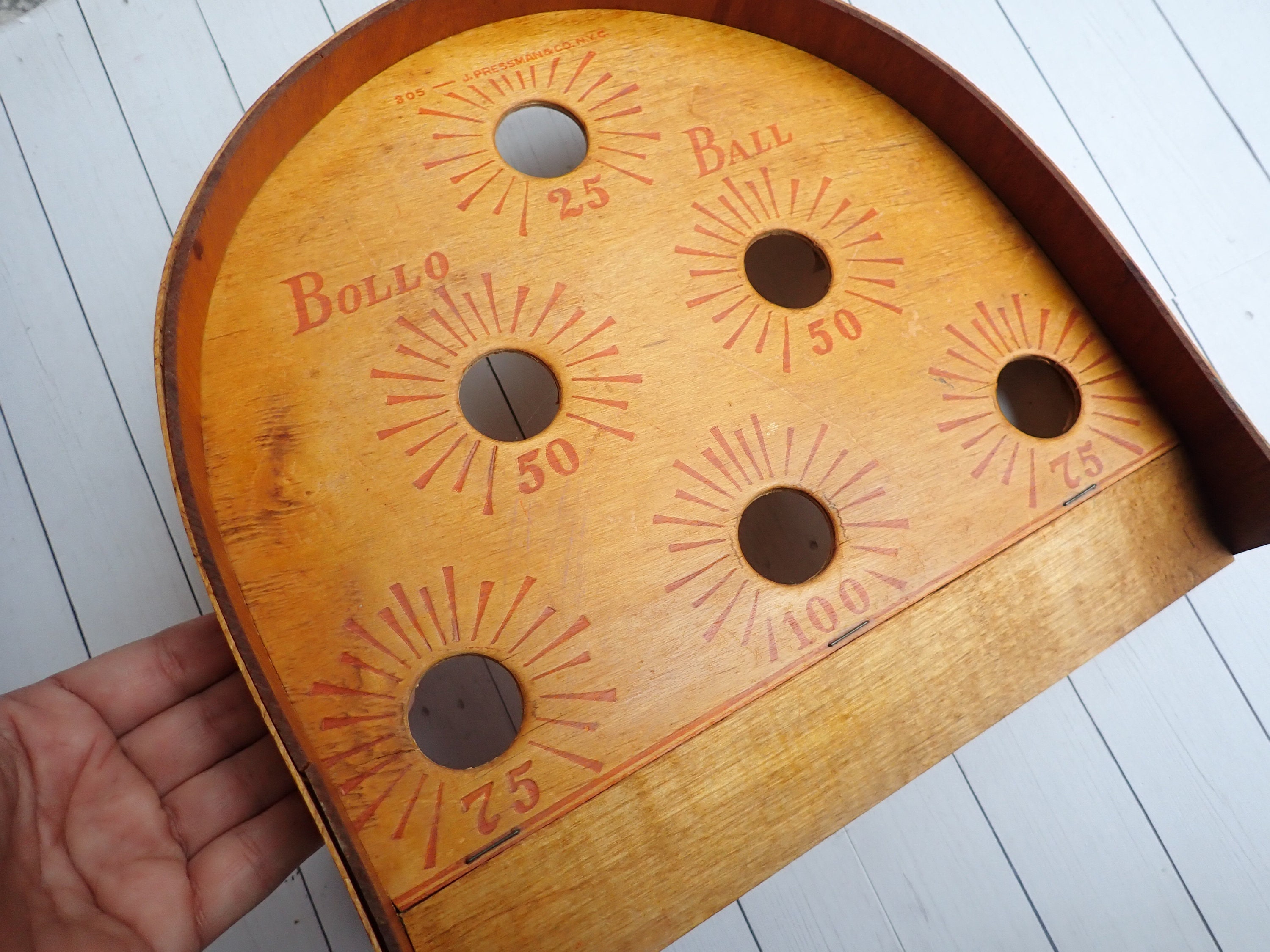 This vintage bollo ball game board is a wooden piece that measures 10.25" wide, 10.25" tall, and 1.5" Deep. It has a rounded top and has 6 holes in the board with different scoring points. The board is marked 305 – J. PRESSMAN & CO. N.Y.C. on the top. This listing is for the board only, there are no balls included.