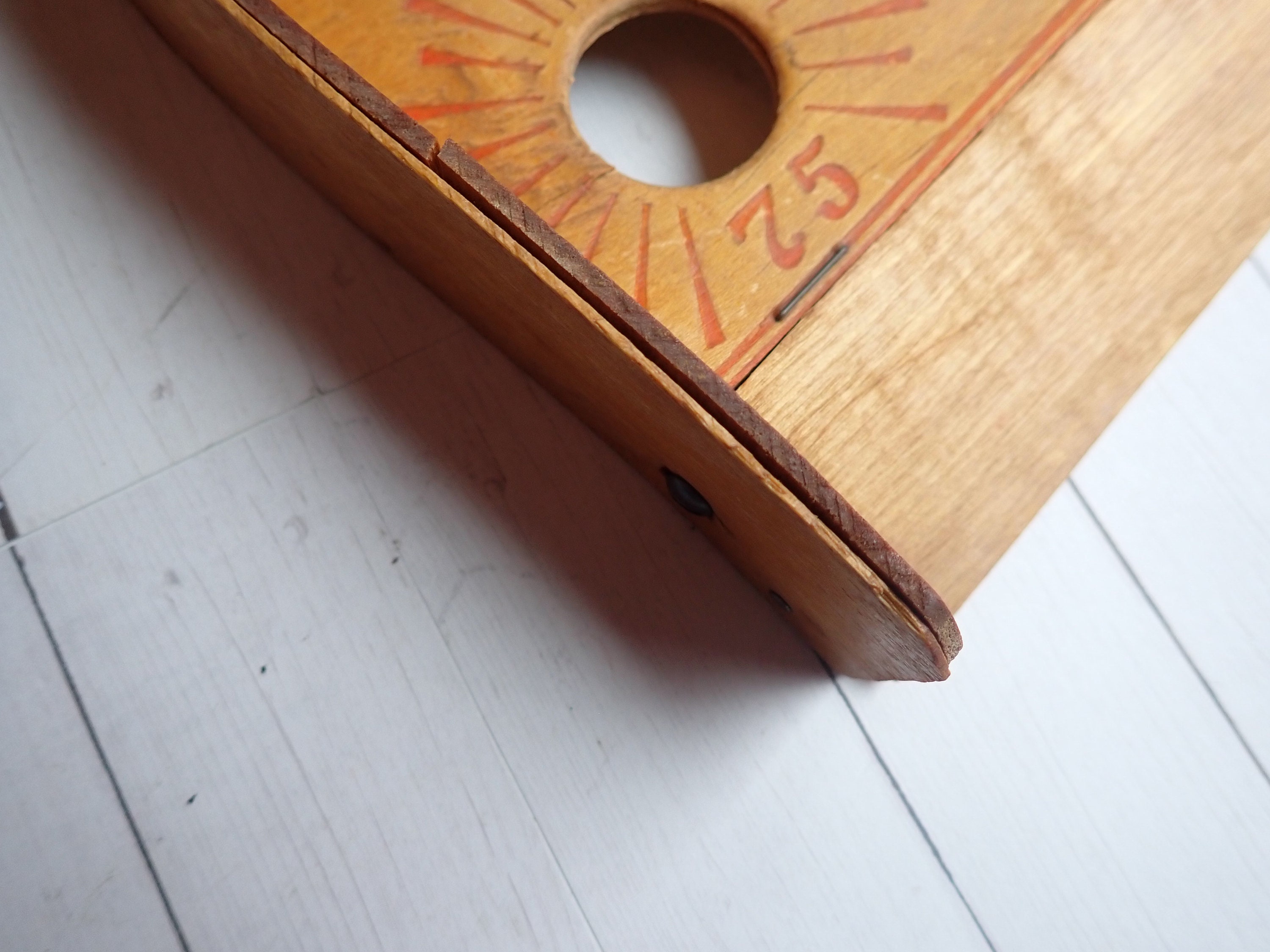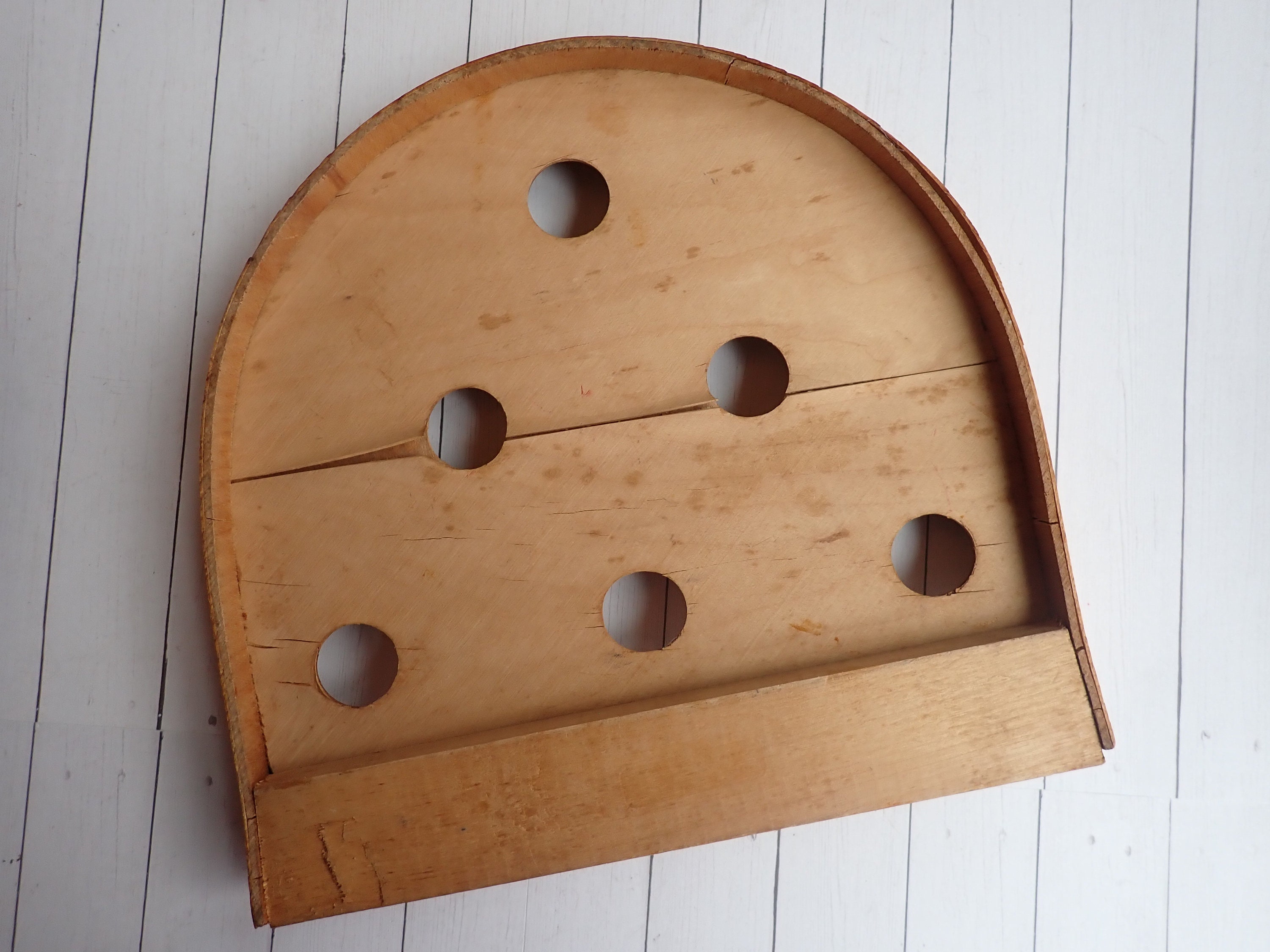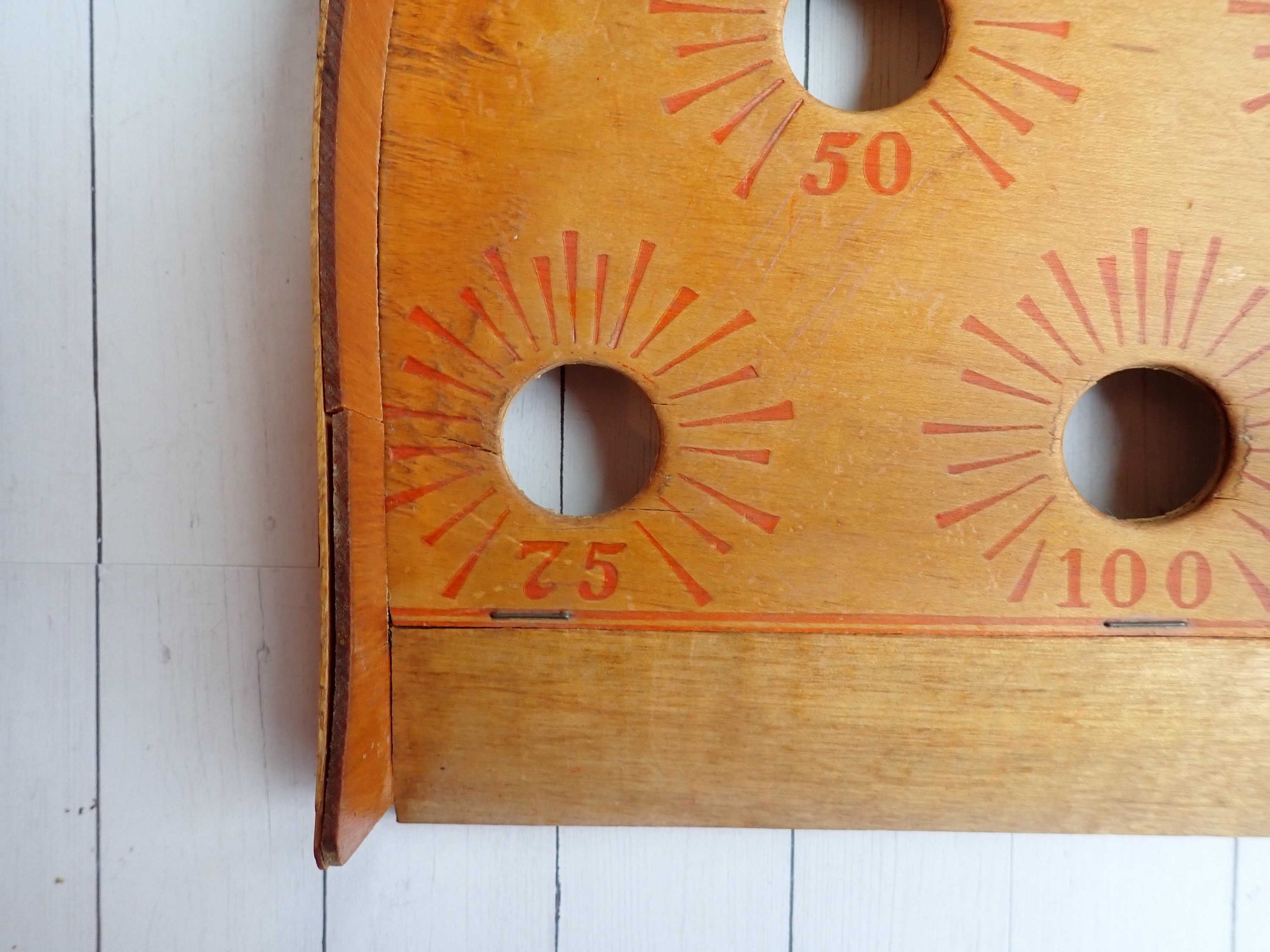 This vintage bollo ball game board is a wooden piece that measures 10.25" wide, 10.25" tall, and 1.5" Deep. It has a rounded top and has 6 holes in the board with different scoring points. The board is marked 305 – J. PRESSMAN & CO. N.Y.C. on the top. This listing is for the board only, there are no balls included.