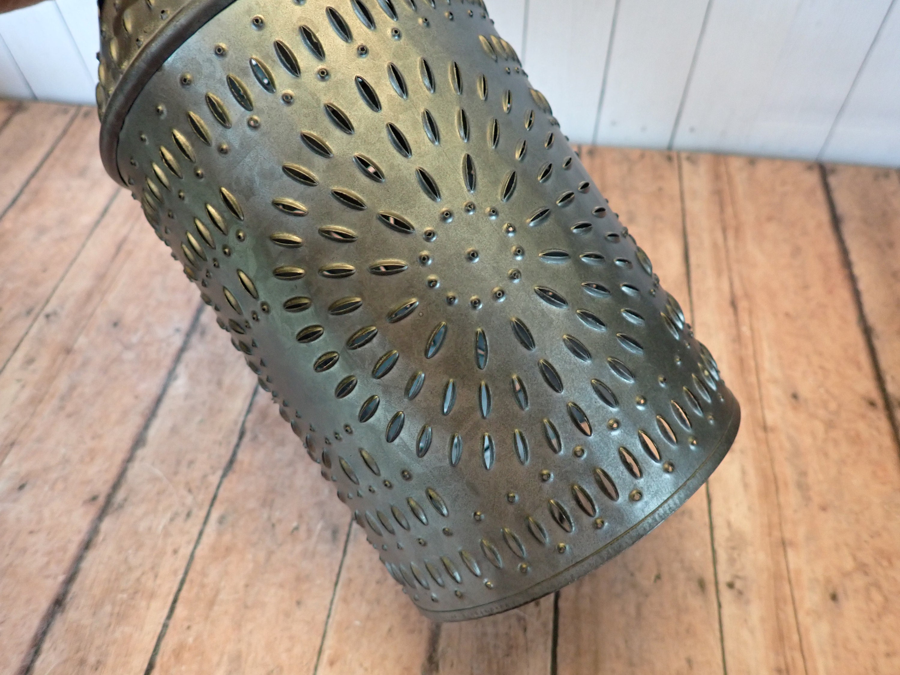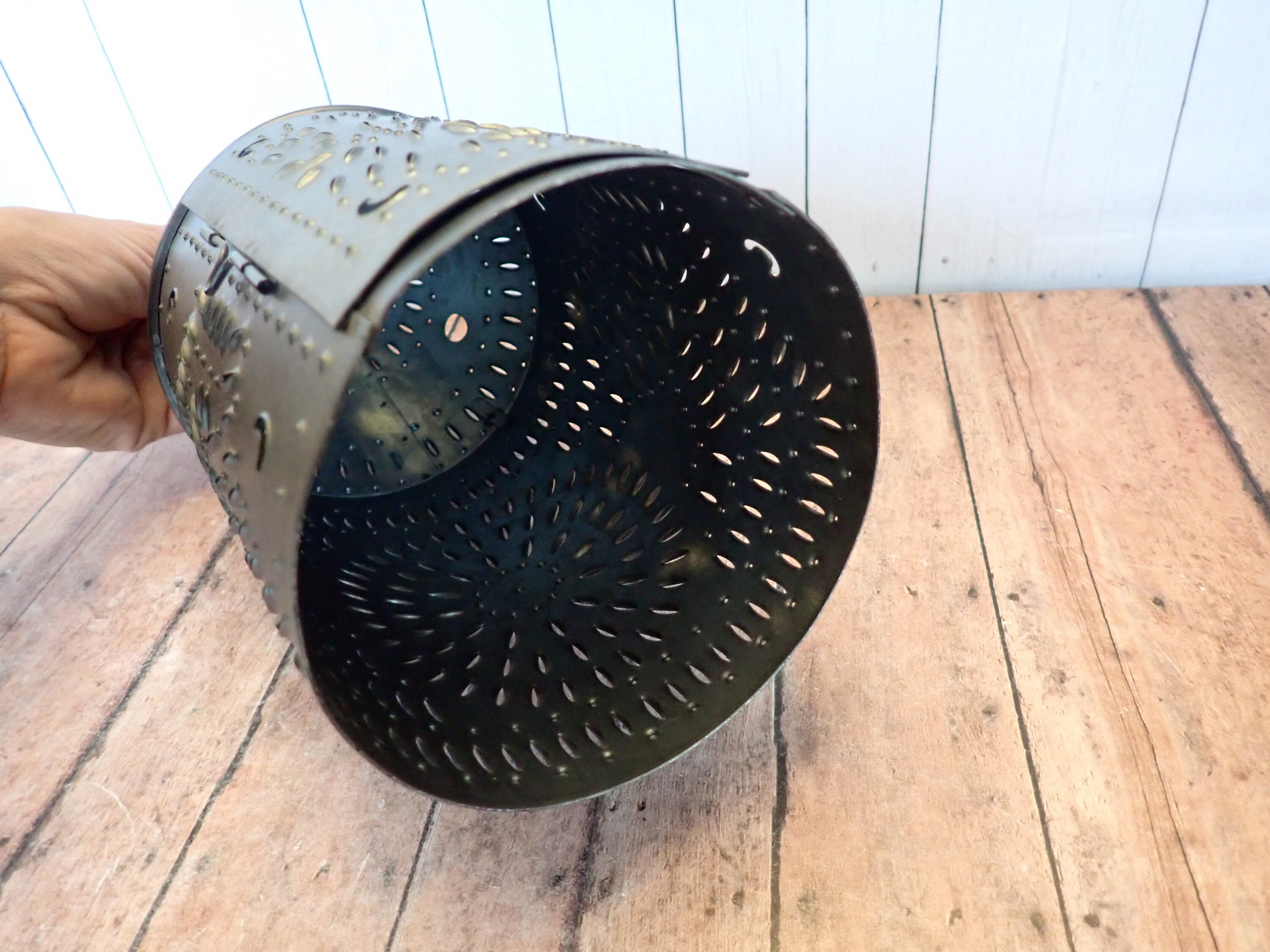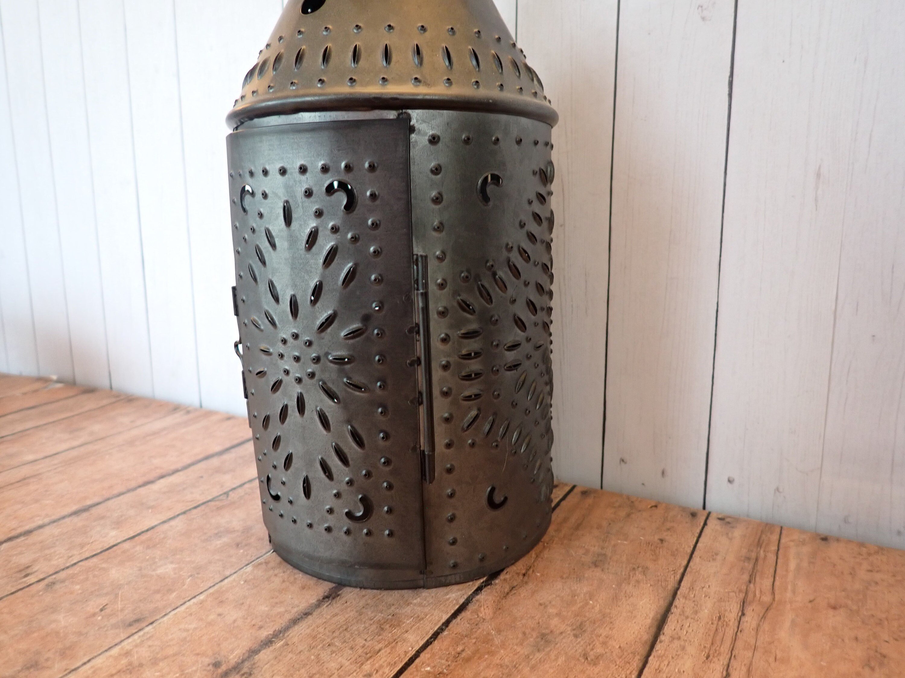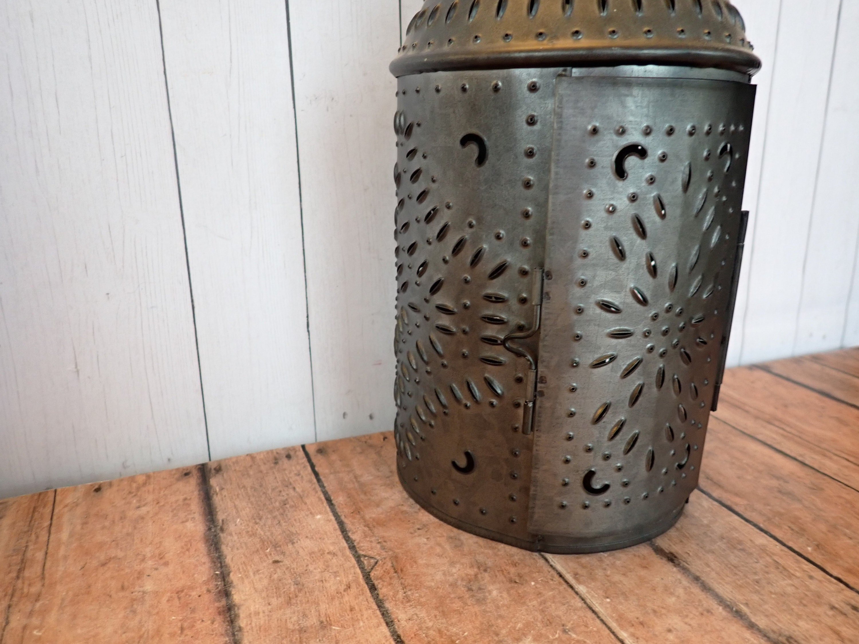 This metal lantern is 10" tall and 4.5" in diameter. It is a silver metal and is a round lantern with a punched tin pattern. There is one opening with a hinged door, and the bottom of the lantern is open to place over a candle. The top of the lantern has a metal ring hanger.