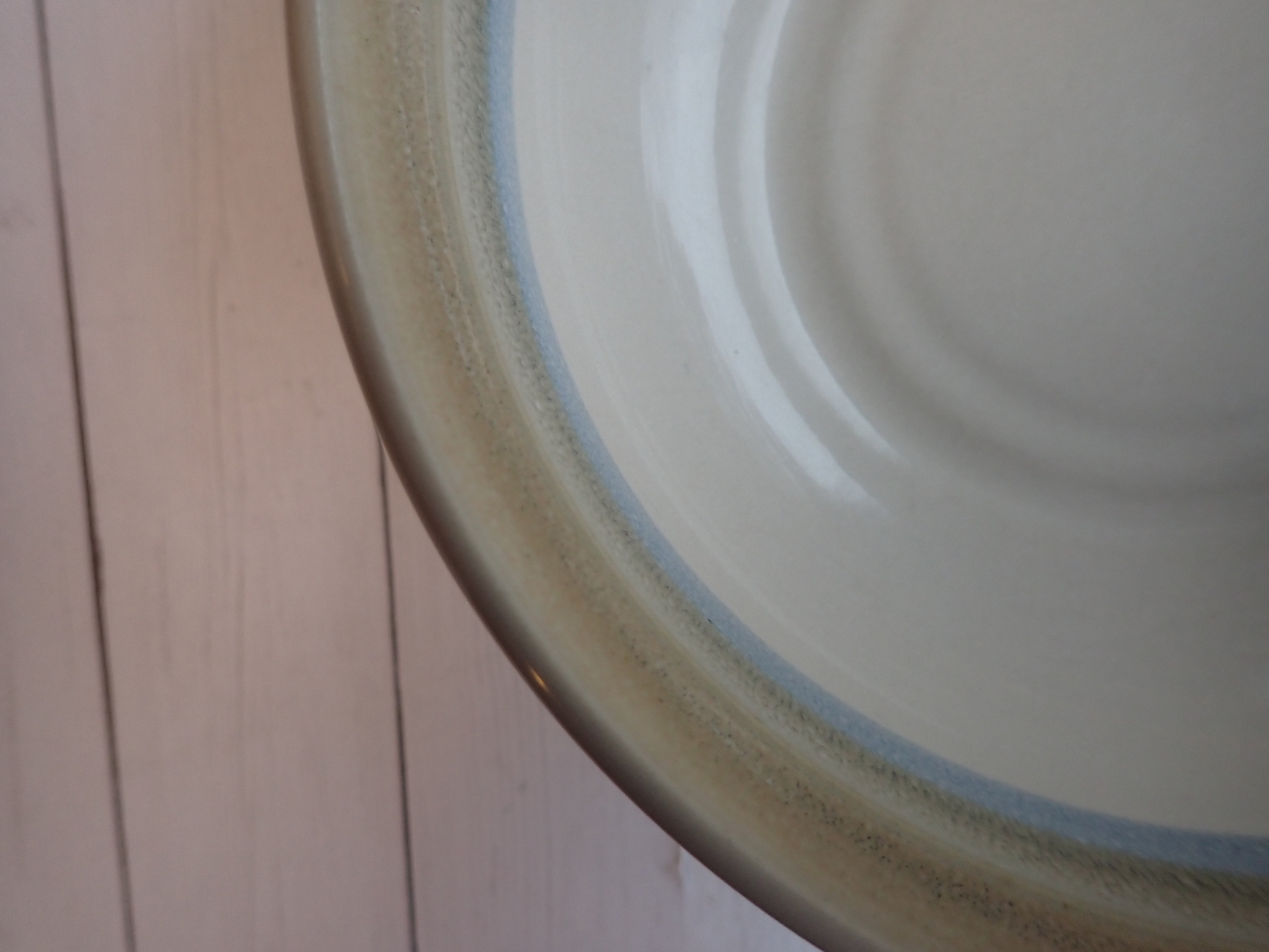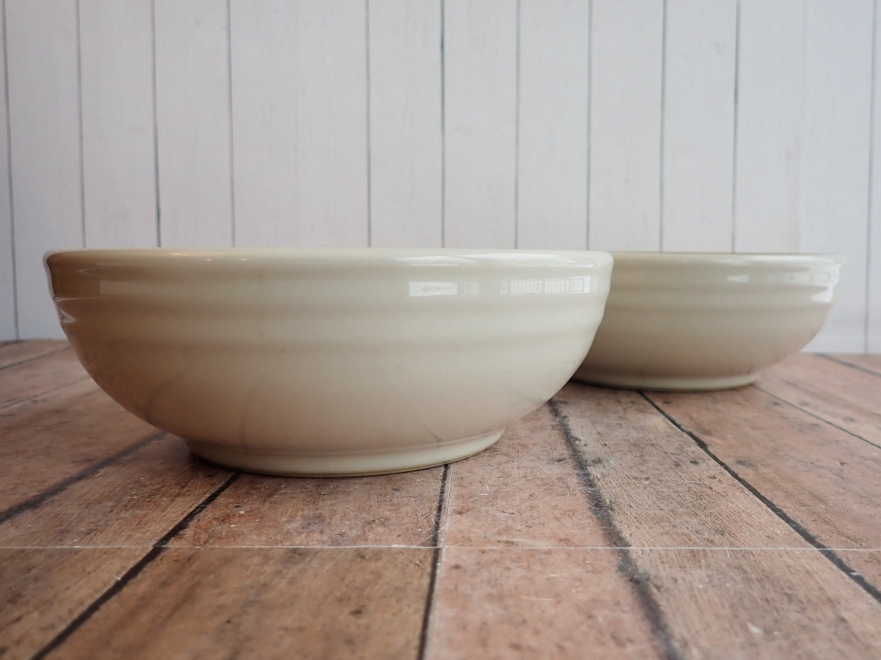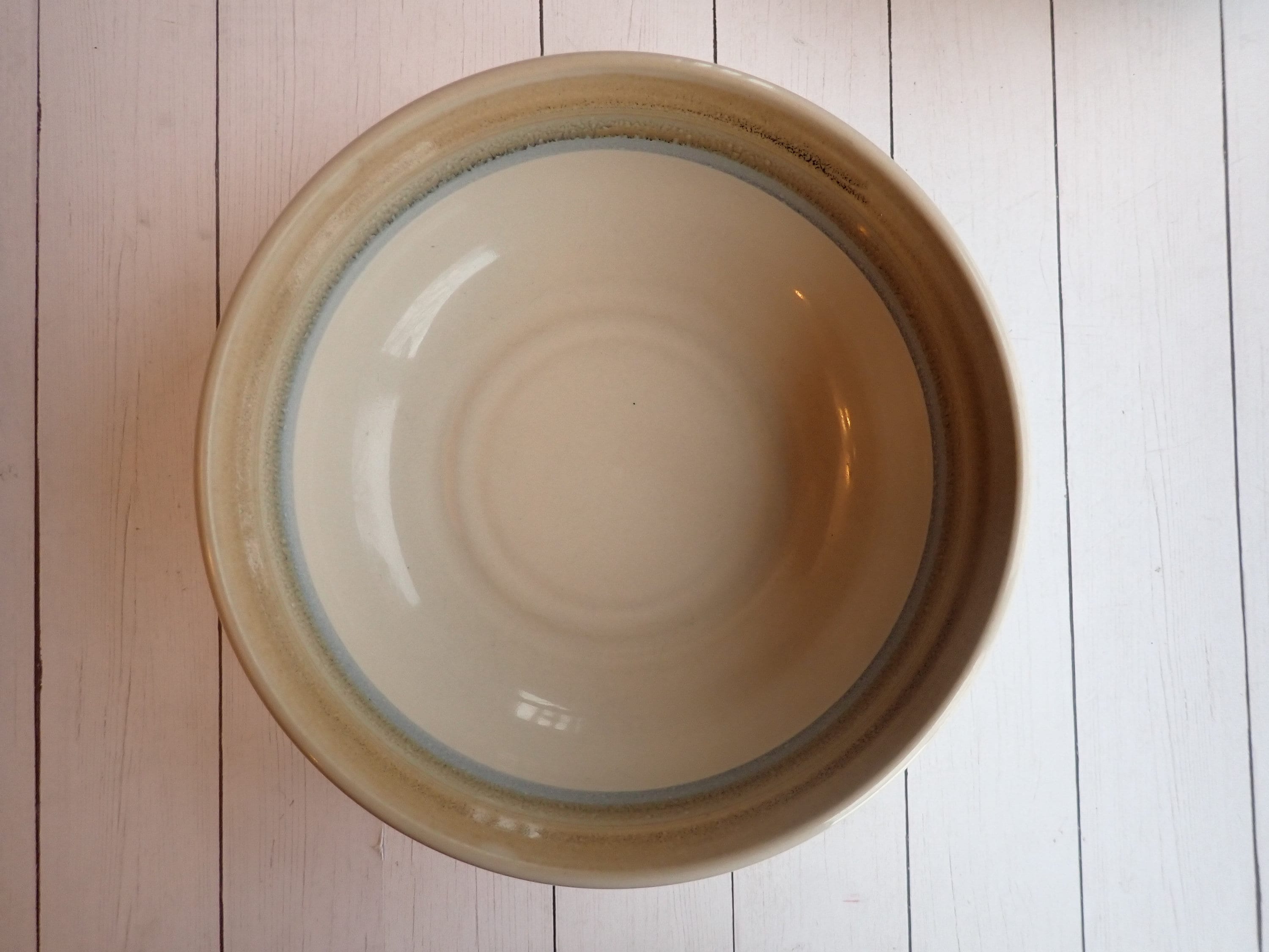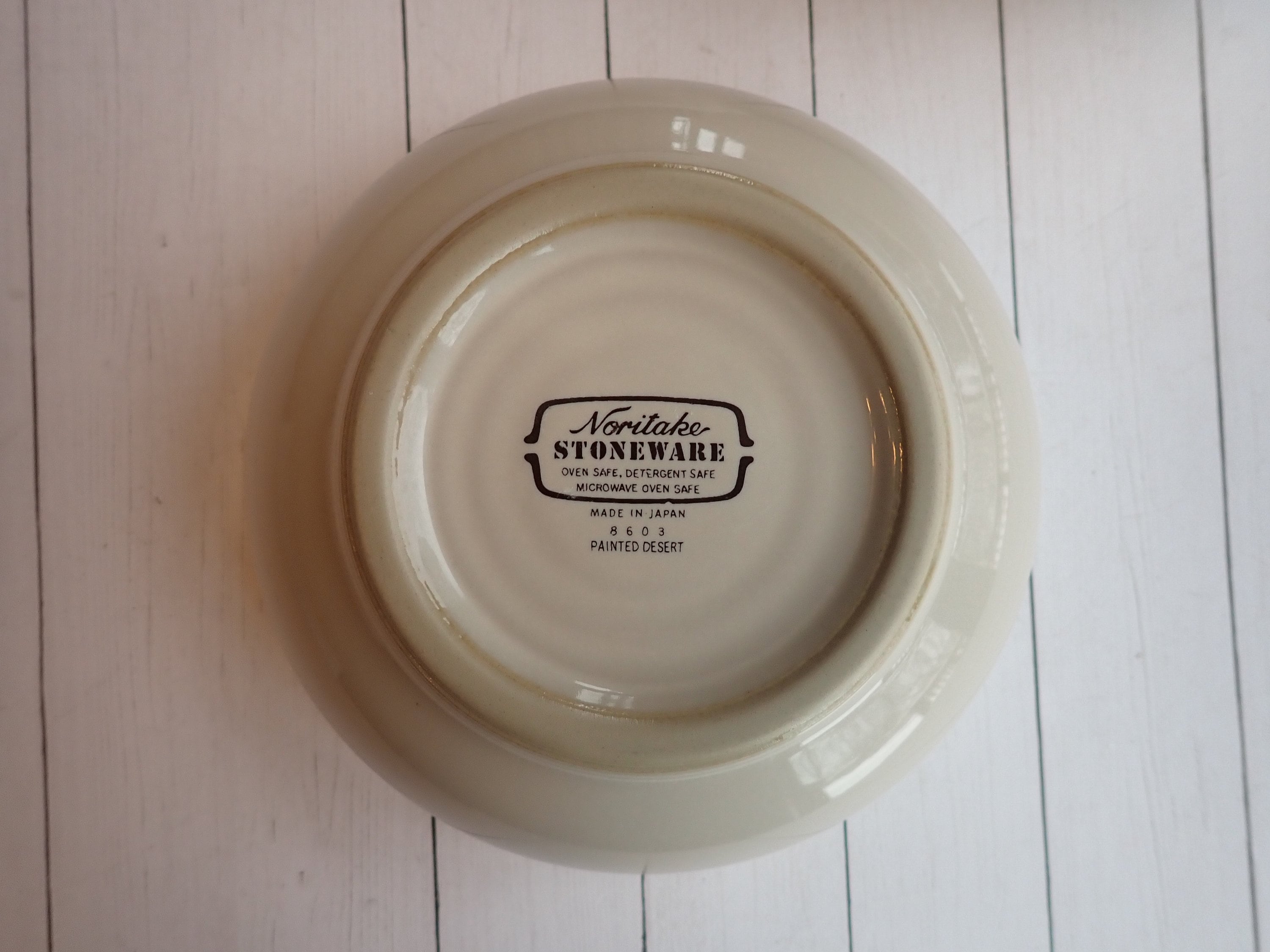 This set of 2 stoneware bowls by Noritake are in the Painted Desert pattern. These are the cereal bowls and are 6.5" in diameter and 2.5" high. They are a light tan or beige stoneware with a darker tan and blue band around the rim. The bottoms are marked NORITAKE / STONEWARE / OVEN SAFE DETERGENT SAFE / MICROWAVE OVEN SAFE / MADE IN JAPAN / 8603/ PAINTED DESERT. Both bowls are in very good condition with no chips or cracks. There are some light surface scratches from use.