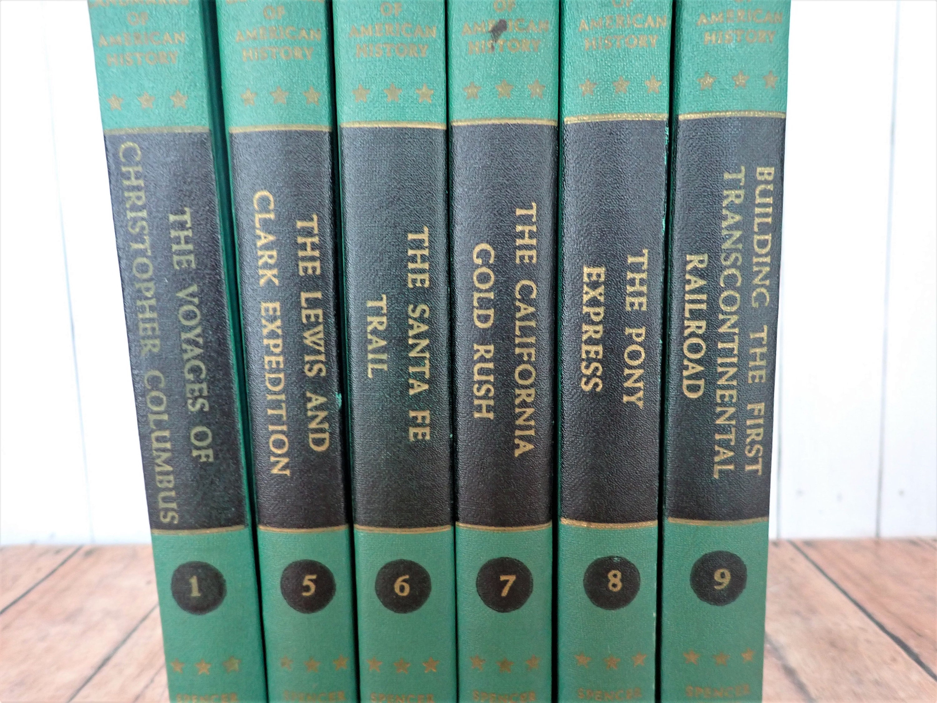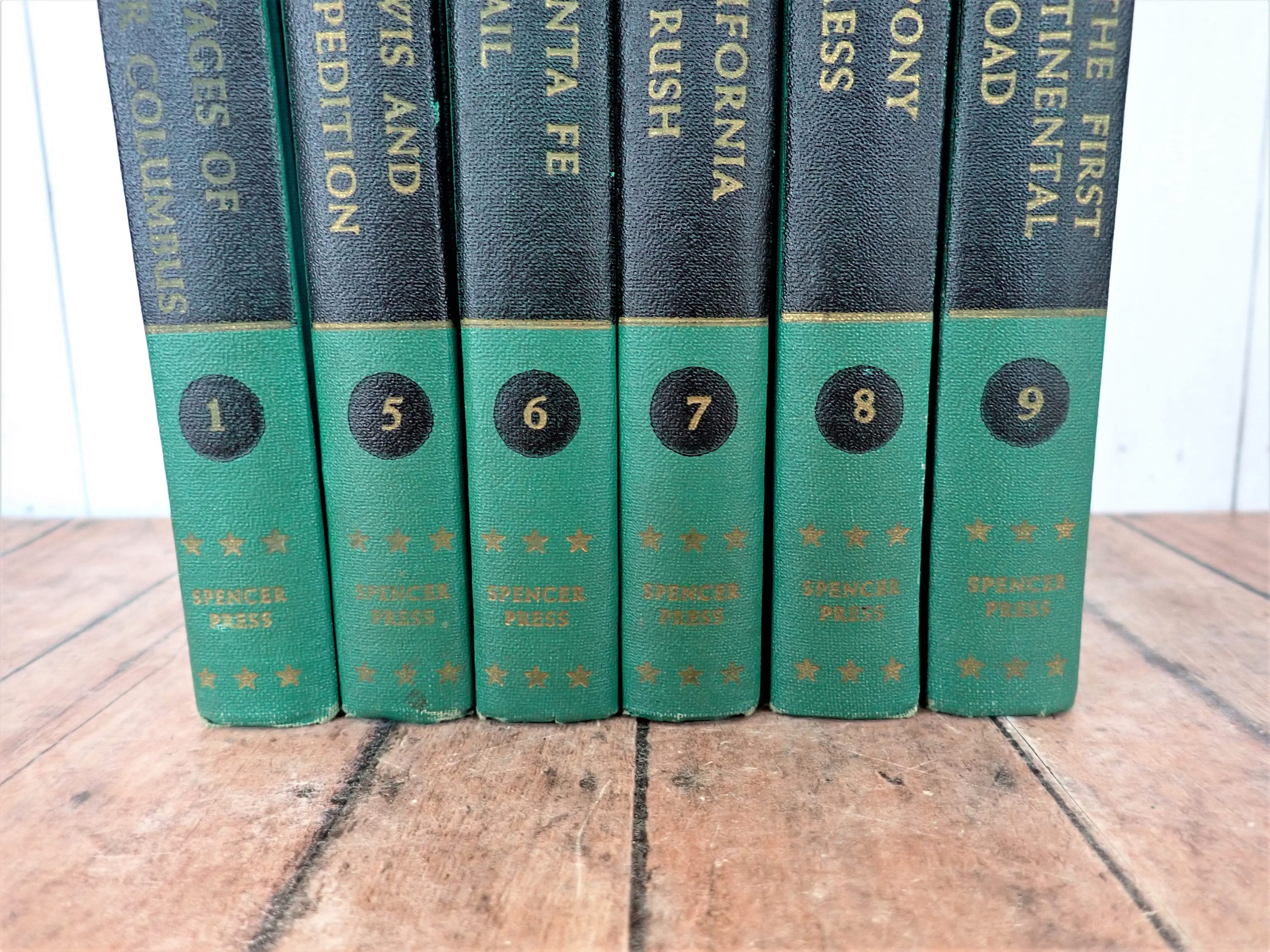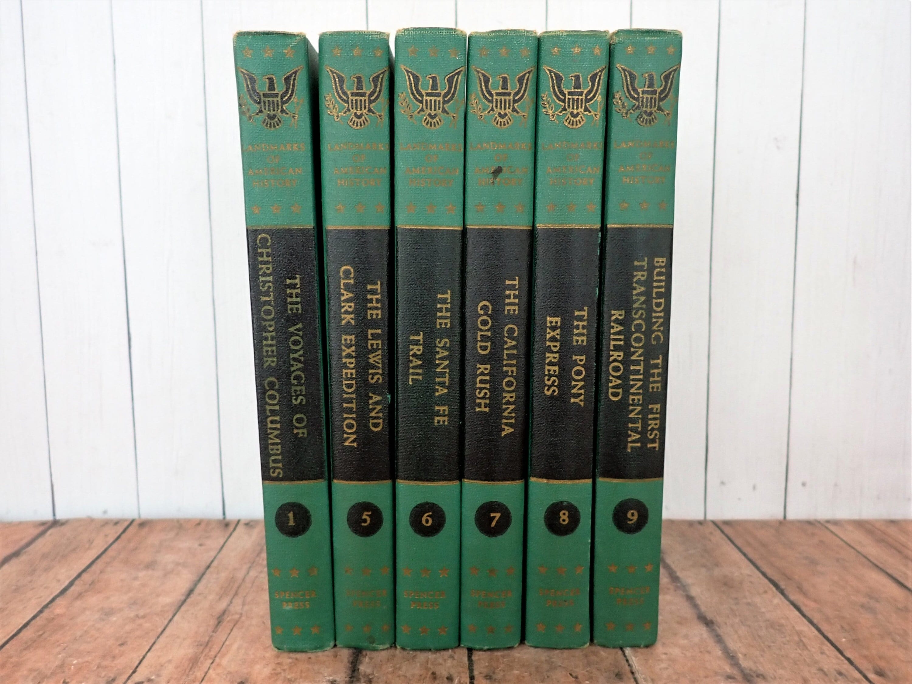 This set of books includes 6 books from the 1951 publication of Landmarks of American History by Spencer Press. This set includes 6 of the 10 original books in the set - Books 1, 5, 6, 7, 8, and 9. (Books 2, 3, 4, and 10 are missing.) The books are each 8.5" tall, 5.5" deep, and about 1" thick. They have a green and black binding with gold letters and an eagle design on the binding edge.