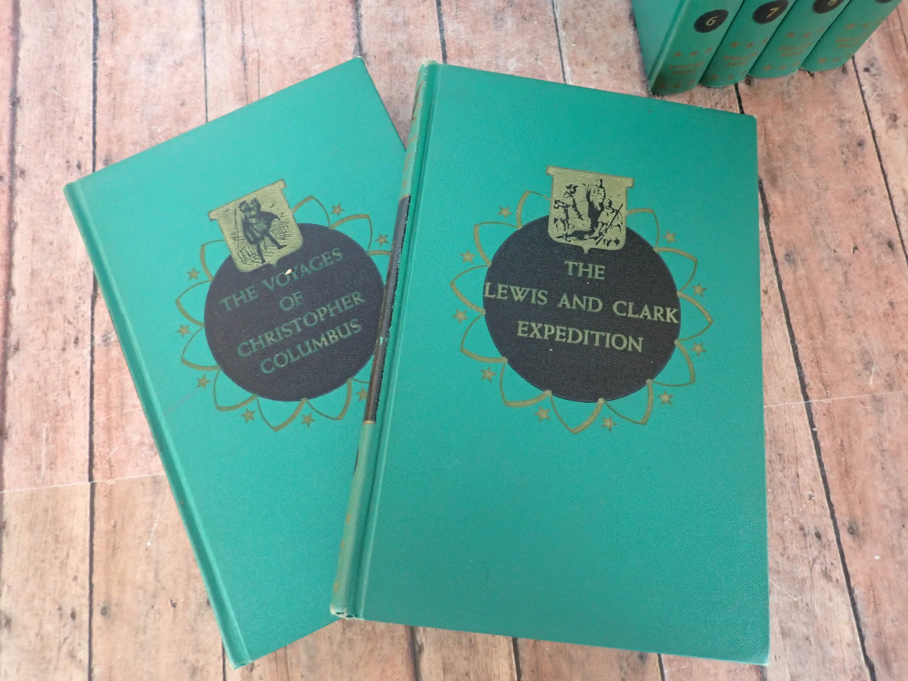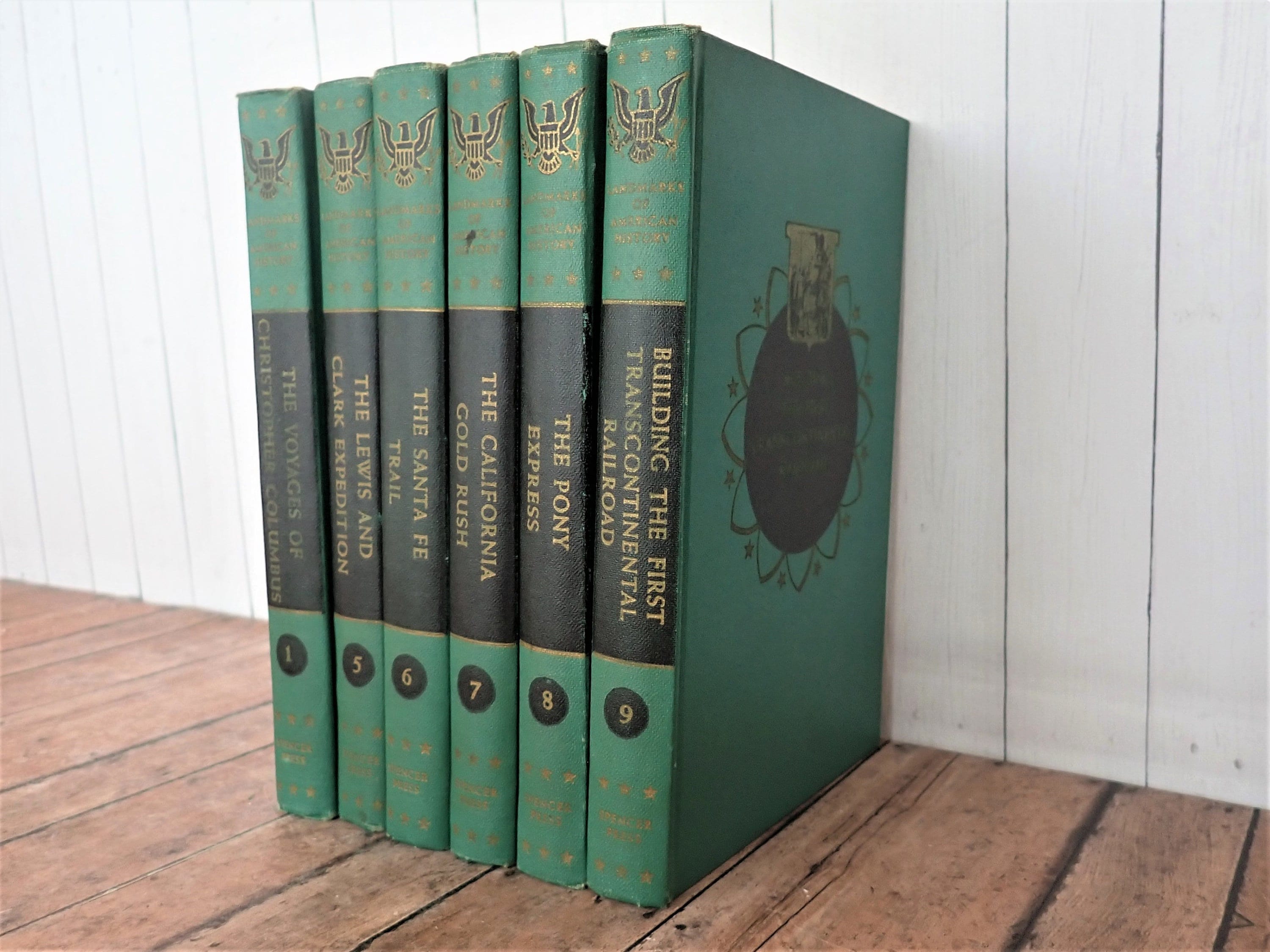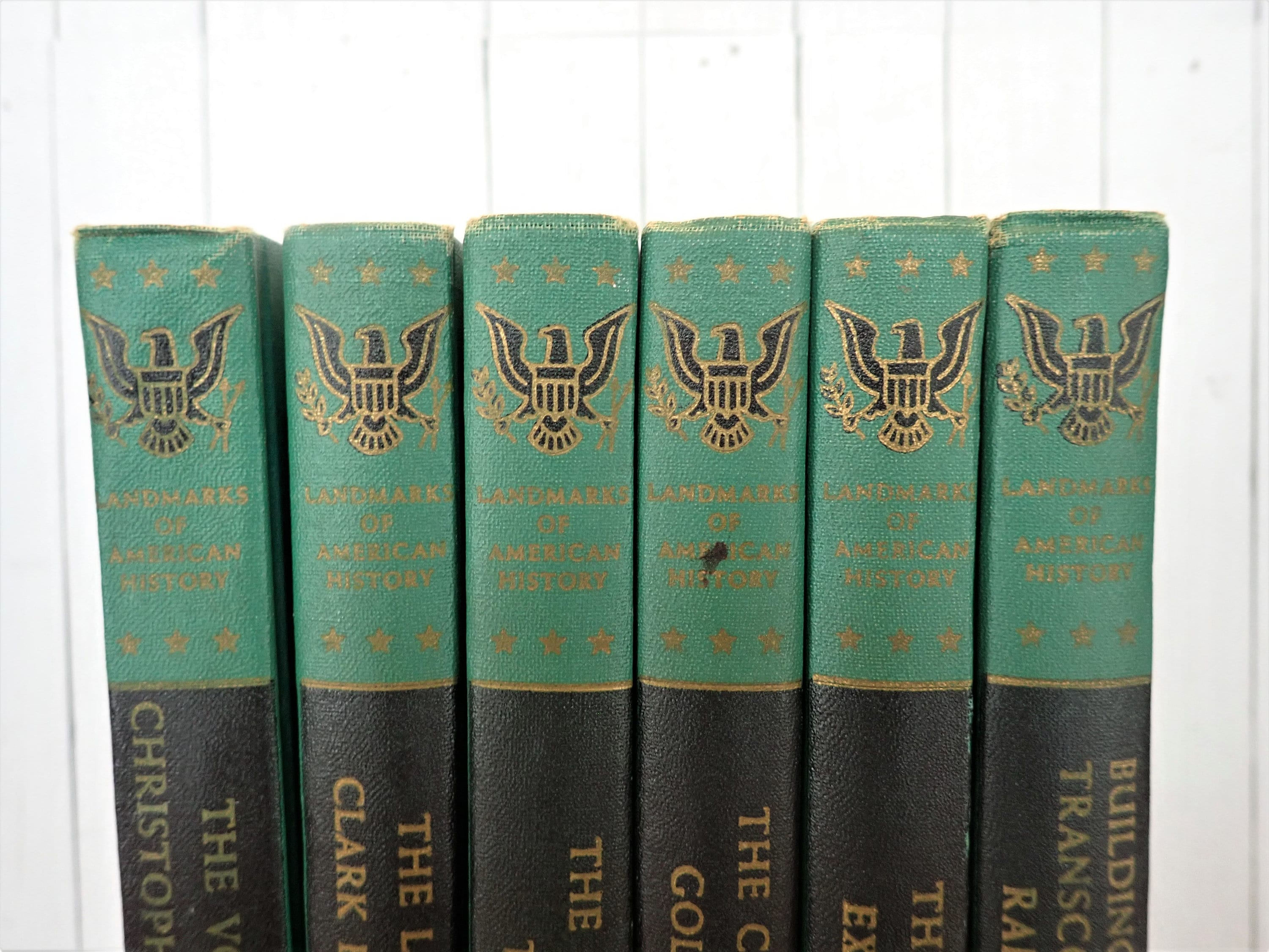 This set of books includes 6 books from the 1951 publication of Landmarks of American History by Spencer Press. This set includes 6 of the 10 original books in the set - Books 1, 5, 6, 7, 8, and 9. (Books 2, 3, 4, and 10 are missing.) The books are each 8.5" tall, 5.5" deep, and about 1" thick. They have a green and black binding with gold letters and an eagle design on the binding edge.