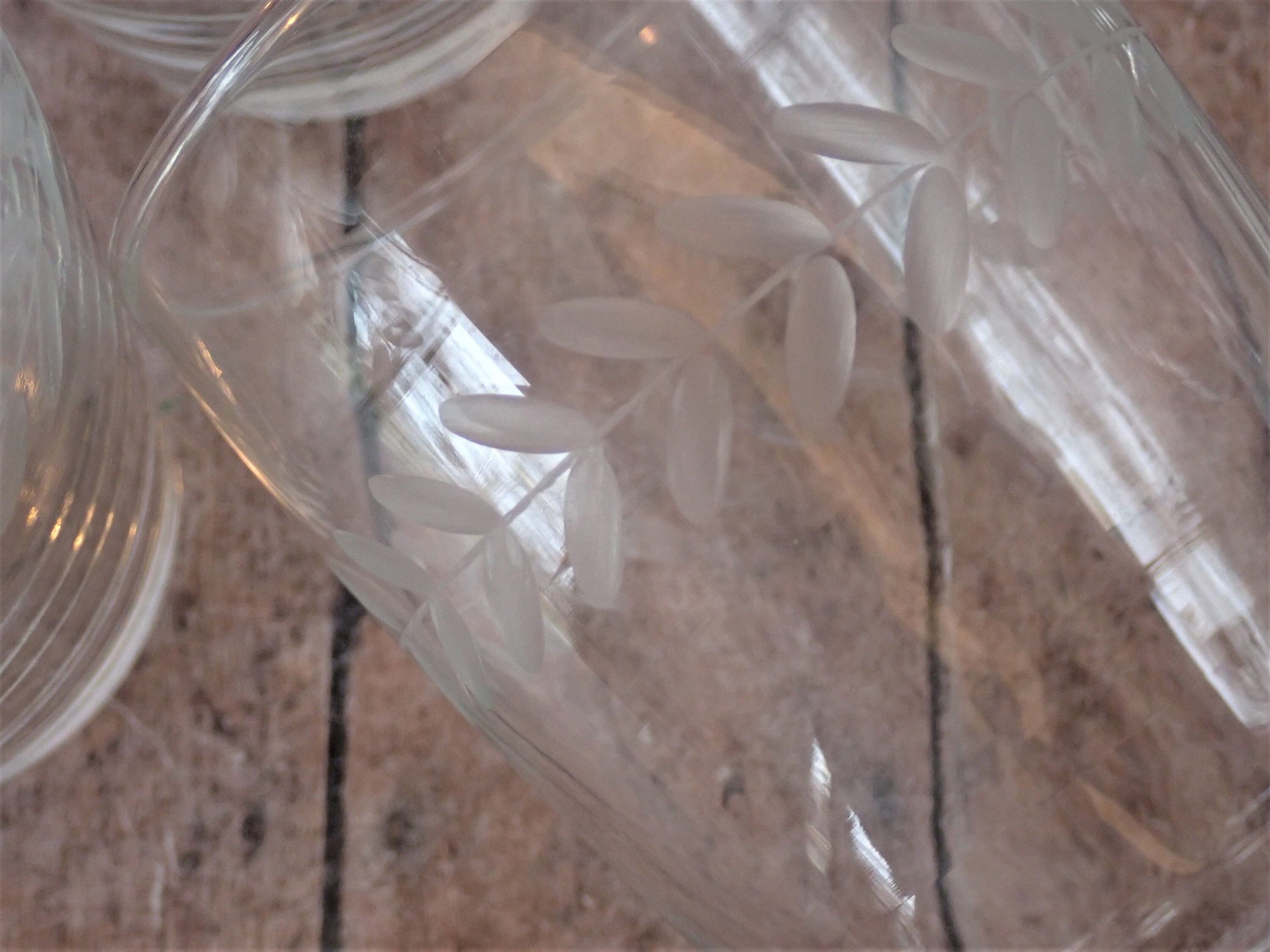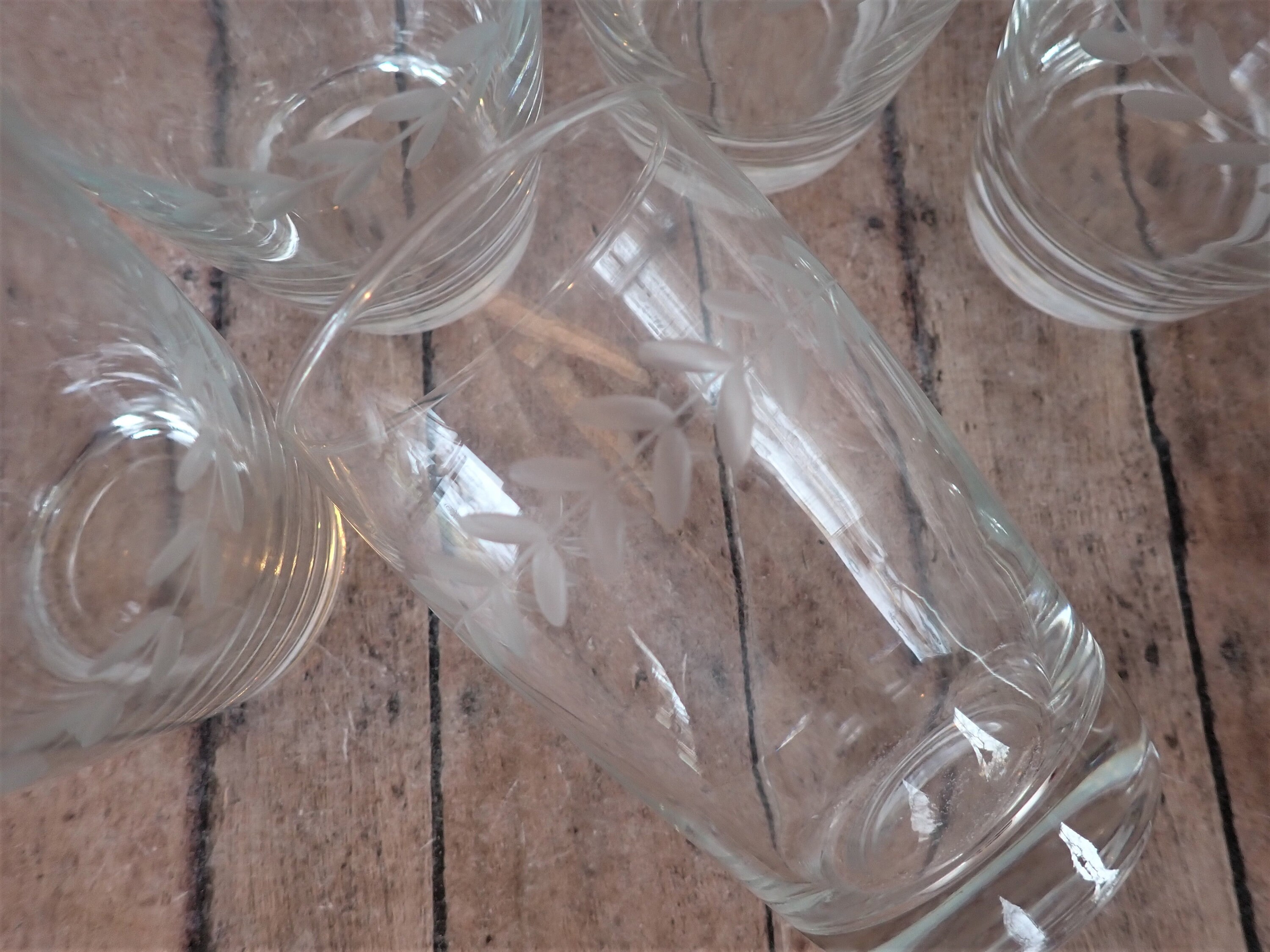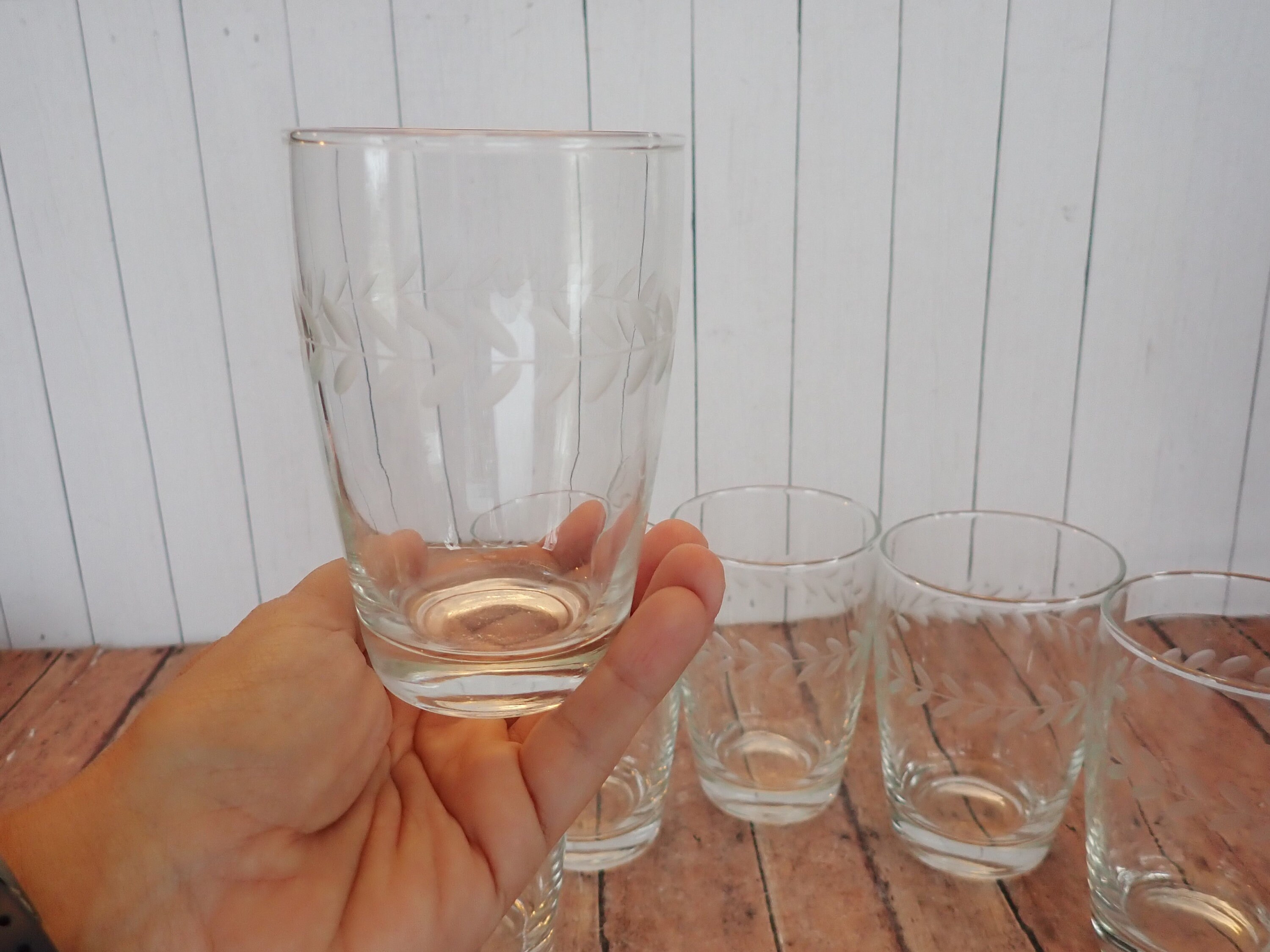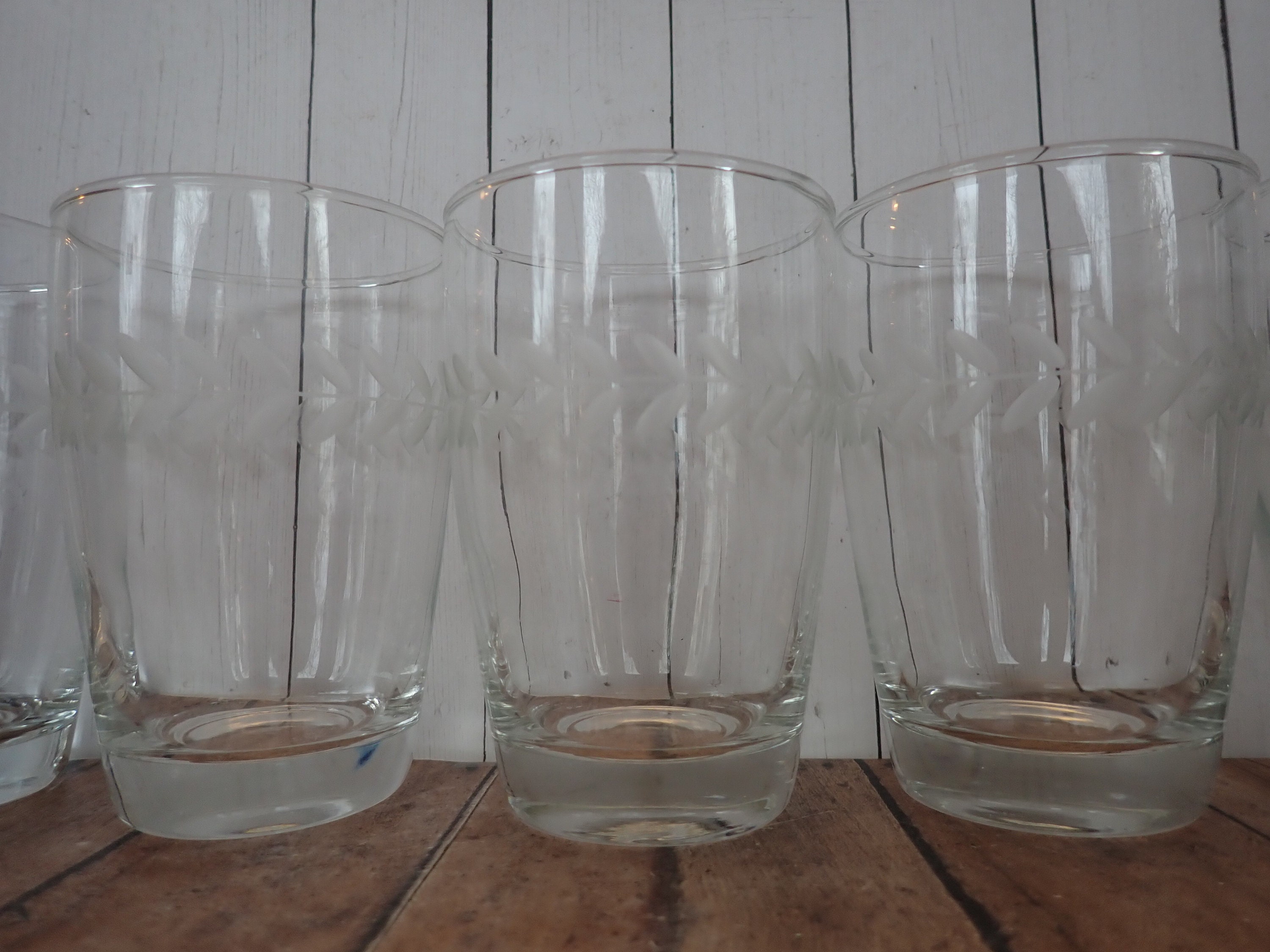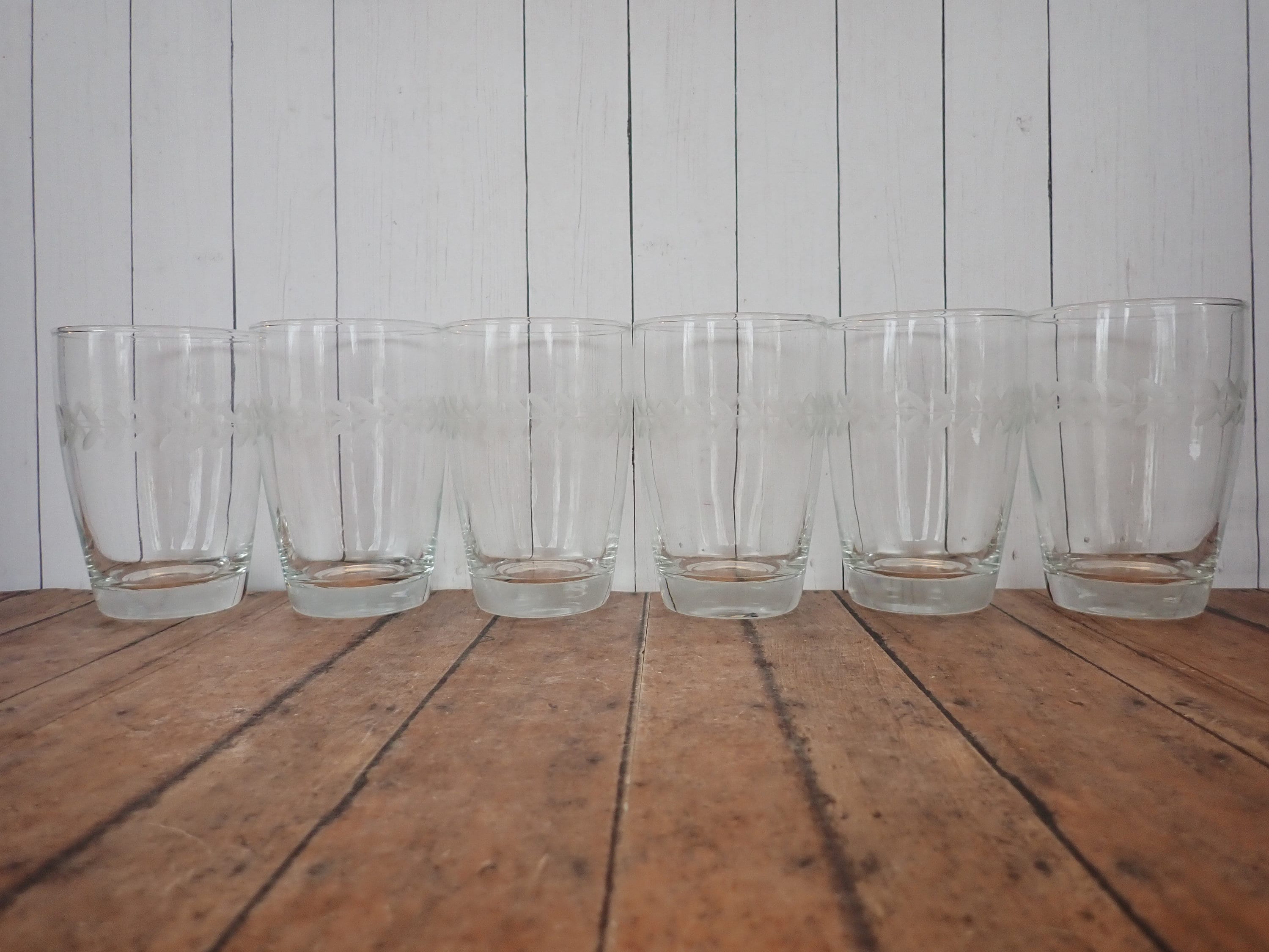 This set of Anchor Hocking Laurel tumblers includes six of the 10 oz. footed tumblers. They each measure 4.5" tall and 3" in diameter at the top. These clear glasses feature a sleek and simple design with a horizontal band of etched leaves around the glass. They are the Gray Cut style, not the Polished Cut, which gives the leaves a light matte gray color. The glasses can hold 10 oz. filled to the rim. All 6 glasses are in very good condition with no chips or cracks.