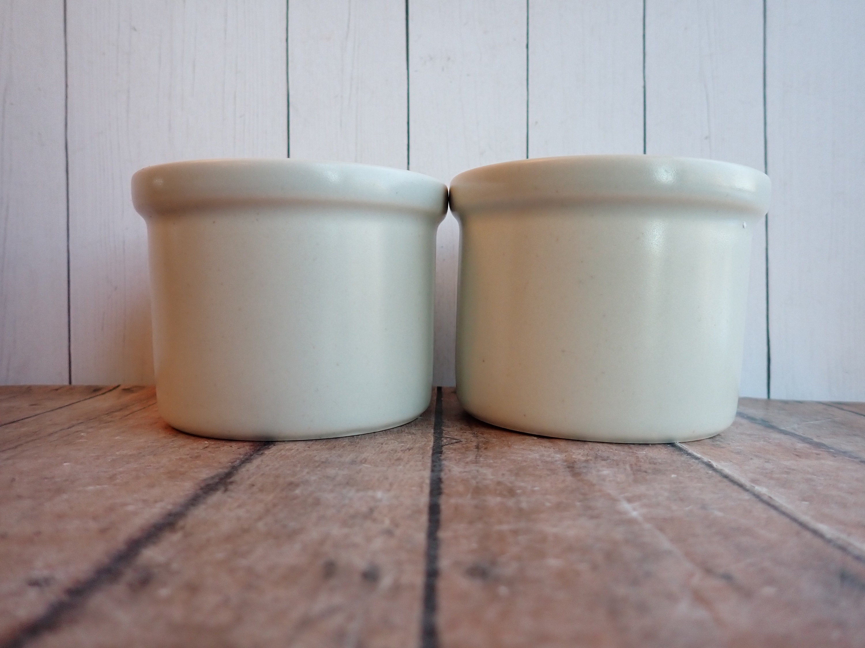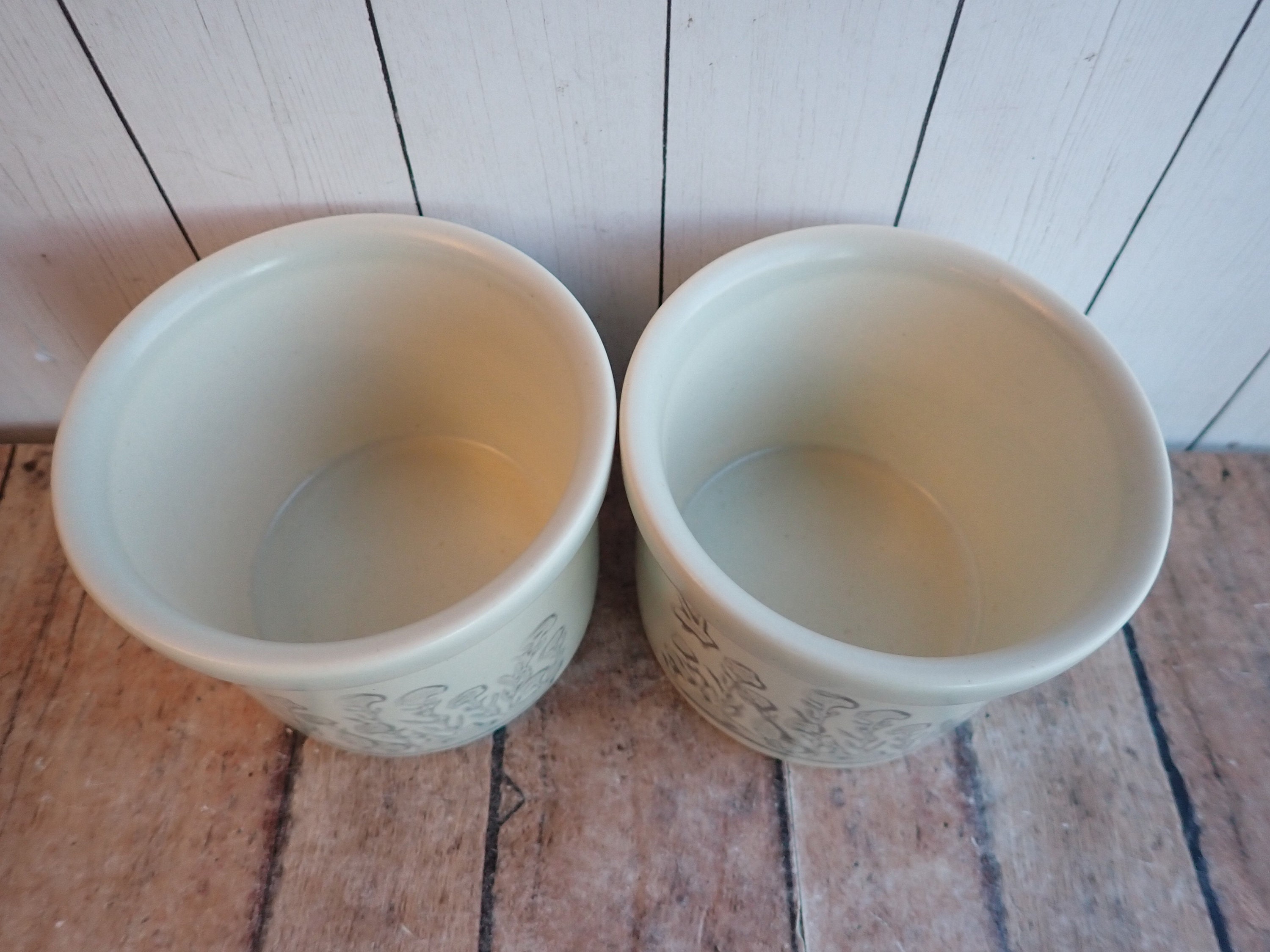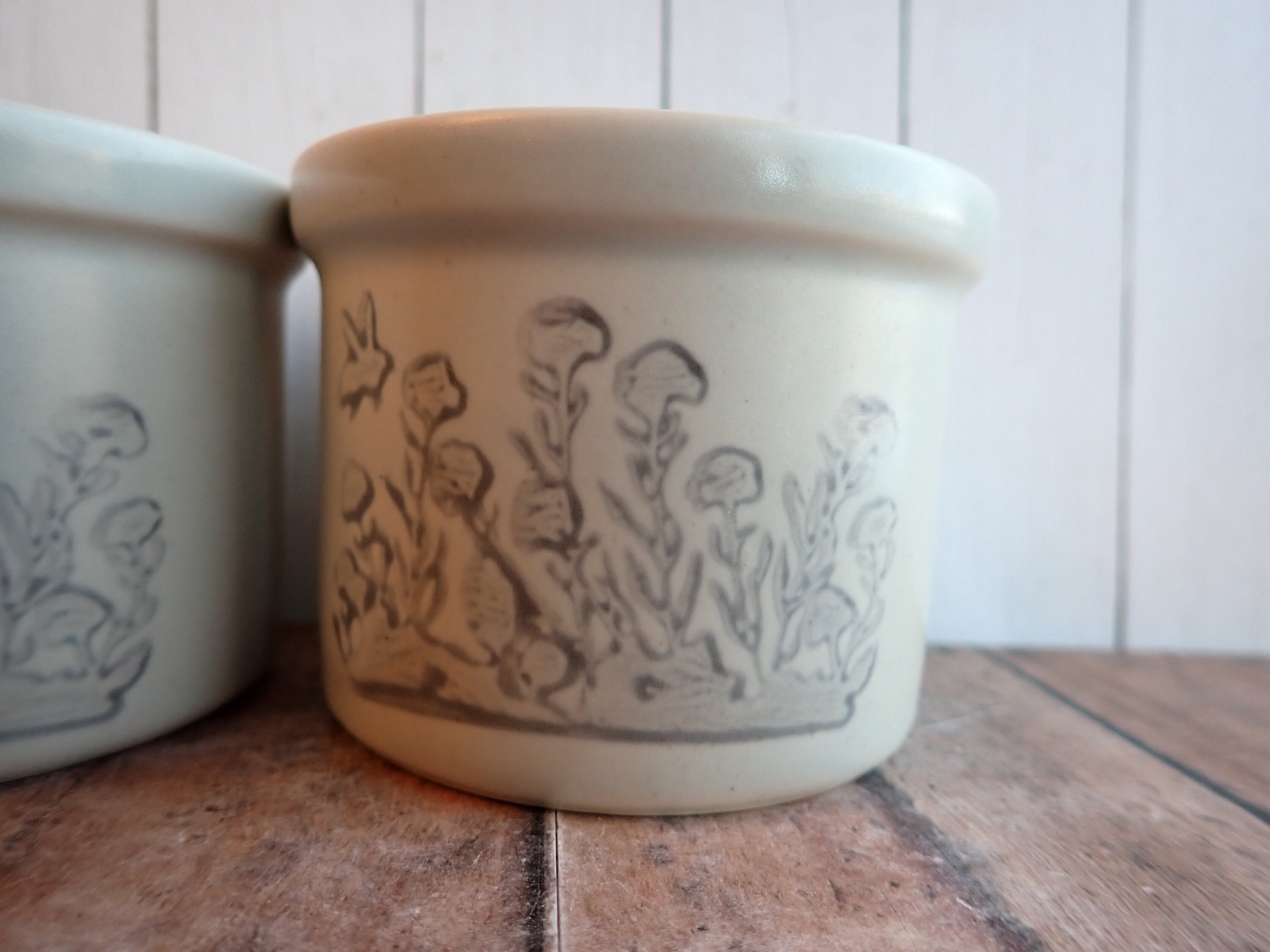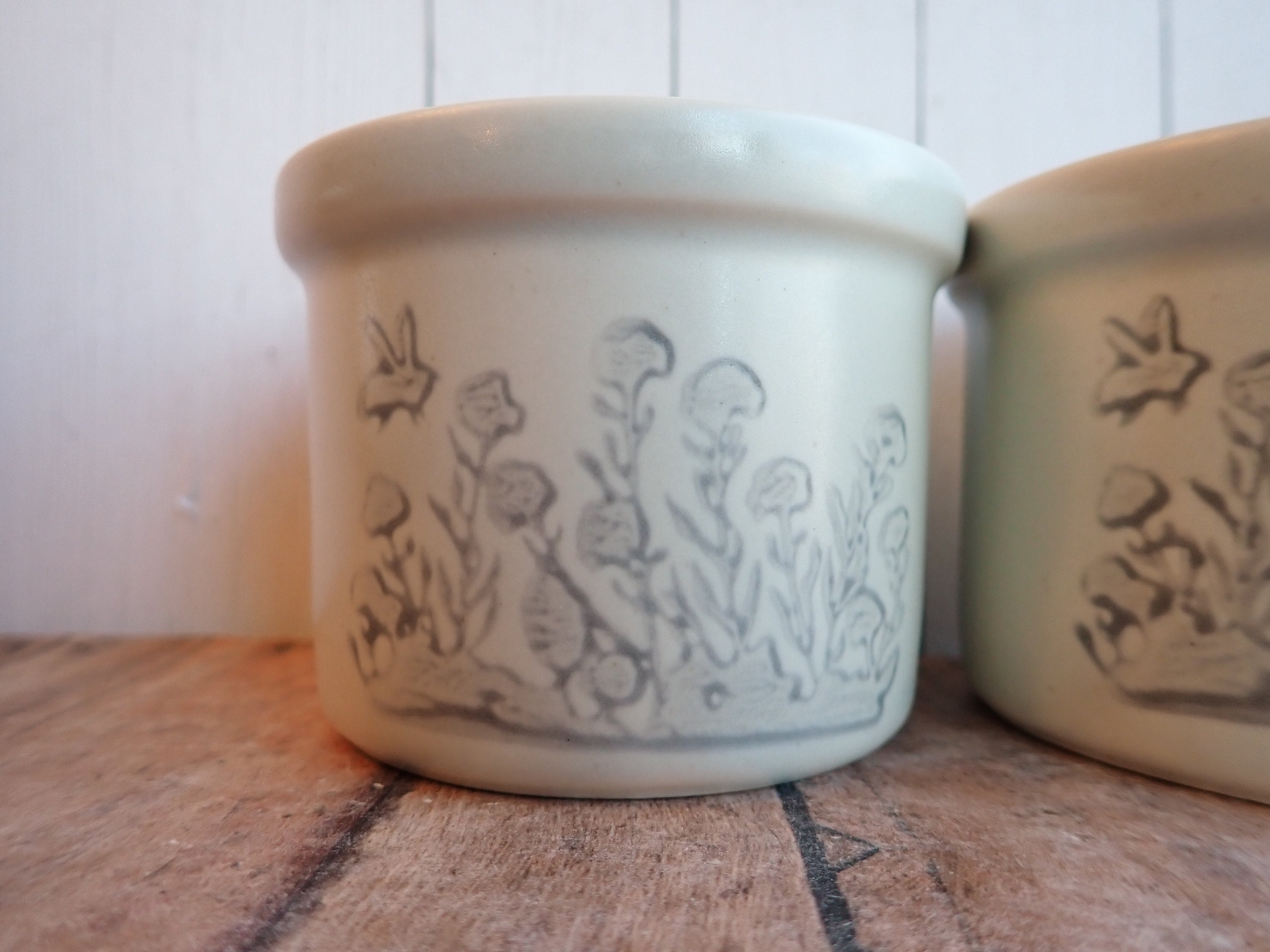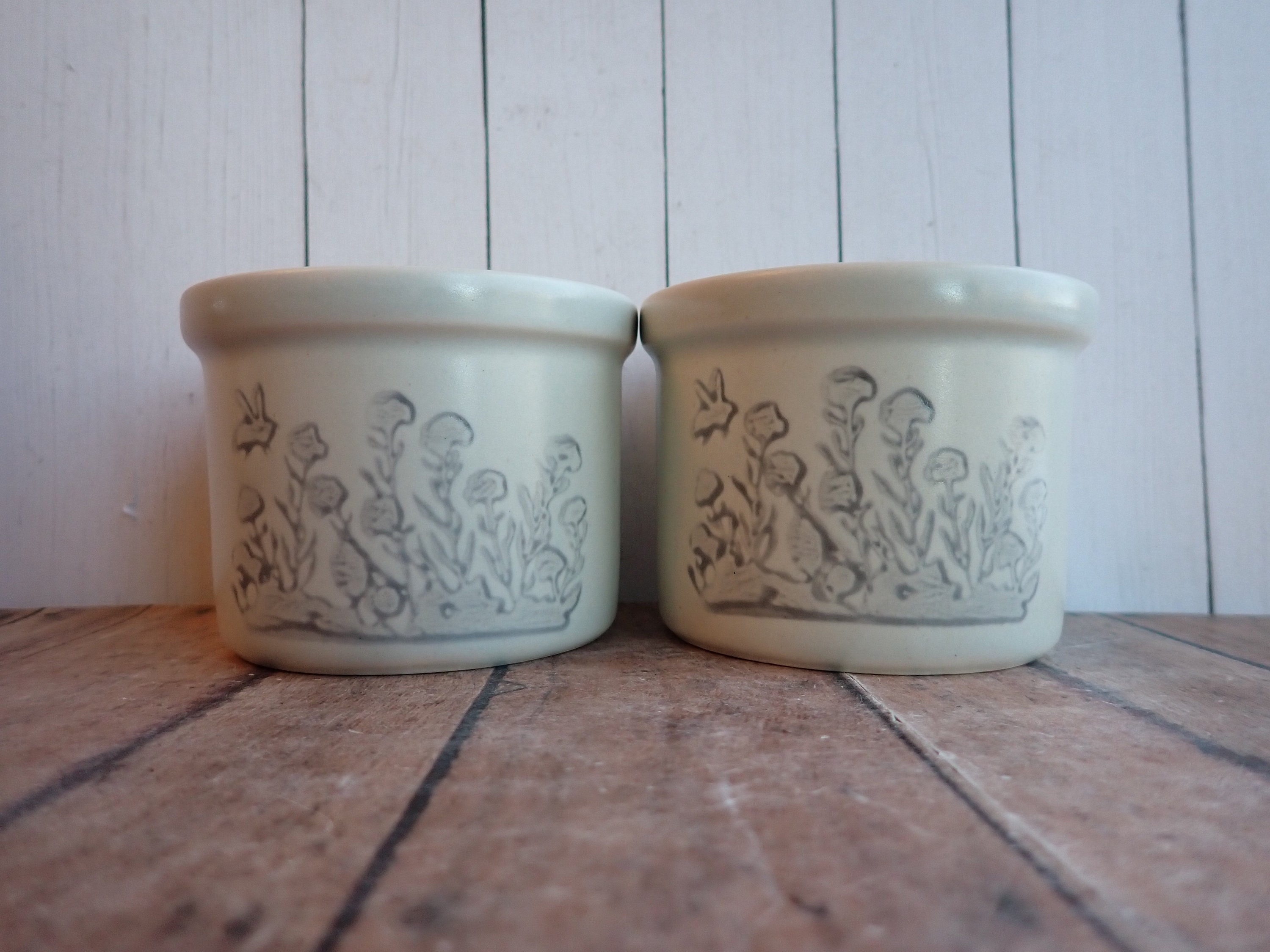 This set of 2 stoneware crocks by Pfaltzgraff are each 3.5" in diameter and 2.5" high. They are a white/light gray stoneware with a gray leaf and flower design on the front side of the crock. The back sides are plain. They are marked on the bottoms with the Pfaltzgraff logo and the number 920.