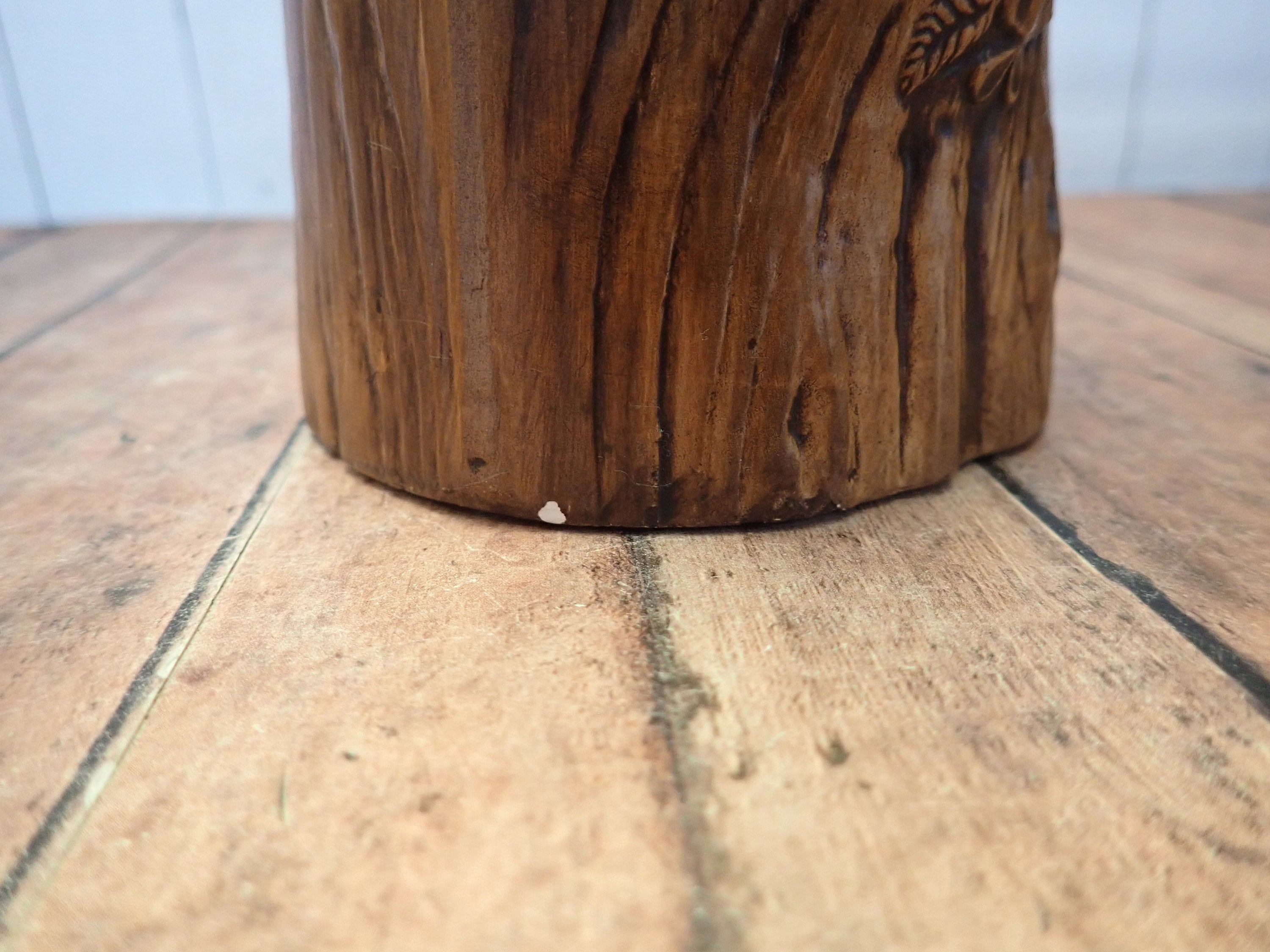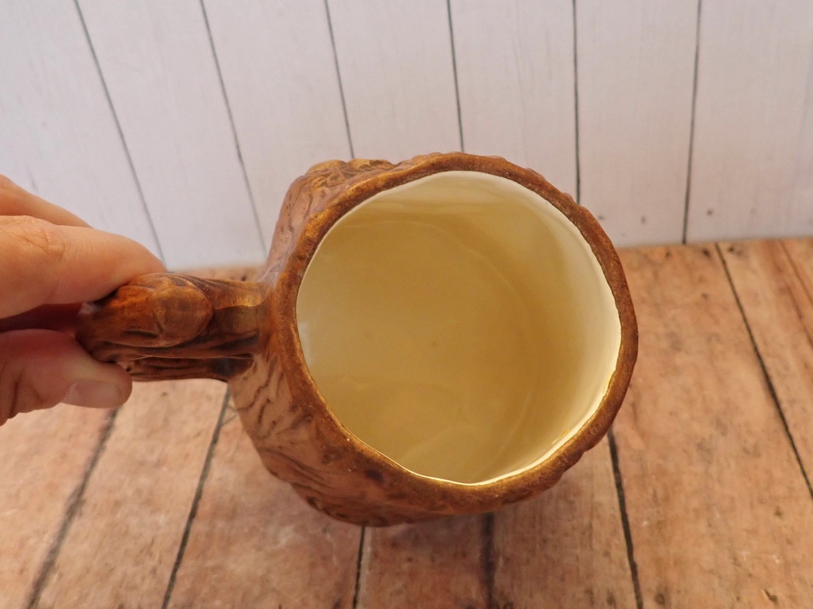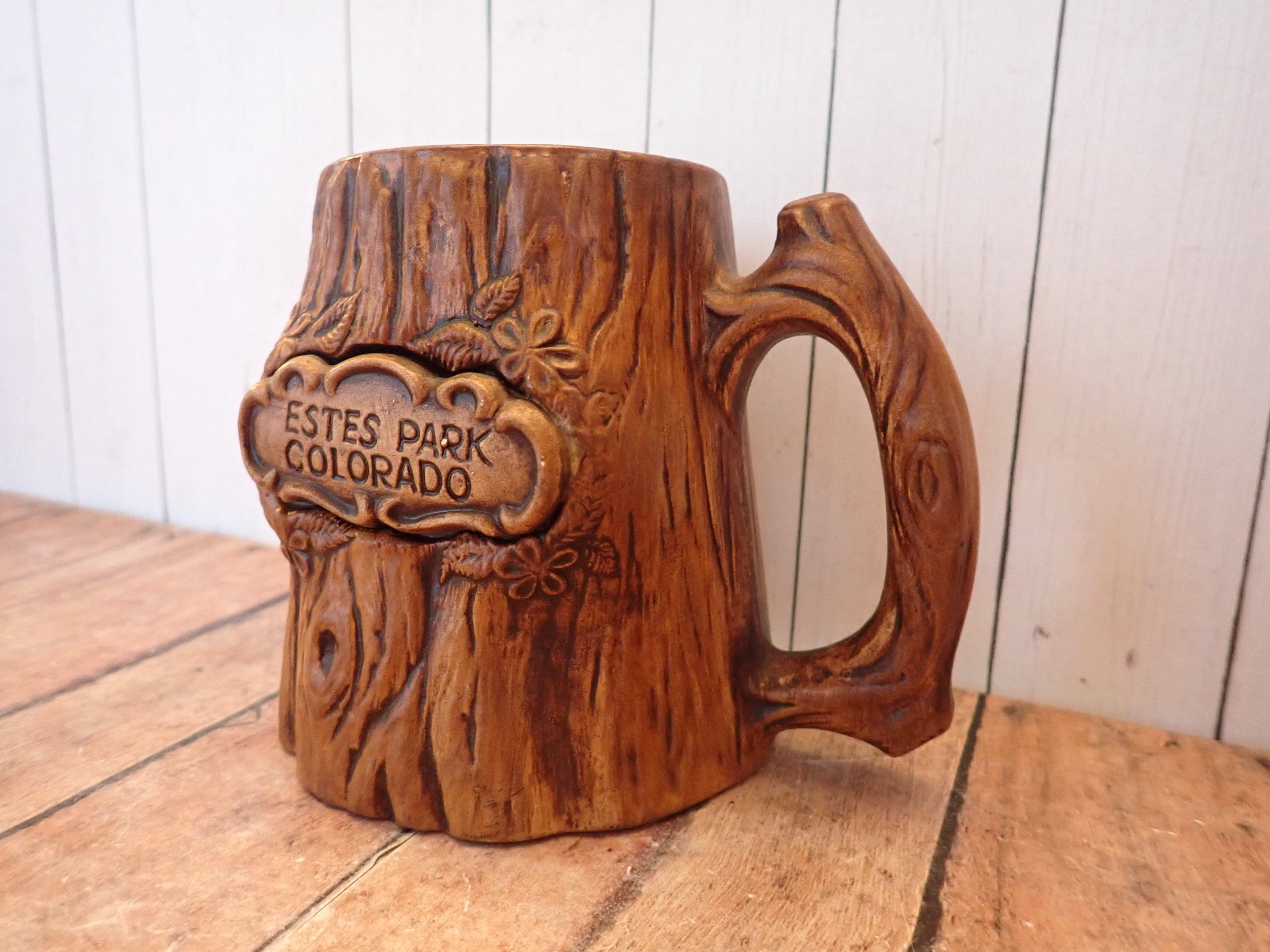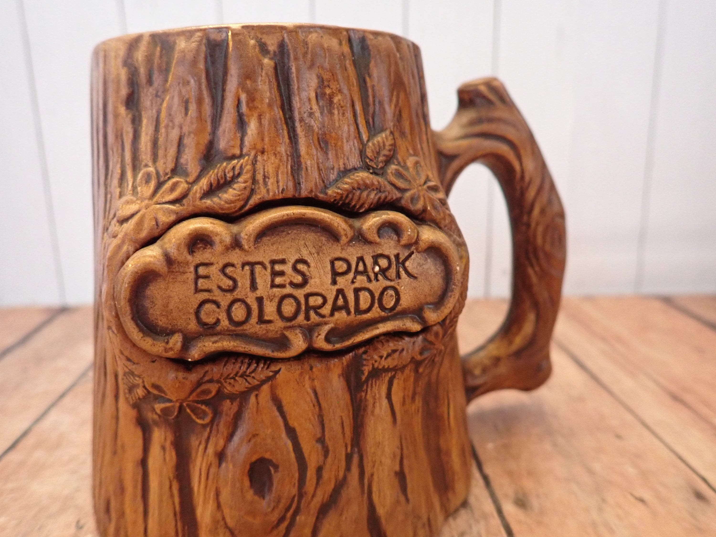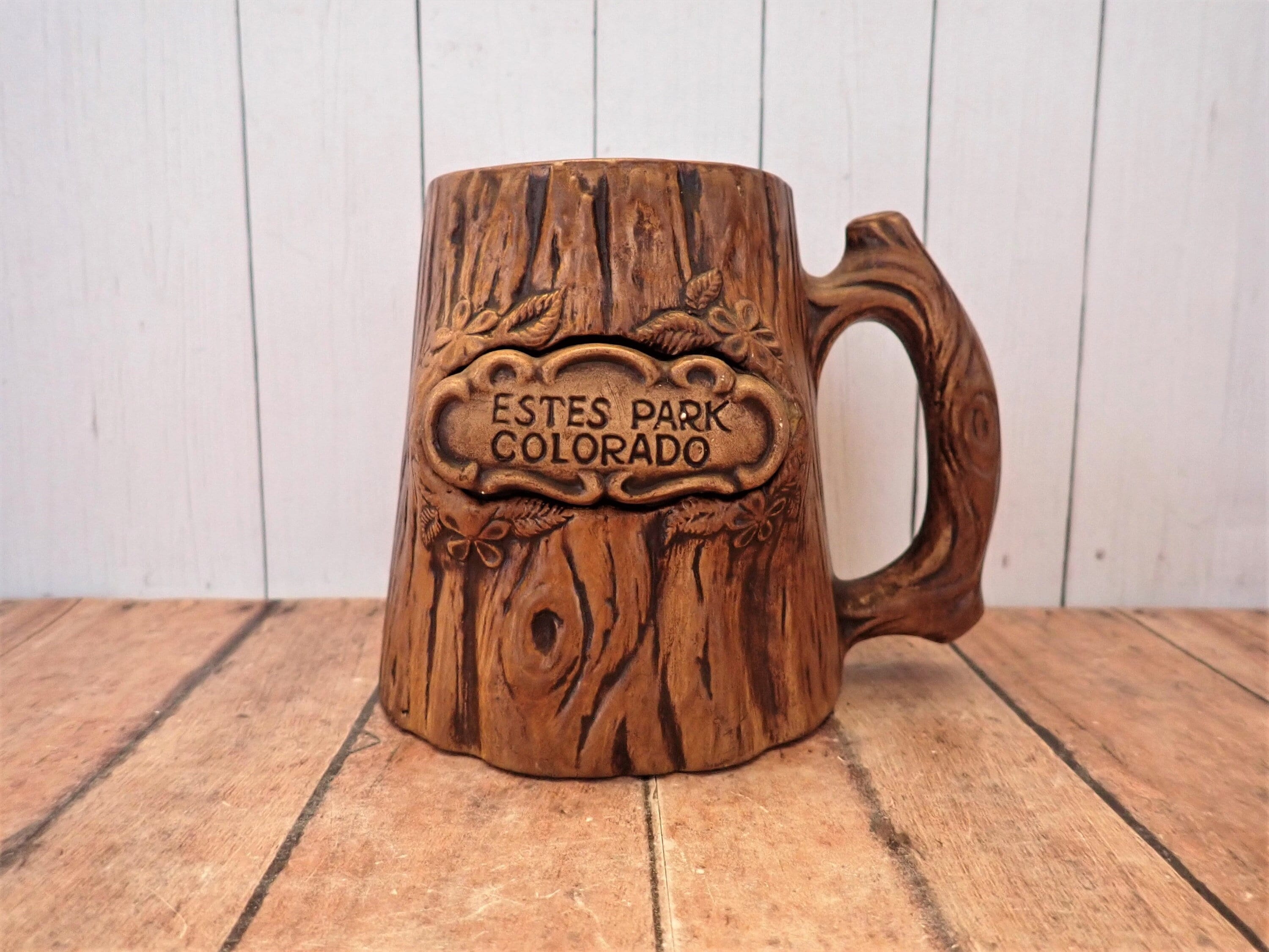 This cool cold Estes Park souvenir mug by Treasure Craft USA is 4.25" tall and 4" in diameter at the base. With the handle it is 5" wide. It has a faux wood grain texture, and the front of the mug has a plaque that says ESTES PARK COLORADO. There is a flower and leaf design around the plaque. The bottom edge of the mug is marked TC USA.