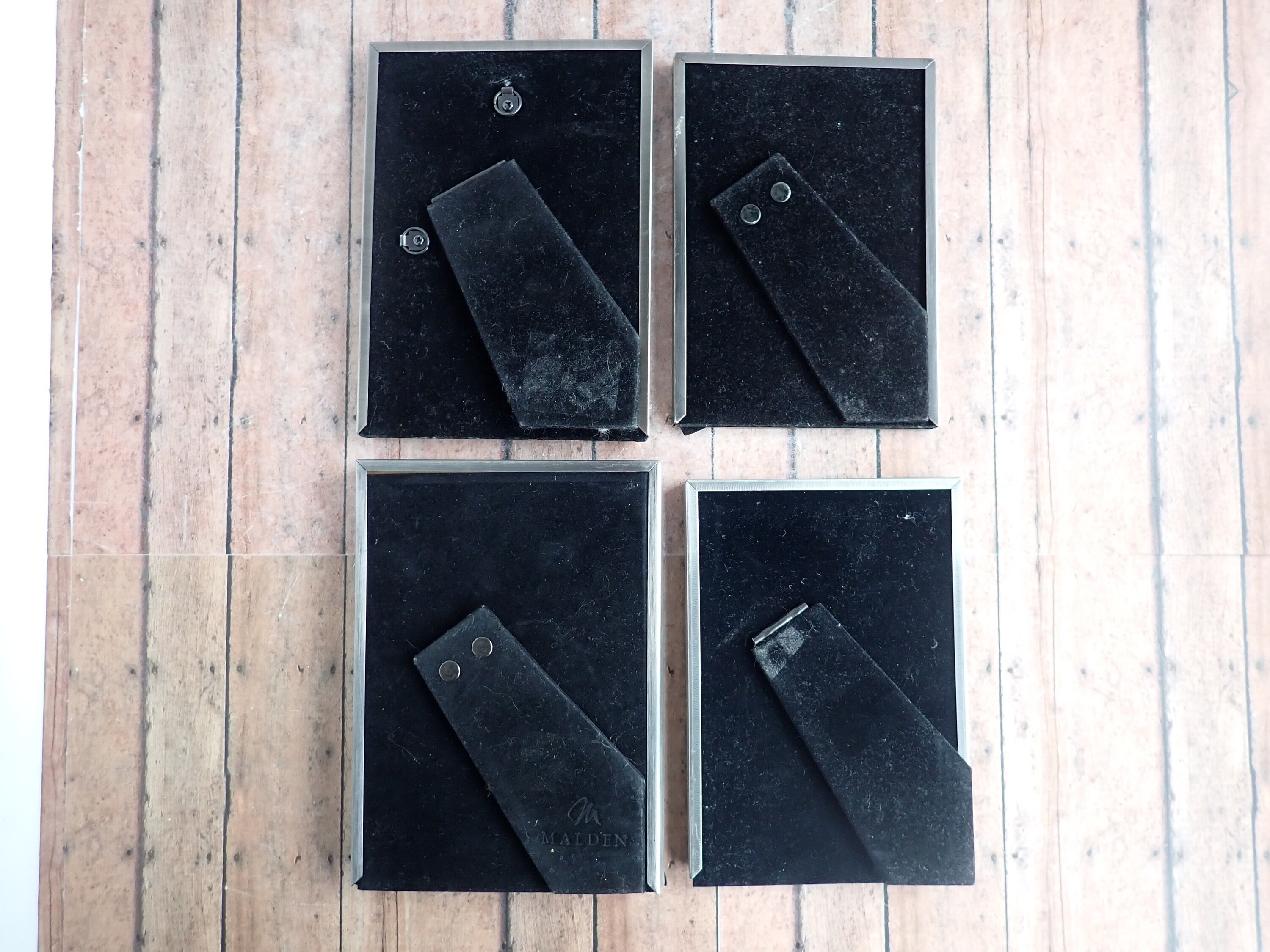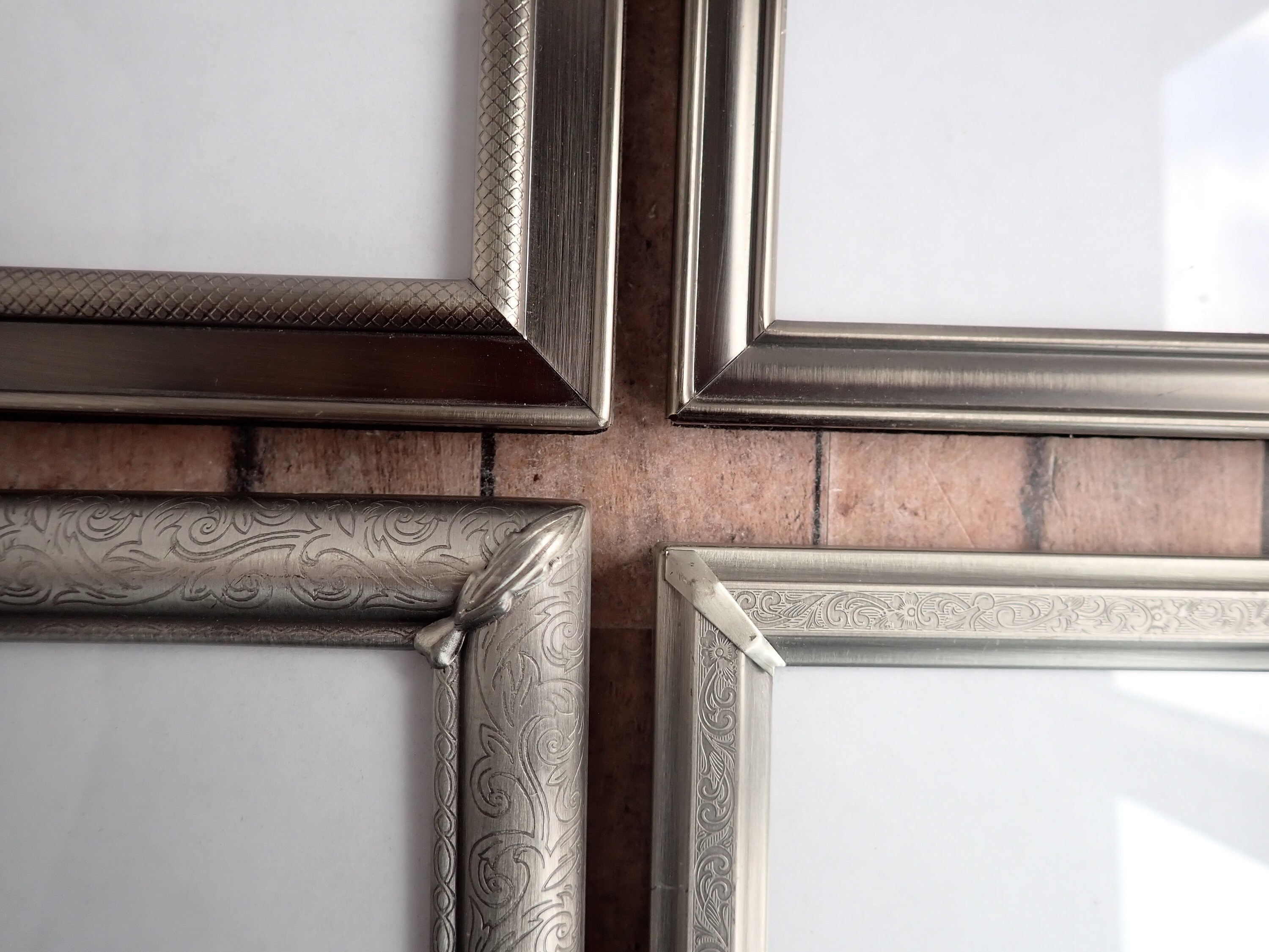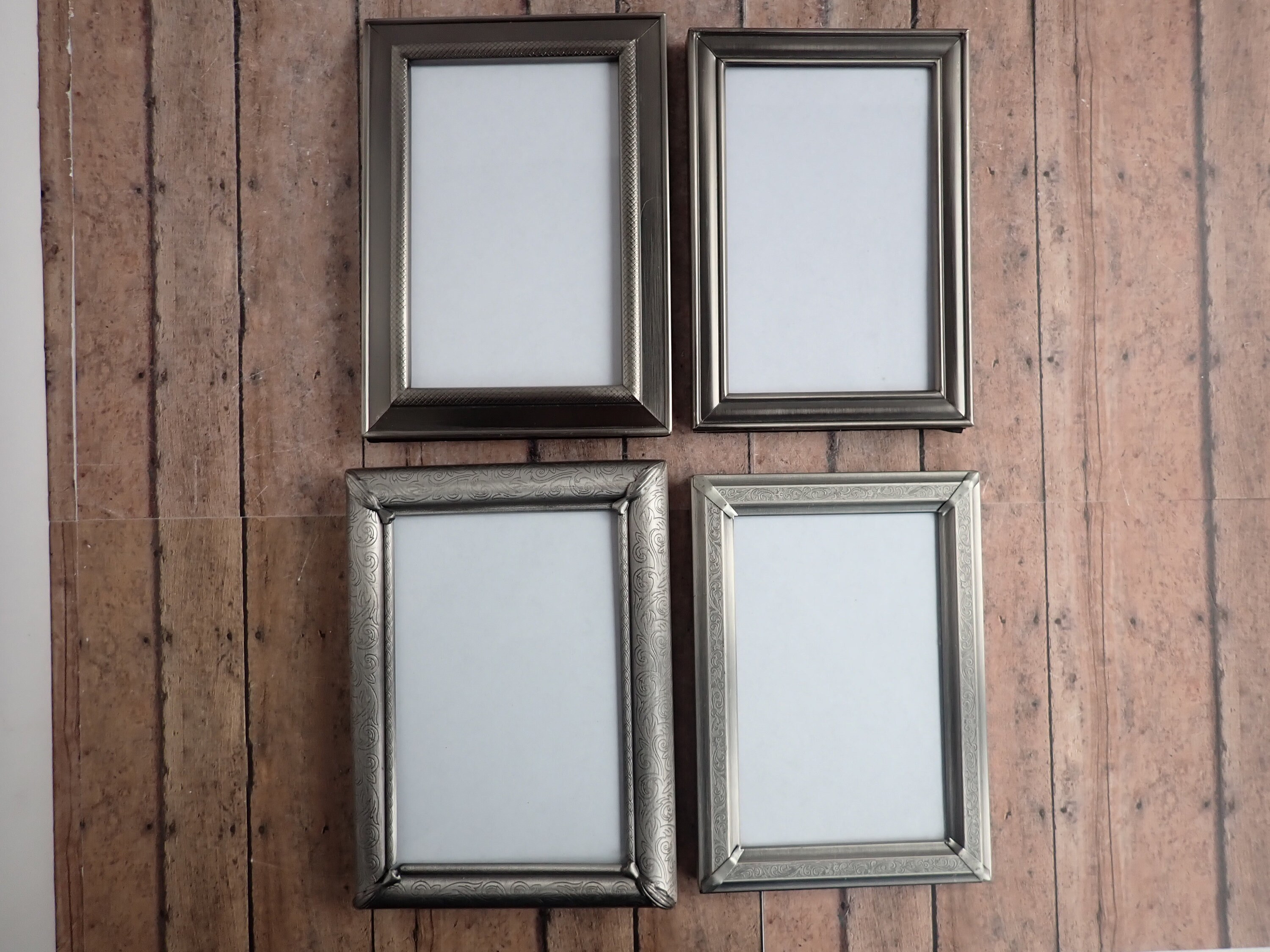 This set of frames includes 4 coordinating silver 4x6 frames. The frames can hold a 5x7 photo but the photo opening is 4x6 size. The frames have a piece of clear glass over the photo opening and a cardboard backing piece with a photo stand. Two of the frames are smooth, and two have an etched design. The photos can stand either vertically or horizontally.