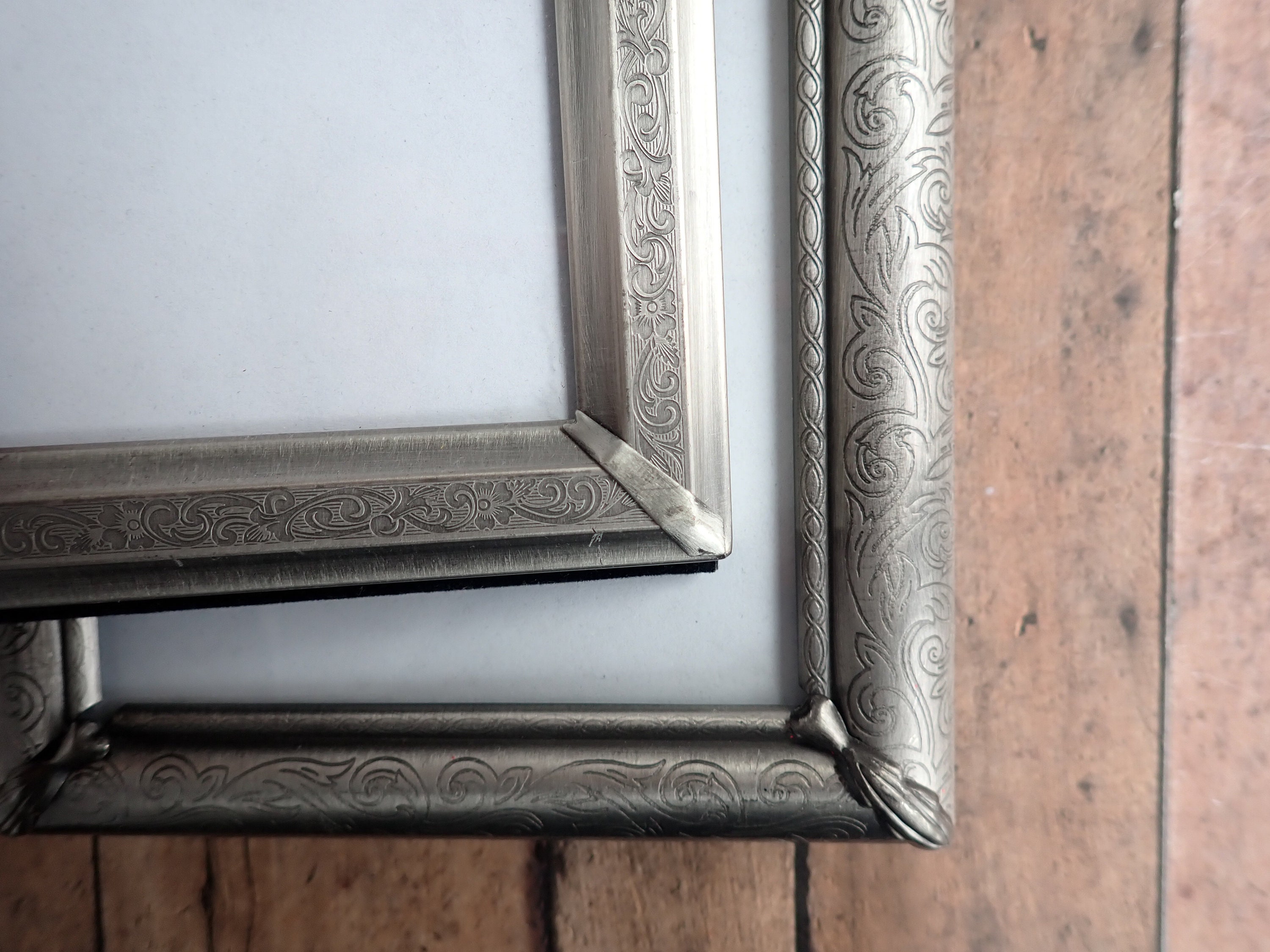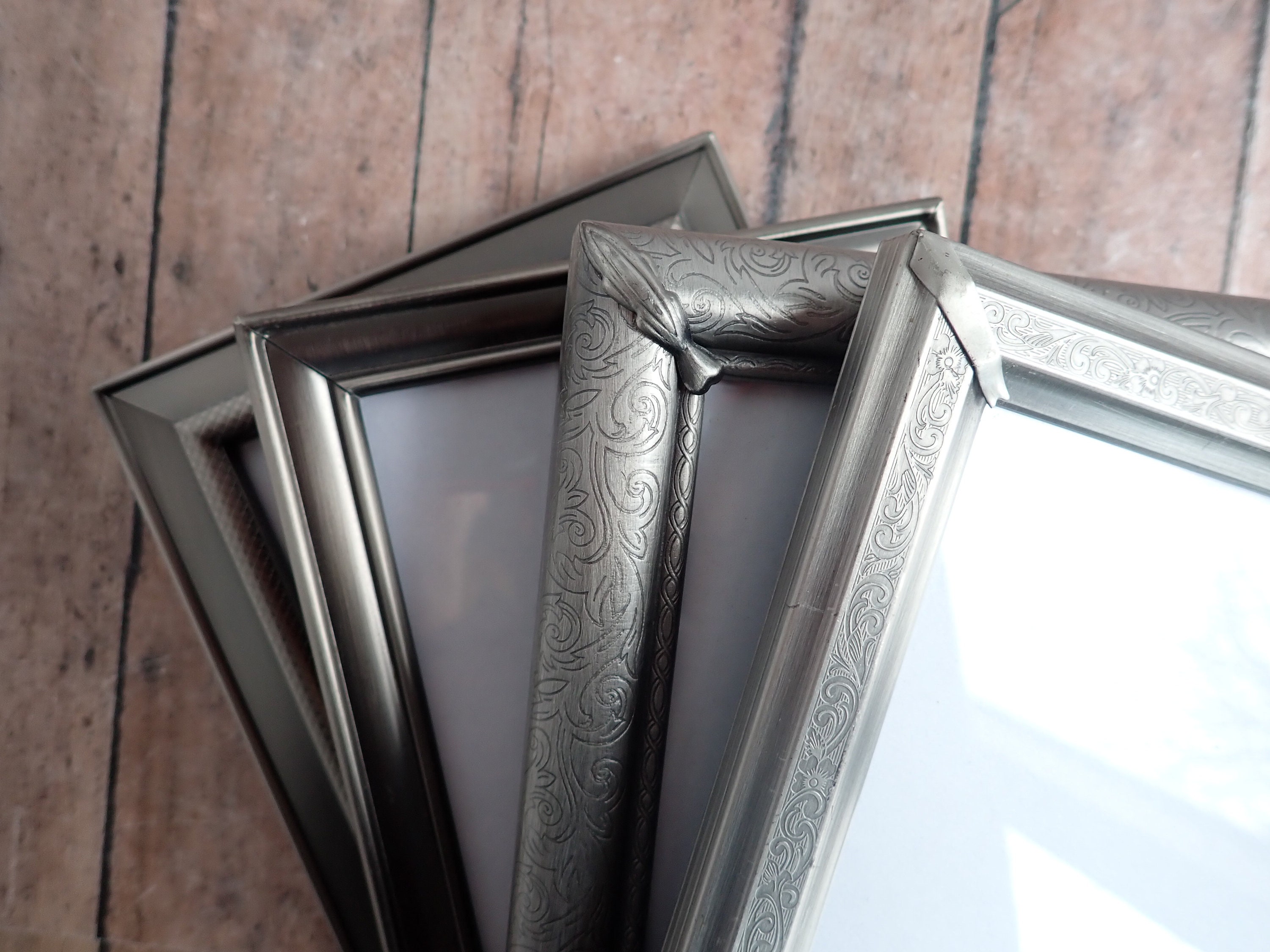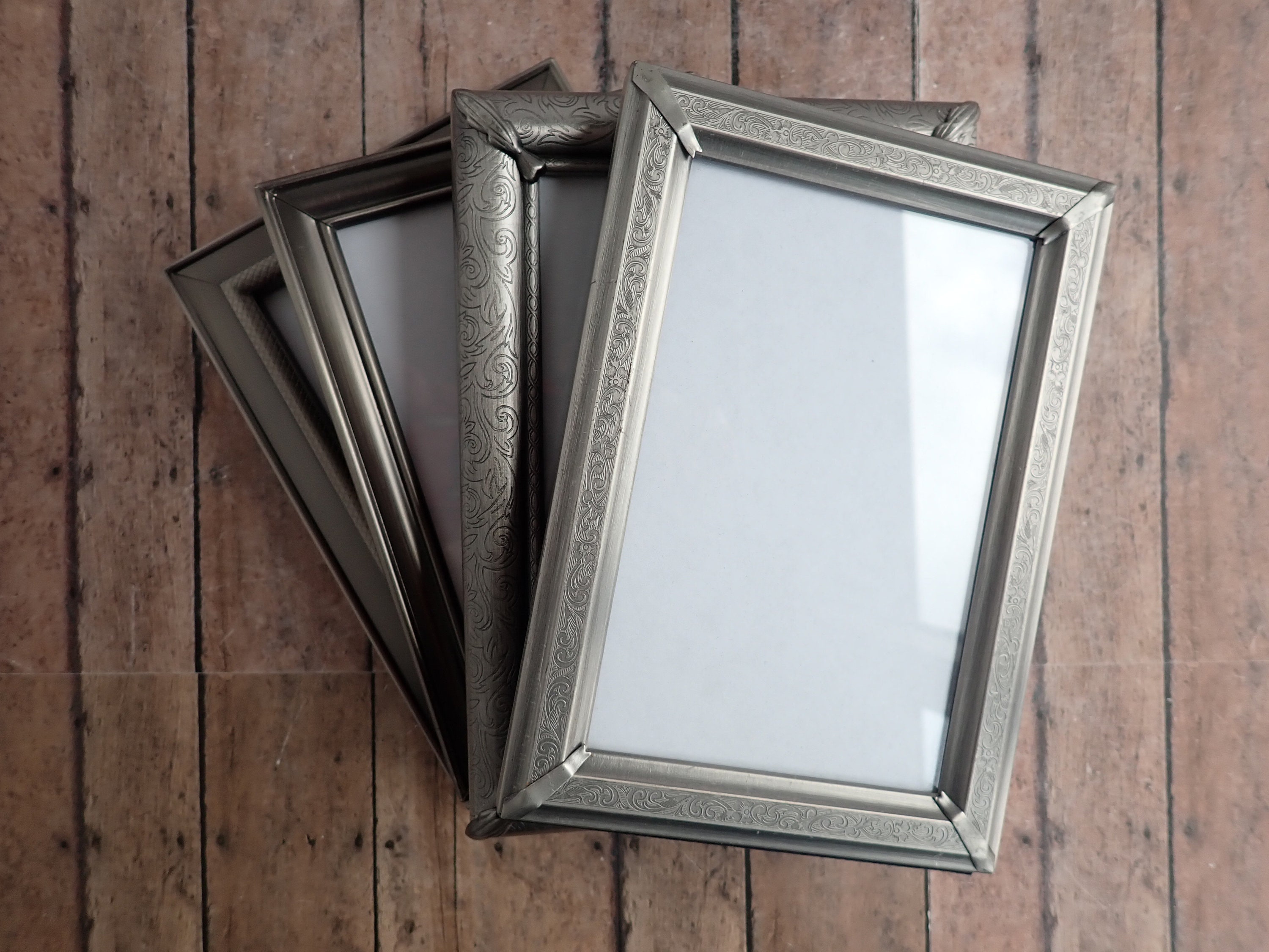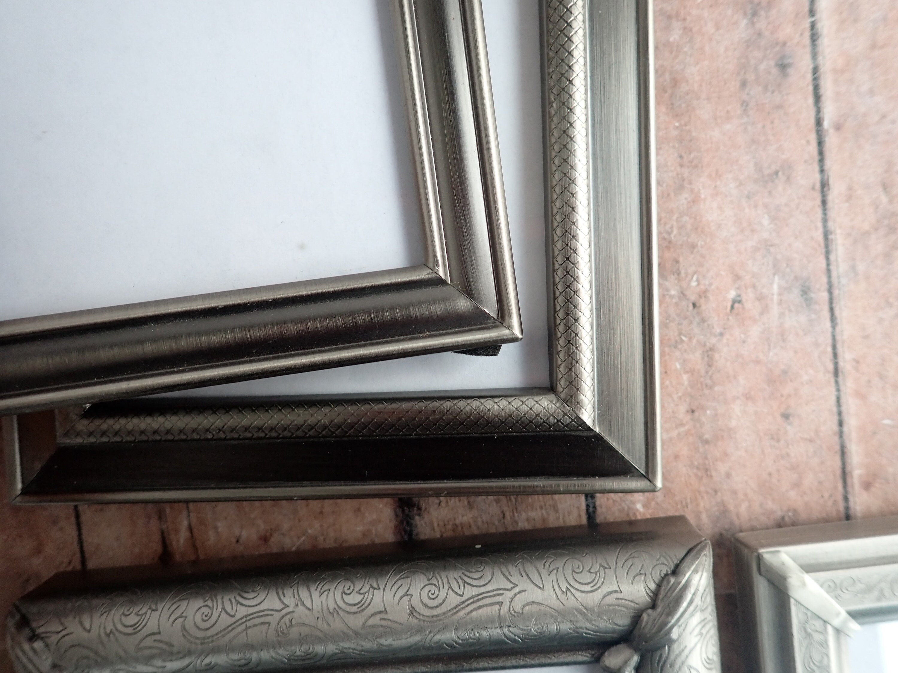This set of frames includes 4 coordinating silver 4x6 frames. The frames can hold a 5x7 photo but the photo opening is 4x6 size. The frames have a piece of clear glass over the photo opening and a cardboard backing piece with a photo stand. Two of the frames are smooth, and two have an etched design. The photos can stand either vertically or horizontally.