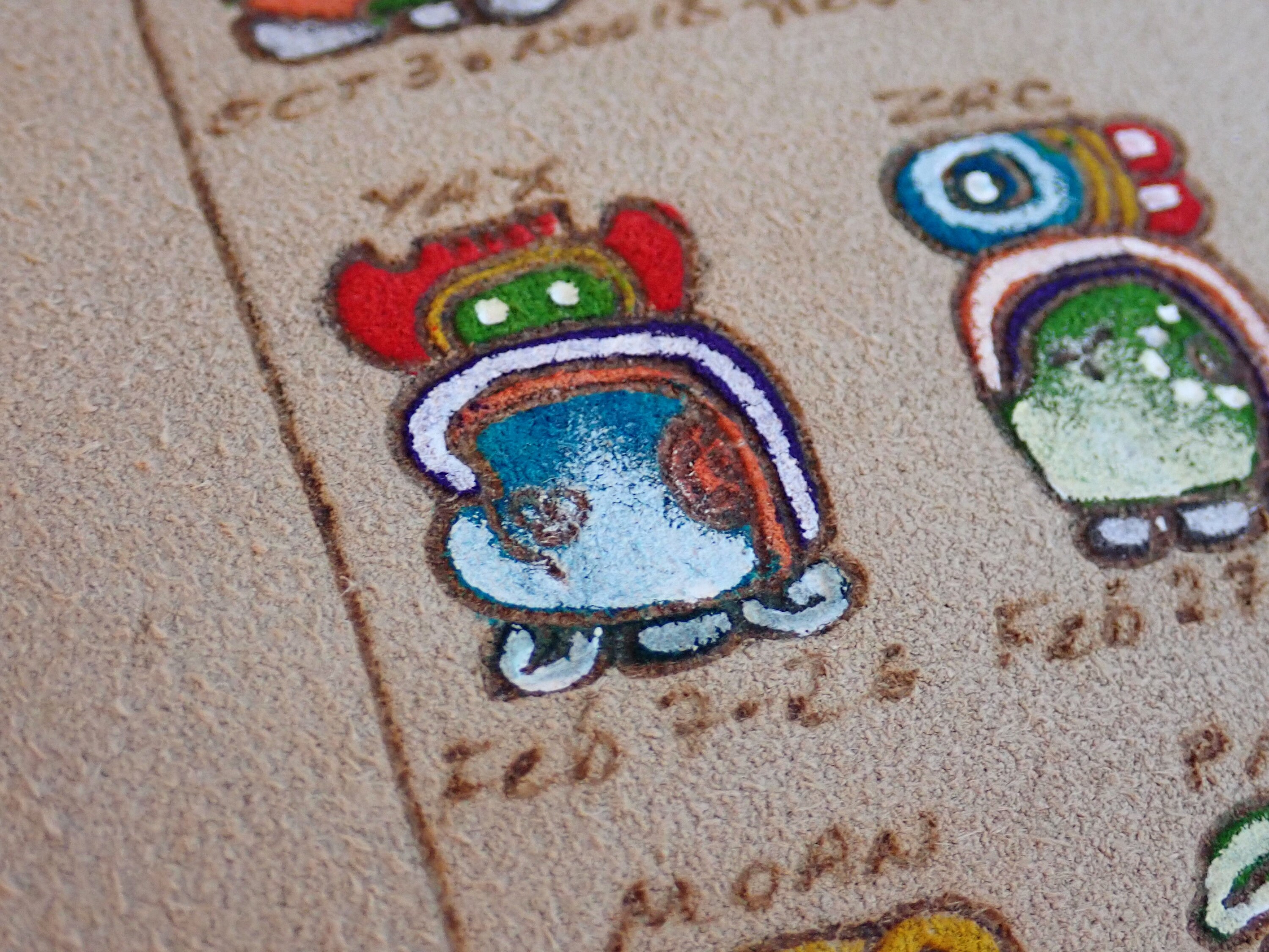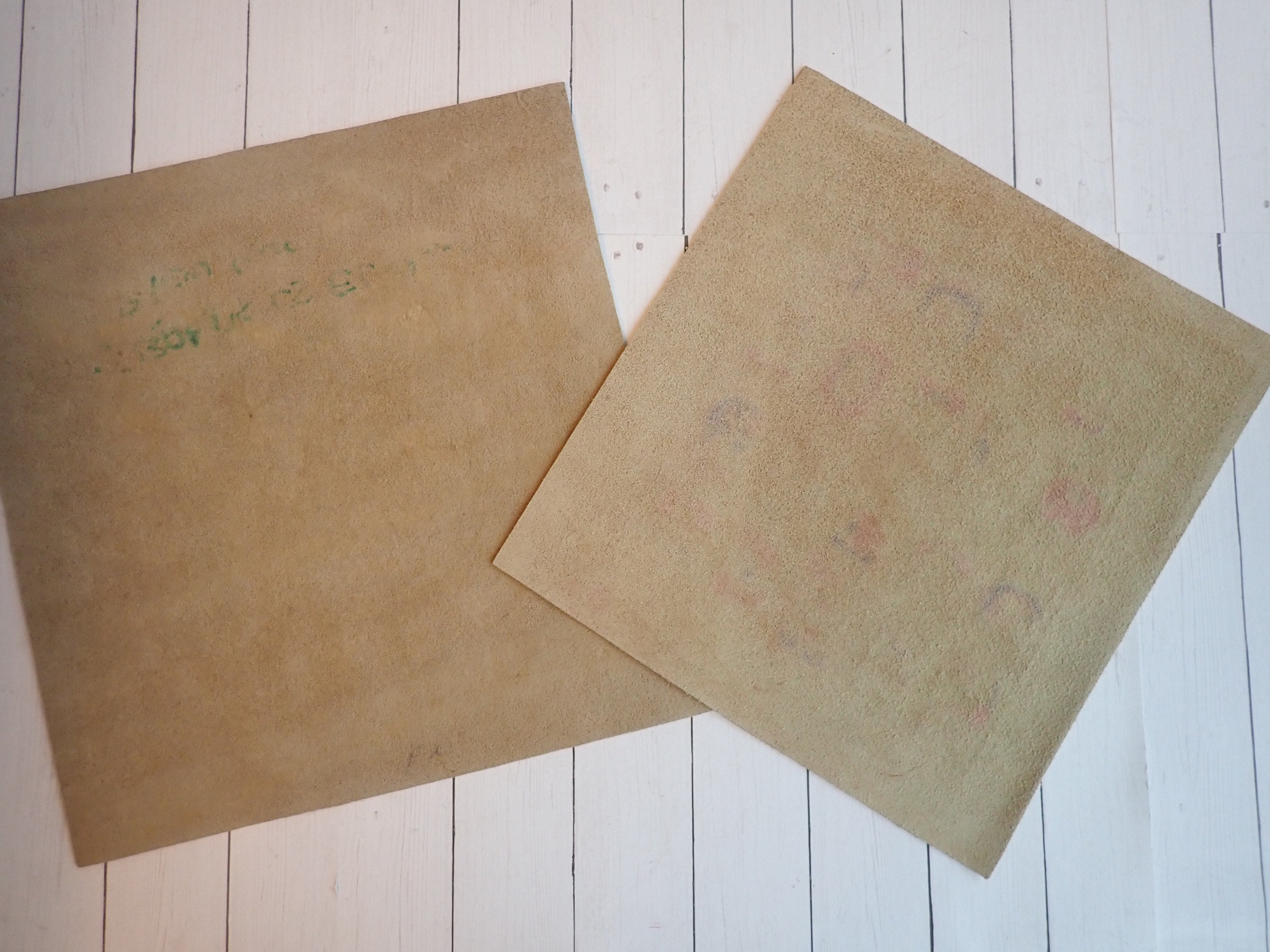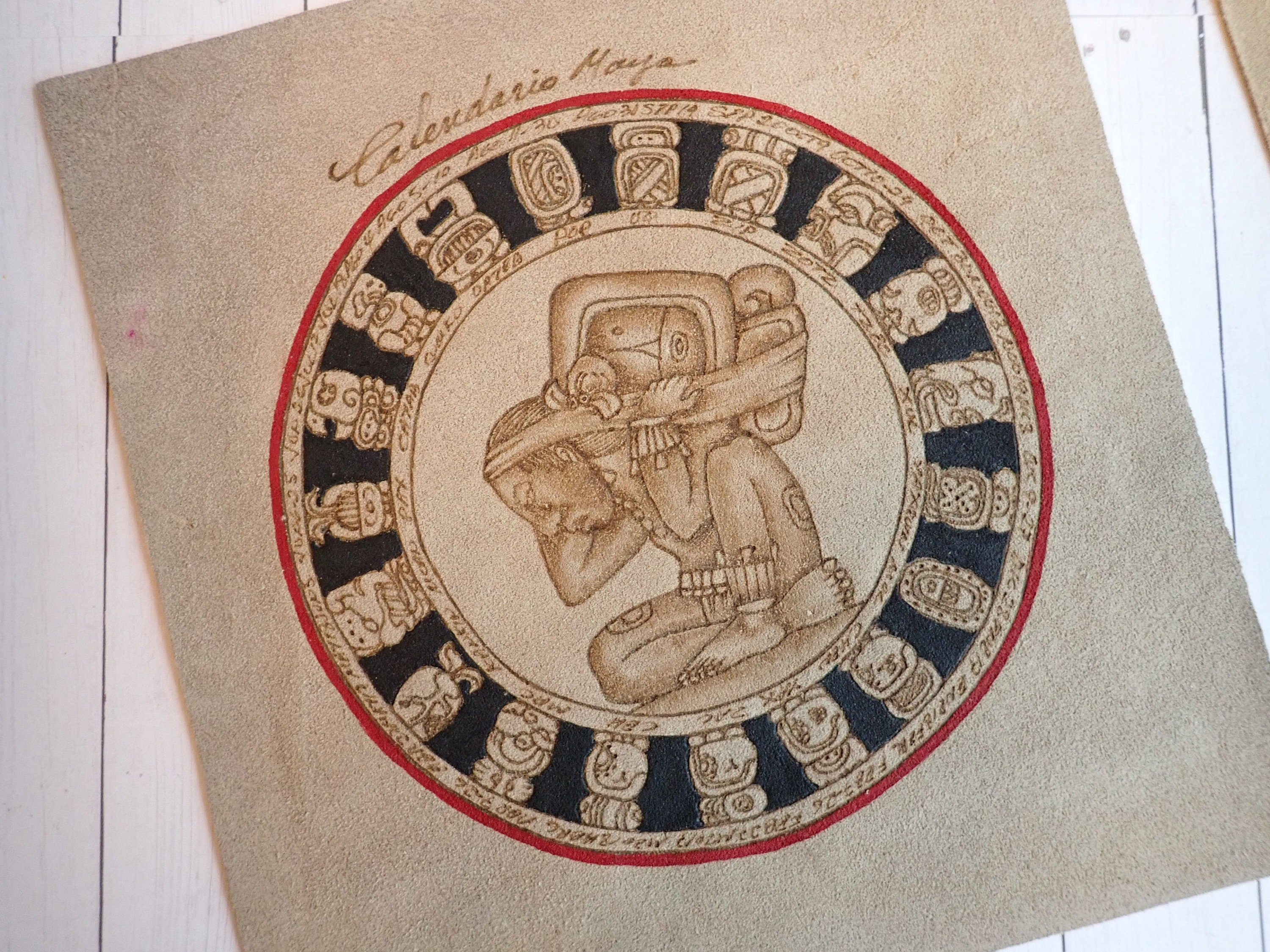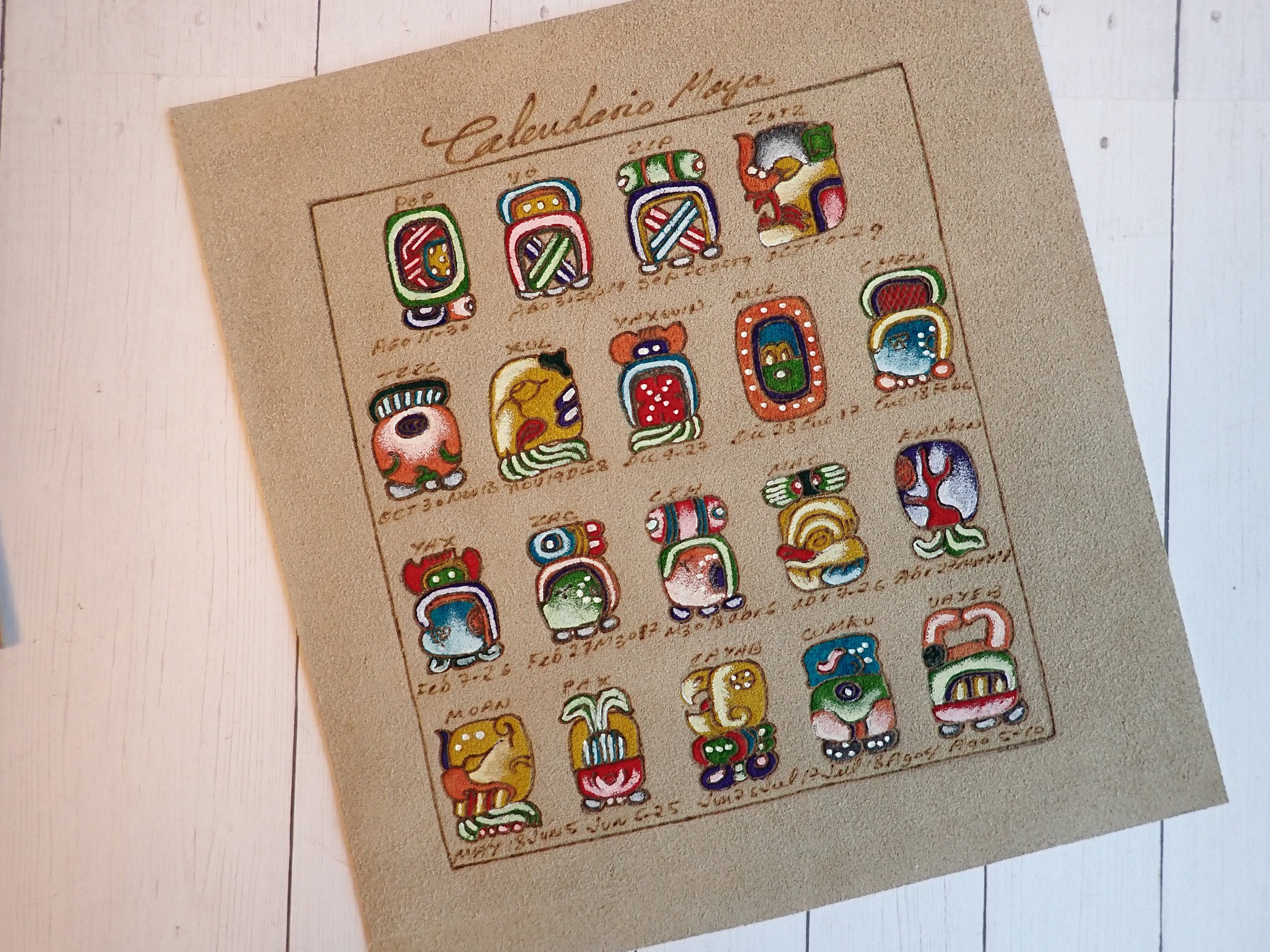 This set of 2 Mexican suede art prints includes two different Mayan calendar pieces. They suede pieces measure 8.5" square and 9" square. One has colored glyphs of the different Mayan calendar months, and one has a circular design with the glyphs around the border. Both pieces were purchased in Mexico in the late 1990s.