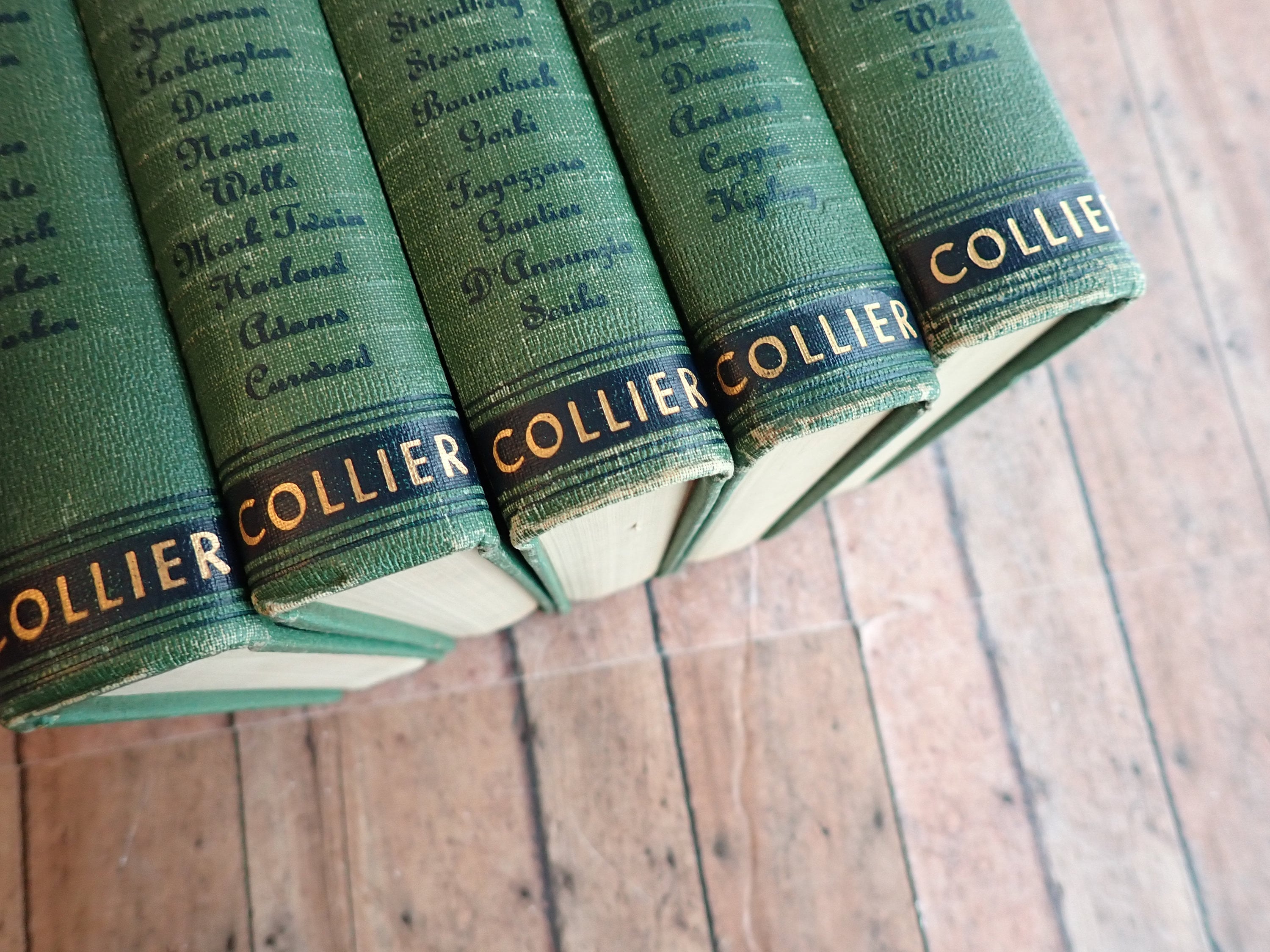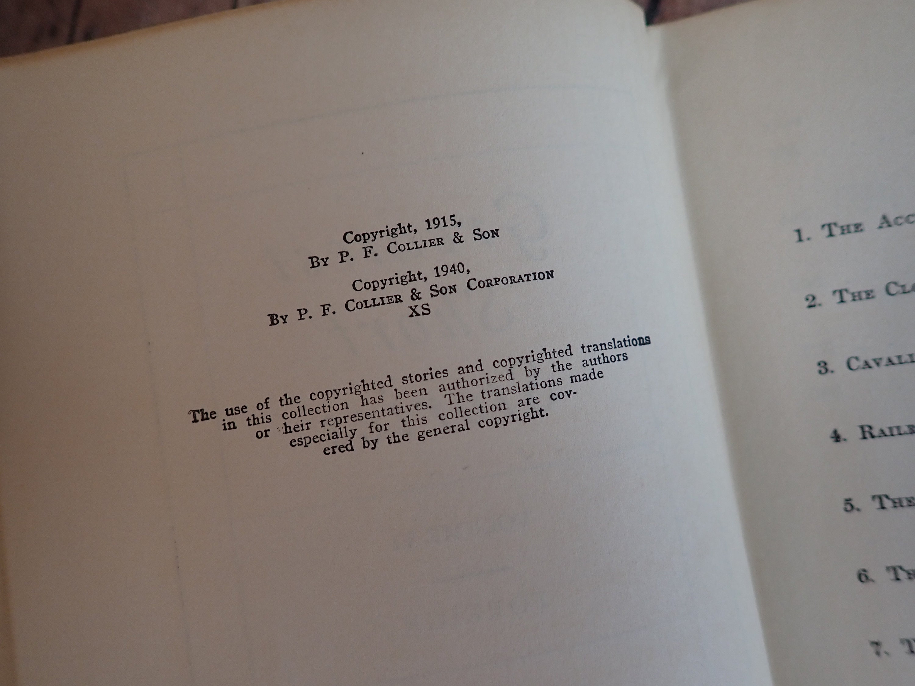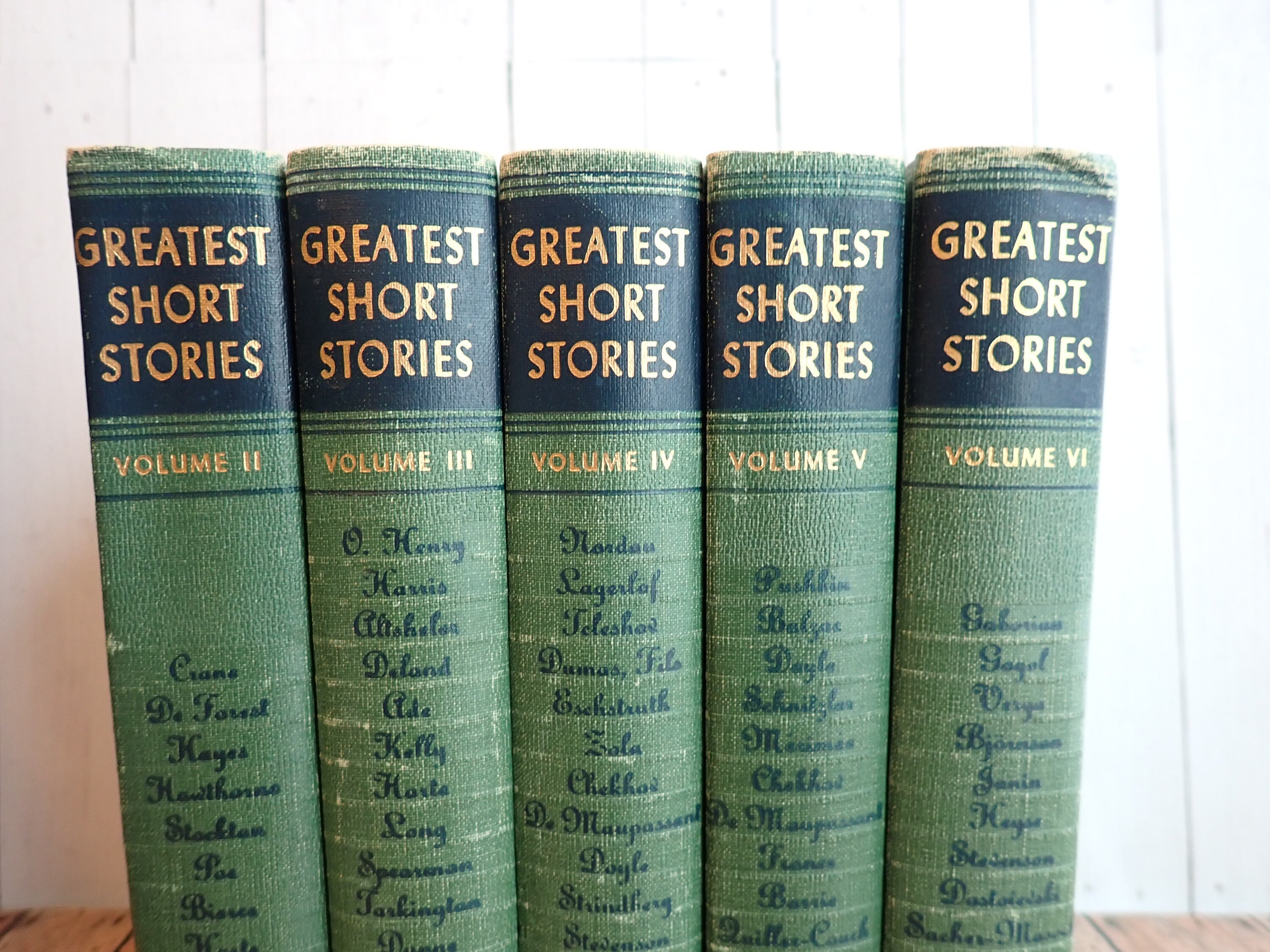 This set of books includes 5 books from the 1940 publication of Greatest Short Stories by PF Collier and Sons. This set includes 5 of the original books in the set - Books 2, 3, 4, 5, and 6. The books are each 8.25" tall, 5.5" deep, and about 1" thick. They have a green and black binding with gold letters and black printing down the spine.