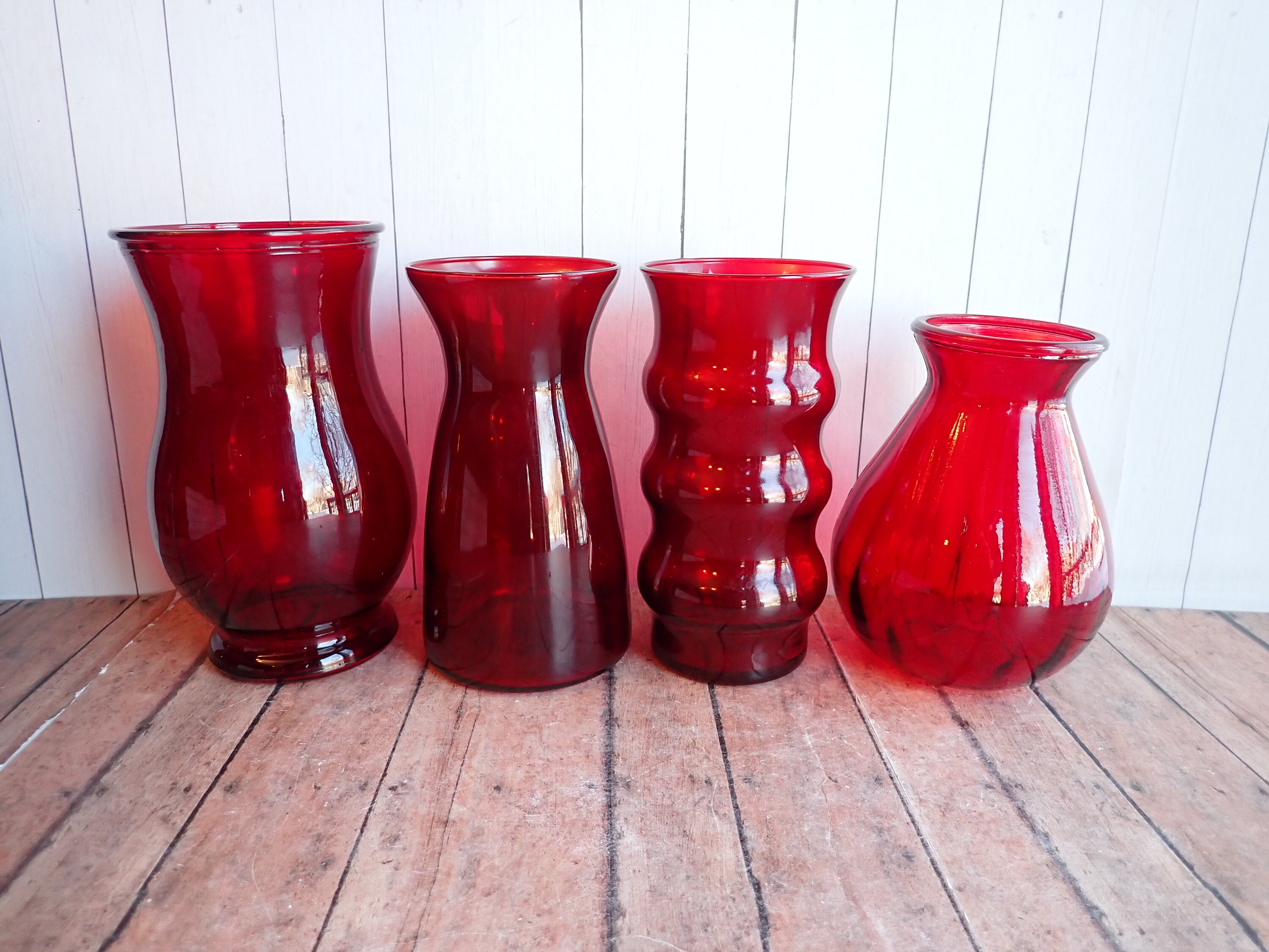 This set of red glass vases includes 7 coordinating vases in different patterns. They range in height from 6.5" to 9" tall, and they all have different patterns and styles that coordinate together nicely.