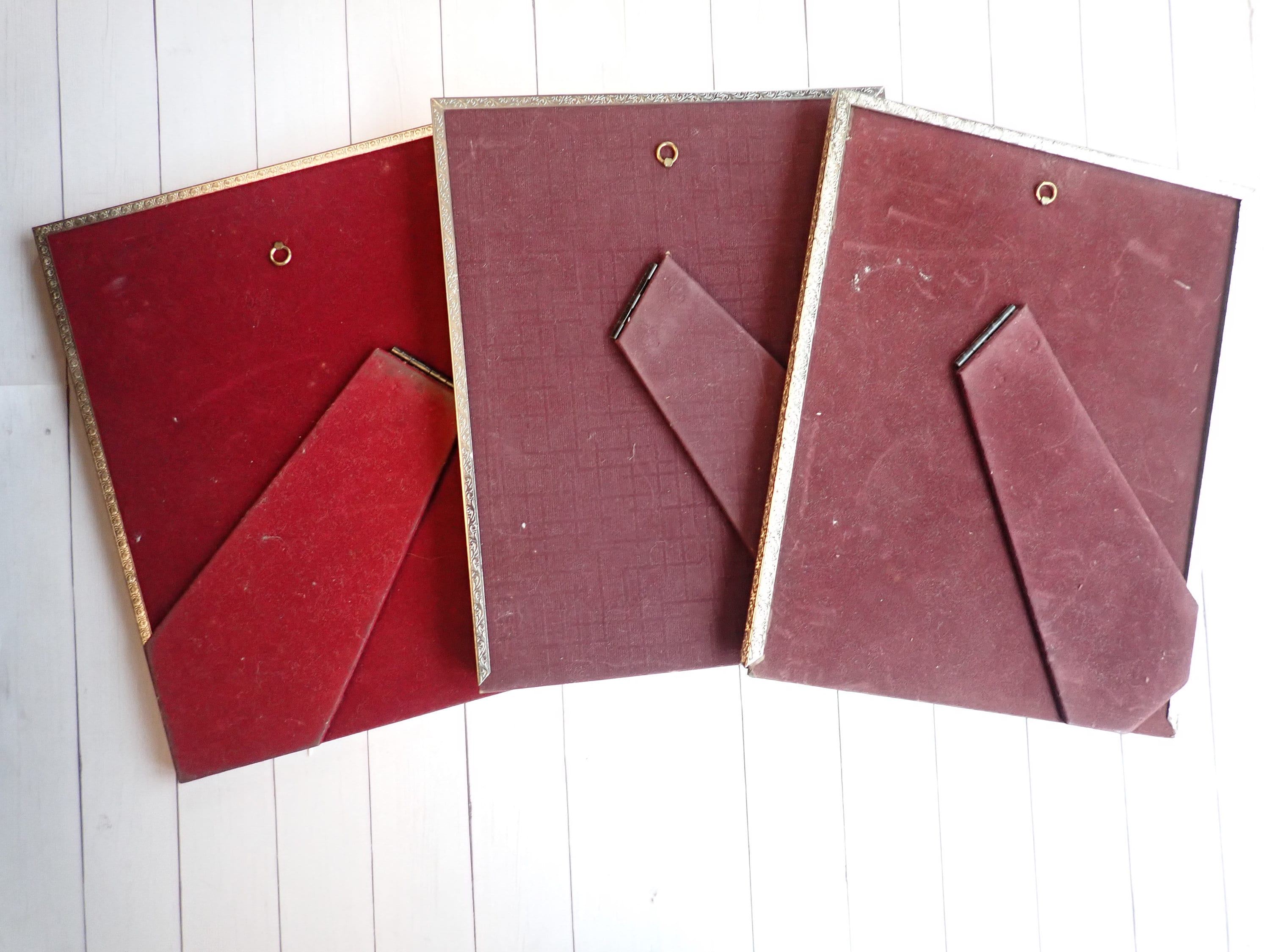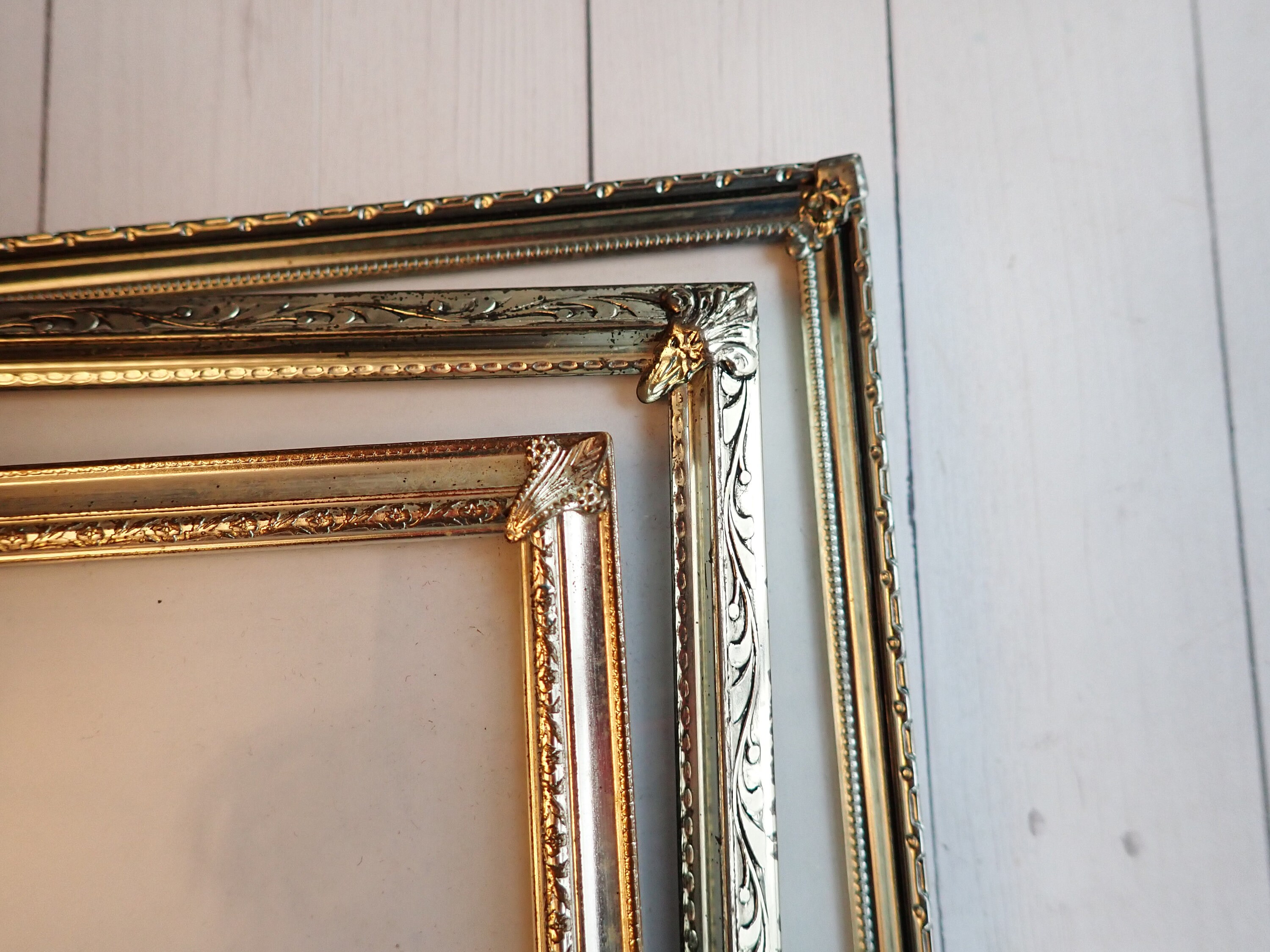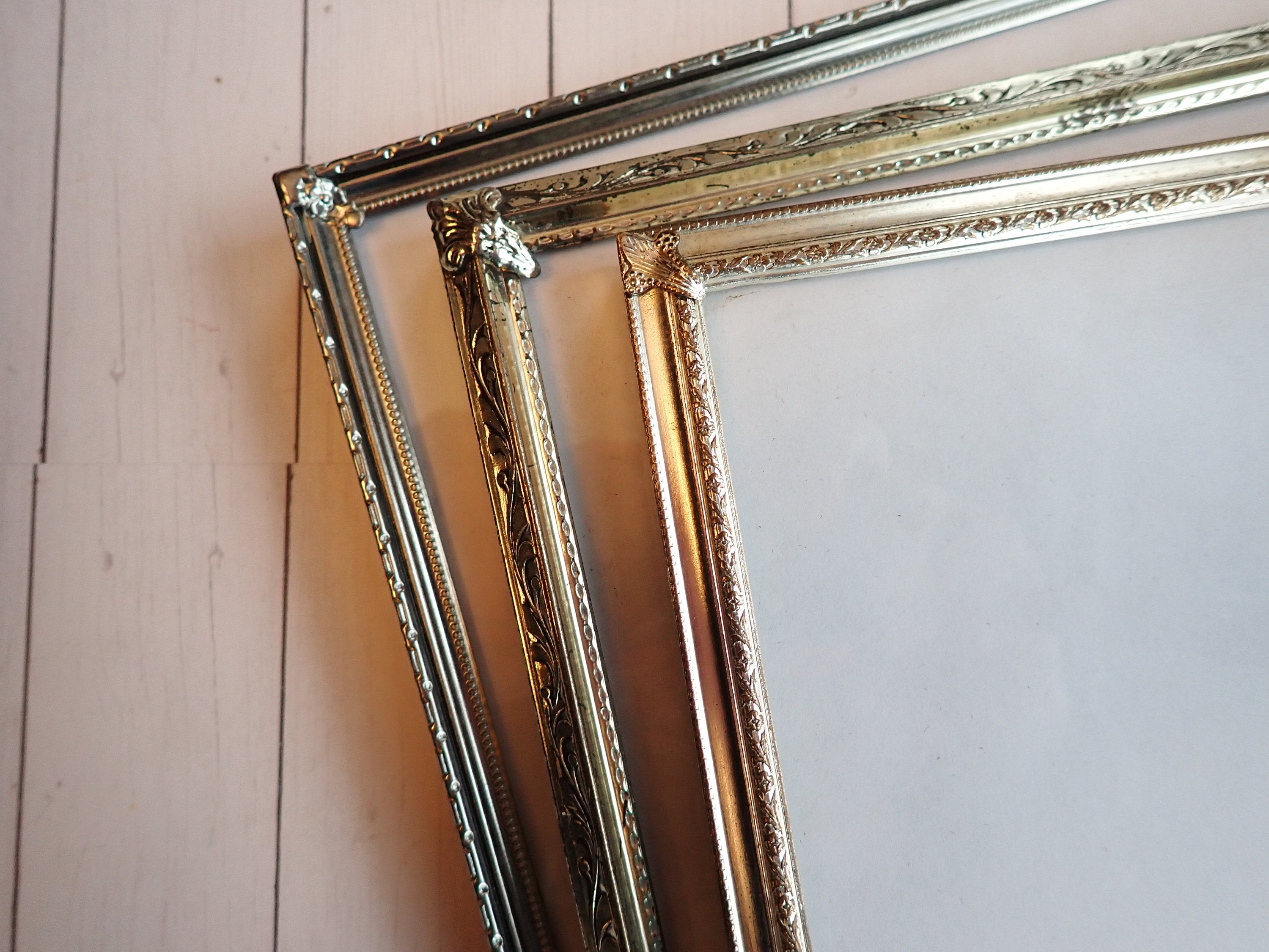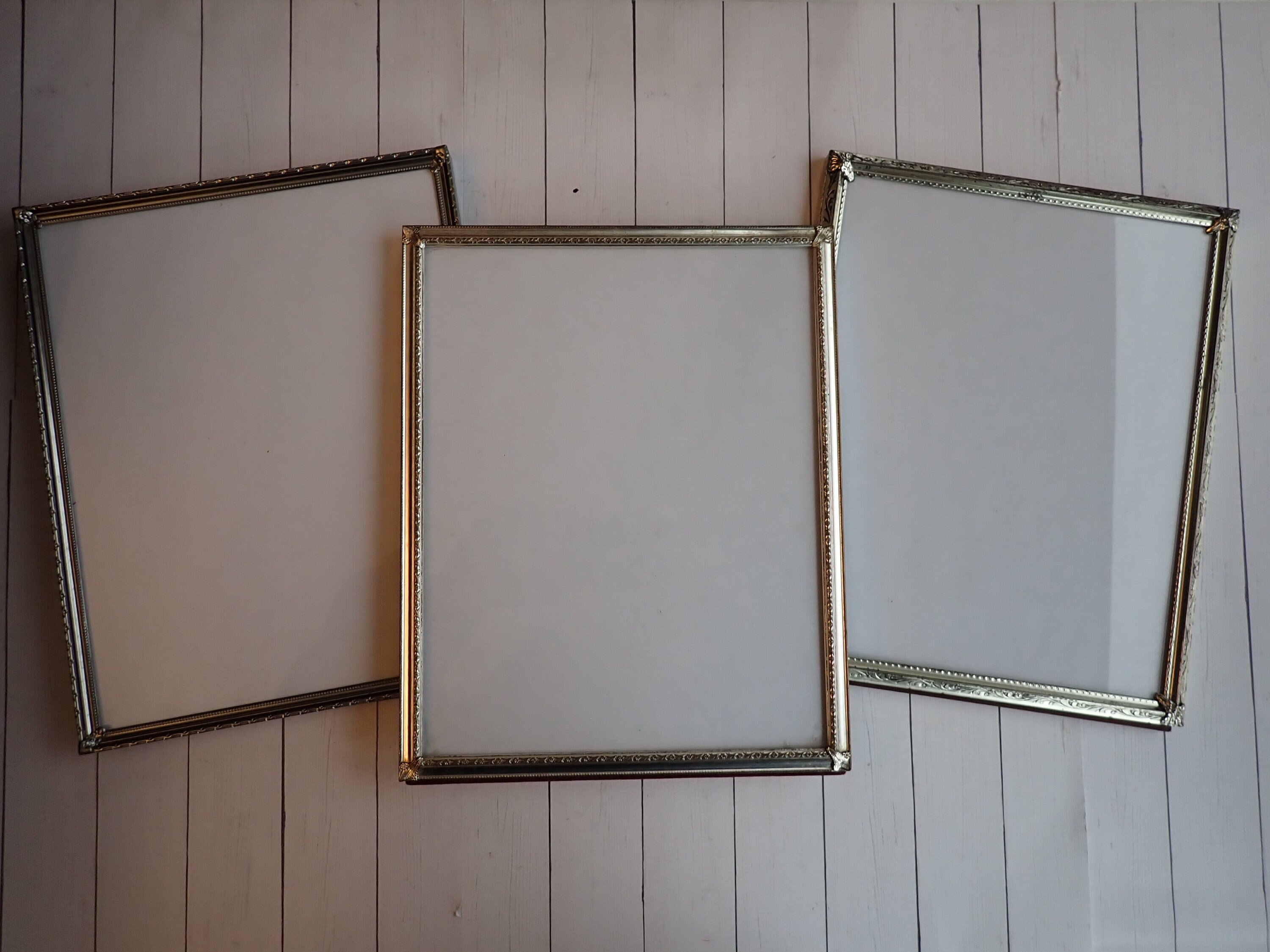 This set of frames includes 3 silver metal 8x10 frames. All 3 frames are 8x10 size, and have a piece of clear glass over the photo opening and a cardboard backing piece with a photo stand. The photos can stand either vertically or horizontally. The frames have a nicely etched designs around the frames.