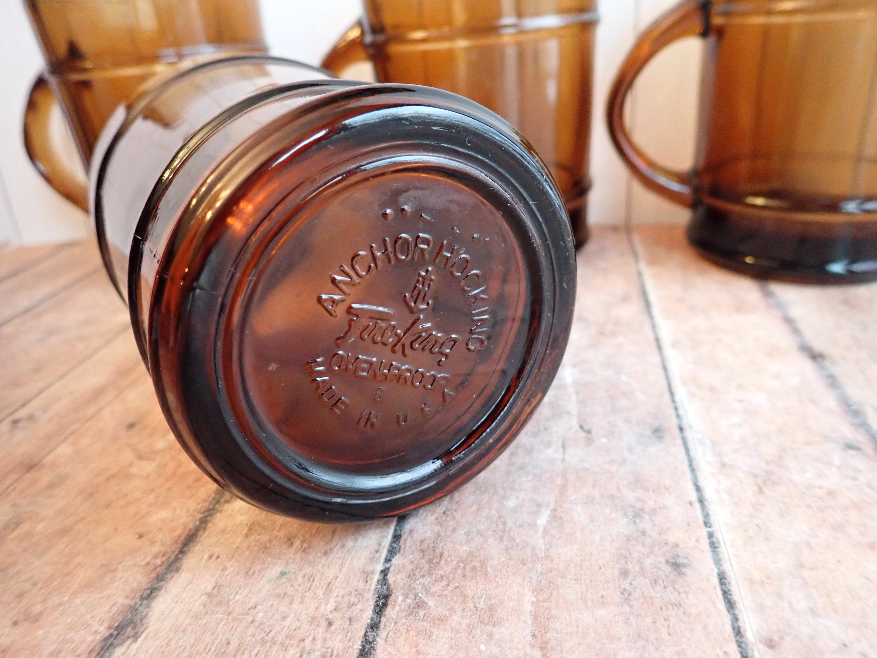 This set of 4 vintage Anchor Hocking brown glass mugs are each 4" tall and 3.25" in diameter. They have a nice, simple design with a horizontal band around the top and bottom of the mug. They hold 8 oz. comfortably and 10 oz. filled to the rim. The bottom of the mugs is marked with the Anchor Hocking logo, and reads: ANCHOR HOCKING / FIREKING / OVENPROOF / MADE IN USA.