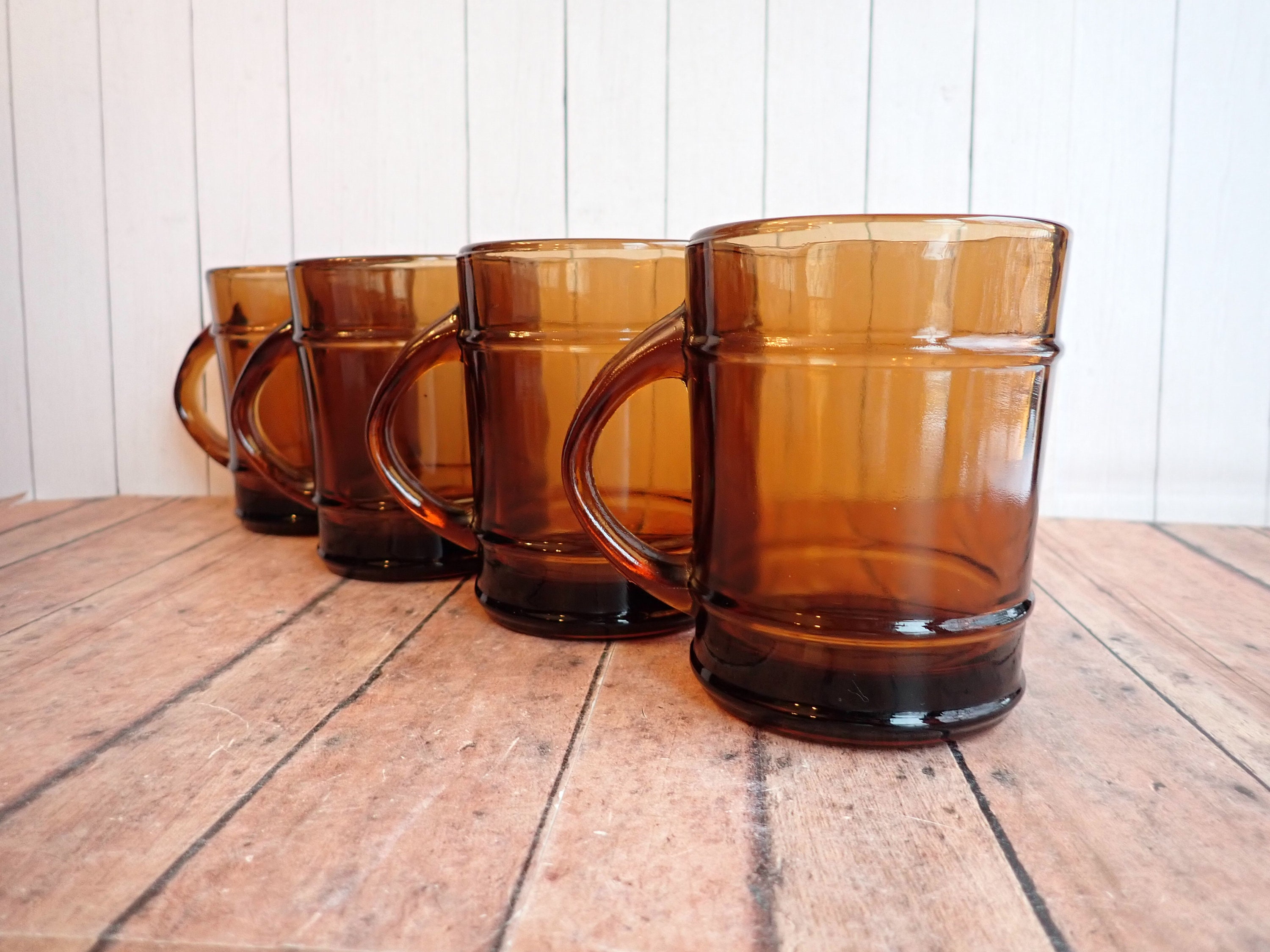 All 4 mugs are in very good condition with no chips or cracks. There are a few light scratches from use. Great set of vintage glass mugs!