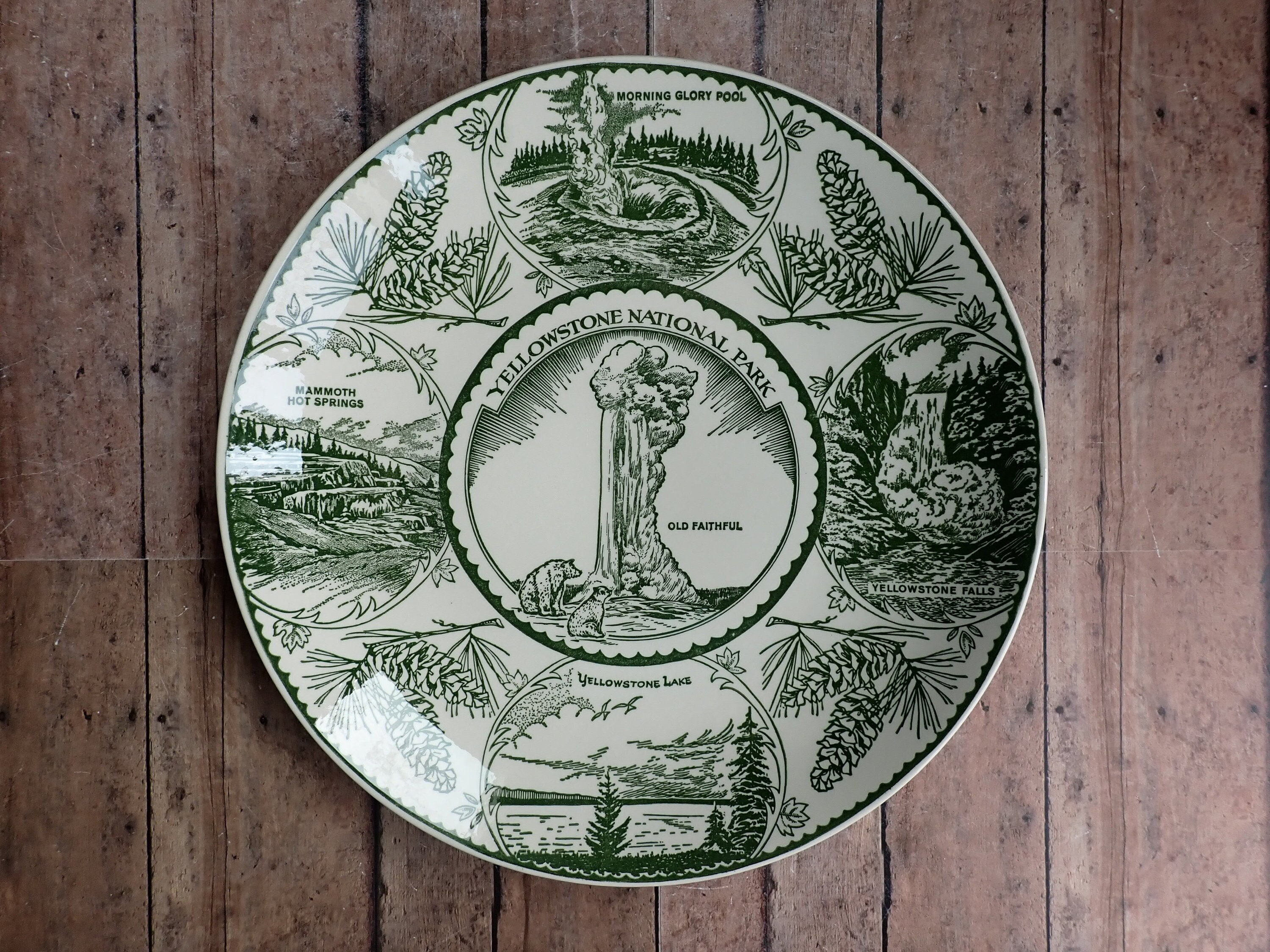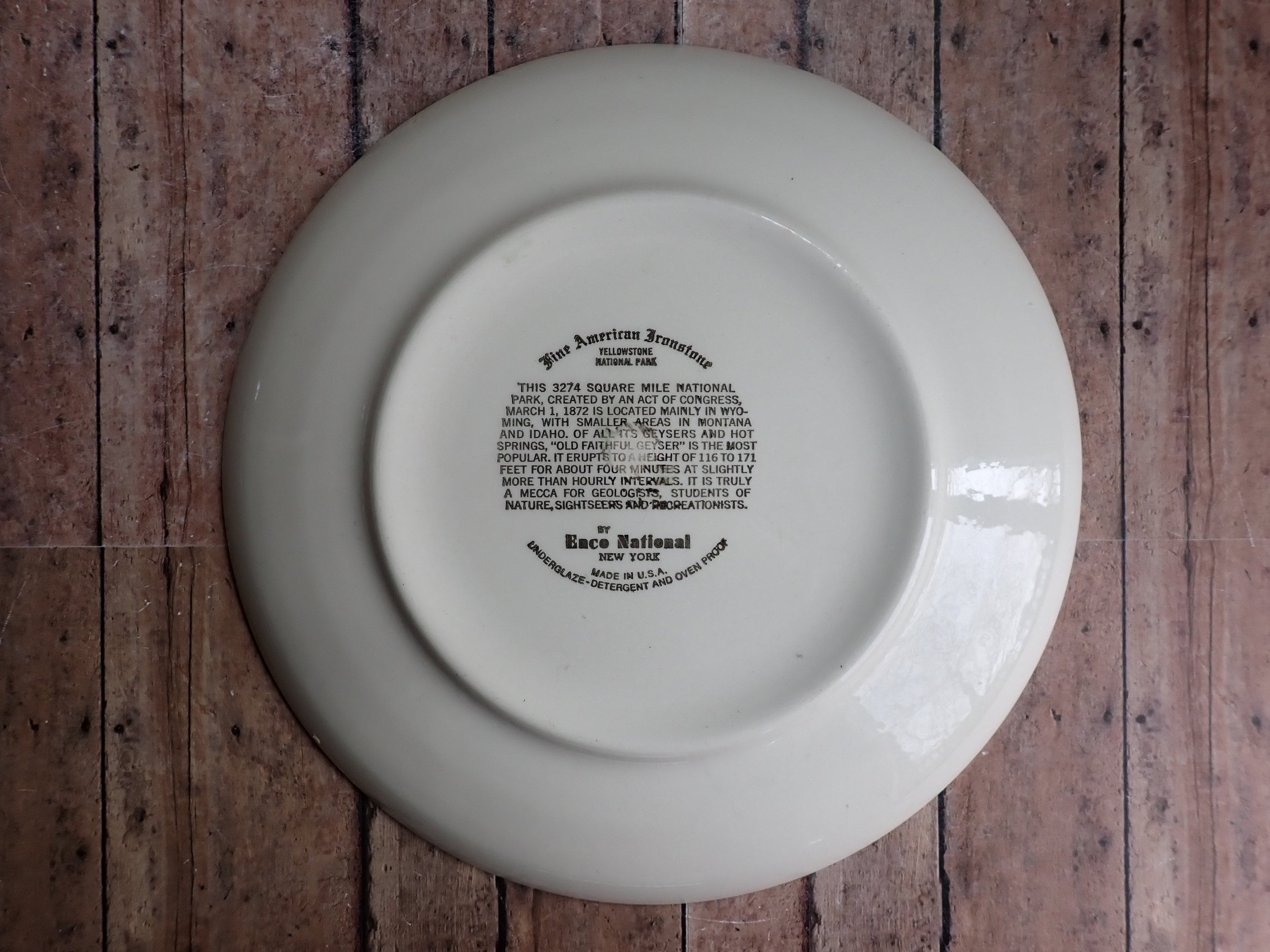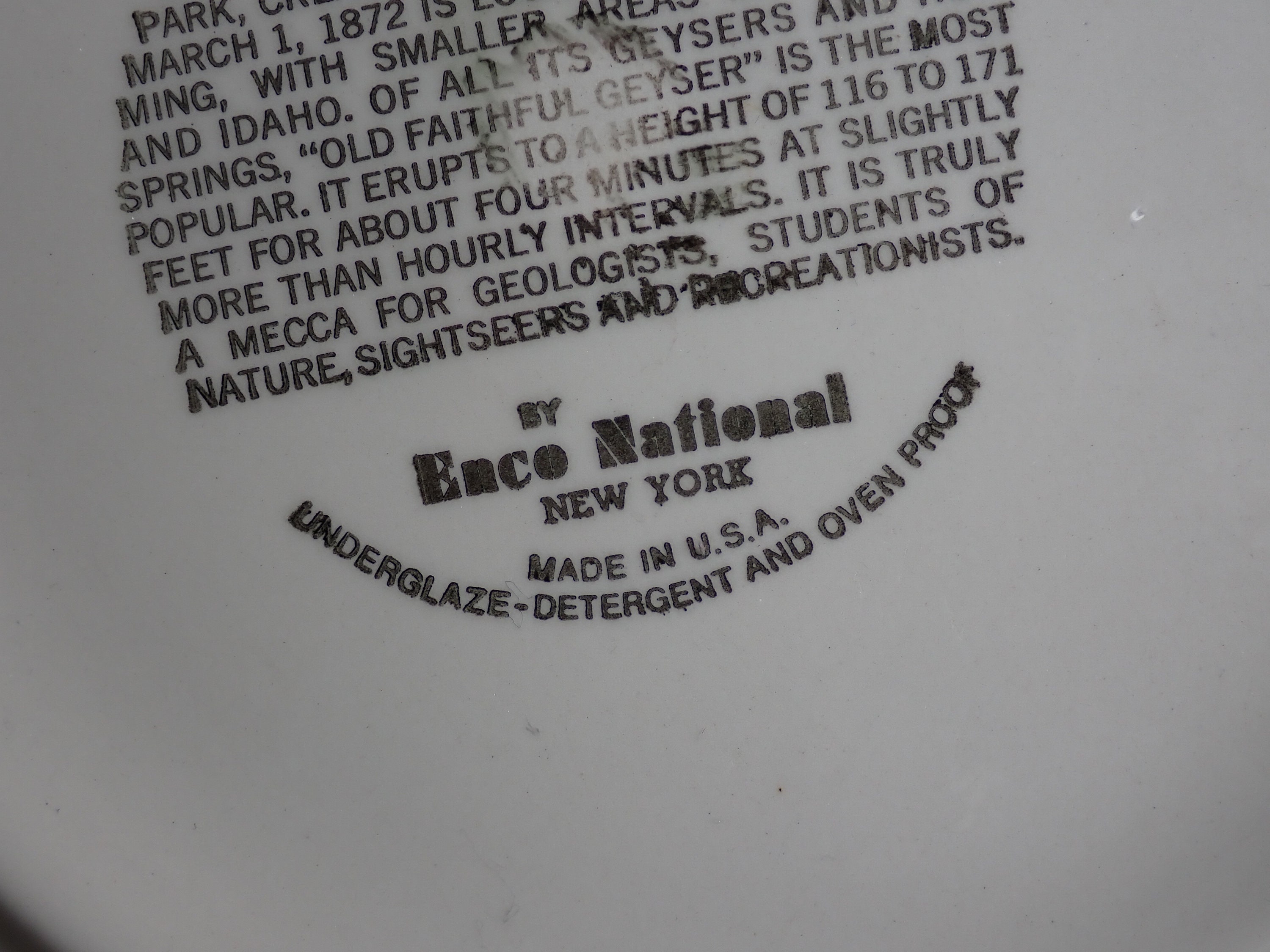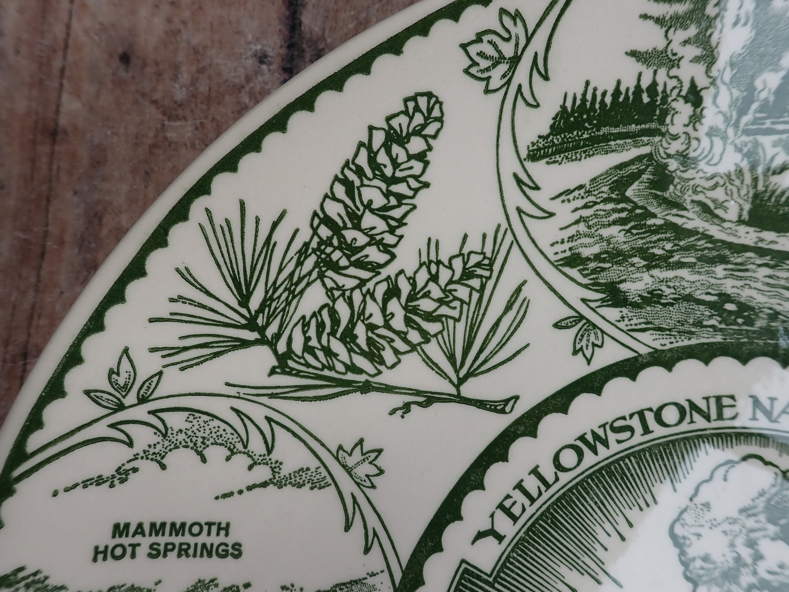 This ceramic Yellowstone National Park souvenir plate is 10" in diameter, and is a white ceramic plate with green designs. The plate has five scenes from Yellowstone on the plate, with Old Faithful in the center, and four other scenes around it, including the Morning Glory Pool, Yellowstone Falls, Yellowstone Lake, and Mammoth Hot Spring. The back of the plate is marked: FINE AMERICAN IRONSTONE / BY ENCO NATIONAL / NEW YORK / MADE IN USA.