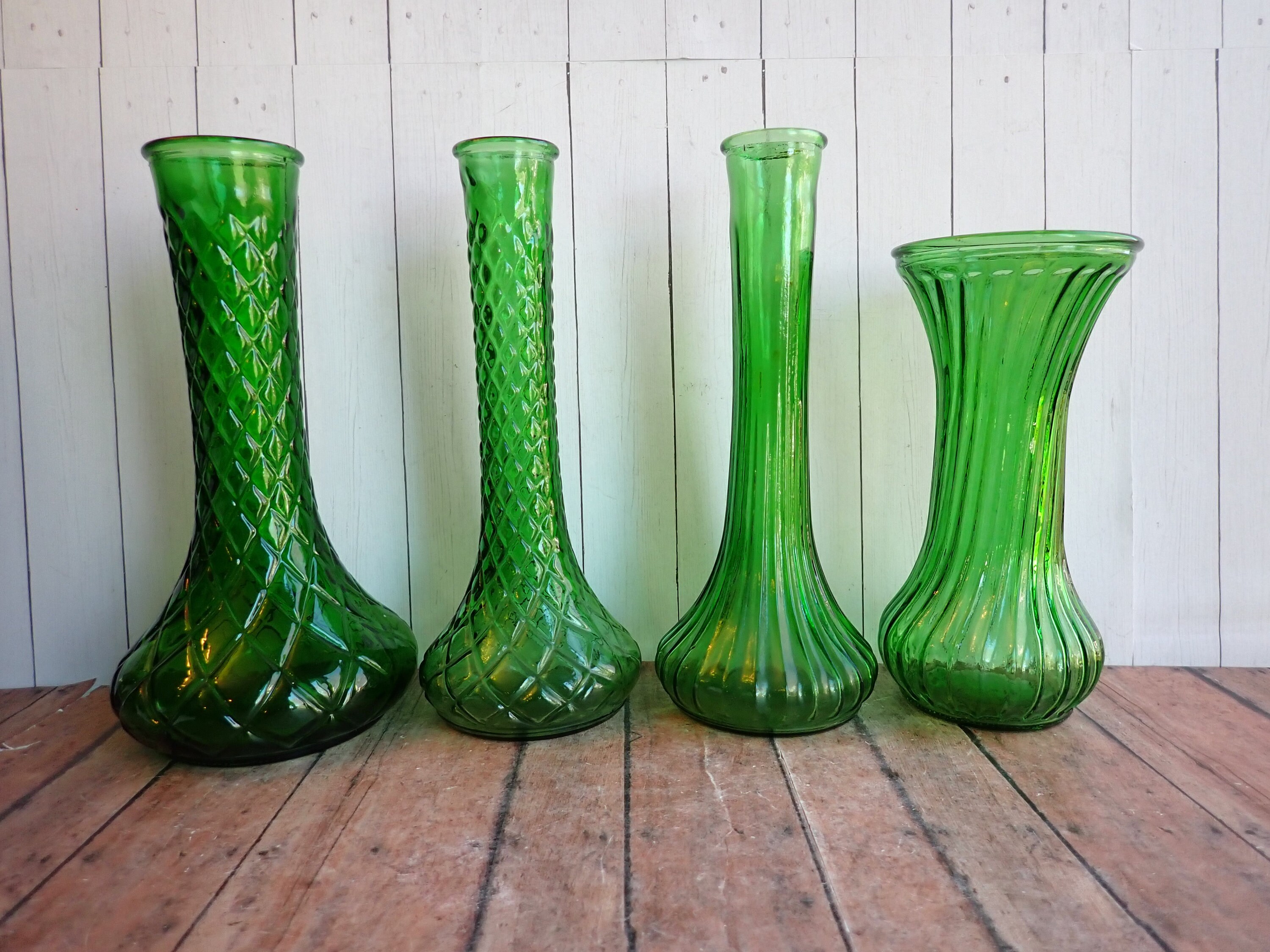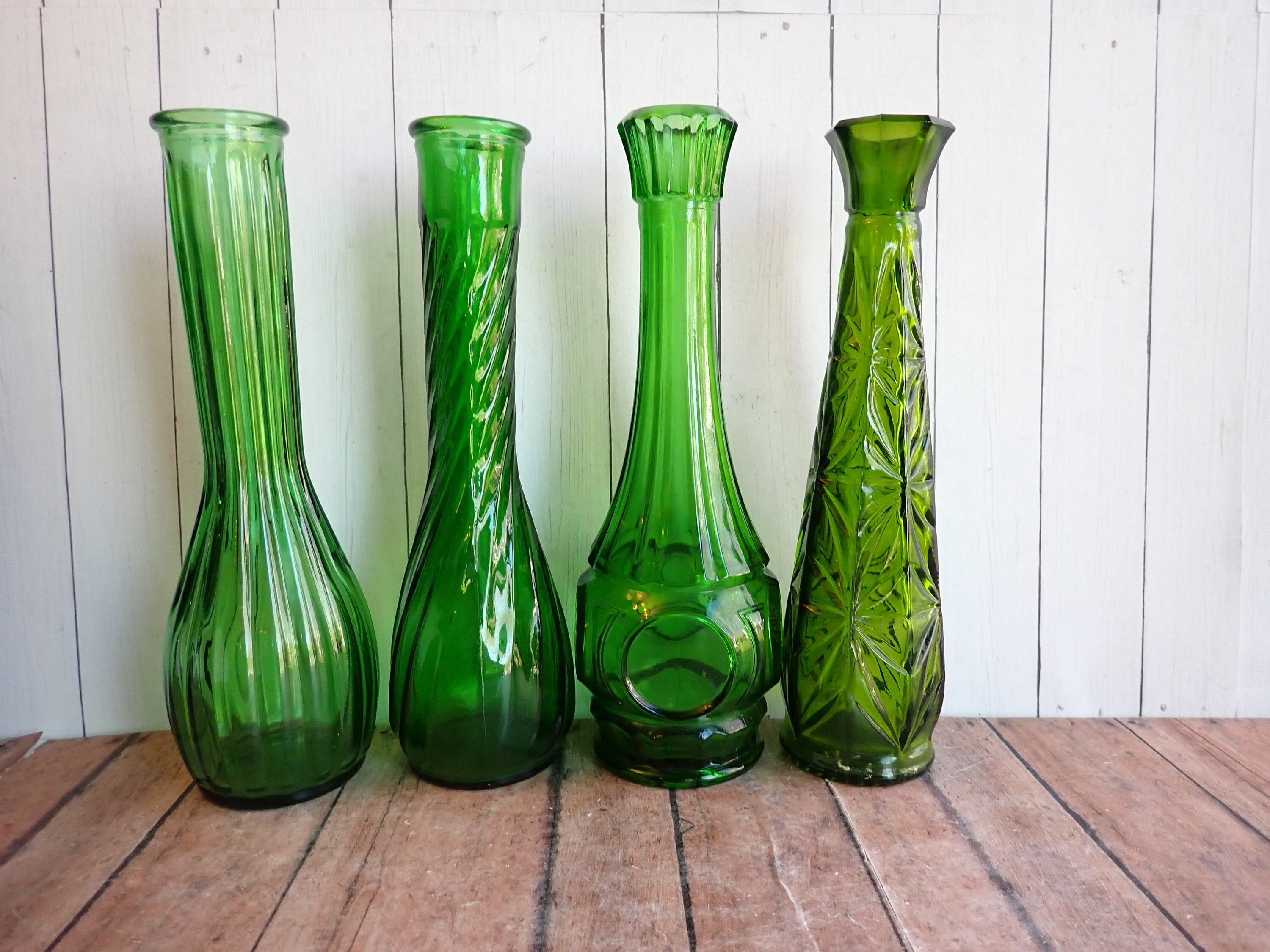 This set of green glass vases includes 8 coordinating vases in different patterns. They range in height from 6" - 9" tall. They all have different patterns and styles, and they coordinate together nicely.