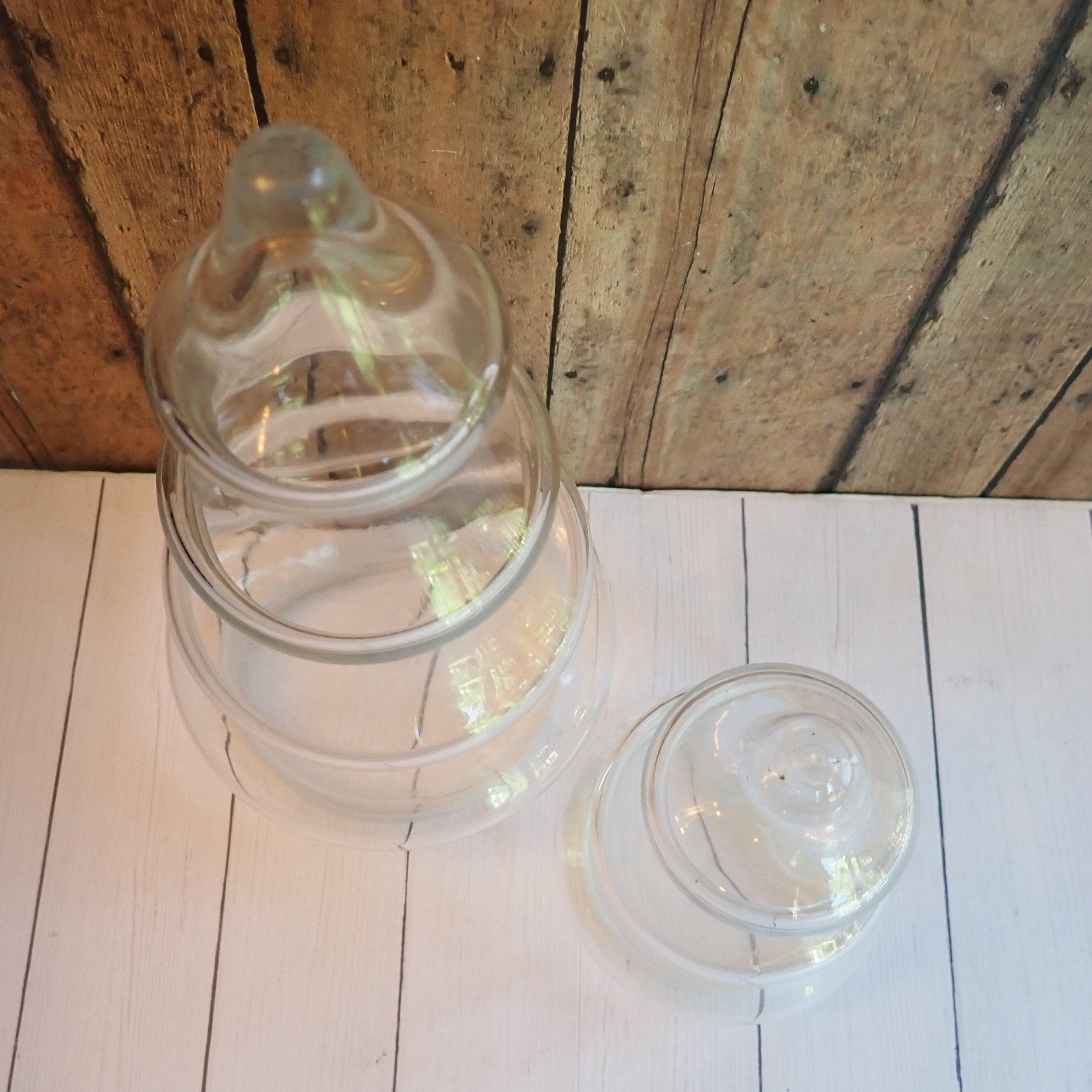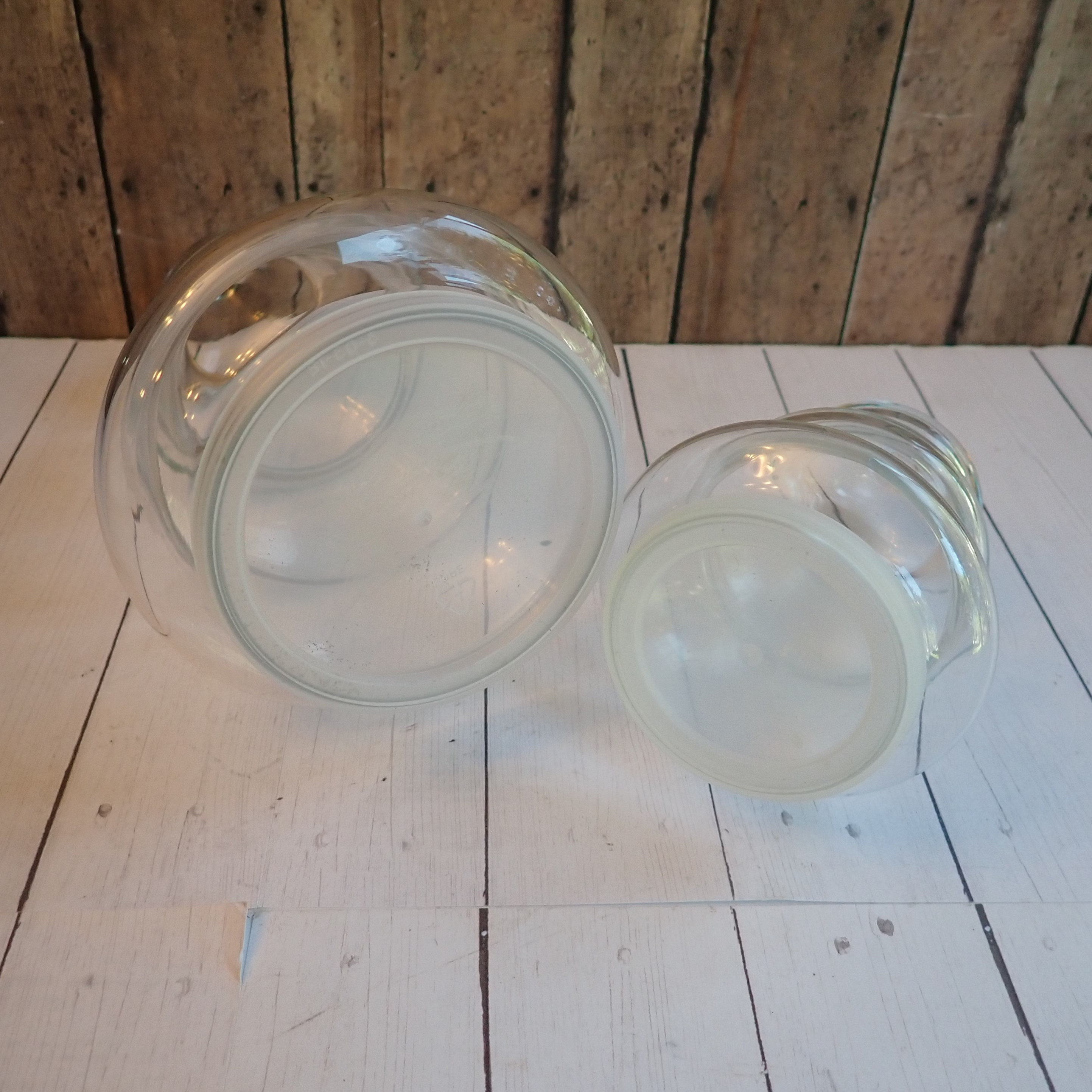 This set of clear glass Christmas tree jars includes 2 jars in different sizes. The jars are 7.25" and 4.5" tall tall. These jars are smaller than some of the other jar sets available - please note the measurements closely - the small jar is quite small! The bottom of each jar has a plastic lid. There are no makers marks on these jars.