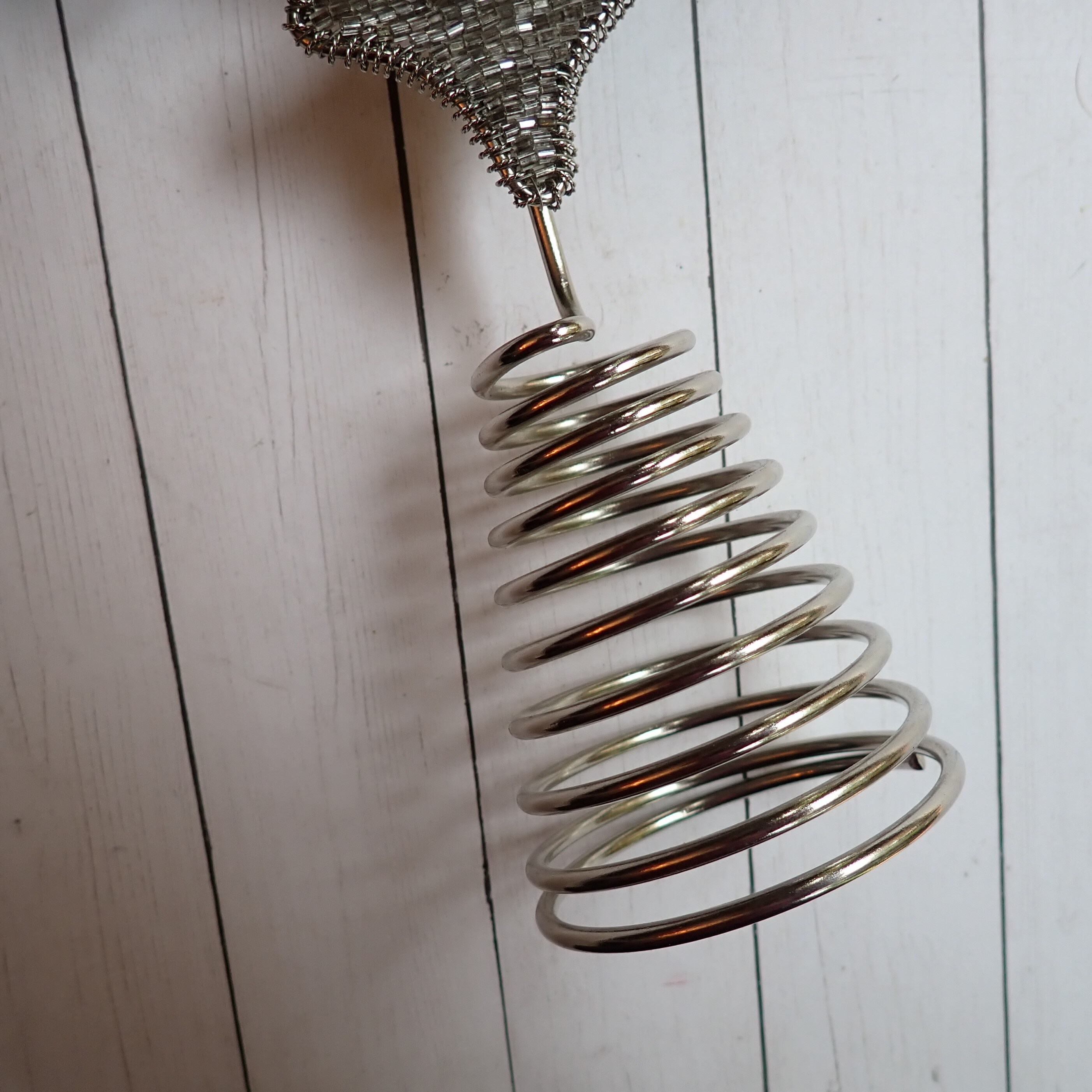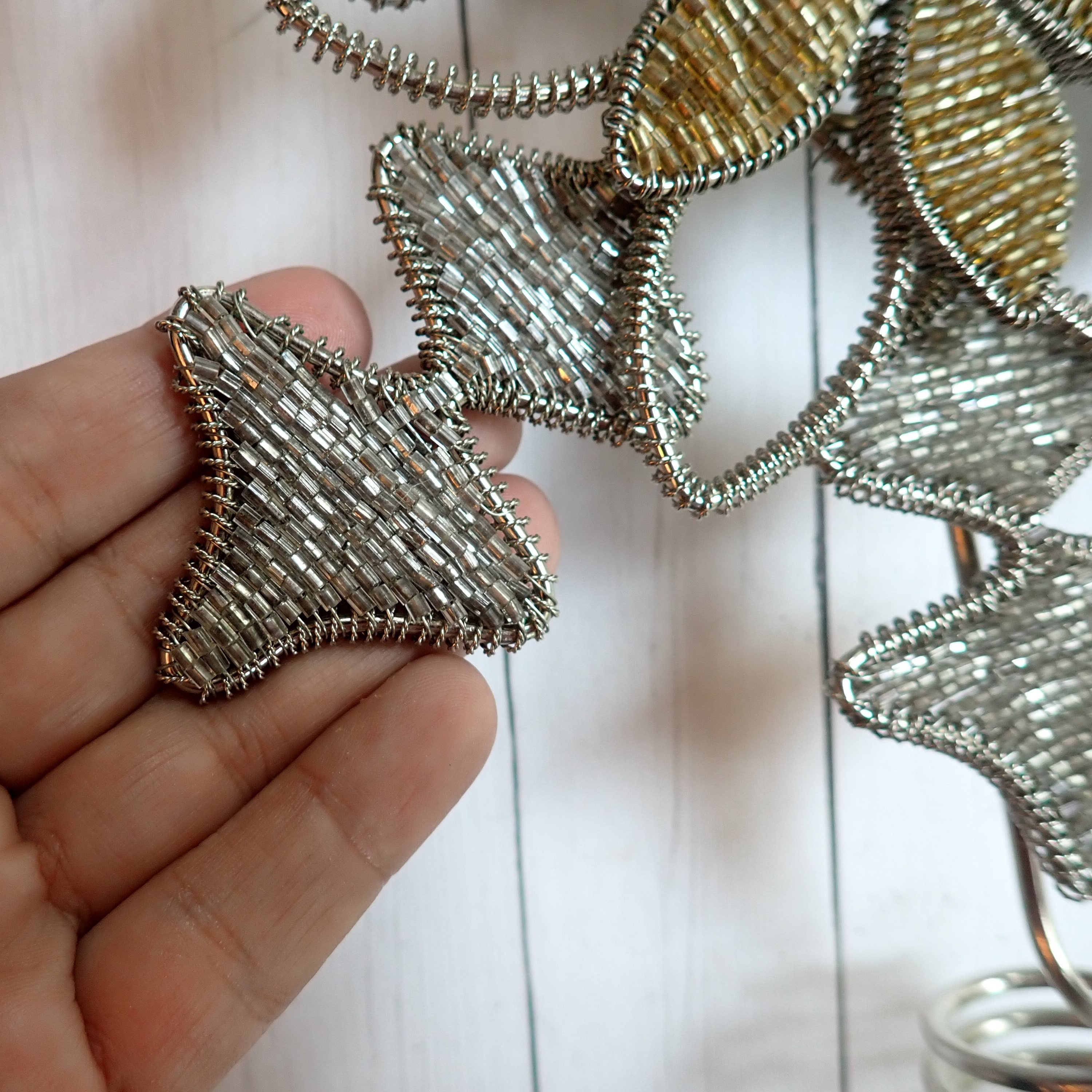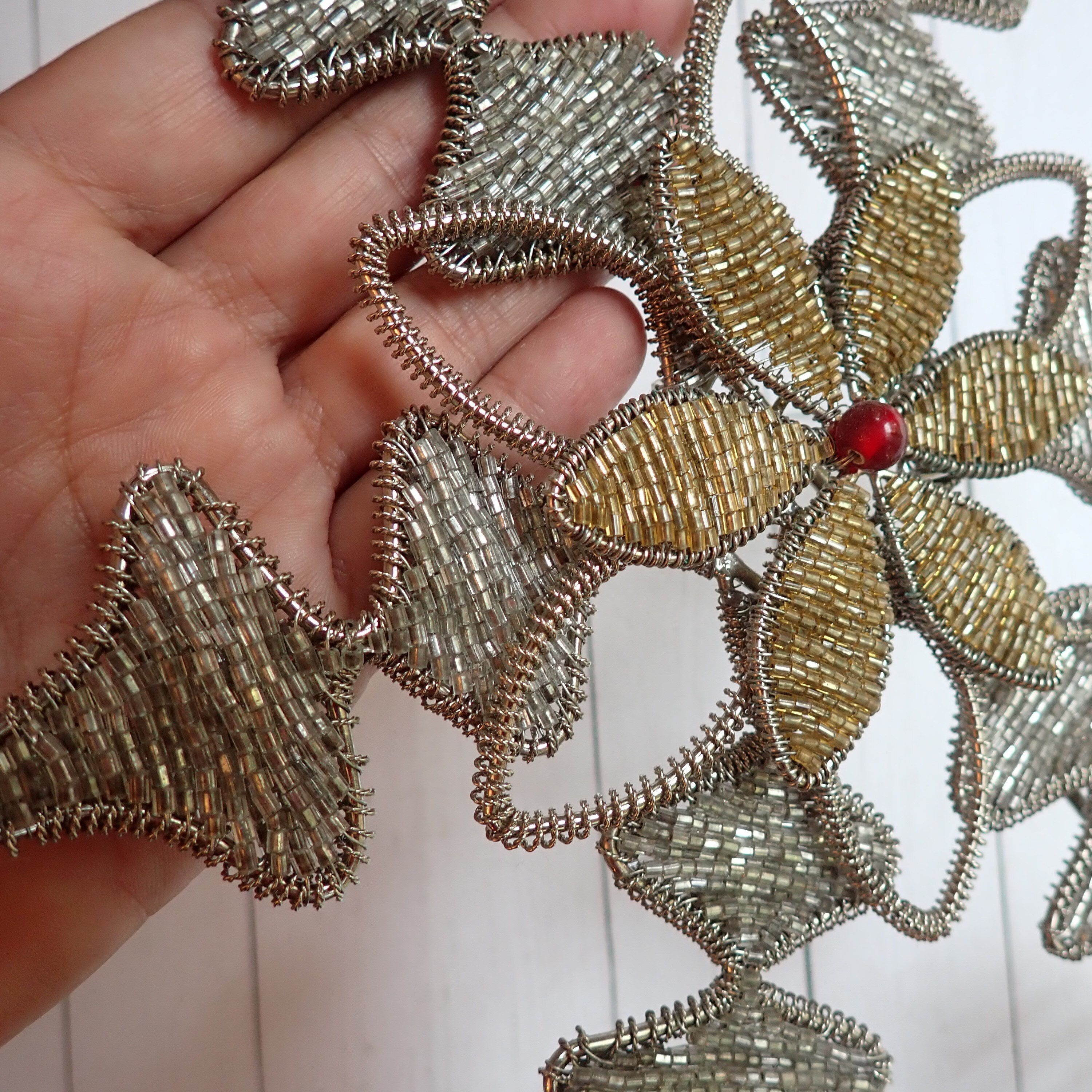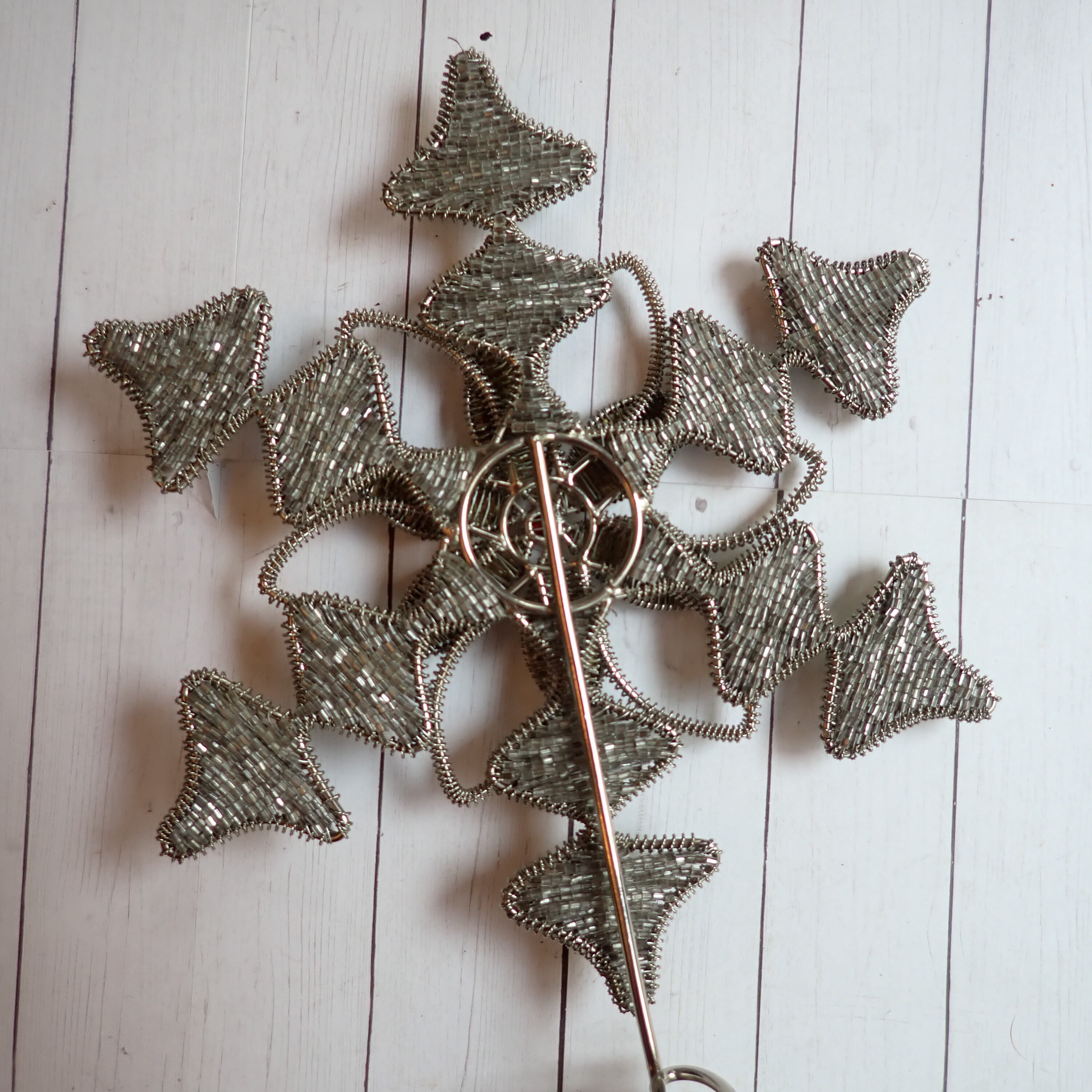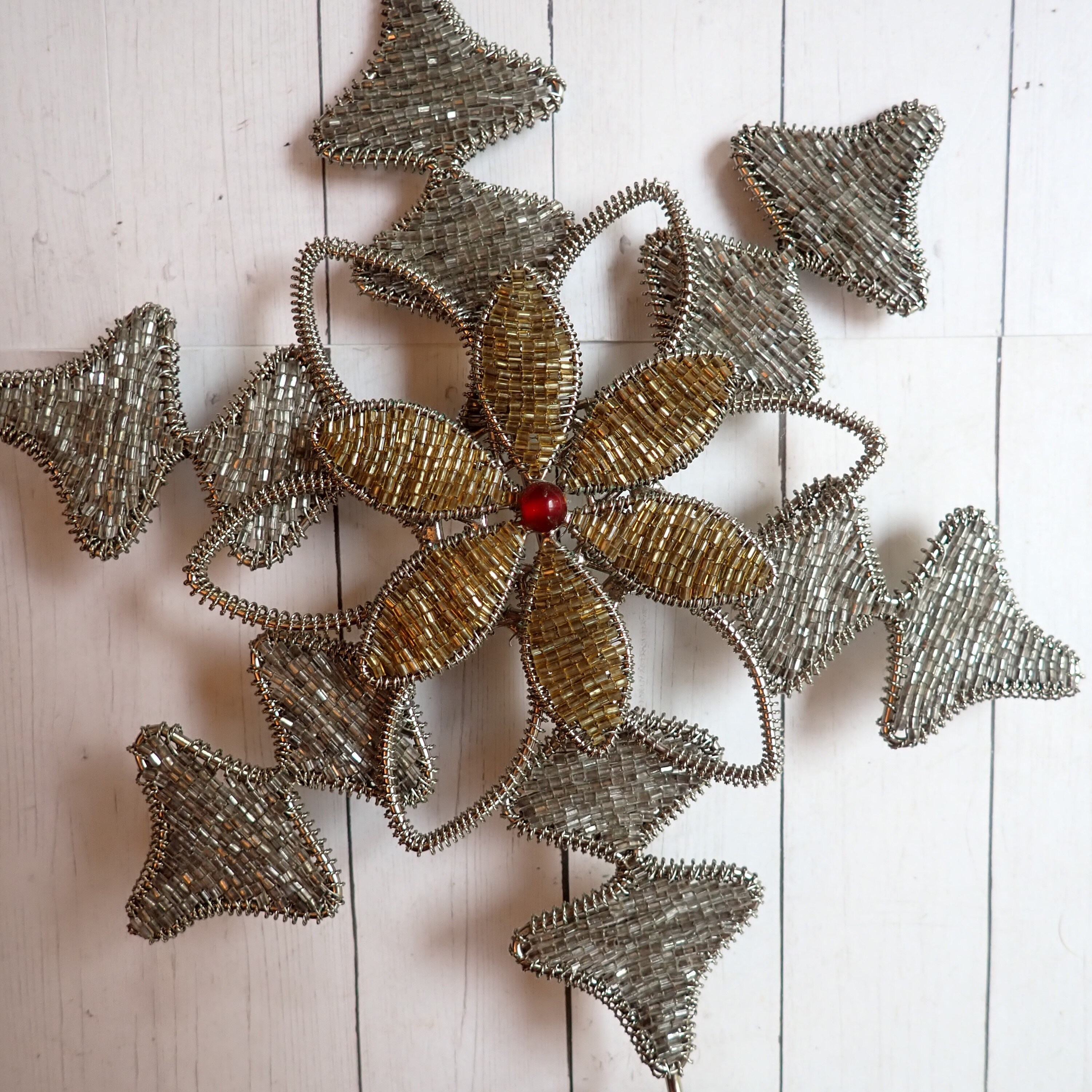 This silver and gold beaded star tree topper is 12" tall and 7.5" wide. It is a silver metal piece with a silver star or snowflake shape and is decorated with silver beads. There is a gold beaded flower design in the center, accented with one larger red bead in the center. The base is 2.5" in diameter to fit over the top branch of a tree.