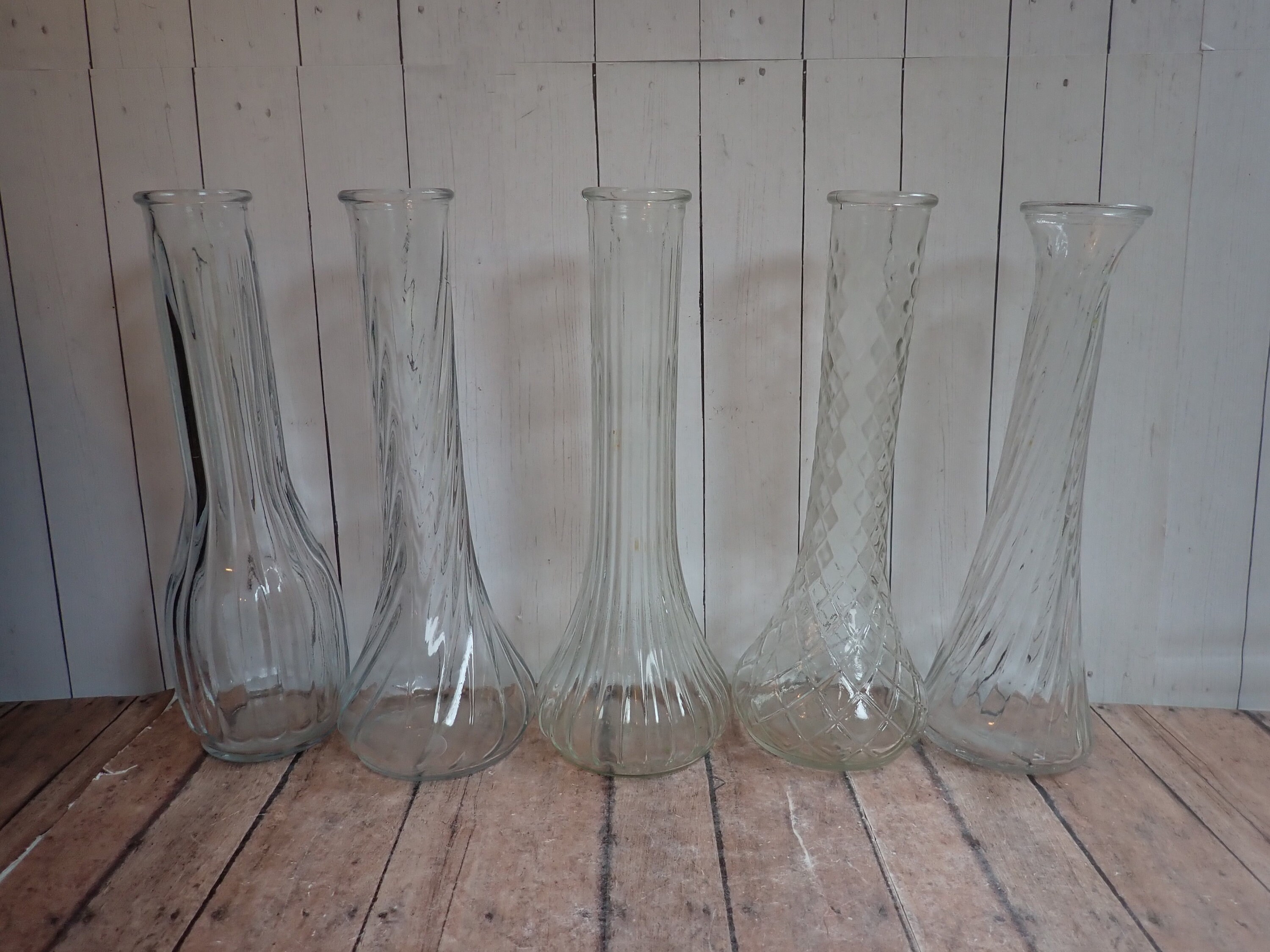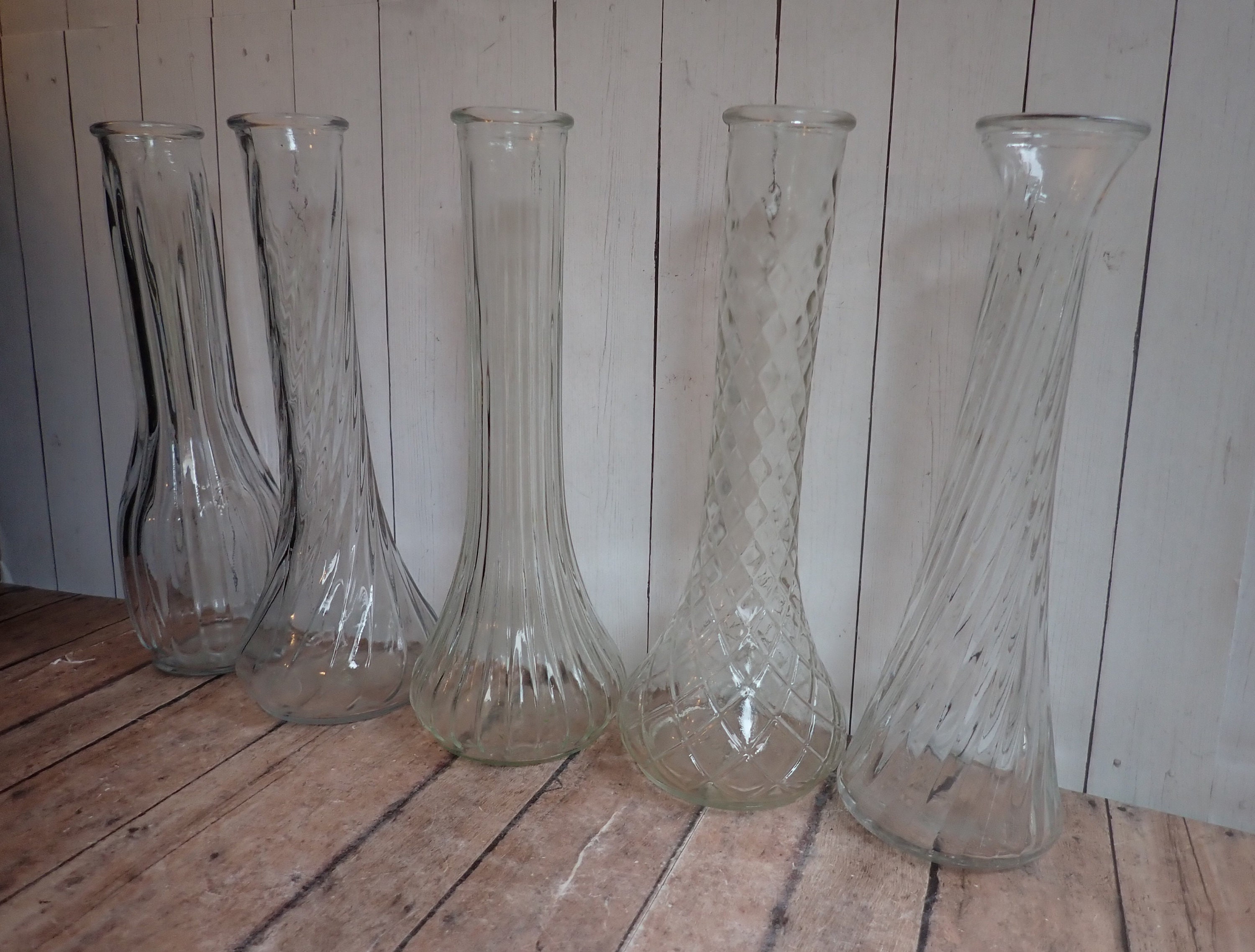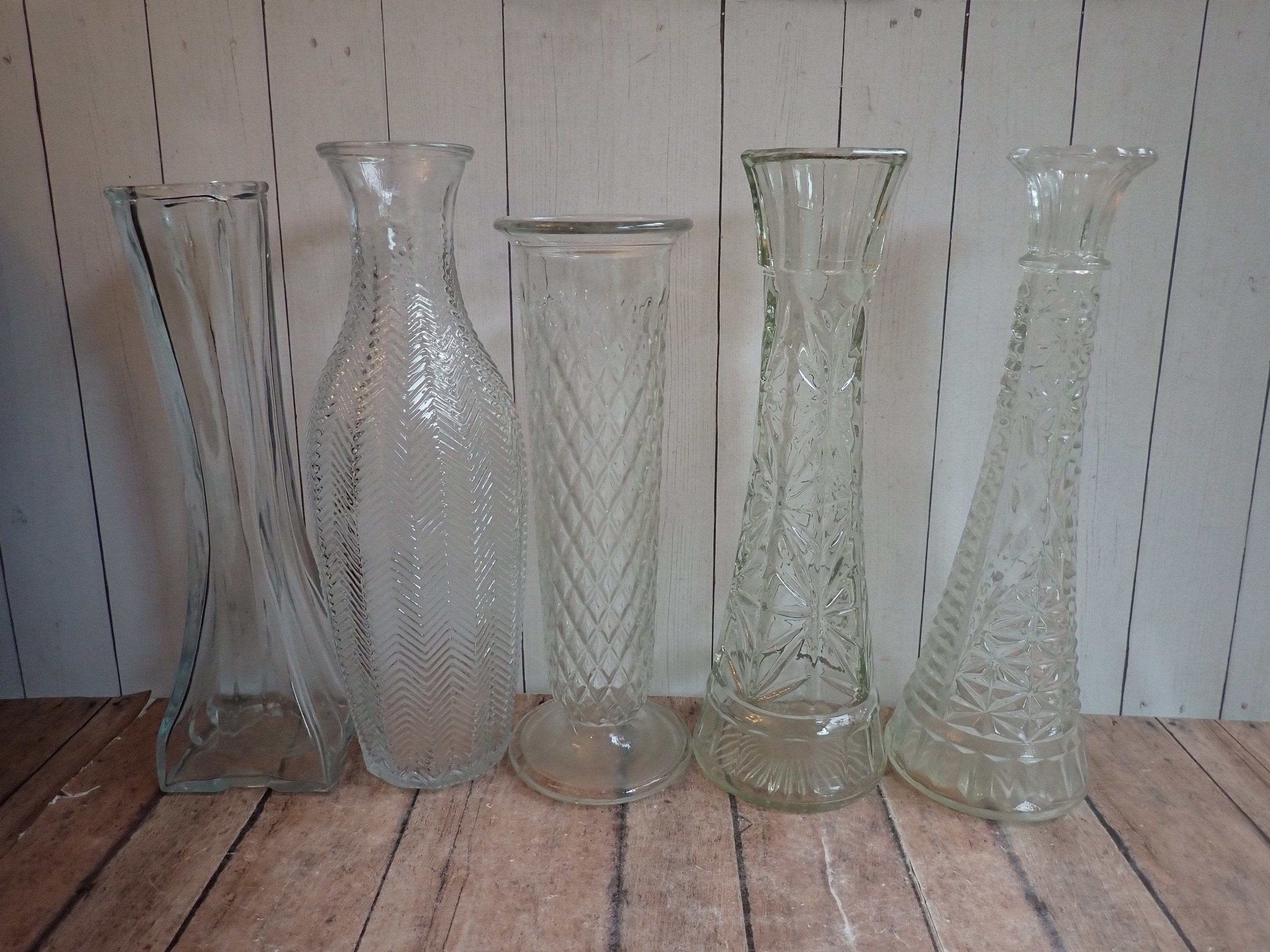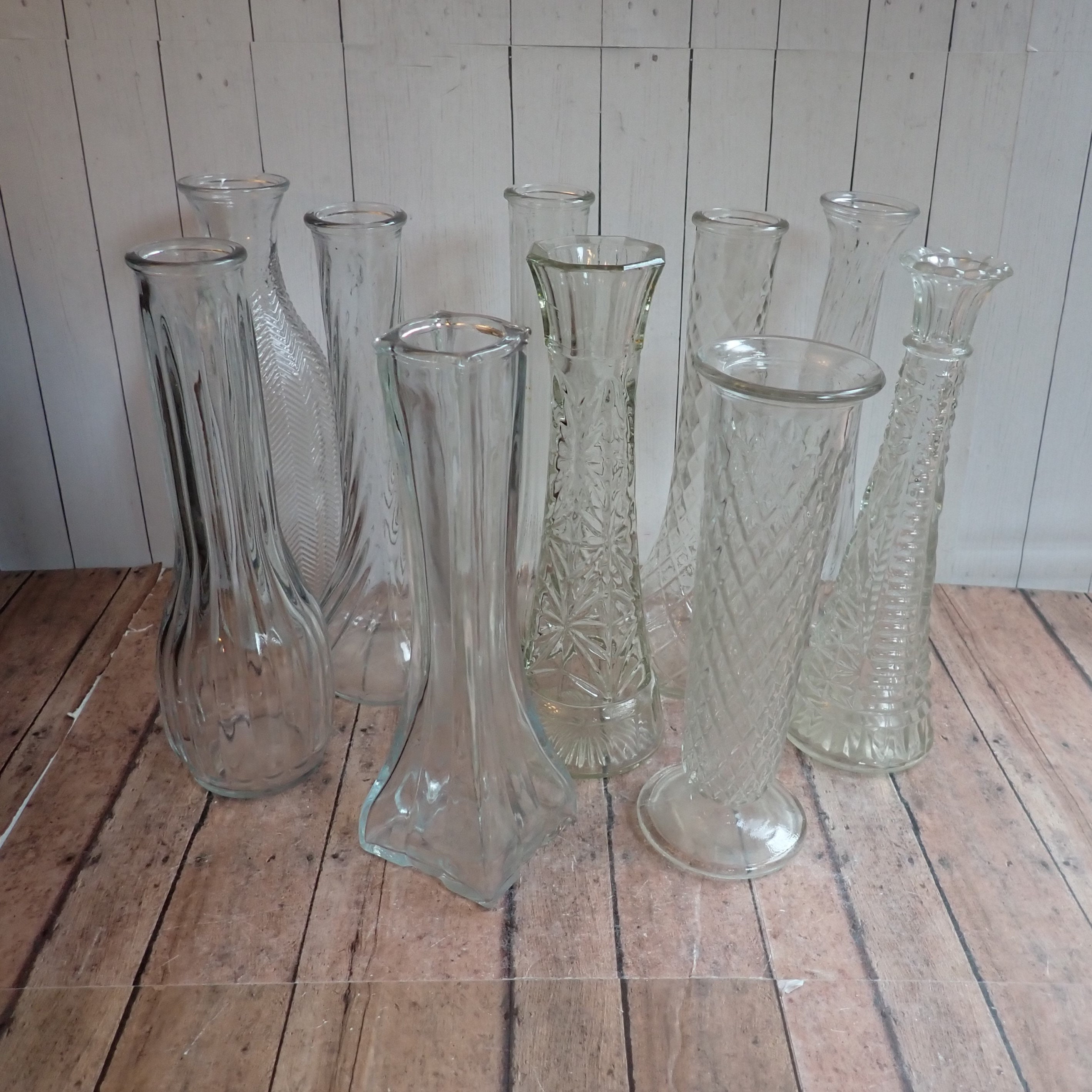 This set of clear glass vases includes 10 clear glass vases in different patterns and shapes. They range in height from 8.5" to 9.5" tall, and 2" to 4" in diameter. They are all clear glass vases with different floral, geometric, ribbed, and diamond designs.