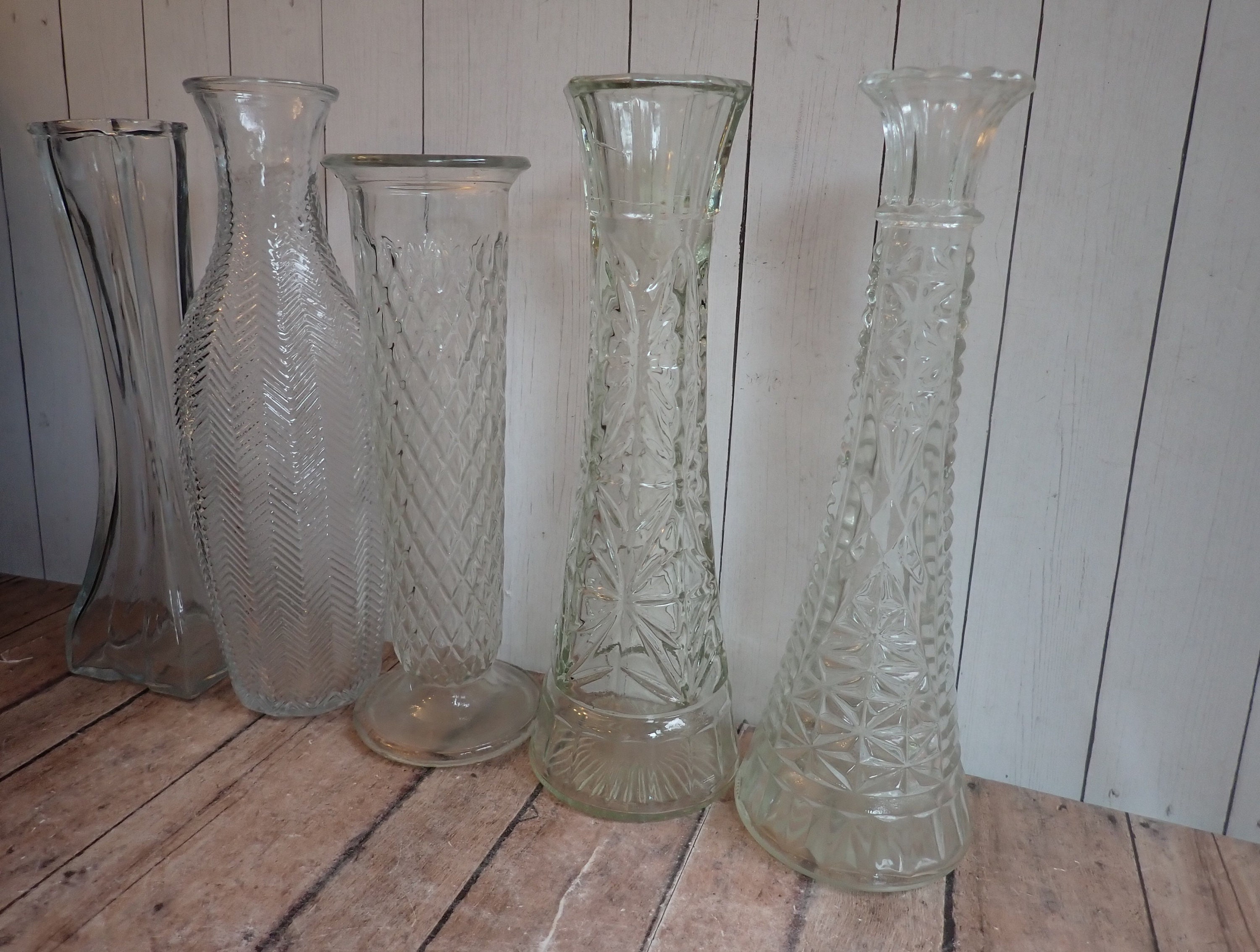 Vintage Clear Glass Vase Set of 10 Tall 9" Vases All Different Patterns Wedding Vases