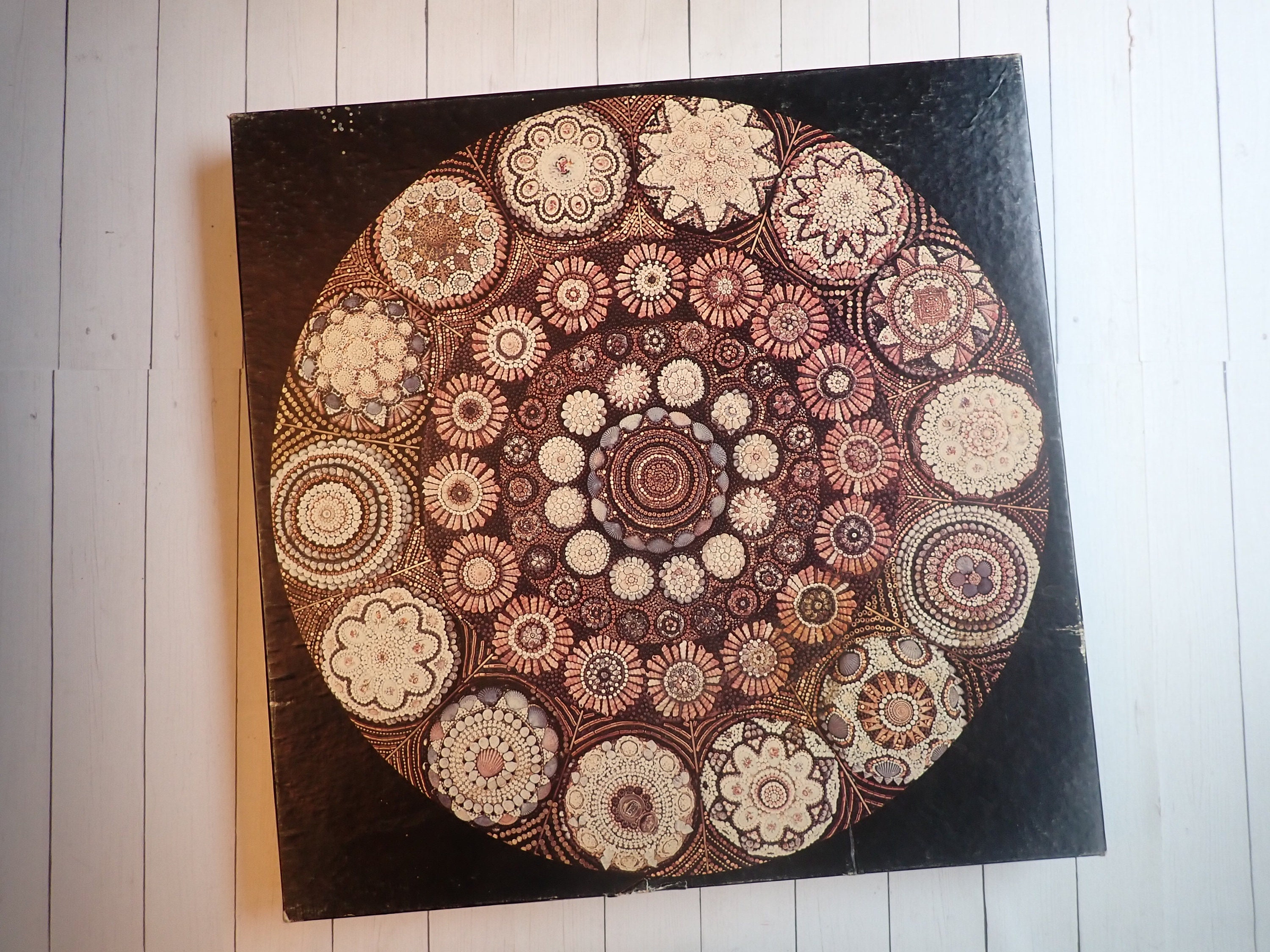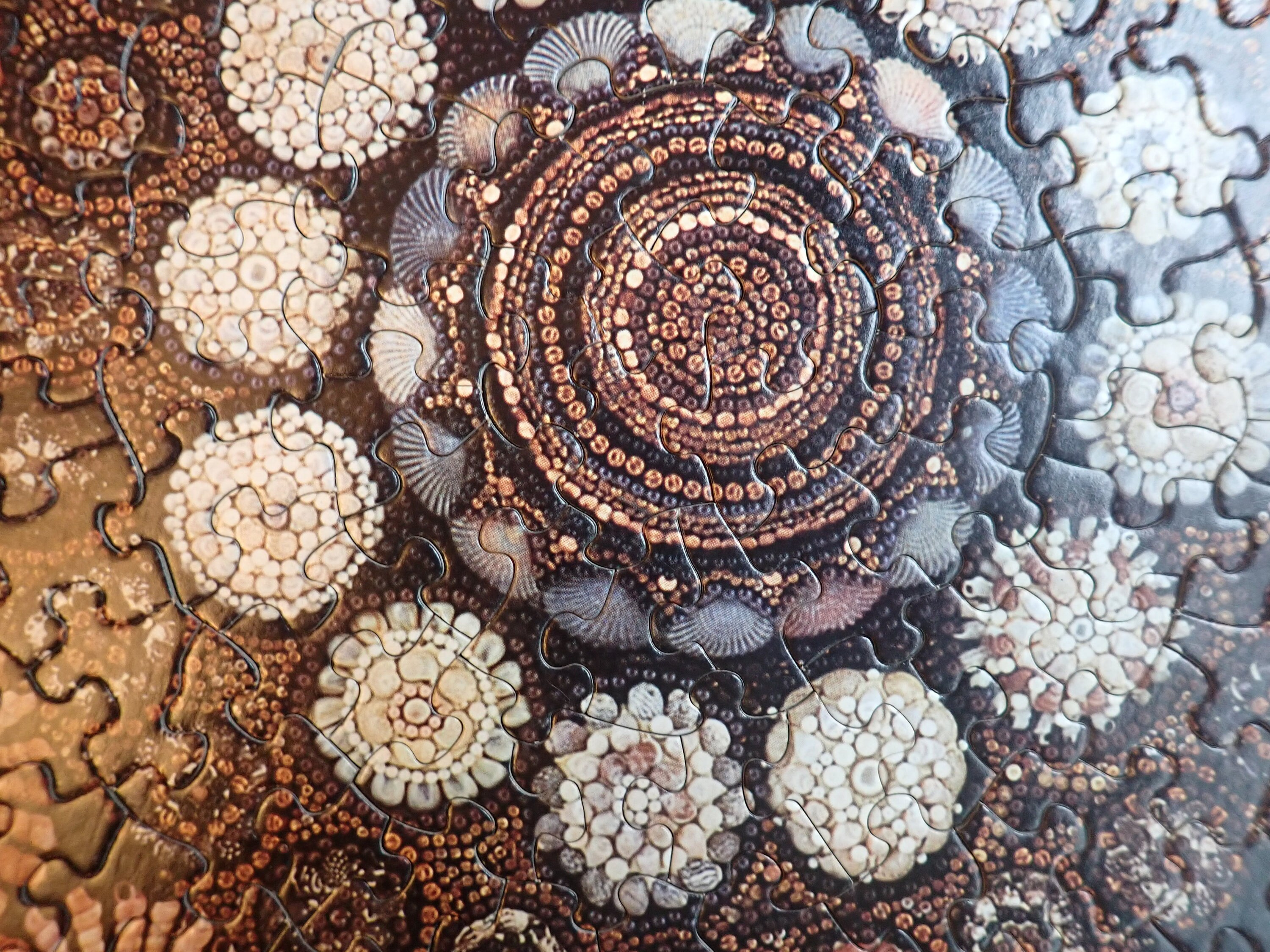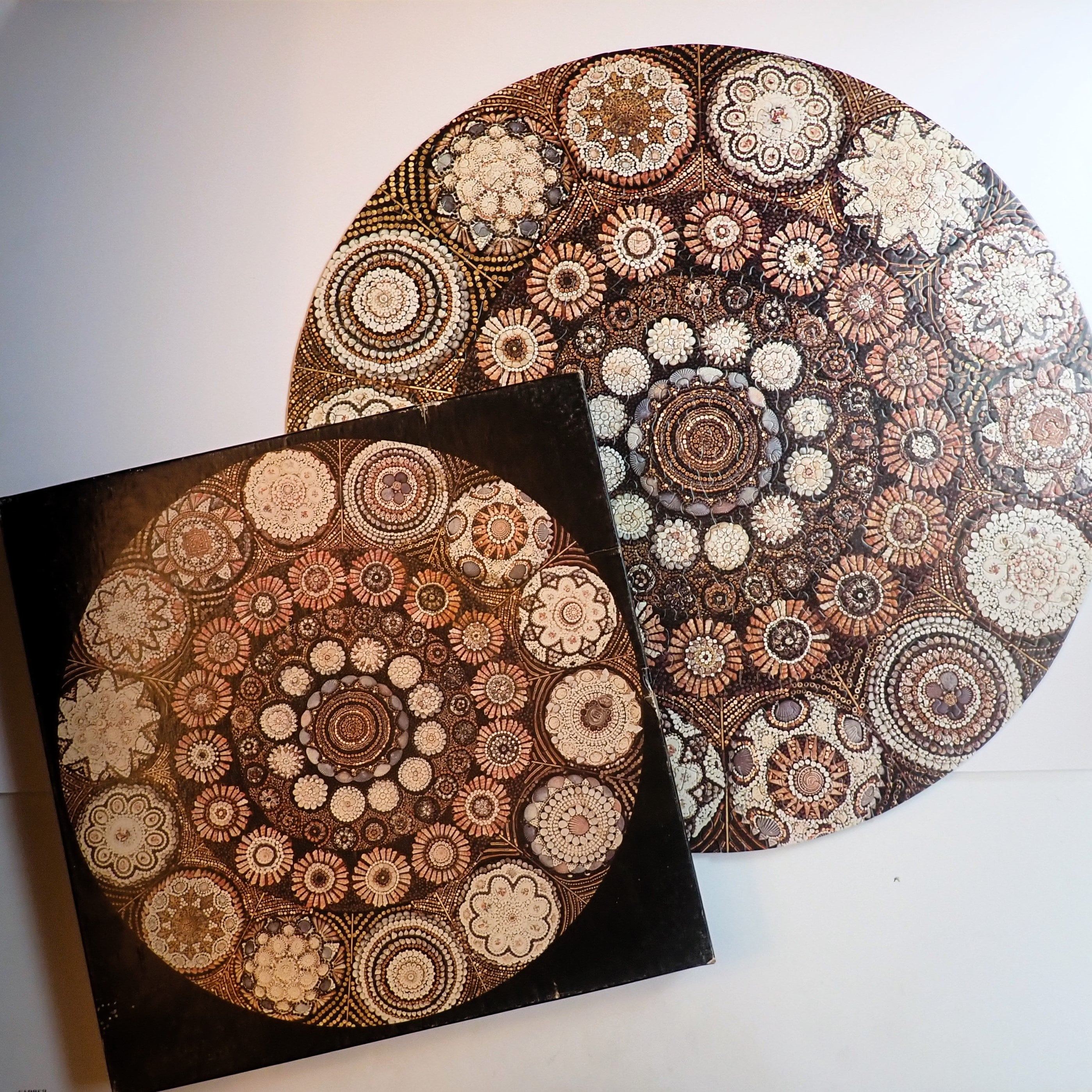 This Springbok/Hallmark jigsaw puzzle is titled Sea Shell Symmetry and is a 500 piece round puzzle and includes the original box. The puzzle features a mosaic style scene made out of seashells. The finished puzzle measures 20" in diameter.