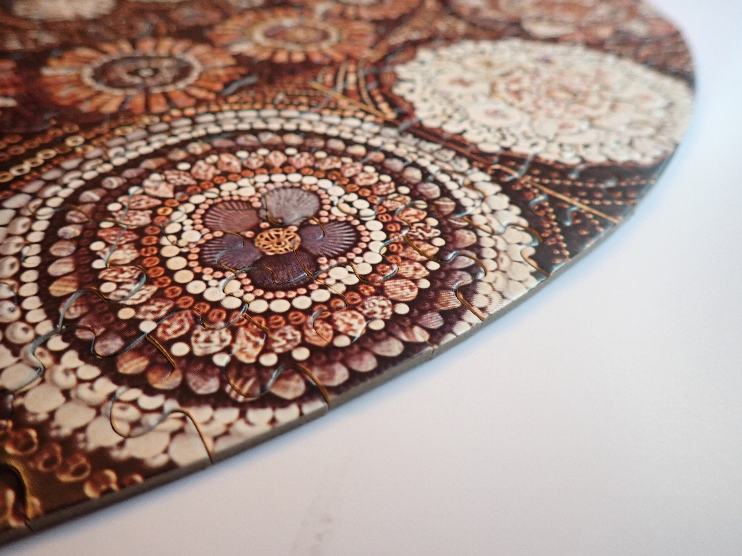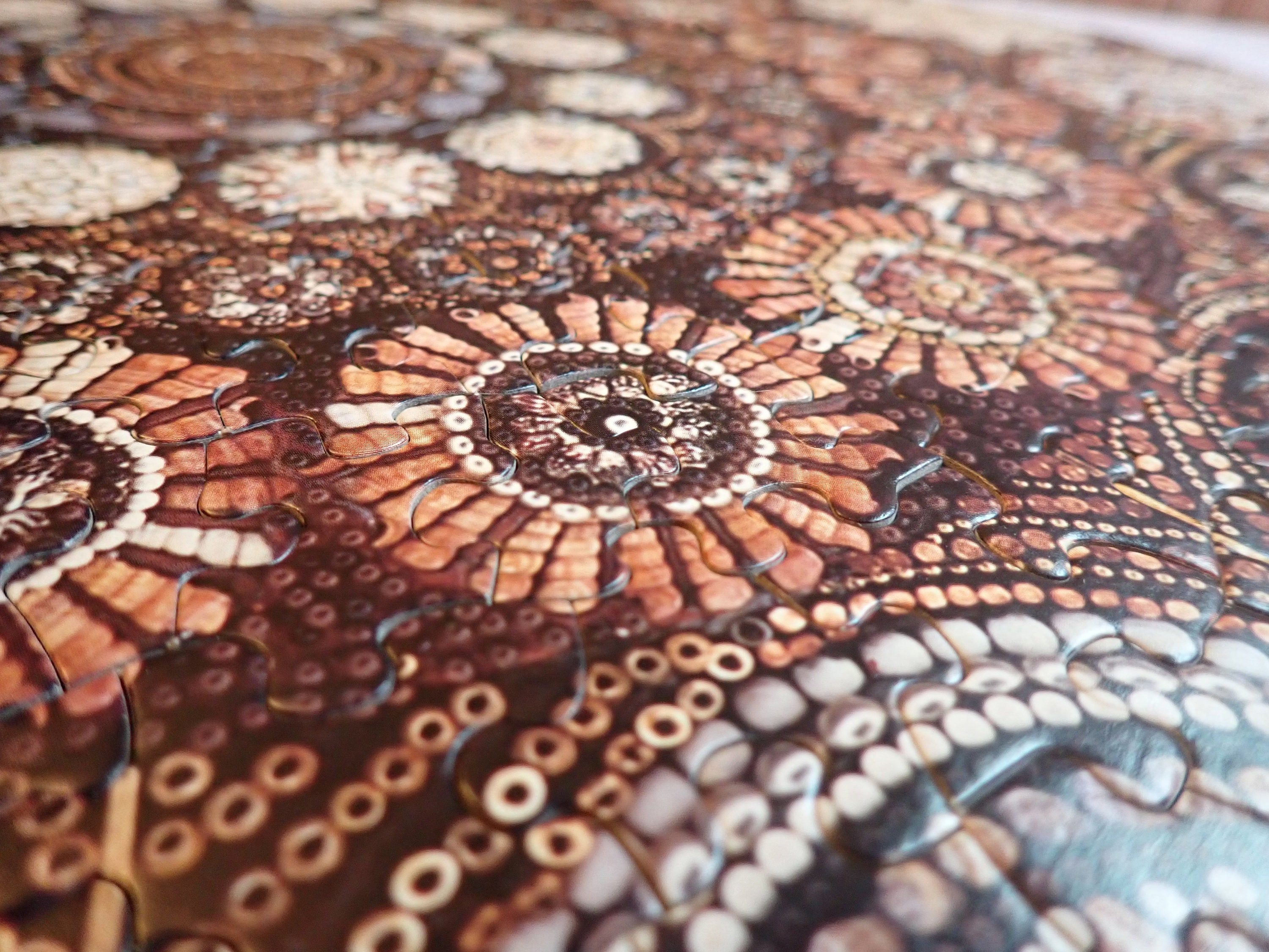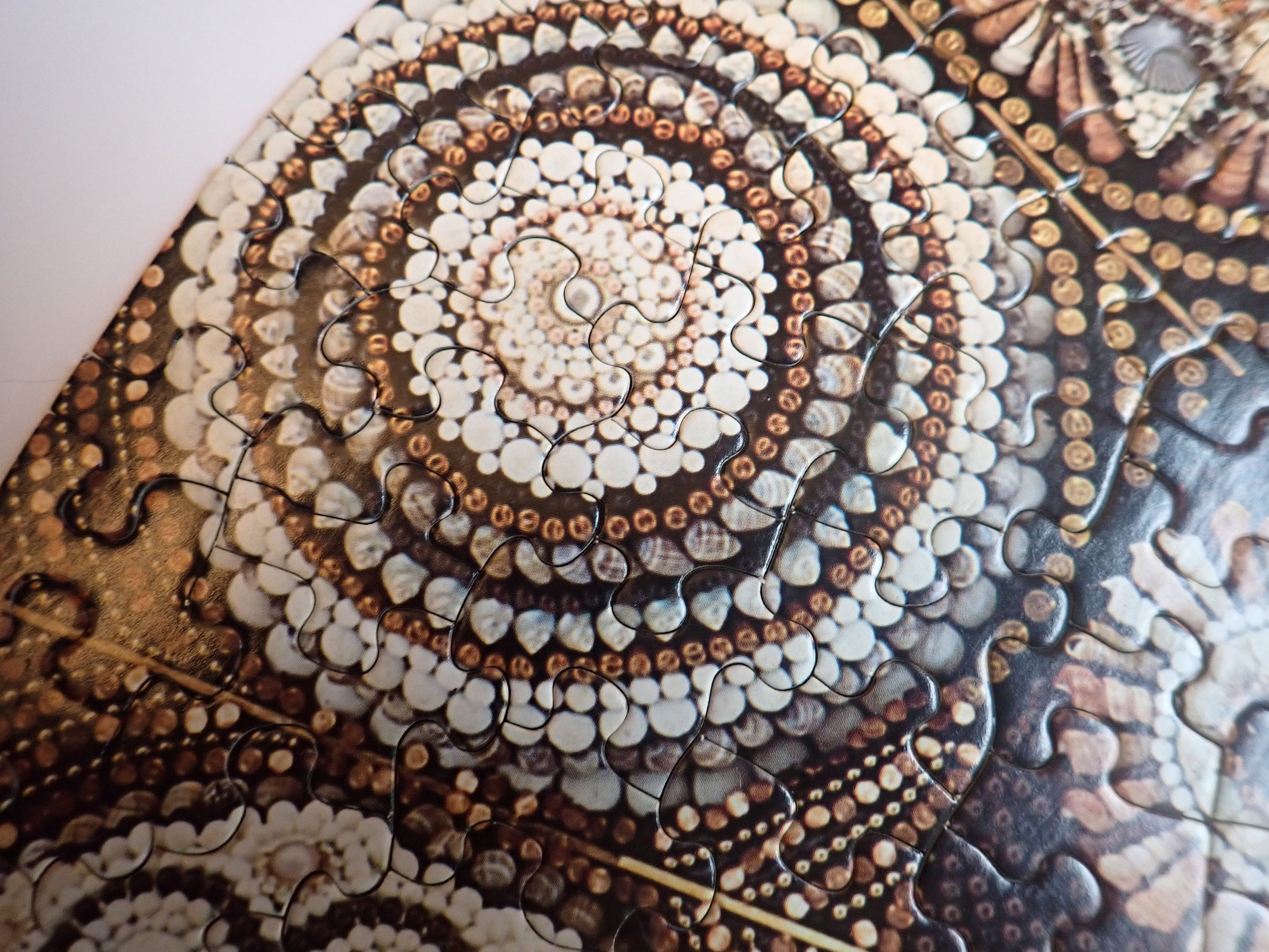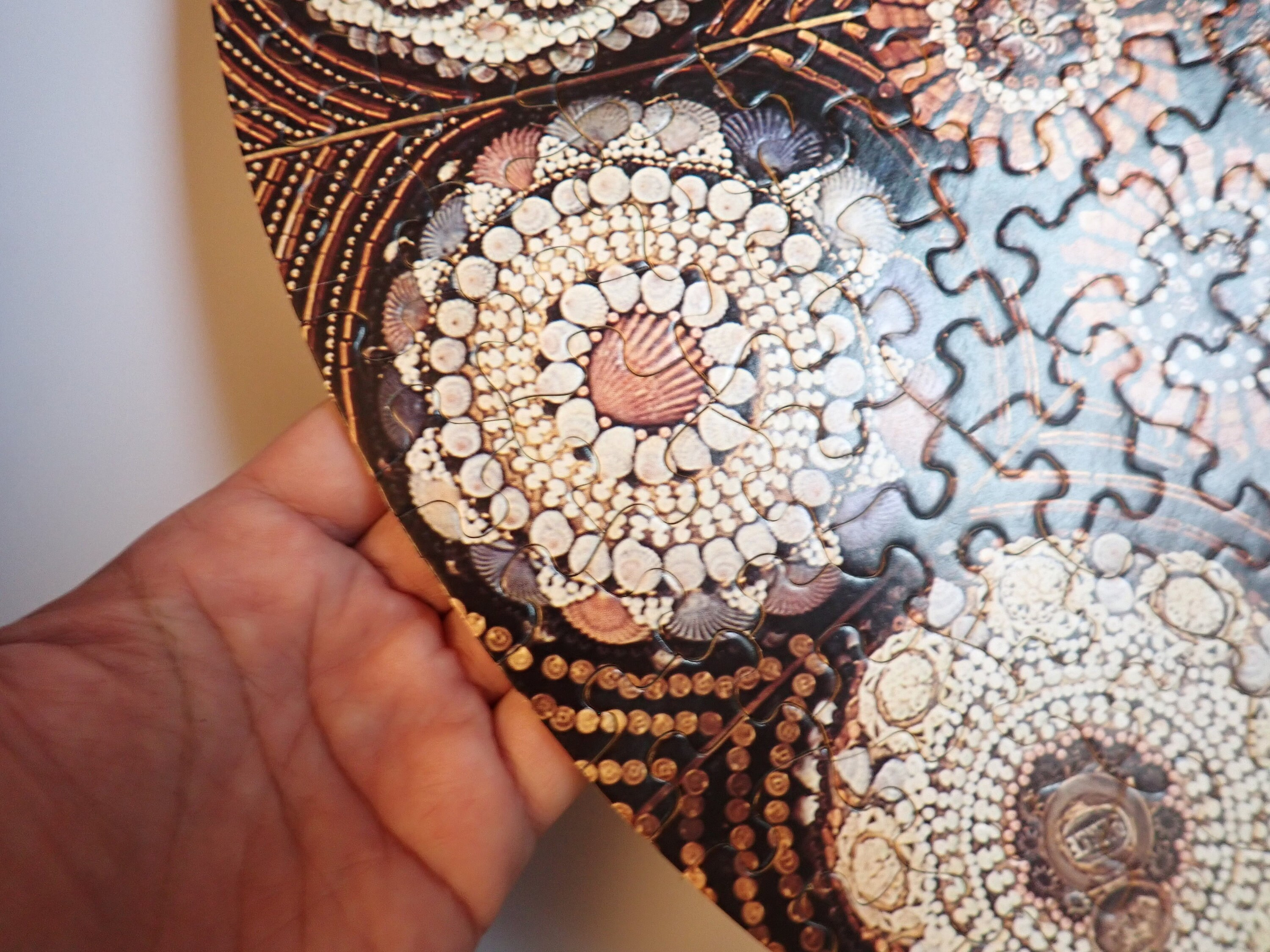 This Springbok/Hallmark jigsaw puzzle is titled Sea Shell Symmetry and is a 500 piece round puzzle and includes the original box. The puzzle features a mosaic style scene made out of seashells. The finished puzzle measures 20" in diameter.