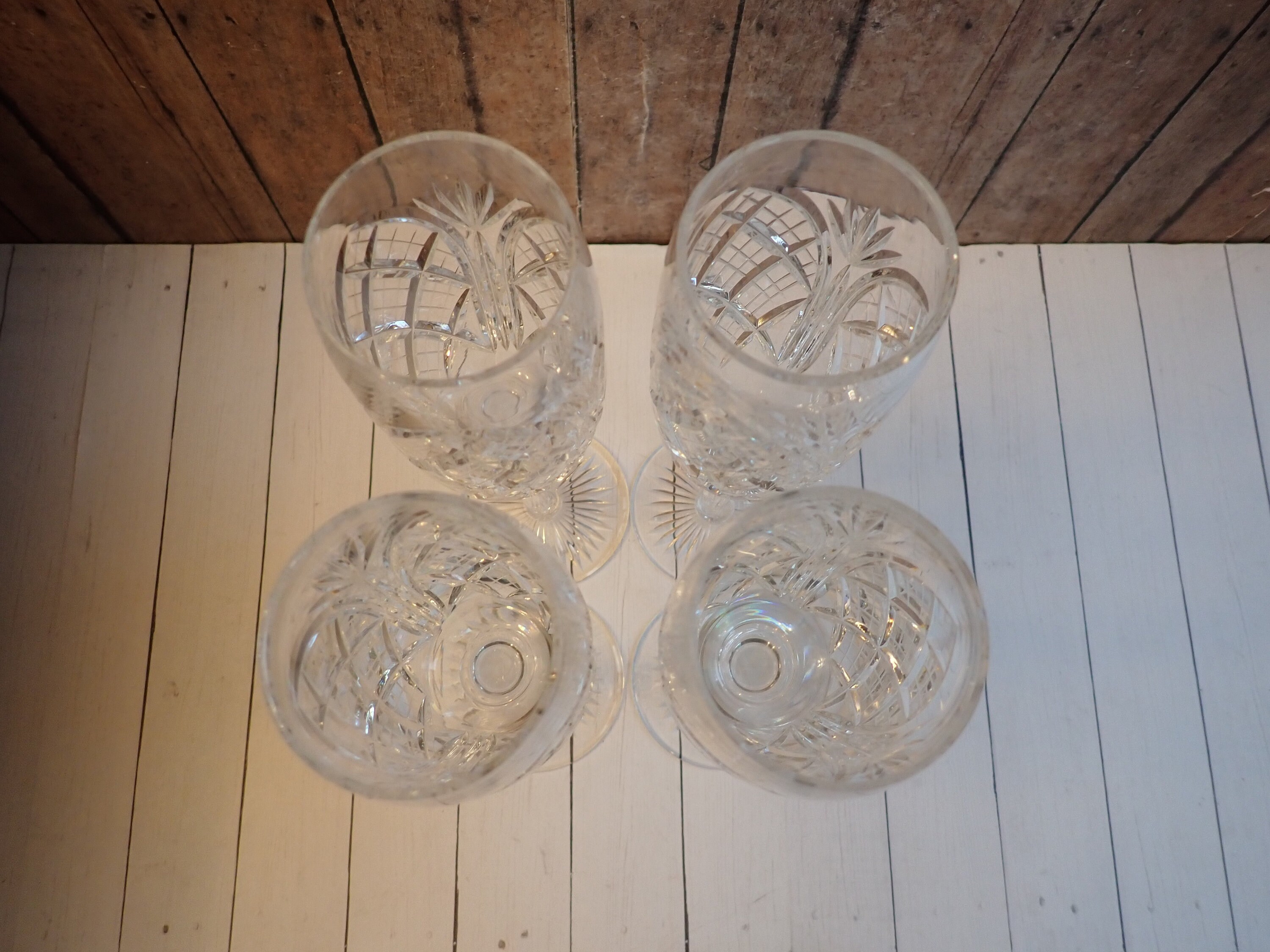 This set of glasses by Heritage Crystal includes 4 fluted champagne glasses in the Cathedral Suite pattern. The glasses are 9.5" tall and 2.25" in diameter at the rim. They are a clear crystal with an intricate crisscross and fan design around the glass. The glasses have 4" long stems made of a thick, flat-paneled glass, and a round base. They are marked HERITAGE on all 4 glasses.