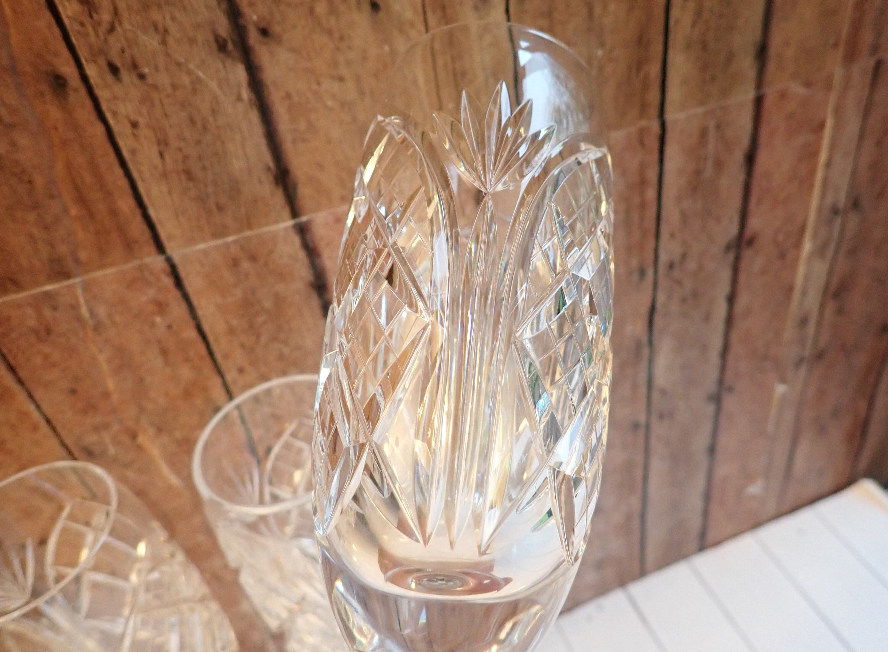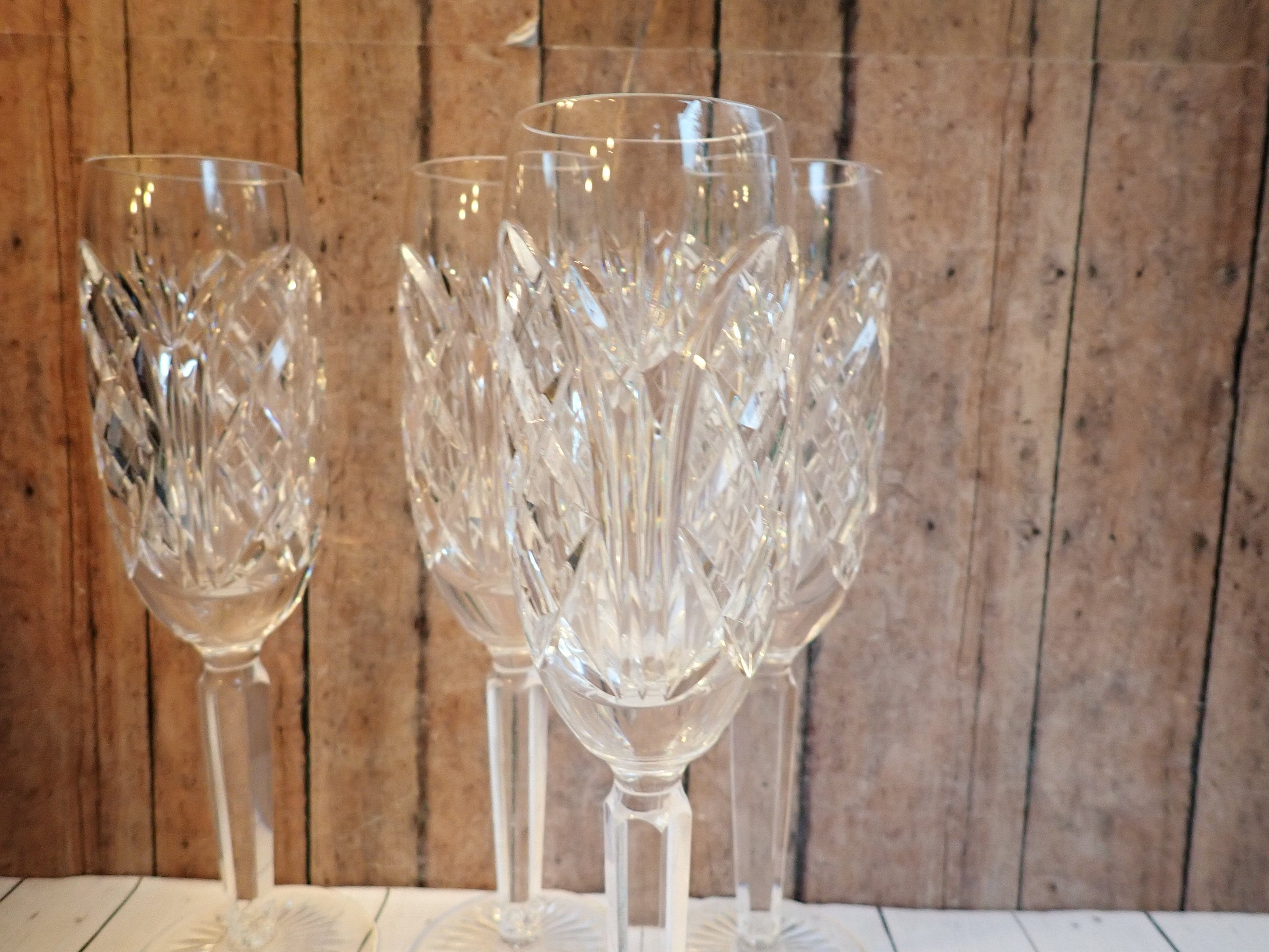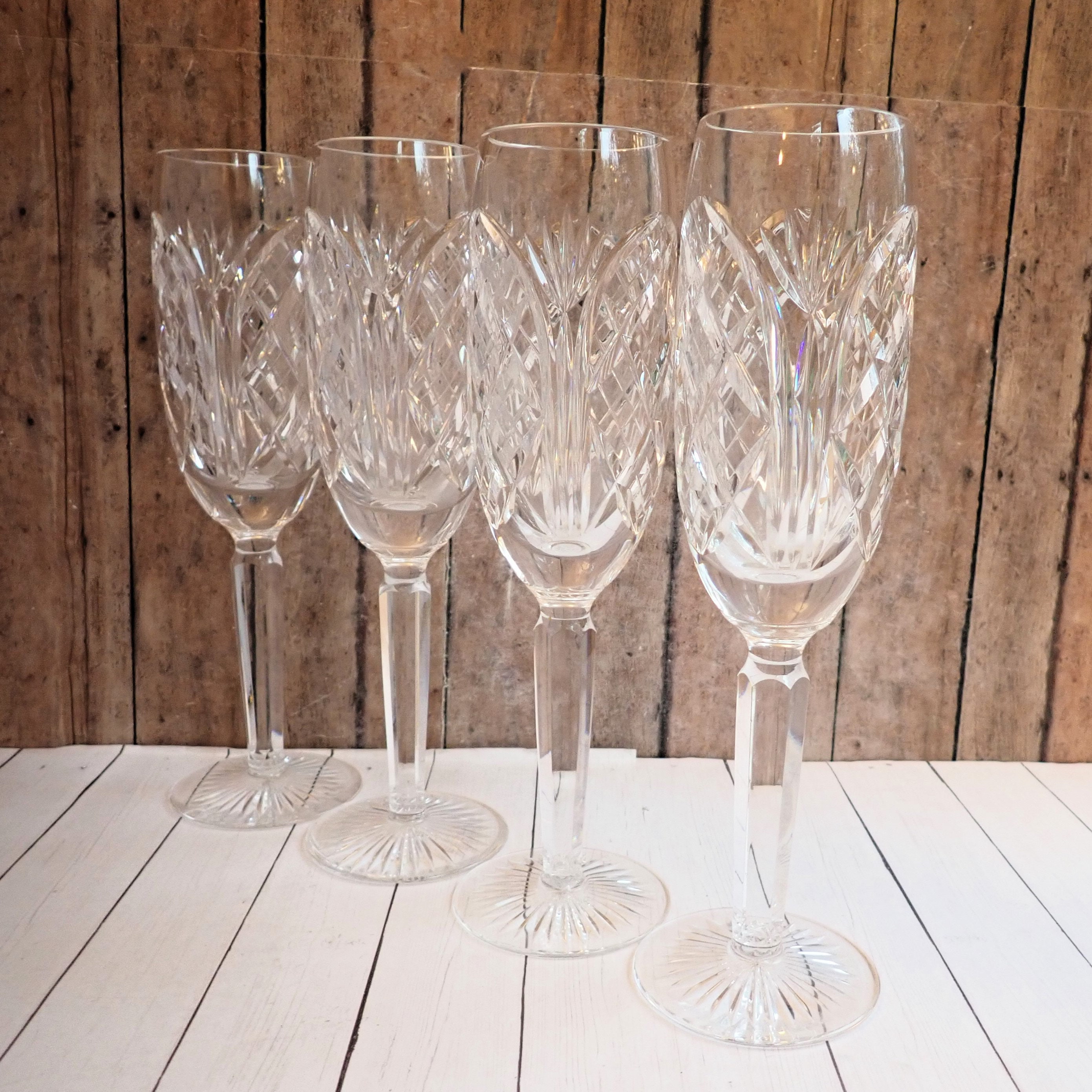 The glasses are in very good condition with no chips or cracks. Gorgeous set of Heritage Crystal fluted champagne glasses!