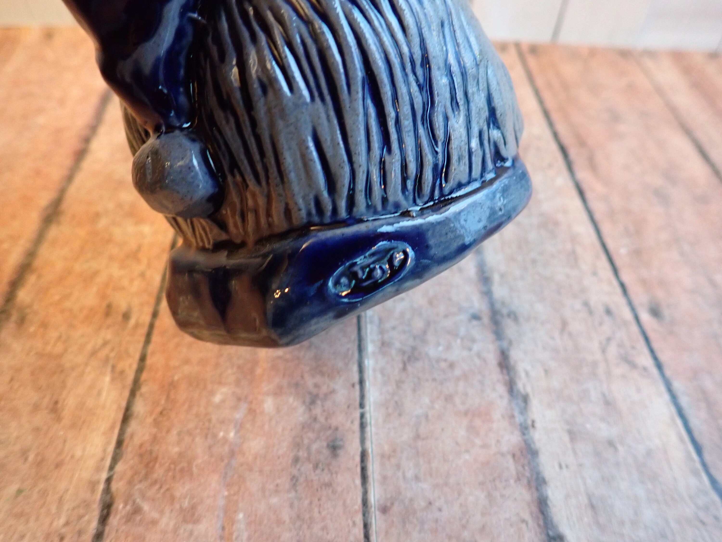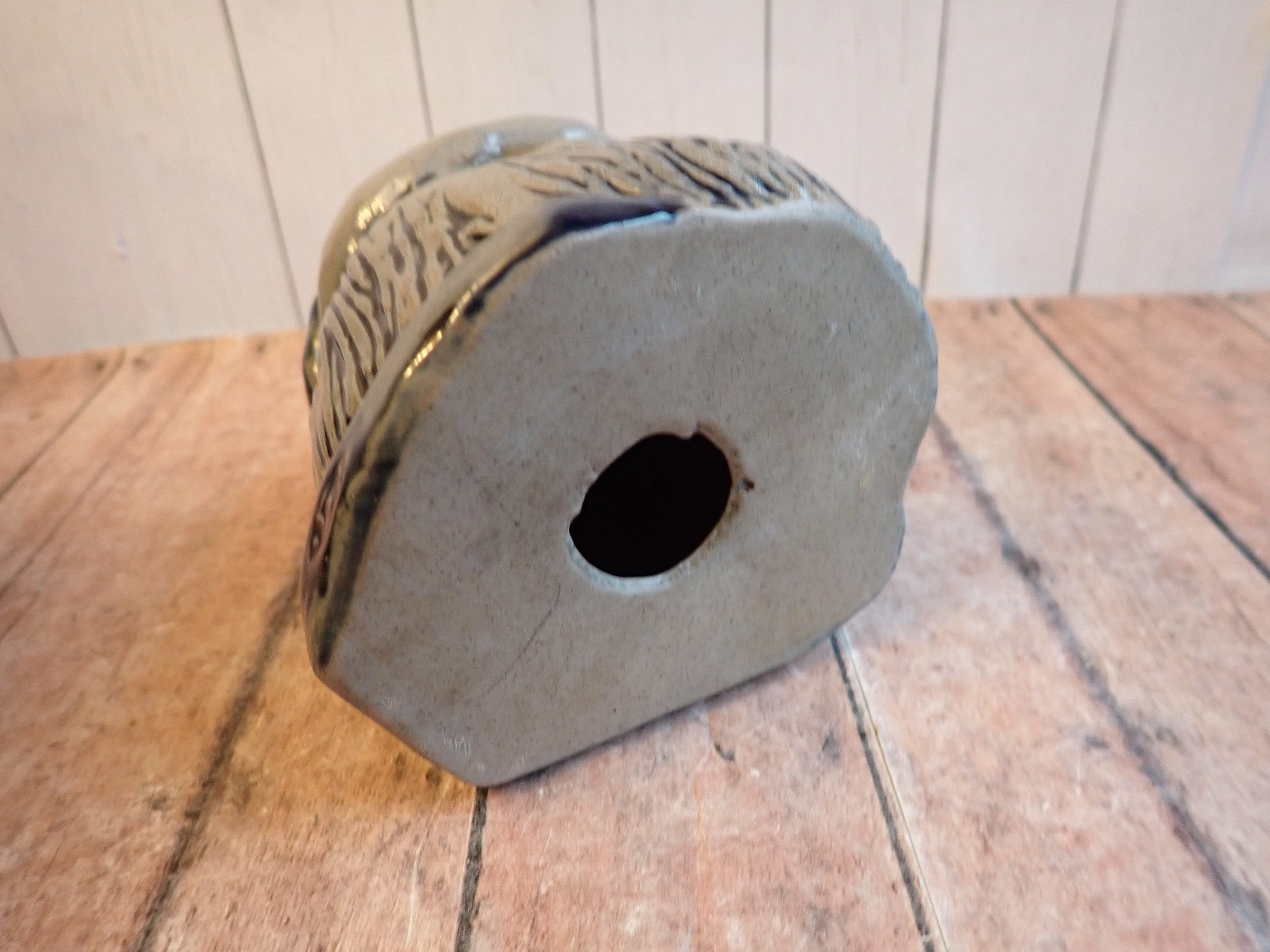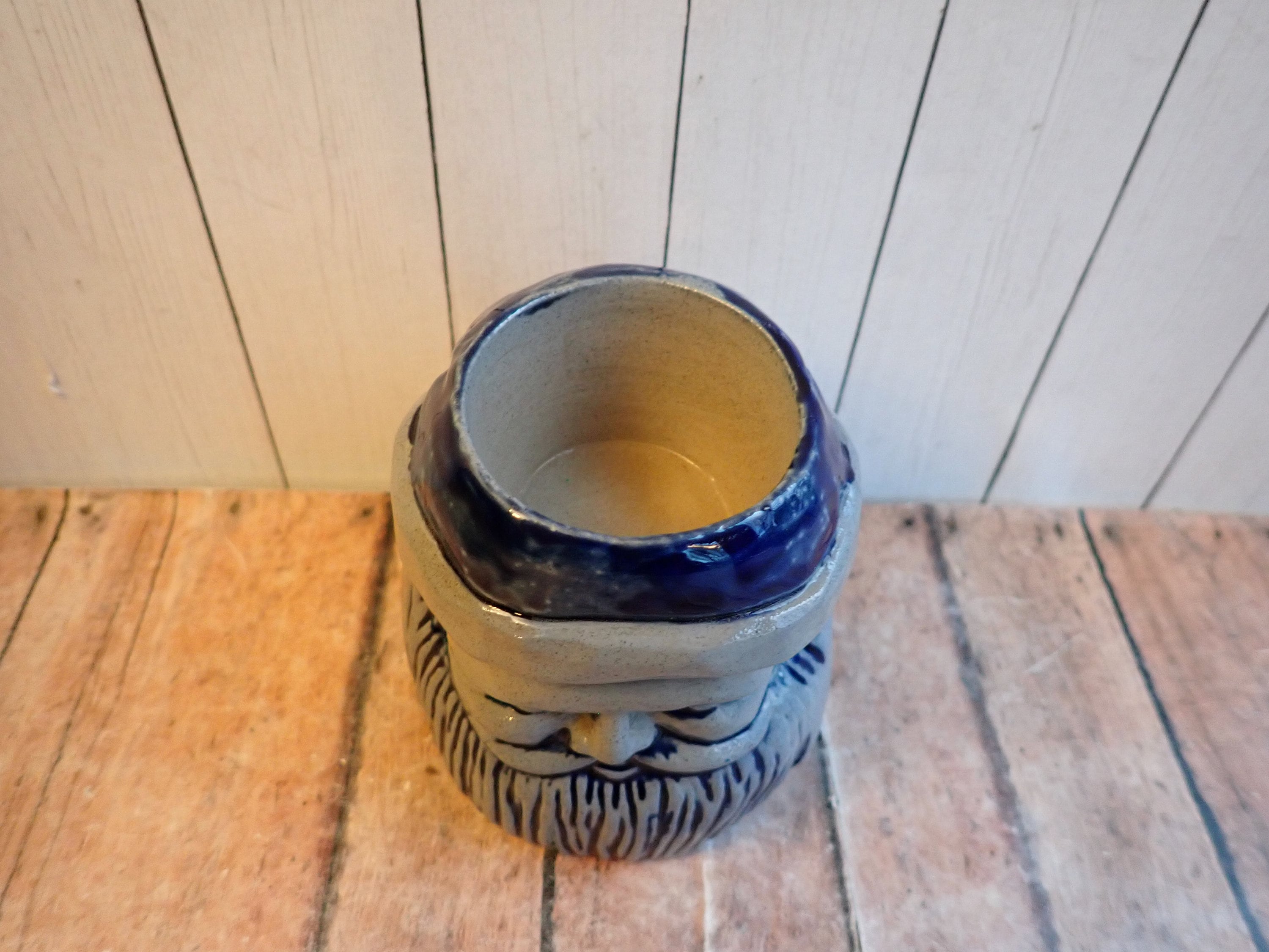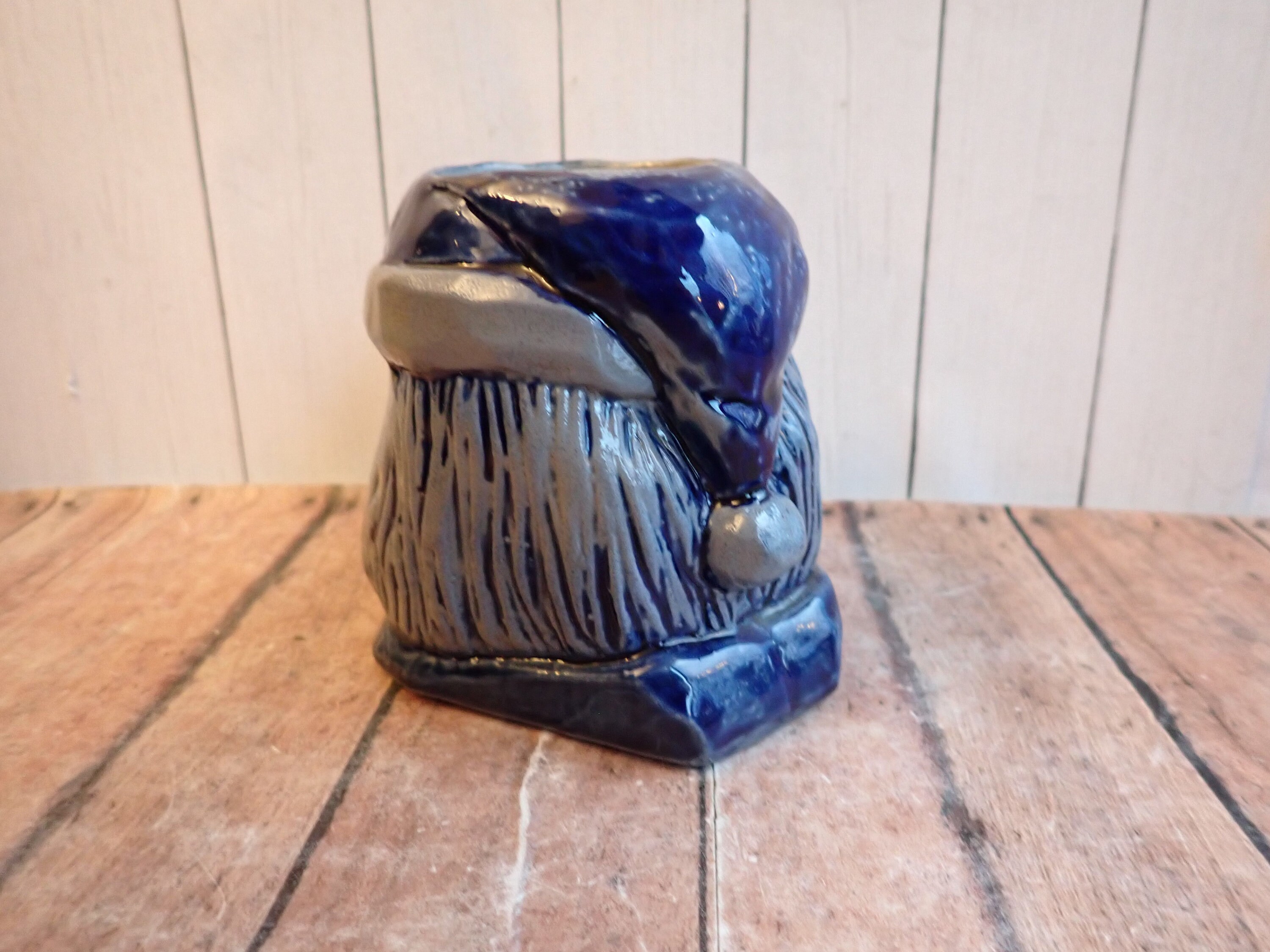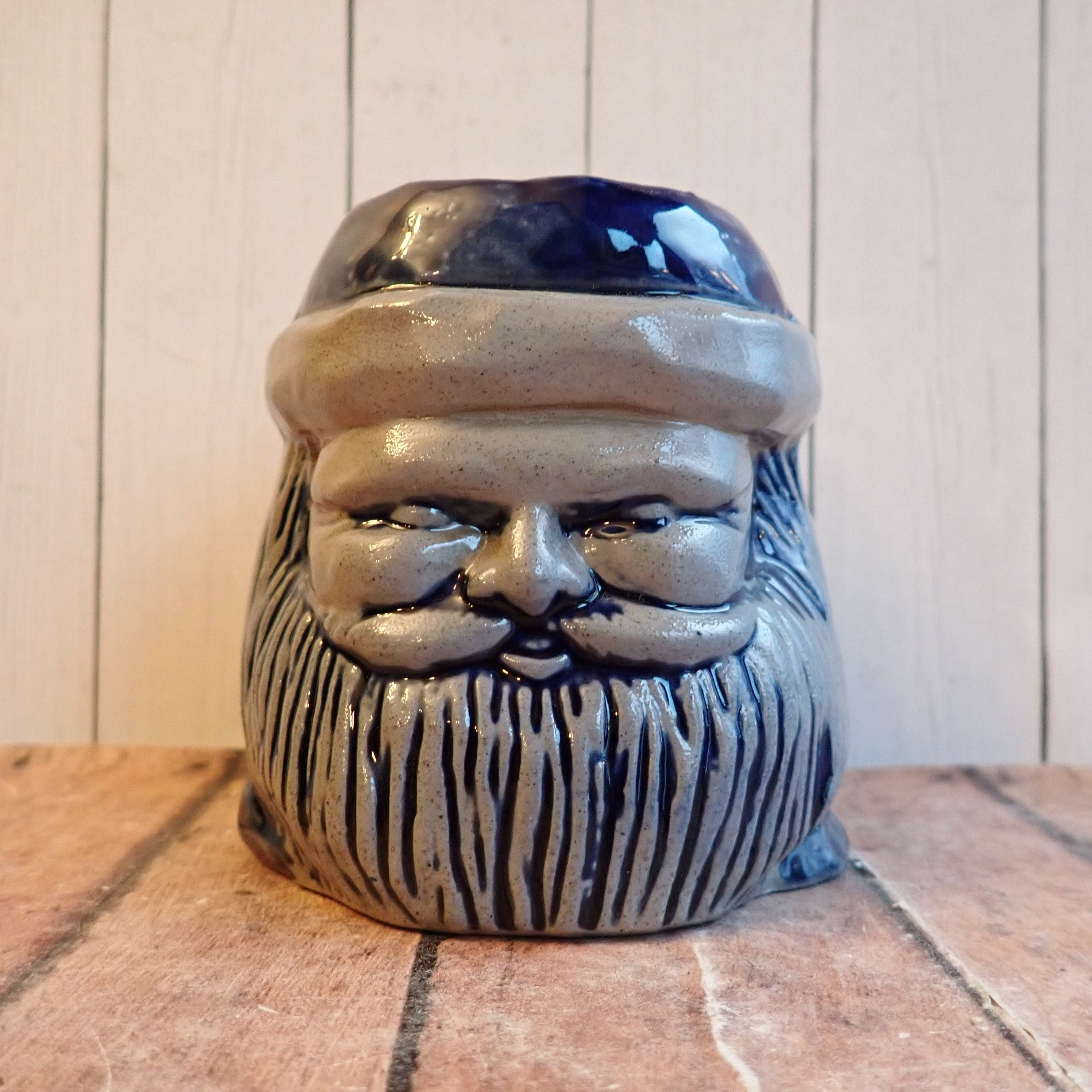 Here is a single stoneware Santa candle holder made by Rowe Pottery Works in Cambridge, WI. This candle holder measures 3.5" tall and about 3" in diameter. It is a grey salt glazed pottery with a blue glaze. The piece is stamped RPW on the side. The top of the holder has one 1 7/8" diameter opening for a tea light or votive candle.