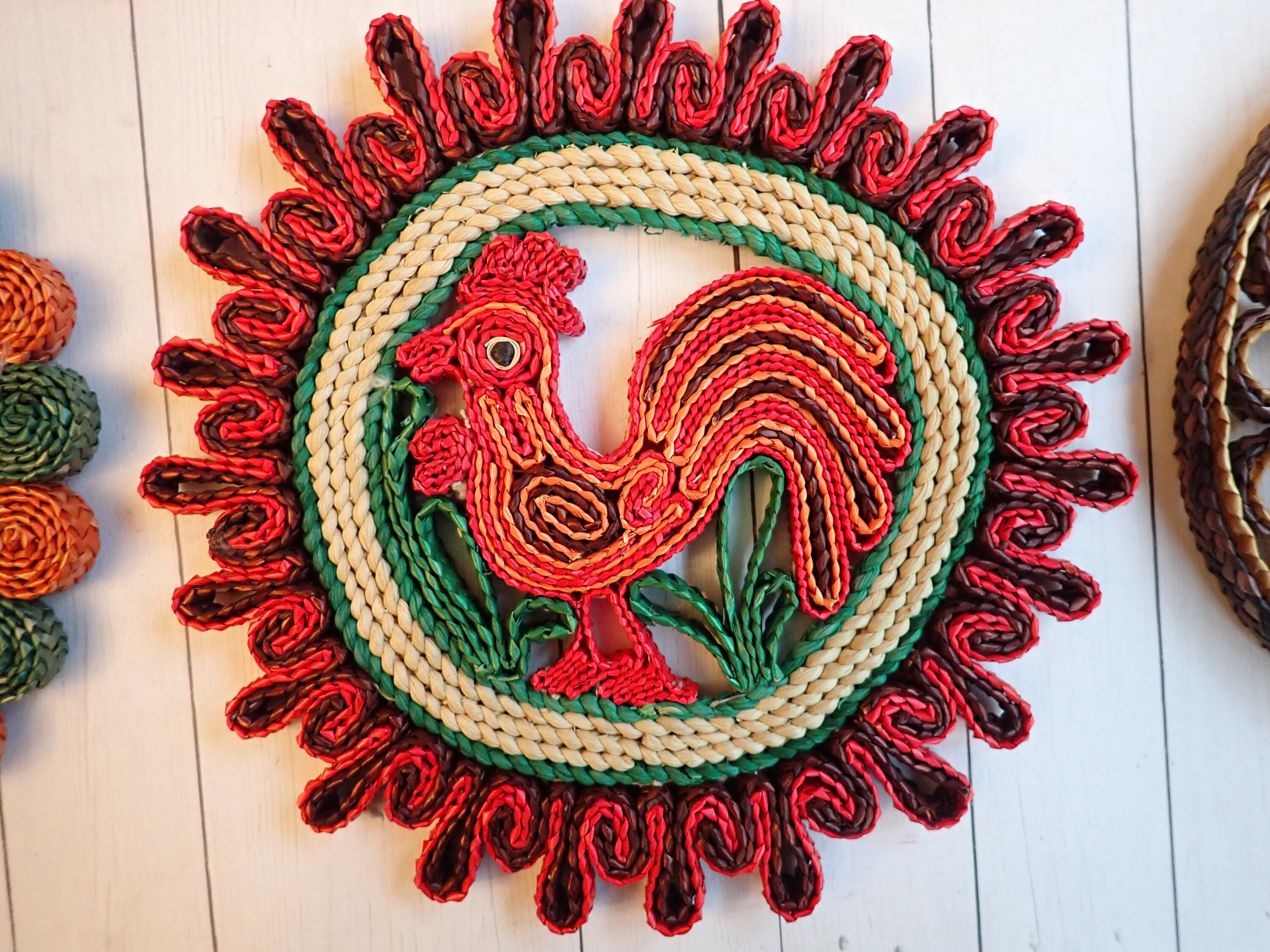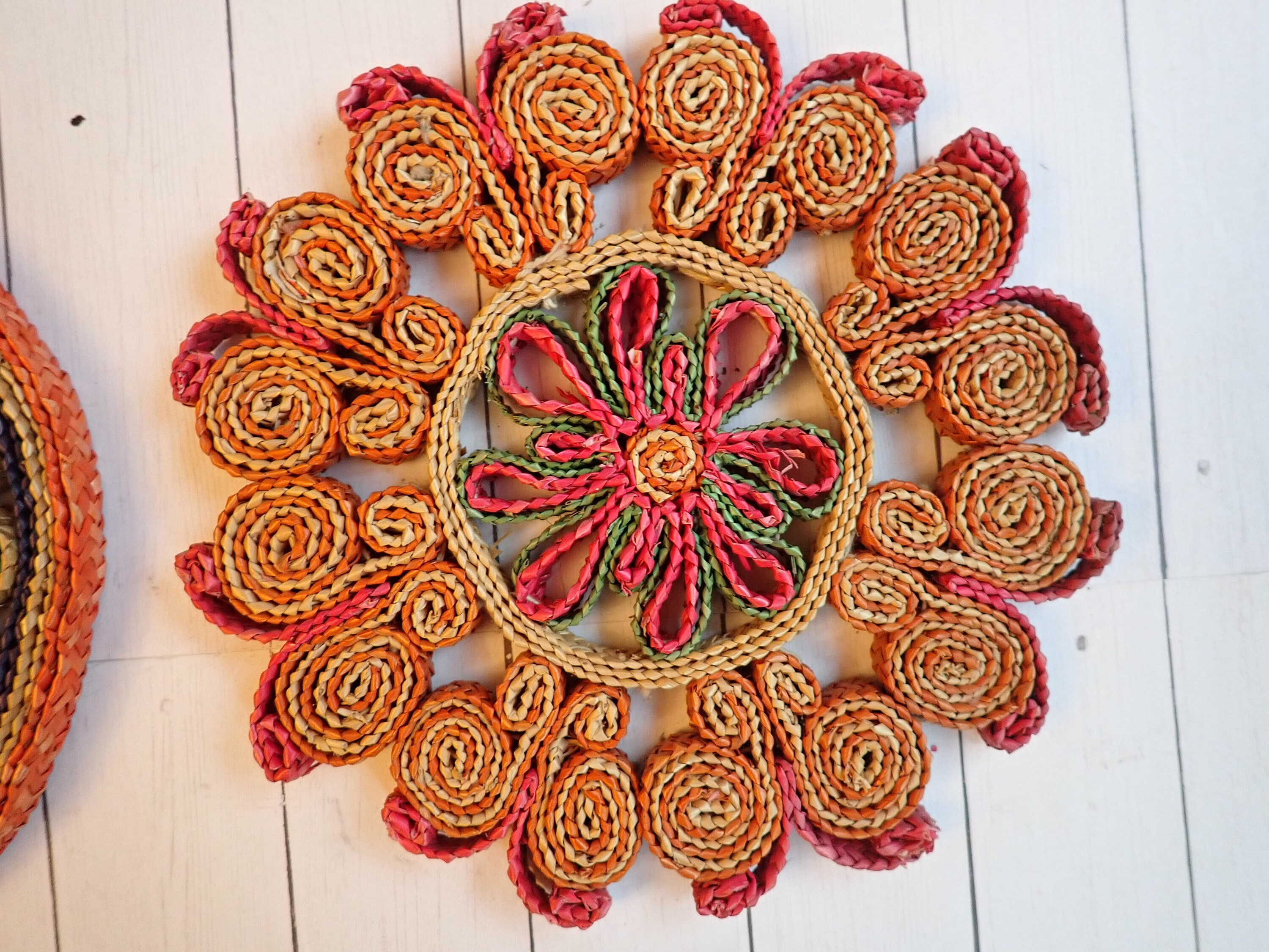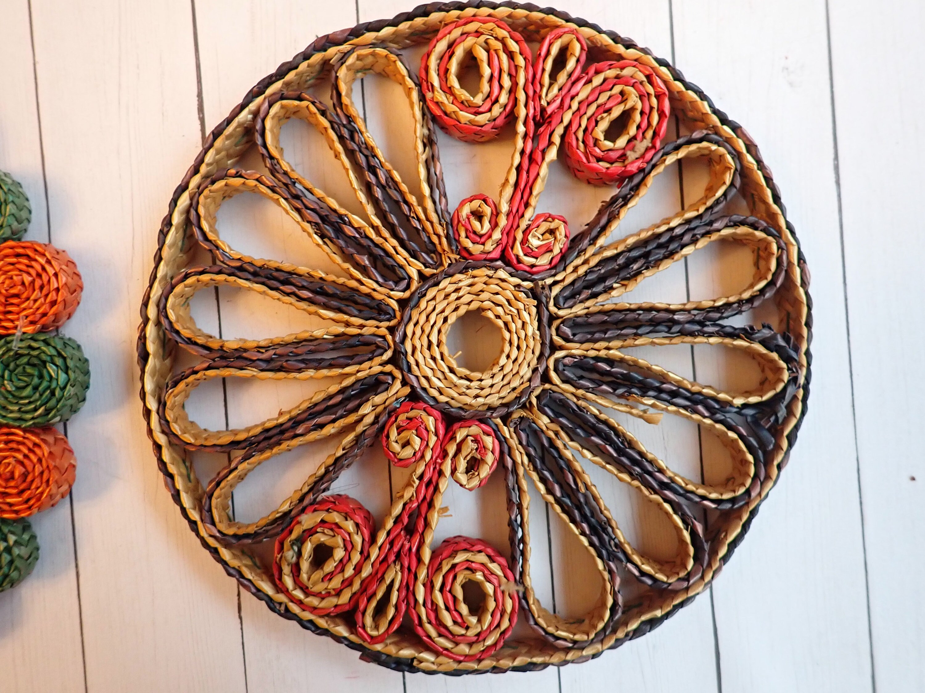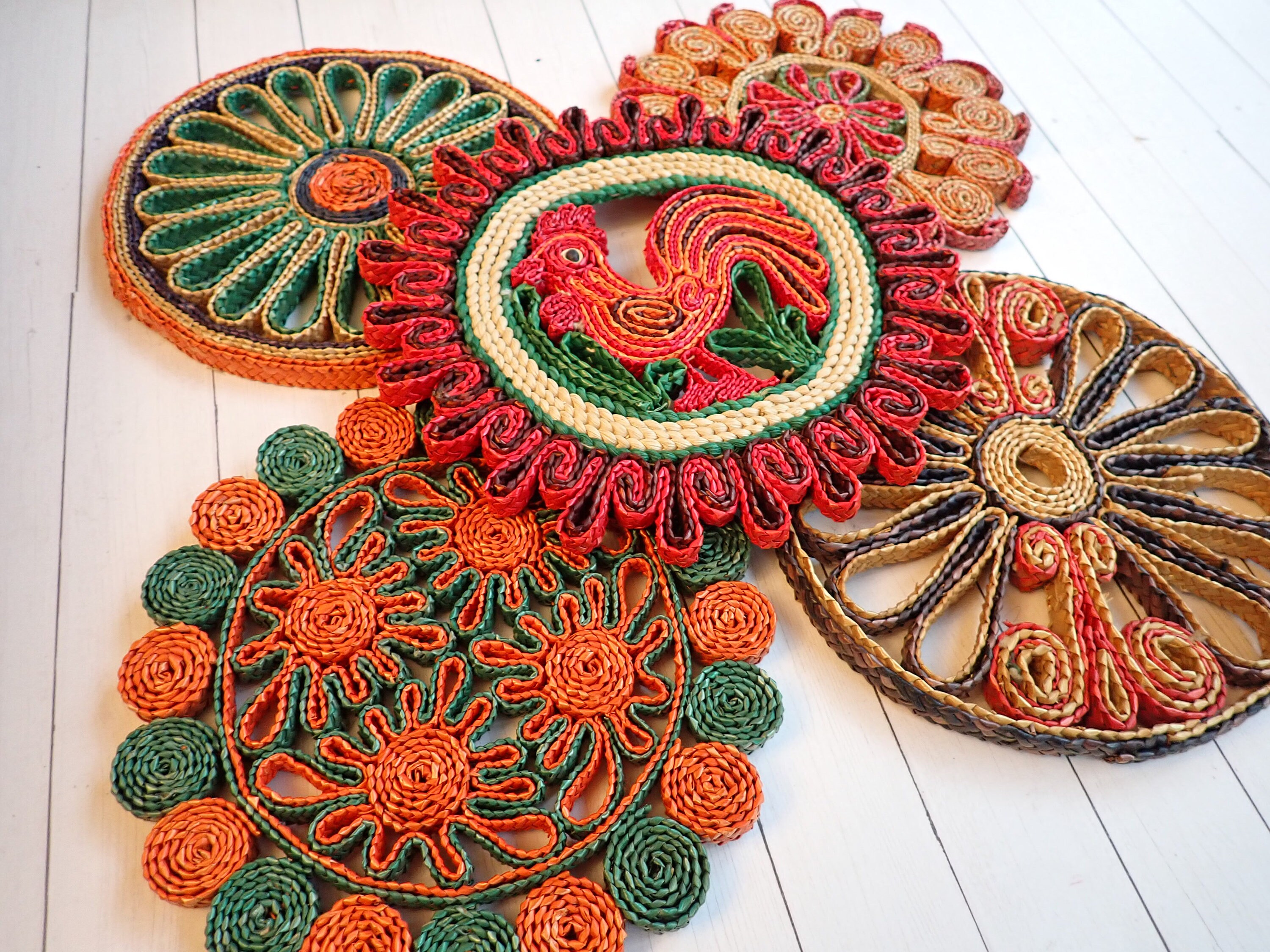 This set of woven wicker trivets includes 5 round trivets in colorful patterns. The trivets are all about 7" in diameter. They all have bright colored tones of tan, green, red, purple, and orange. The patterns coordinate together nicely would make a fun wall arrangement or use under your planters. The trivets are all about the same thicknesses.