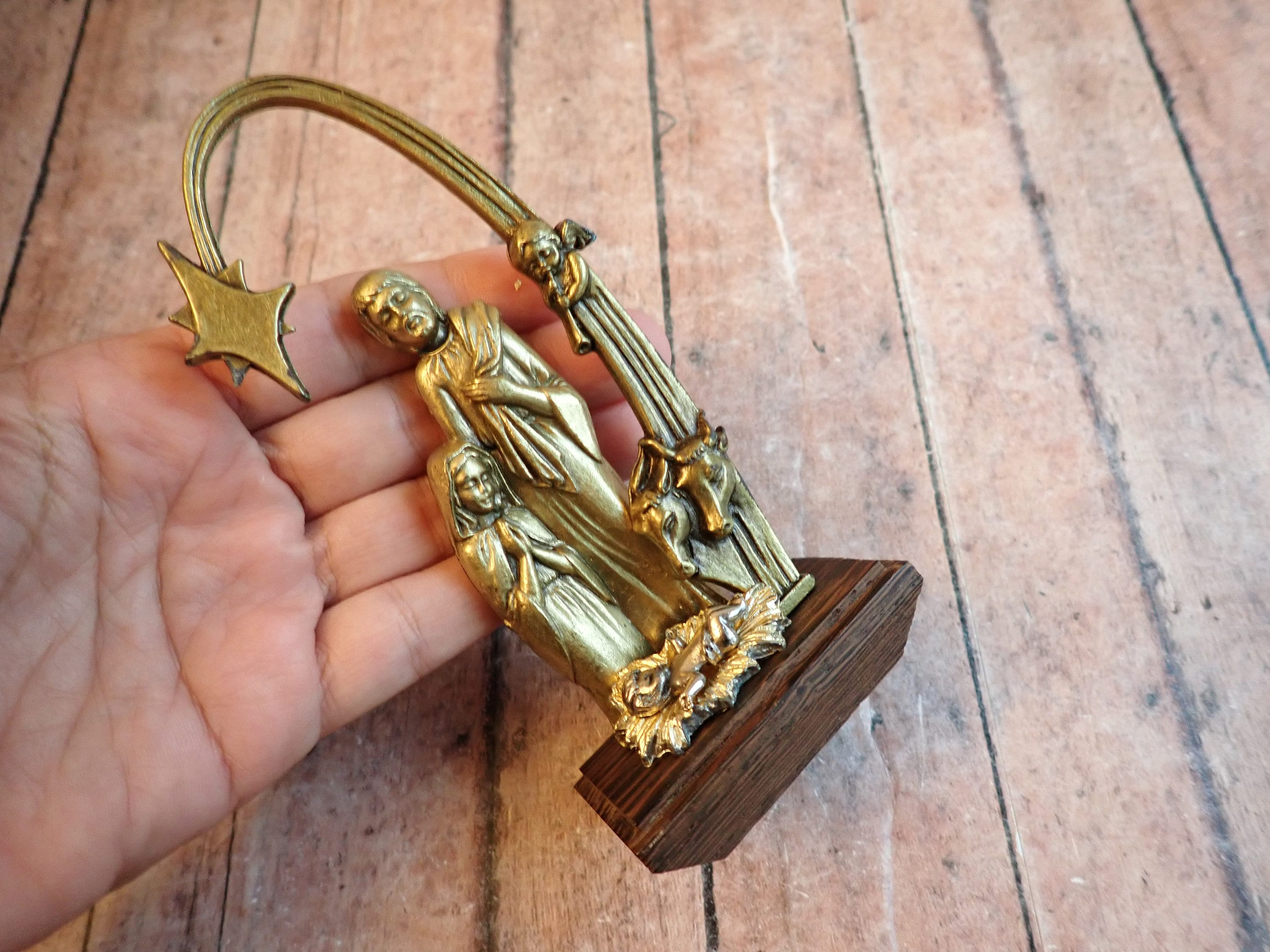 This small Nativity figurine is 5.5" tall, 2.5" wide at the base, and 1.5" deep. It has a wooden base and a brass Nativity scene. The figures are nicely detailed with etched lines.