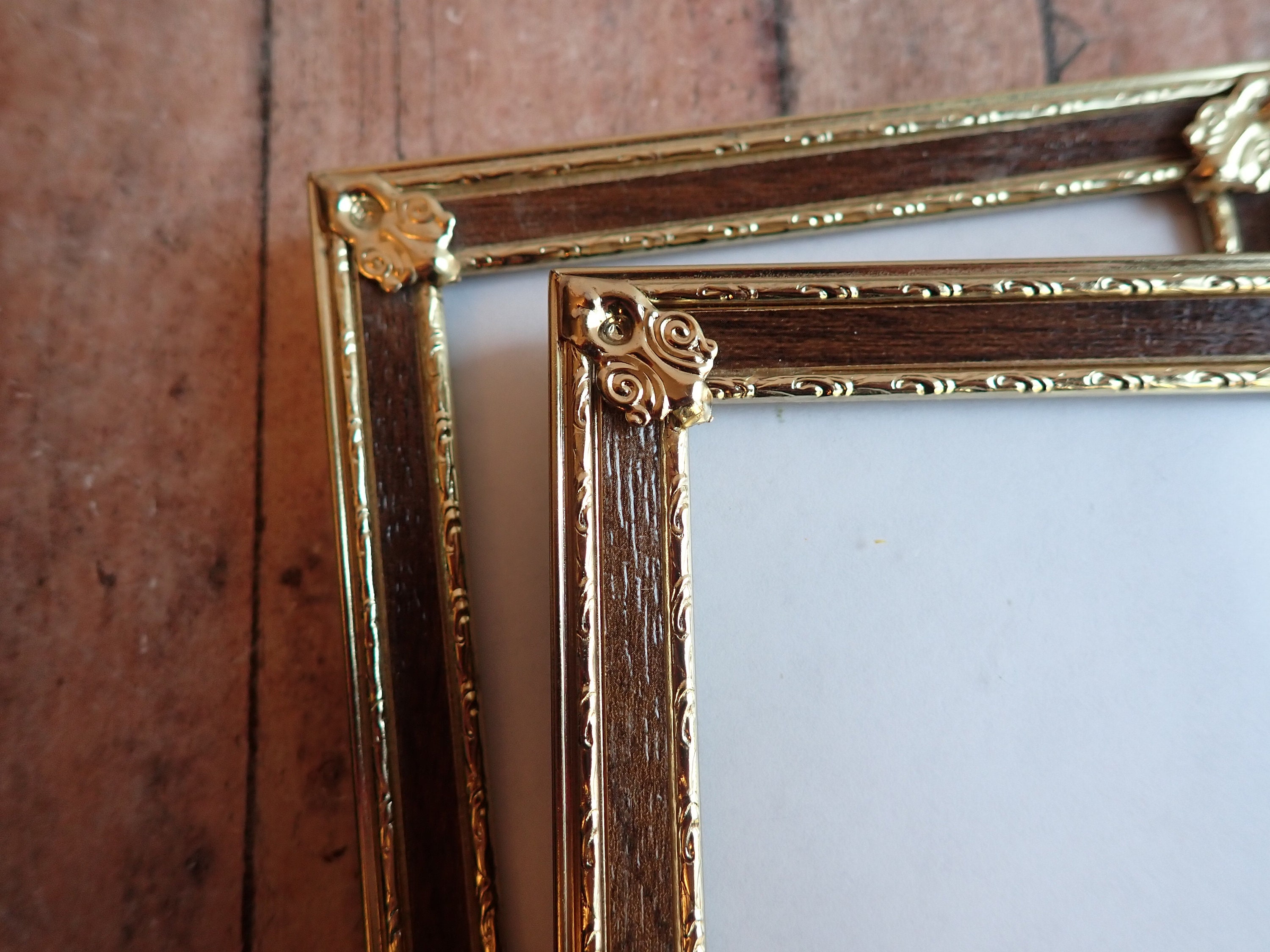 Both frames are in very nice condition, there is some light tarnish on the brass and a few light scratches on the frames here and there. Lovely set of brass frames with the look of wood inlay!