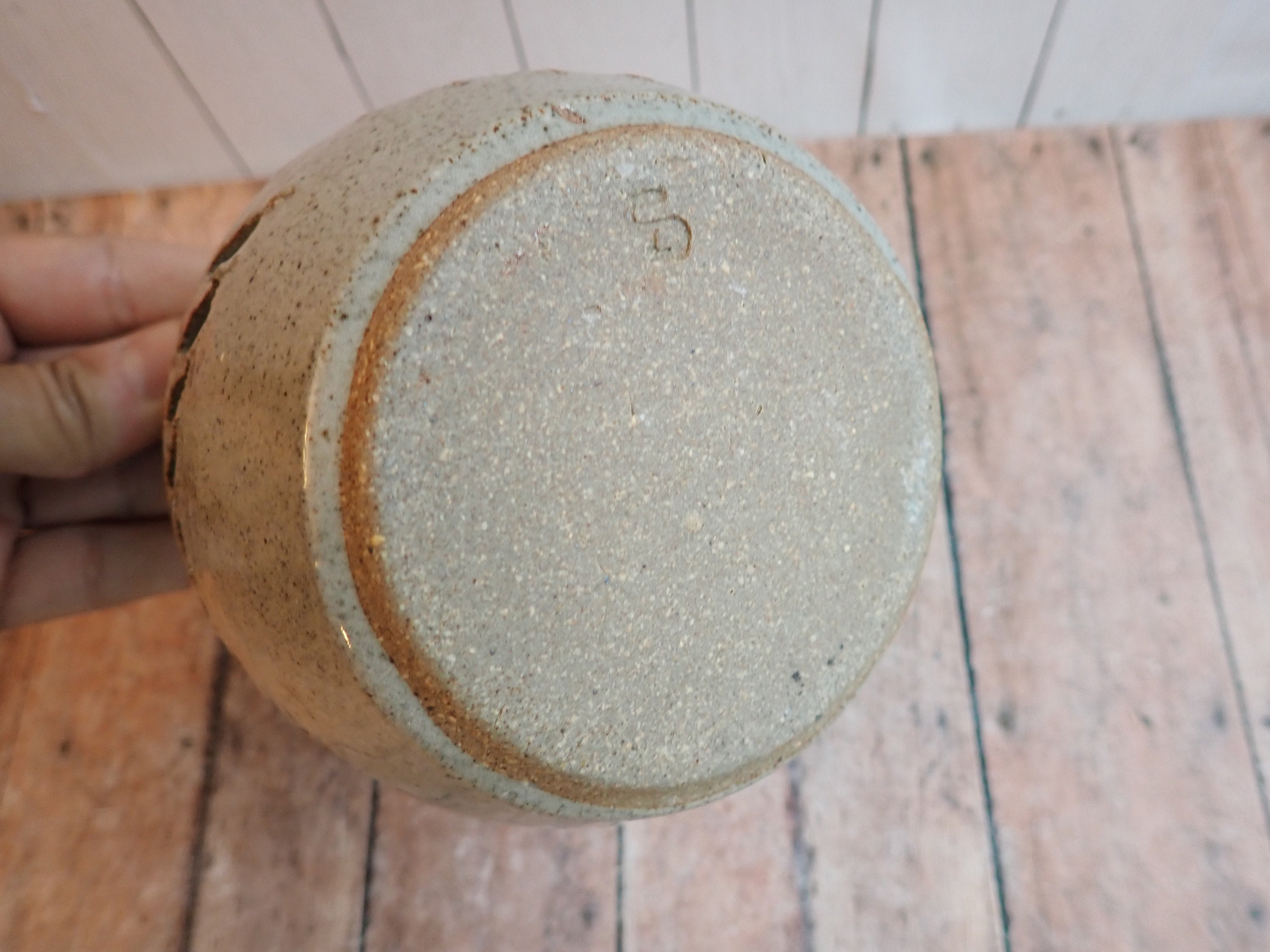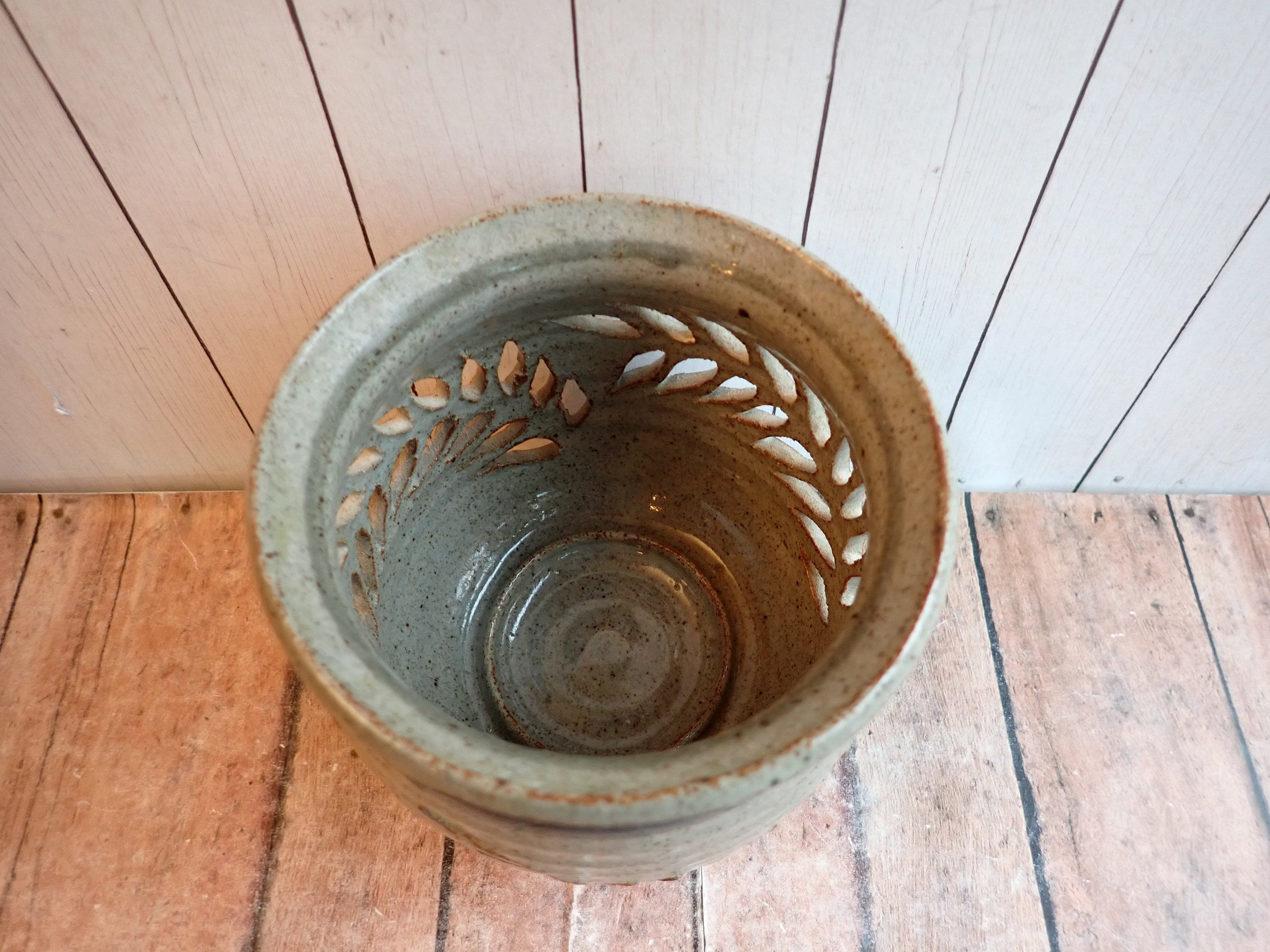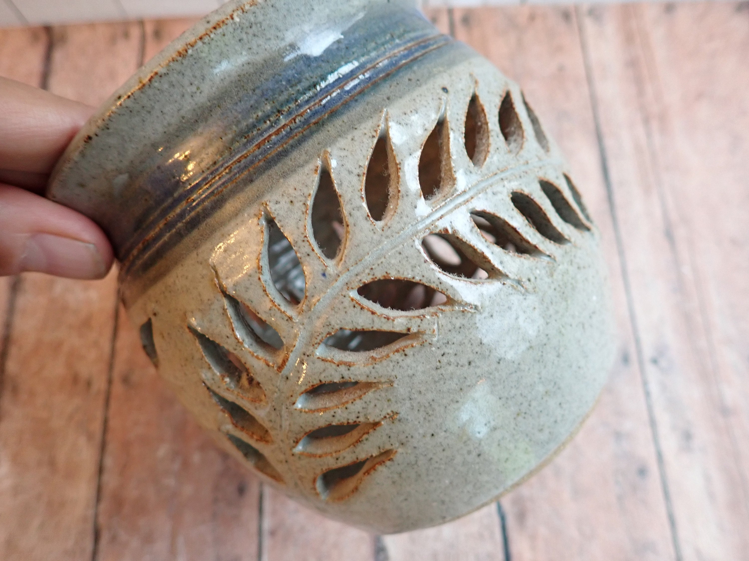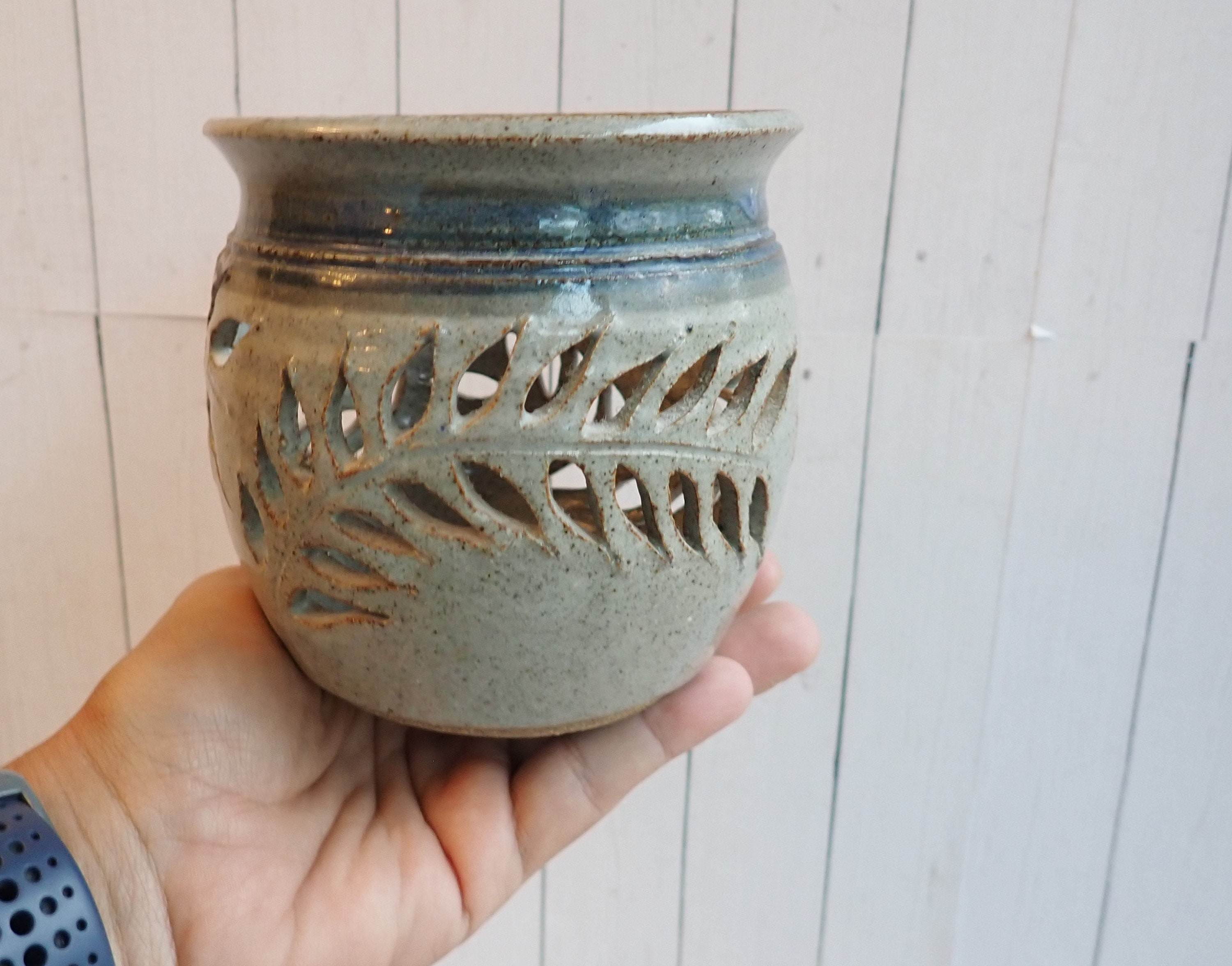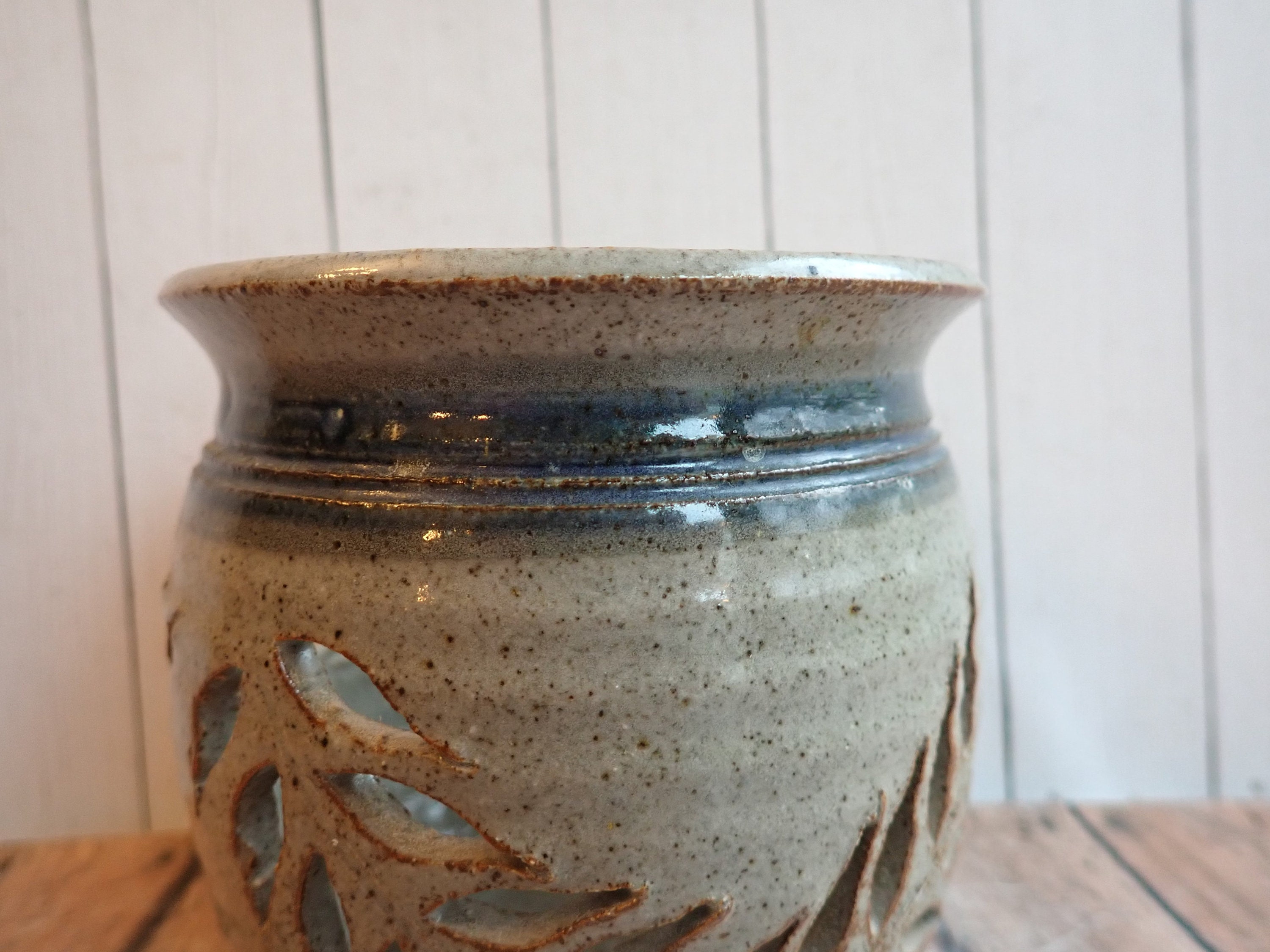 This pottery luminary is a gray stoneware with a blue band under the rim and has a cut-out leaf design around the piece. It is 4.25" tall and 4.5" in diameter. The bottom of the luminary is stamped with a maker's mark.