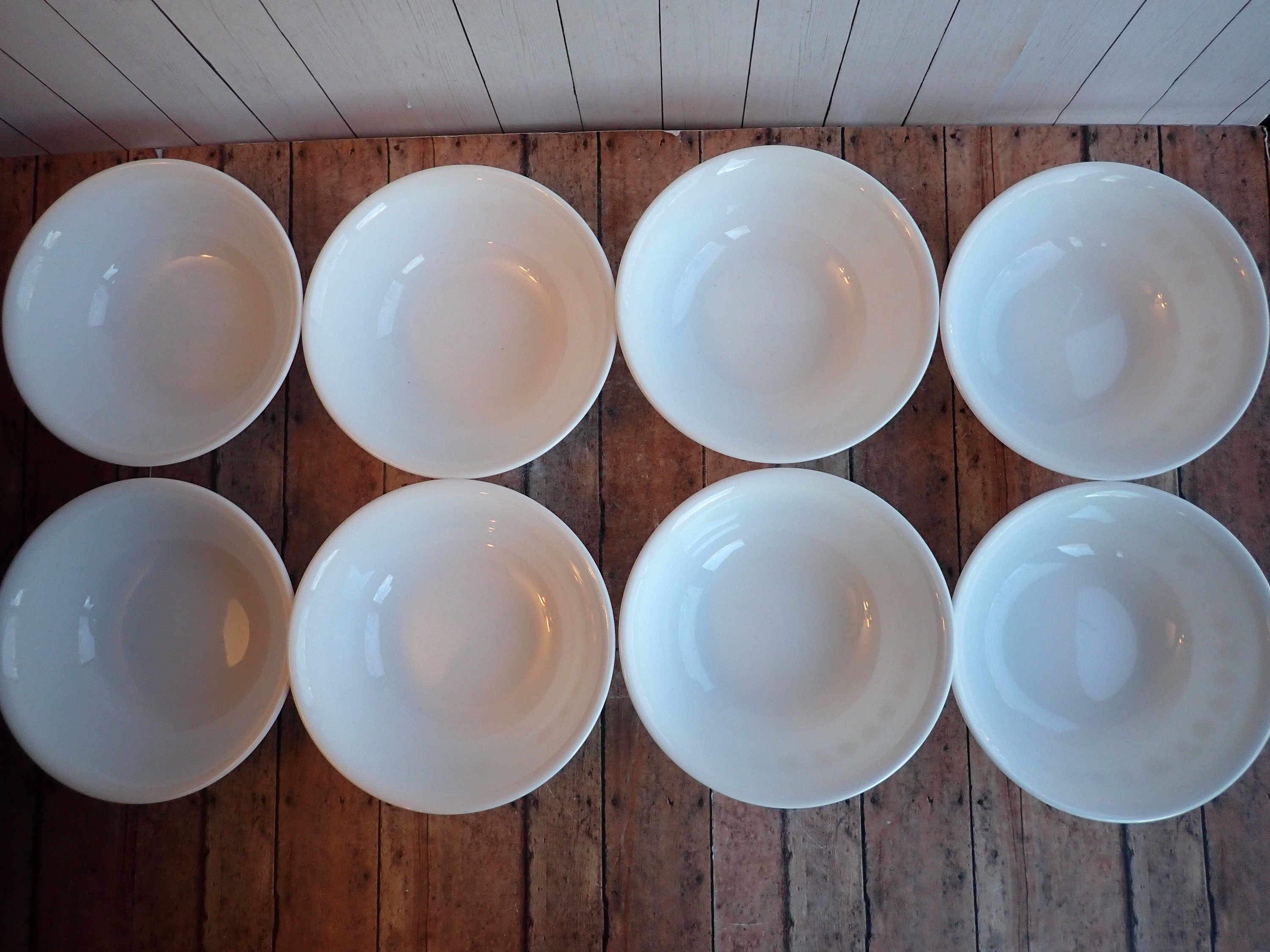 This set of 8 bowls by Corning are in the Butterfly Gold pattern and are the Coupe Cereal Bowls. They are 6.25" in diameter and 2" tall at the rim. They are white glass with an orange butterfly and flower design. The bottoms are marked Corelle. All 8 bowls are in very good condition with no chips or cracks. The graphics are bright and clear.