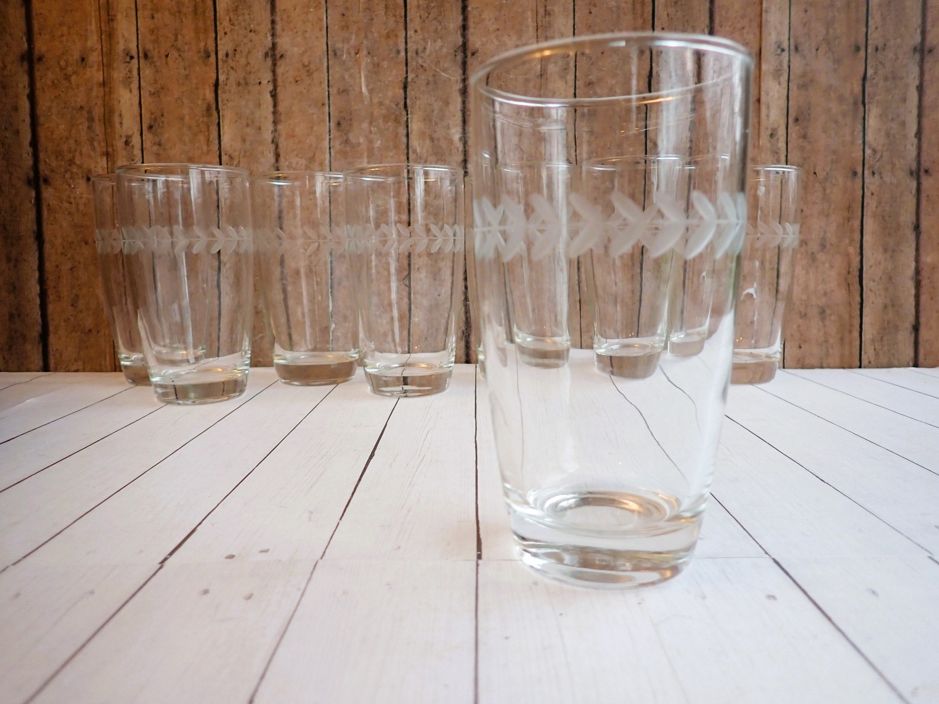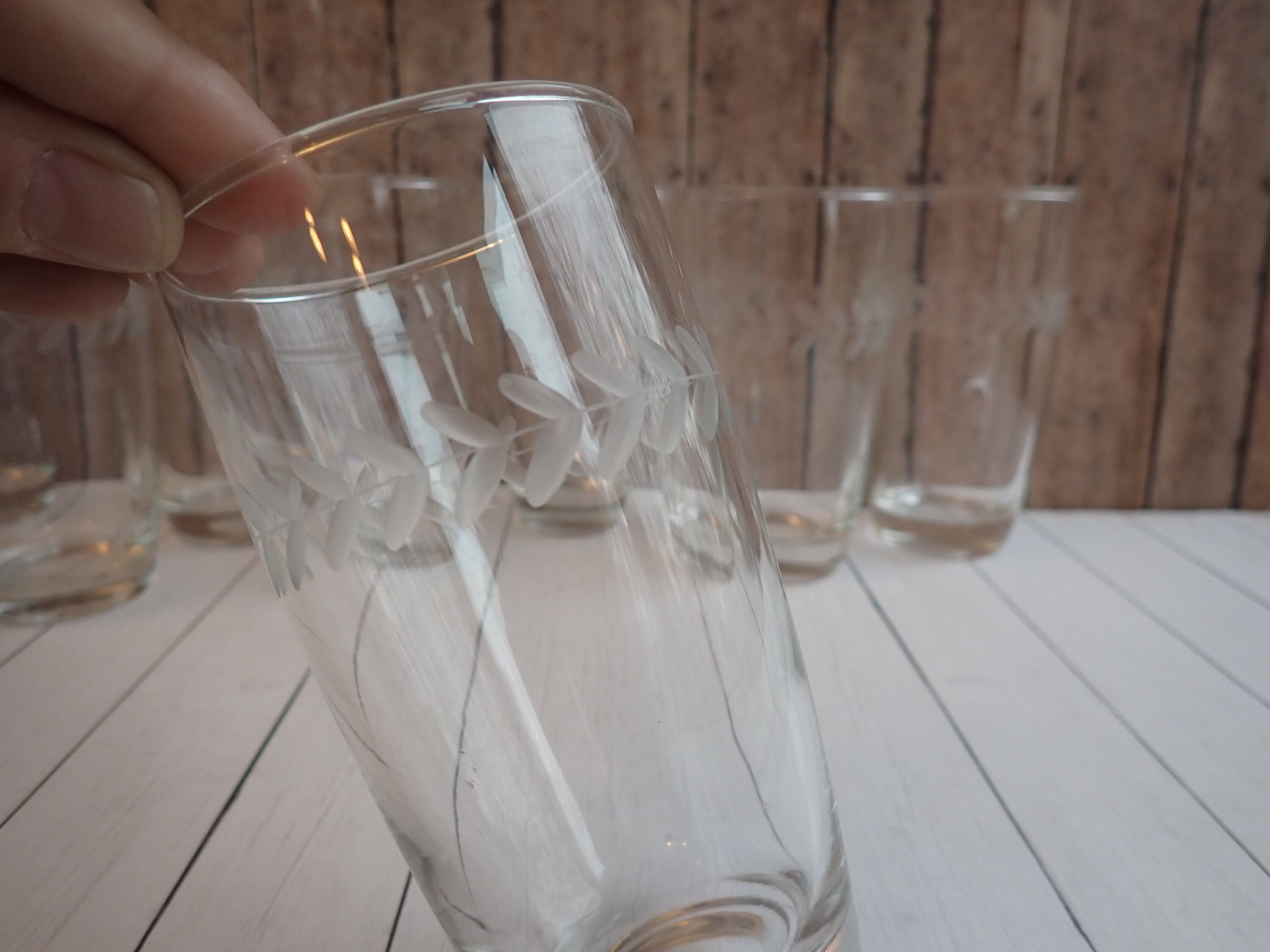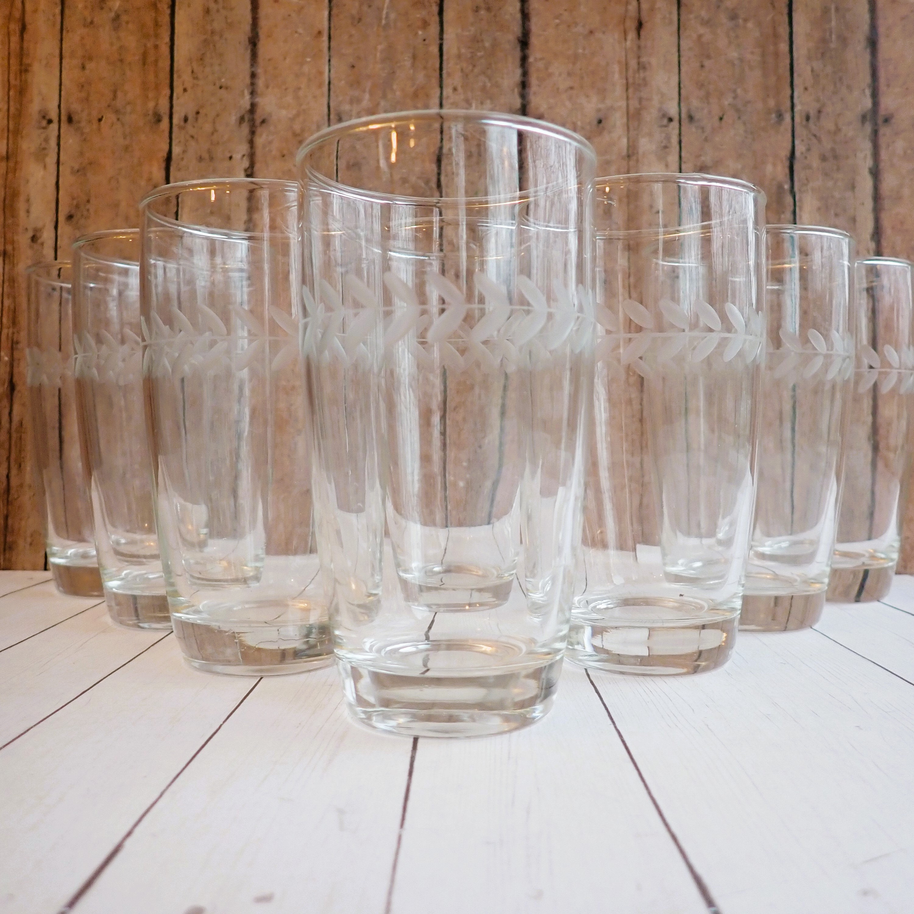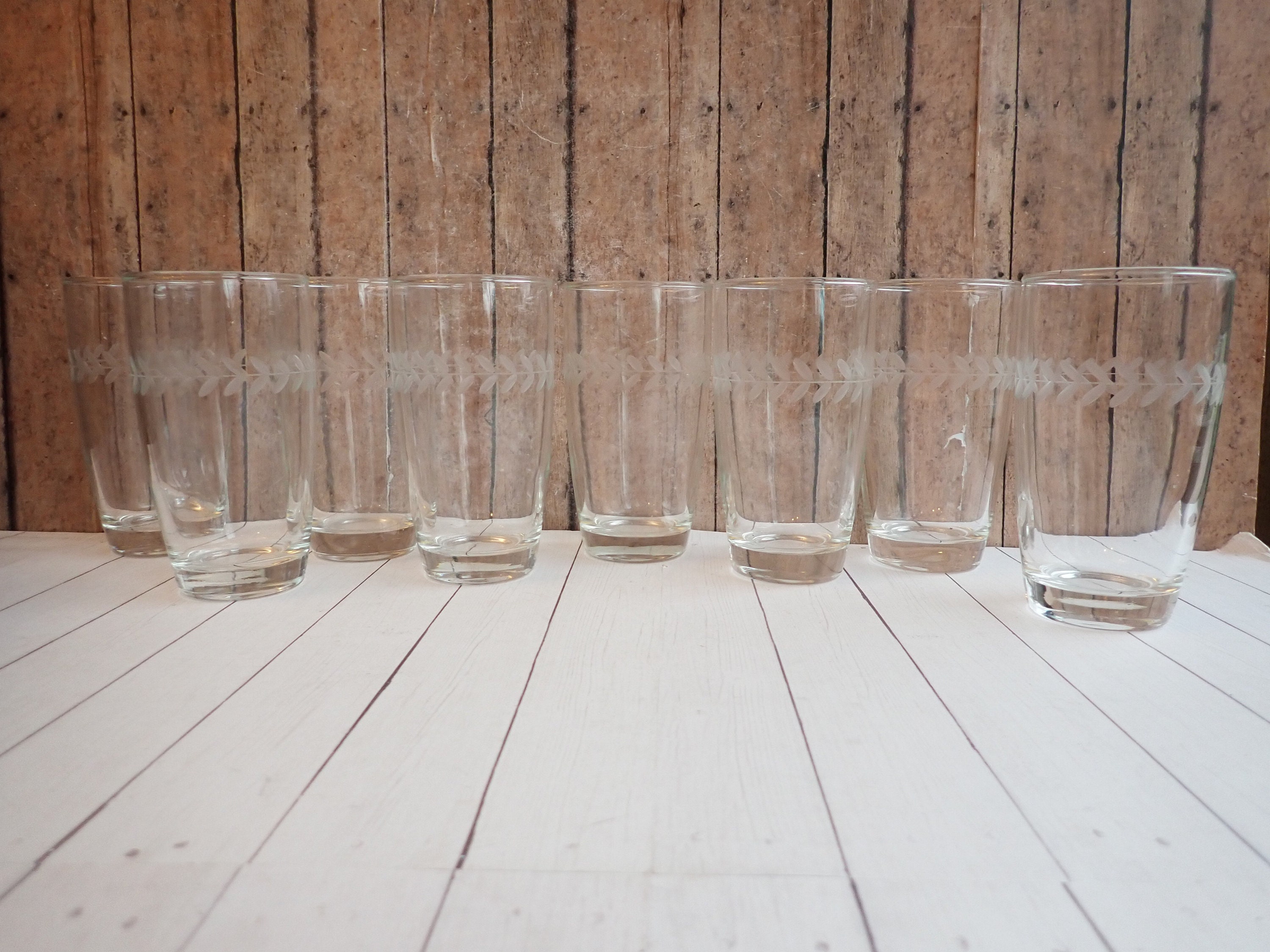 This set of 8 clear glass tumblers by Anchor Hocking are in the Laurel Gray pattern and are the 12 oz. tumblers. They are 5.25" tall and 2.75" in diameter at the rim. They are a clear glass and have a sleek and simple design with a horizontal band of etched leaves around the glass. They are the Gray Cut style, not the Polished Cut, which gives the leaves a light matte gray color on the leaves.